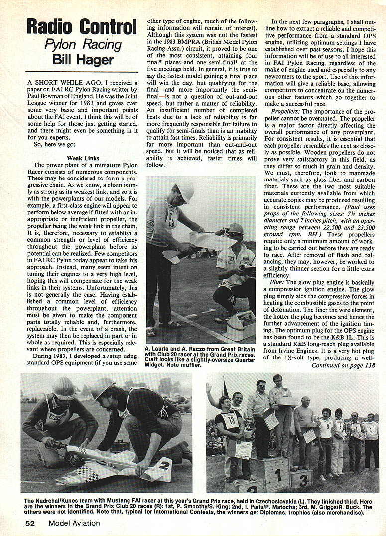 Radio Control Pylon Racing Bill Hager SHORT WHILE AGO received paper FAI RC Pylon Racing written Paul Bowman England Joint League winner 1983 goves over some very basic important points about FAI event think will some help just getting started might something experts So go Weak Links power plant miniature Pylon Racer consists numerous components may considered form pro gressive chain As know chain ly strong its weakest link powerplants models example first-class engine will appear perform below average fitted appropriate inefficient propeller propeller being weak link chain therefore necessary establish common strength level efficiency throughout powerplant before its potential can realized Few competitors FAI RC Pylon today appear take approach Instead seem intent tuning engines very high level hoping will compensate weak links systems Unfortunately generally case Having estab lished common level efficiency throughout powerplant attention must given make component parts totally reliable furthermore replaceable event crash system may replaced part whole required especially rele vant propellers concerned During 1983 developed setup using standard OPS equipment use some other type engine much follow ing information will remain interest Although system fastest 1983 BMPRA British Model Pylon Racing Assn circuit proved consistent attaining four final* places semifinal* five meetings held general true say fastest model gaining finai place will win day qualifying finaland importantly semi finalis question out-and-out speed rather matter reliability An insufficient number completed heats due lack reliability far frequently responsible failure qualify semi-finals inability attain fast times Reliability primarily far important out-and-out speed will noticed reli ability achieved faster times will follow next few paragraphs shall out line extract reliable competi tive performance standard OPS engine utilizing optimum settings have established over past seasons hope information will use interested FAI Pylon Racing regardless make engine used especially newcomers sport Use infor mation will give reliable base allowing competitors concentrate numer ous other factors go together make successful race Propellers importance pro peller cannot overstated propeller major factor directly affecting overall performance powerplant consistent results essential propeller resembles next close ly possible Wooden propellers prove very satisfactory field differ much grain density must therefore look manmade materials such glass fiber carbon fiber two suitable materials currently available accurate copies may produced resulting consistent performance Paul uses props following sizes 7-4 inches diameter 7 inches pitch oper ating range between 22500 23500 ground rpm BH propellers require minimum amount work ing carried out before ready race After removal flash bal ancing may however worked slightly thinner section little extra efficiency Phrg The glow plug engine basically compression ignition engine glow plug simply aids compressive forces heating combustible gases point detonation finer wire element hotter plug becomes hence further advancement ignition tim ing optimum plug OPS engine has found K&B 1 L standard K&B long-reach plug available Irvine Engines very hot plug 1 1A-volt type producing wellContinued page 138 Nadrchai/Kunes team Mustang FAi racer years Grand PrIx race heid Czechoslovakia L finished third winners Grand Prix Ciub 20 races R 1st P SmoothylS King 2nd i ParislP Matocha 3rd M GriggslR Buck others identit led Note typical international Contests winners get Diplomas trophies also merchandise 52Model Aviation A Laurie Raczo Great Britain Club 20 racer Grand Prix races Craft looks like slightiyoversize Quarter Midget Note muffler AlTENTION ERS common experience nor mal temperatures days first flight good after first charge day doesnt seem good follow never viewed phenomenon being temperature-related often refer red warm-up However situation changes cold-storage conditions described above first charge really warm-up may second third no question about first very cold flight likely quite bit slug gish second possibly third Thereafter fingers may freezing motor battery behavior seems perfectly normal because think batteries warm hot use have forgotten cold week garage once have ex perienced significant power increase flight batteries warmed up time Id expect some drop power due normal charge depletion way winter air around best air year flying may uncomfortable cold dry dense air sure makes plane fly great Models seem light buoyant likely have significantly longer motor runs because seems plane weighs less less power expended keeping plane up power available make plane go may have guessed condition has dual opposite worst flying air thin humid hot air summer whenever models Electric affected both extremes Another incidental before leaving subject planes stored garage flight box kept inside nor mal temperatures contains lead/acid tractor-size battery fuel prefer just keep familiar temperatures guess its memories hard car starts cold mornings Finally readers loners immediate areas some areas enjoying small groups fliers just two three persons Id like encourage scattered groups few fliers consider hosting Electric Fly-in upcoming year column will help announcing intentions Dont worry about making big deal Forget events Forget prizes Forget anything sounds like work except course sending information incom ing inquiries Just make come fly us day weekend have share yourselves Electric inter ests field No doubt several loners small groups within easy traveling distance just dying find some else share interests Think over send informa tion Remember takes few months get print get moving now Happy Landings Bob Kopski 25 West End Dr Lans dale PA 19446 RC Pylon Racing/Hager Continued page 52 advanced ignition Care must taken starting engine regulate current flow through element order prevent damage Having fine element plu