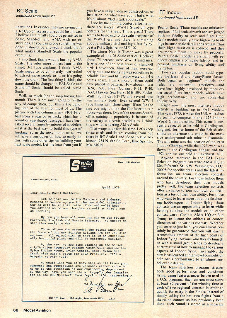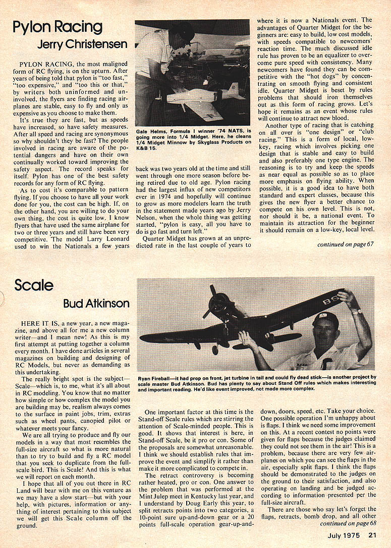 Pylon Racing Jerry Christensen PYLON RACING maligned form RC flying upturn After years being told pylon too fast too expensive too writers both uninformed un involved flyers finding racing air planes stable easy fly expensive choose make Its true fast speeds have increased have safety measures After speed racing synonymous shouldnt fast people involved racing aware po tential dangers have own continually worked toward improving safety aspect record speaks itself Pylon has best safety records form RC flying As cost its comparable pattern flying choose have work done cost can high other hand willing own thing cost quite low know flyers have used same airplane two three years still have very competitive model Larry Leonard used win Nationals few years Scale Bud Atkinson HERE IT IS new year new maga zine above new column writerand mean new As first attempt putting together column month have done articles several magazines building designing RC Models never demanding undertaking really bright spot subject Scale what its about RC modeling know no matter simple complex model building may realism always comes surface paint jobs trim extras such wheel pants canopied pilot whatever meets fancy trying produce fly models way resembles full-size aircraft what natural try build fly RC model seek duplicate fullscale bird Scale what will report month hope out RC Land will bear venture may have slow startbut help pictures information thing interest pertaining subject will get Scale column off ground back two years old time still went through season before ing retired due old age Pylon racing largest influx new competitors ever 1974 hopefully will continue grow modelers learn truth statement made years ago Jerry Nelson whole thing getting started pylon easy have go fast turn left Quarter Midget has grown unpre dicted rate last couple years important factor time Stand-off Scale rules stirring attention Scale-minded people good shows interest Stand-off Scale pro con Some proposals somewhat unreasonable think should establish rules im prove event simplify rather make complicated compete retract controversy becoming rather heated pro con answer problem performed Mint Julep meet Kentucky last year understand Doug Early year split retracts points two categories 10-point sure up-and-down gear 20 points full-scale operation gear-up-andwhere now Nationals event advantages Quarter Midget ginners easy build low cost models speeds compatible newcomers reaction time much discussed idle rule has proven equalizer over come pure speed consistency newcomers have found can com petitive hot dogs concen trating smooth flying consistent idle Quarter Midget beset rules problems should iron themselves out form racing grows Lets hope remains event rules will continue attract new blood Another type racing catching over design club racing form local lowkey racing involves picking design stable easy build also preferably type engine reasoning try keep speeds near equal possible place emphasis flying ability possible good idea have both standard expert classes because gives new flyer better chance compete own level nor should national event maintain its attraction beginner should remain low-key local level continued page 67 down doors speed etc Take choice possible operation Im unhappy about flaps think need some improvement recent contest no points given flaps because judges claimed could see air problem because very few air planes can see flaps air especially split flaps think flaps should demonstrated judges ground satisfaction also operating landing judged ac cording information -presented per full-size aircraft say lets forget flaps retracts bomb drop other continued page 68 July1975 21 Gale Helms Formula winner 74 NATS going 1/4 Midget cleans 1/4 Midget Minnow Skyglass Products K&B 16 Ryan Fireballit prop front let turbine tail could fly dead stickis another project scale master Bud Atkinson Bud has plenty say about Stand Off rules makes interesting important reading Hed like event improved made complex RC Scale continued page 21 operations essence saying J-3 Cub like airplane could allowed believe aircraft should permitted Scale Stand-off AMA no re strictions can prove something done should allowed think thats what makes Stand-off Scale popular event also think what hurting AMA Scale rules less lean simple J-3 type airplane think AMA Scale needs completely overhauled attract people its going down drain first thing think name should changed FAI Scale Stand-off Scale should called AMA Scale Well much soap boxing month much going way competition build ing time year us picture column FR-I Fire ball year back has round egg-shaped fuselage have asked several times interested modelers what best way build type fuselage next month will give run down easily some other tips building next scale model Let hear you have unique idea construction insulation what have Thats what its about Lets talk about scale see coming contest information several WW-ll Stand-off type contests year great seems no end scale prospects WW-ll era something about military bird making fast fly P-SI Spitfire ME-109 winter Nats Tucson great example 26 Scale entries believe about 75 percent WW II airplanes best array stand-off birds have seen Most ex pertly built flying something behold First fifth place 4Y2 points apart think could have placed pattern about B-24 P-38 P-82 Corsair P-SI P-40 P-39 Hawker Sea Fury ME-109 Focke WuIf 190 T-28 PT-17 several post war military birds several WW type things three wings size might think Confederate Air Force reasons Stand off gaining popularity because variety aircraft possibilities think what hurting AMA Scale wraps up time Lets keep cards letters coming out RC Scale Land Send Bud kinson 734 N 6th St Terr Blue Springs Mo 64015 FF Indoor continued page 38 Peanut Scale models miniature replicas full-scale aircarft judged both fidelity scale flight time Scale models usually have high wing lad ings because scale detail adds weight