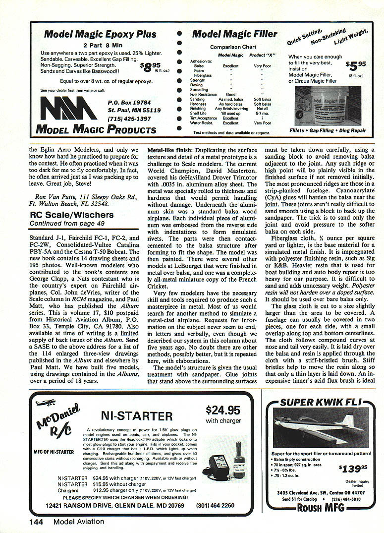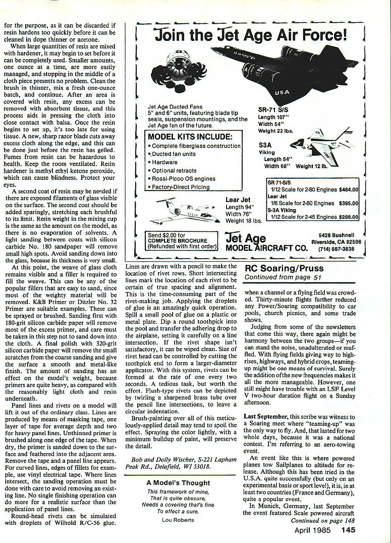 Radio Control Scale Bob & Dolly Wischer REPORT FROM PARIS definite reaction consequences com plexity bonus system now has done what originally intended past simple aircraft desirable model subjects because could detailed finished minimum effort also reasonable assurance model would fly well scalelike manner bonus system instituted give models complex aircraft sup posedly equal chance become contest winners Recent experience indicates complex multi-engine multi-func tion airplanes now have equal chance exclusion simpler designs balance between types has shifted too drastically other words modelers choice aircraft built now influenced favor complexity again obligated build model suits rules rather airplane really prefers long-time ideal aircraft models should have equal chance competition success remains illusion future can expect size bonuses will reviewed particu larly regard number engines landing gear retraction decisions present airplane build shouldnt unduly influenced foregoing FAT rules frozen un til January 1989 plenty time construct models capble taking advan tage bonuses available original intent compensate models com plex prototypes inherent disadvan tages flight example fourengined model given 20% bonus add ed its flight score reality fourengine model can lose engine during flight yet continue almost undis turbed twin-engined model having 10% bonus may dire difficul ty engine quits us have built flown twins well aware flaw imbalance bonuses evident However agreed some twins susceptible yaw snaproll problems flown engine Catalina flying boat Bob Under woods Alcor come mind being excep tionally stable flown engine throttled Both have built-in advantage having engines mounted near aircraft centerline distant future January 1989 complexity bonus 10% will awarded flight scores single ducted fans 20% twins Landing gear retraction another item may subject reduction bonus argued modern landing gear mechanisms models have become reliable 10% bonus too generous modelers have con structed own mechanisms certainly deserve full 10% should probably given award basis craftsmanship rather award flight disadvantage Countering expected proposal reduce 10% bonus 5% observations 1984 LeBourget World Championship point out winning airplanes gear retractable although should have third-place models retracts source serious shortcoming Apparently use commercial retract mechanisms no guarantee secure landings 10% bonus should therefore retained US proposal requested weight increase 7 kg 154 lbs accepted effective January 1 1989 increase tied three other items removal restrictions total surface area wing loading in48 Model Aviation Dave Nellie Navy Lockheed Hercules construcica mostiy foam hence its reason ably light 9 ibflies four 08 Max 10 FSR engines Span 80 finish acrylic lacquer over epoxy resin auto primer Hope puts scale props Jack Moores Great Lakes 2T1A Trainer rests Trexier air wheels scratchbuilt Wylam drawings MAN Metal panels made aiuminum bever age can Covering Sliron butyrate dope Craft 161/6-scale spans 54 weighs 9 lb Ray TInley built Rearwin Speedster RCM plans Powered Supertlgre 23 its superfinish K&B epoxyoverCoverite Classic ship spans 48 weighs 41/a lb crease two-stroke engine displacements match four-strokes wingloading specification has best chance being changed especially will ing accept moderate increase rather complete deletion Obtaining accep tance doubling two-stroke engine displacement may bit difficult although trend toward larger engines worldwide new proposal next years meeting should written individual item tied other changes increase total surface area com bined wing horizontal tail least likely gain acceptance since part general characteristics specifications FAI models case four-year wait until rules eligible change no great hurry action items AMA Sport Scale rules Proce dure Turn maneuver performed conjunction Straight Flight maneuver Under changed FAI rules effective immediately clarification Procedure Turn must now per formed directly front judges same position Figure Eight always done turn manner exact positioning never spelled out rules Static judging will done minimum distance meter 39 nearest part model method used US FAI events Europe measured distance models center NASA The National Association Scale Aeromodelers voice Scale US John Guenther NASA will conducting team selection trials year preparation next World Championships Control Line RC Scale Championships will held Norway probably June 1986 become active Scale organization join NASA sending $6 John Guenther RR #1 Box 715 Borden IN 47106 Scale data source booklet offering list Scale data sources mostly England has compiled Michael Smith 68 Armoury Drive Gravesend Kent DA12 lNB England Its price $2 postpaid list includes three-view sources bookshops libraries associa tions photo sources periodicals have experience using some sources listed obtain photos British French aircraft Three-view drawiags latest Historical Aviation Album has three-view drawings photos informational data Continued vase 144 Larry Pierce brought /4-scale Miles HawK L w xne l%ltcnenerWaterloo Scaie Rally Quadra 35cc files 21 -lb craft Finish poly urethane paint over polyester resin silkspan paper Wait Mouchas latest project Citabria Aerobatic Pro R Power 05 90 4-stroke Span 781/2 weight 11 lb Wait says files like dreamalready has plans larger -scale version 1 2-ft span BALSA SHEETS36 1/16233 3132 240 1/B 242 3/16248 1/4 256 1/32337 1/20337 1/163374931 3/323445837 1/8 35471 3/1636282 1/4 3730561 5/16385 3/B 38912471 1/2 3110155 3/4 3165 1/164587648 3/324709456 1/8 48010666 3/1649312275 1/4 411013464 3/8 225 1/2 4225261 MATCHED SHEETS42 3/324140 1/84108 3/164120 1/44131 BALSA ST/CKS 1/16 1/4 1/16 3/8 1/16 1/2 3/32 1/4 3/32 3/8 3/32 1/2 1/B 1/8 1/8 1/4 1/9 3/8 18 1/2 3/163/16 3/16 3/8 3/16 1/2 1/4 1/4 1/4 3/8 1/4 1/2 1/4 3/4 1/41 5/165/16 3/8 3/8 3/8 1/2 3/8 3/4 3/81 12 1/2 1/2 3/4 1/21 5/8 5/8 3/4 3/4 36 89 10 14 10 12 16 08 11 1218 18 1