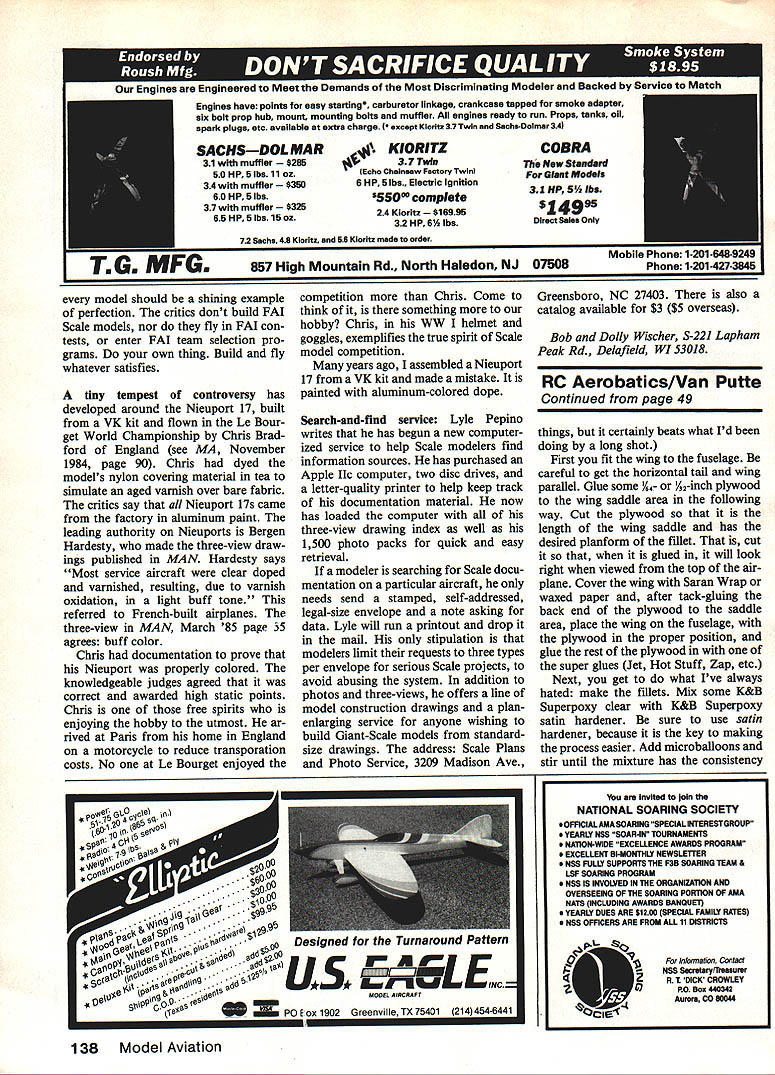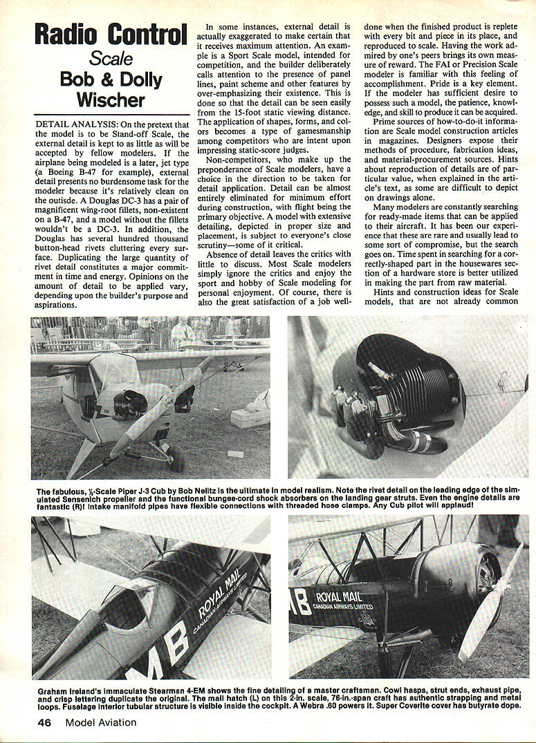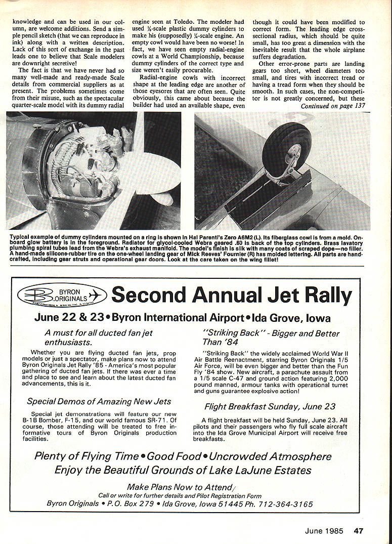 Radio Control Scale Bob & Dolly Wischer DETAIL ANALYSIS pretext model Stand-off Scale external detail kept little will accepted fellow modelers airplane being modeled later jet type Boeing B-47 example external detail presents no burdensome task modeler because its relatively clean outisde Douglas DC-3 has pair magnificent wing-root fillets non-existent B-47 model fillets wouldnt DC-3 addition Douglas has several hundred thousand button-head rivets cluttering sur face Duplicating large quantity rivet detail constitutes major commit ment time energy Opinions amount detail applied vary depending upon builders purpose aspirations some instances external detail actually exaggerated make certain receives maximum attention An exam ple Sport Scale model intended competition builder deliberately calls attention presence panel lines paint scheme other features over-emphasizing existence done detail can seen easily 15-foot static viewing distance application shapes forms col ors becomes type gamesmanship among competitors intent upon impressing static-score judges Non-competitors make up preponderance Scale modelers have choice direction taken detail application Detail can almost entirely eliminated minimum effort during construction flight being primary objective model extensive detailing depicted proper size placement subject everyones close scrutinysome critical Absence detail leaves critics little discuss Most Scale modelers simply ignore critics enjoy sport hobby Scale modeling personal enjoyment course also great satisfaction job welldone finished product replete bit piece its place reproduced scale Having work ad mired ones peers brings its own meas ure reward FAI Precision Scale modeler familiar feeling accomplishment Pride key element modeler has sufficient desire possess such model patience knowl edge skill produce can acquired Prime sources how-to-do-it informa tion Scale model construction articles magazines Designers expose methods procedure fabrication ideas material-procurement sources Hints about reproduction details par ticular value explained arti cles text some difficult depict drawings alone modelers constantly searching ready-made items can applied aircraft has experi ence rare usually lead some sort compromise search goes Time spent searching cor rectly-shaped part housewares sec tion hardware store better utilized making part raw material Hints construction ideas Scale models already common fabulous kScale Piper J3 Cub Bob Neiitz ultimate model realism Note rivet detail leading edge slm ulated Sensenich propeller functional bungee-cord shock absorbers landing gear struts engine details fantastic Rl Intake manifold pipes have flexible connections threaded hose clamps Any Cub pilot will applaud Graham Irelands immaculate Stearman 4EM shows fine detailing master craftsman Cowl hasps strut ends exhaust pipe crisp lettering duplicate original mail hatch L 2ln scale 76-In.span craft has authentic strapping metal loops Fuselage interior tubular structure visible inside cockpit Webra 60 powers Super Coverite cover has butyrate dope 46 Model Aviation knowledge can used col umn welcome additions Send sim ple pencil sketch can reproduce ink along written description Lack sort exchange past leads believe Scale modelers downright secretive fact have never well-made ready-made Scale details commercial suppliers present problems sometimes come misuse such spectacular quarter-scale model its dummy radial engine seen Toledo modeler used 14-scale plastic dummy cylinders make supposedly 1A-scale engine An empty cowl would have no worse fact have seen empty radial-engine cowls World Championship because dummy cylinders correct type size werent easily procurable Radial-engine cowls incorrect shape leading edge another eyesores often seen Quite obviously came about because builder used available shape though could have modified correct form leading edge crosssectional radius should quite small has too great dimension inevitable result whole airplane suffers degradation Other error-prone parts landing gears too short wheel diameters too small tires incorrect tread having tread form should smooth such cases non-competi tor greatly concerned Continued page 137 Typical example dummy cylinders mounted ring shown Hal Parentis Zero A6M2 1 Its fiberglass cowl mold board glow battery foreground Radiator giycoicooied Webra geared 60 back top cylinders Brass lavatory plumbing spiral tubes lead Webras exhaust manifold models finish silk coats scraped dopeno filler handmade siiiconerubber tire onewheei landing gear Mick Reeves Fournier R has molded letterIng parts hand crafted including gear struts operational gear doors Look care taken wIng fillet ORIGINALS- SecondJet BYRONAnnualRally June 22 & 23 Byron International Airport Ida Grove Iowa must duc ted fan jet enthusiasts Whether flying ducted fan jets prop models just spectator make plans now attend Byron Originals Jet Rally 85 Americas popular gathering ducted fan jets ever time place see learn about latest ducted fan advancements Special Demos Amazing New Jets Special jet demonstrations will feature new B-i B Bomber F-i 5 world famous SR-7i course attending will treated free formative tours Byron Originals production facilities Striking Back Bigger Better 84 Striking Back widely acclaimed World War Ii Air Battle Reenactment starring Byron Originals 1/5 Air Force will bigger better Fun Fly 84 show New aircraft parachute assault i/S scale 0-47 ground action featuring 2000 pound manned armour tanks operational turret guns guarantee explosive action Flight Breakfast Sunday June23 flight breakfast will held Sunday June 23 pilots passengers fly full scale aircraft Ida Grove Municipal Airport will receive free breakfasts P/en ty Flying Time Food owded tmosphere Enjoy Beautiful Grounds Lake La June Estates Make Plans Now Attend, Call write further details Pilot Registration Form Byron Originals ox 279 Grove Iowa 51445Ph 712-364-3165 June1985 47 mixer transmitter 