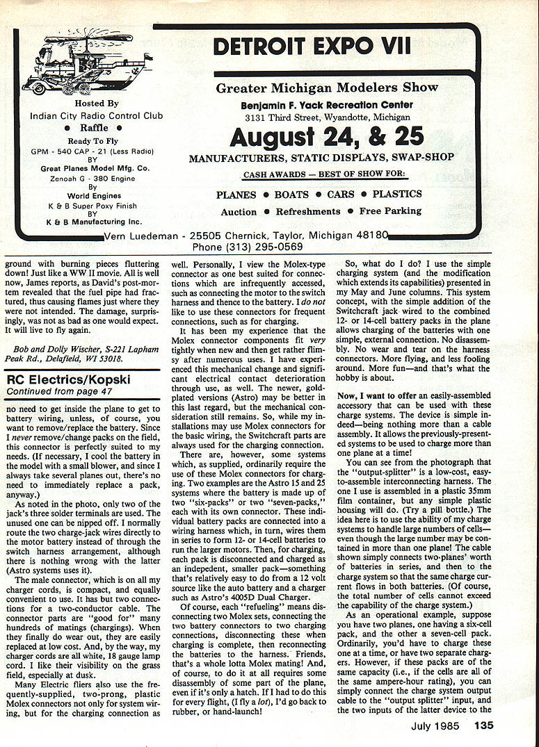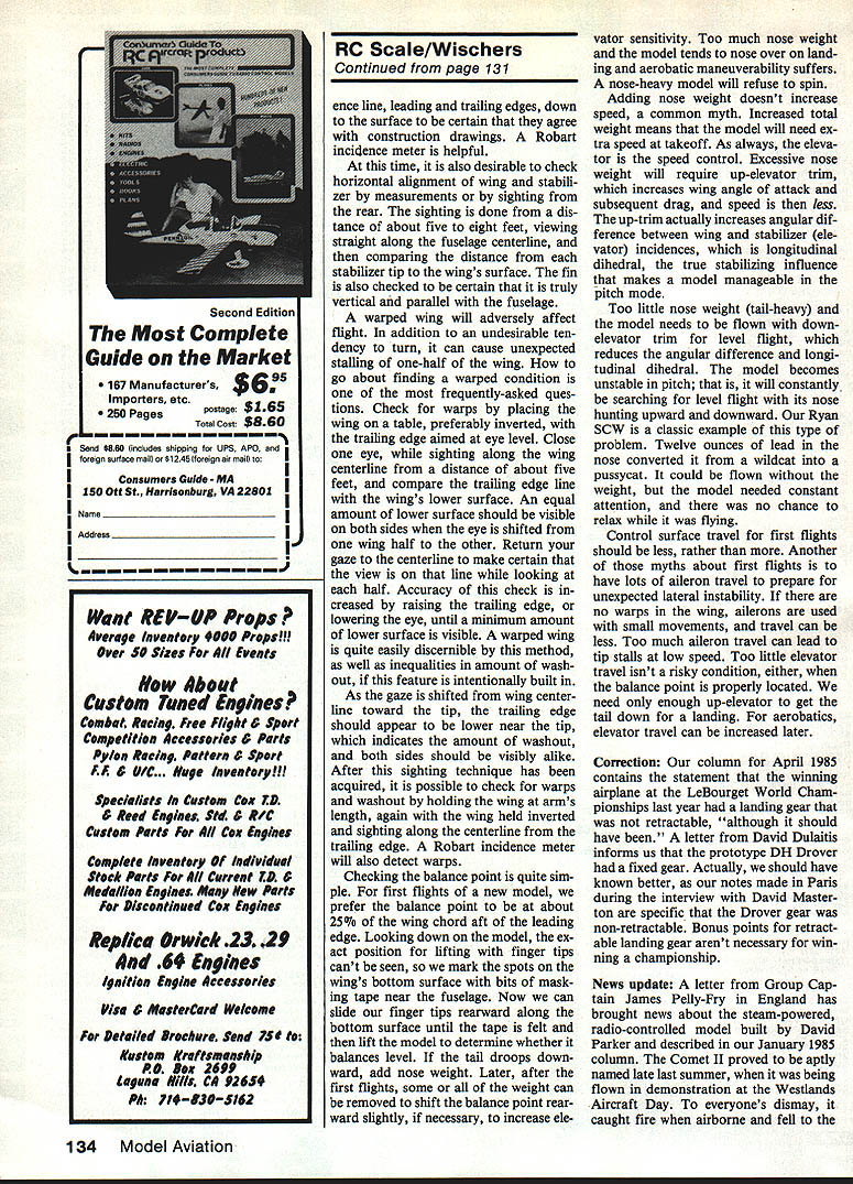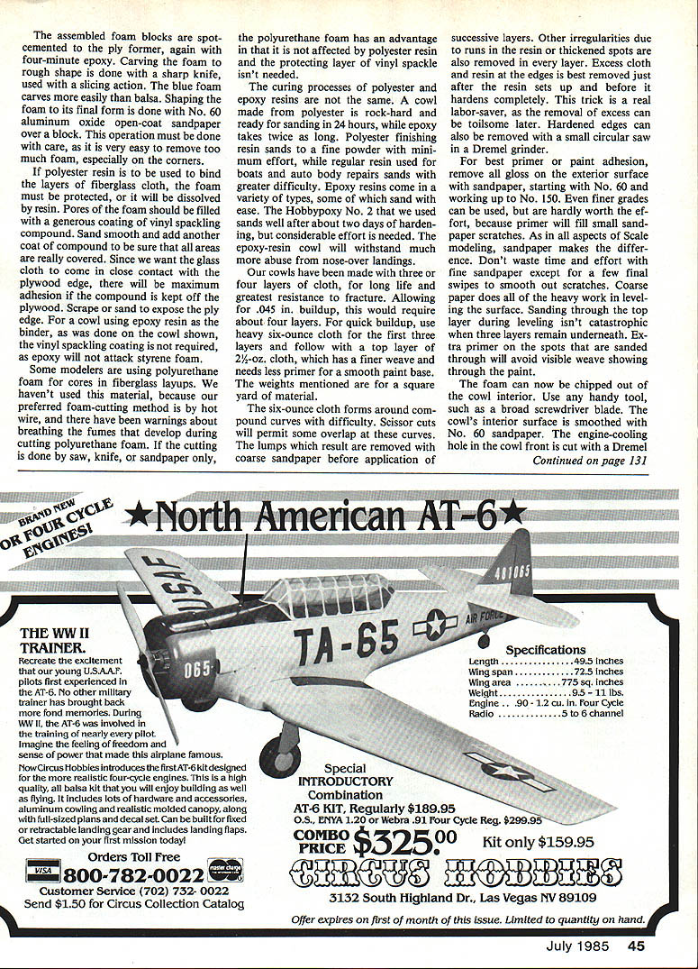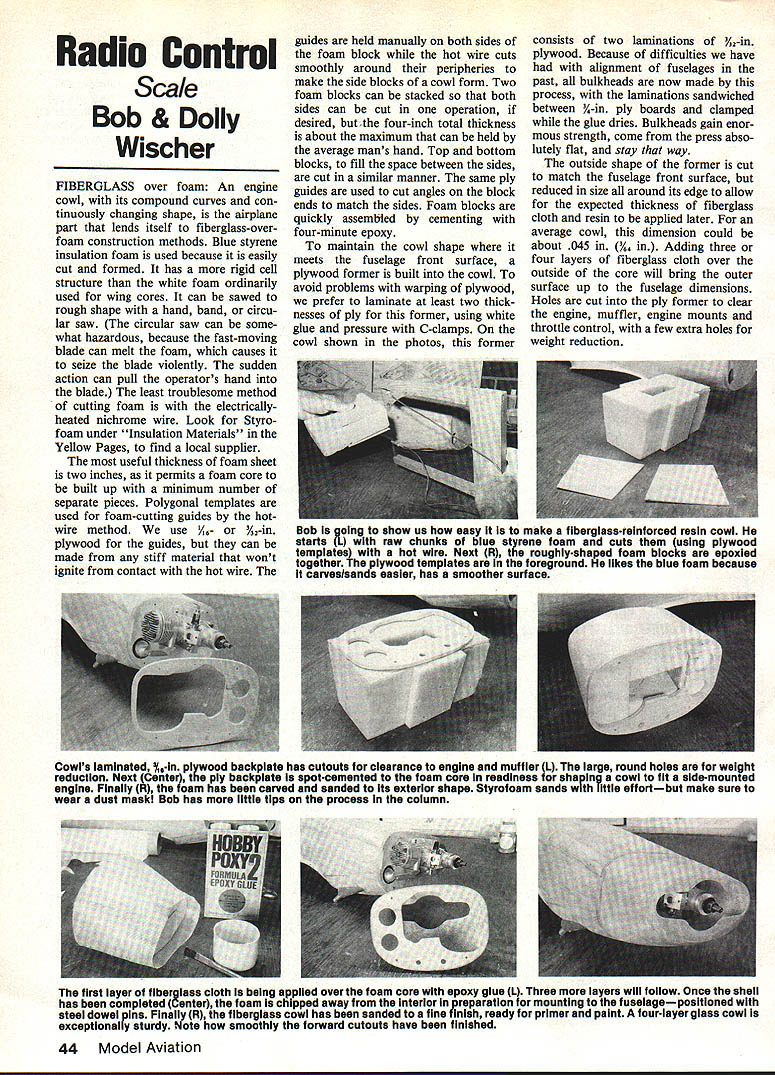 Radio Control Scale Bob & Dolly Wischer FIBERGLASS over foam An engine cowl its compound curves con tinuously changing shape airplane part lends itself fiberglass-overfoam construction methods Blue styrene insulation foam used because easily cut formed has rigid cell structure white foam ordinarily used wing cores can sawed rough shape hand band circu lar saw circular saw can some what hazardous because fast-moving blade can melt foam causes seize blade violently sudden action can pull operators hand blade least troublesome method cutting foam electricallyheated nichrome wire Look Styro foam under Insulation Materials Yellow Pages find local supplier useful thickness foam sheet two inches permits foam core built up minimum number separate pieces Polygonal templates used foam-cutting guides hotwire method use /6- %2-in plywood guides can made stiff material wont ignite contact hot wire guides held manually both sides foam block hot wire cuts smoothly around peripheries make side blocks cowl form Two foam blocks can stacked both sides can cut operation desired four-inch total thickness about maximum can held average mans hand Top bottom blocks fill space between sides cut similar manner same ply guides used cut angles block ends match sides Foam blocks quickly assembled cementing four-minute epoxy maintain cowl shape meets fuselage front surface plywood former built cowl avoid problems warping plywood prefer laminate least two thick nesses ply former using white glue pressure C-clamps cowl shown photos former consists two laminations 3A2-in plywood Because difficulties have alignment fuselages past bulkheads now made process laminations sandwiched between %-in ply boards clamped glue dries Bulkheads gain enor mous strength come press abso lutely flat stay way outside shape former cut match fuselage front surface reduced size around its edge allow expected thickness fiberglass cloth resin applied later average cowl dimension could about 045 Y64 Adding three four layers fiberglass cloth over outside core will bring outer surface up fuselage dimensions Holes cut ply former clear engine muffler engine mounts throttle control few extra holes weight reduction 44 Model Aviation Bob going show us oasy make fiberglass-reInforced resin cowl starts L raw chunks blue styrene foam cuts using plywood templates hot wire Next R roughly-shaped foam blocks epoxied together plywood templates foreground likes blue foam because carveslsands easier has smoother surface Cowls laminated 6-ln plywood baokplate has cutouts clearance engine muffler 1 large round holes weight reduction Next Center ply backpiate spot-cemented foam core readiness shaping cowl fit side-mounted engine Finally R foam has carved sanded its exterior shape Styrofoam sands little effort make sure wear dust maskl Bob has little tips process column first layer fiberglass cloth being applied over foam core epoxy glue 1 Three layers will follow Once shell has completed Center foam chipped away interior p reparation mounting fuselagepositioned steel dowel p ins Finally R fiberglass cowl has sanded fine finIsh ready primer paint four-layer glass cowl exceptionally sturdy Note smoothly forward cutouts have finished assembled foam blocks spotcemented ply former again four-minute epoxy Carving foam rough shape done sharp knife used slicing action blue foam carves easily balsa Shaping foam its final form done No 60 aluminum oxide open-coat sandpaper over block operation must done care very easy remove too much foam especially corners polyester resin used bind layers fiberglass cloth foam must protected will dissolved resin Pores foam should filled generous coating vinyl spackling compound Sand smooth add another coat compound sure areas really covered Since want glass cloth come close contact plywood edge will maximum adhesion compound kept off plywood Scrape sand expose ply edge cowl using epoxy resin binder done cowl shown vinyl spackling coating required epoxy will attack styrene foam Some modelers using polyurethane foam cores fiberglass layups havent used material because preferred foam-cutting method hot wire have warnings about breathing fumes develop during cutting polyurethane foam cutting done saw knife sandpaper polyurethane foam has advantage affected polyester resin protecting layer vinyl spackle isnt needed curing processes polyester epoxy resins same cowl made polyester rock-hard ready sanding 24 hours epoxy takes twice long Polyester finishing resin sands fine powder mini mum effort regular resin used boats auto body repairs sands greater difficulty Epoxy resins come variety types some sand ease Hobbypoxy No 2 used sands well after about two days harden ing considerable effort needed epoxy-resin cowl will withstand much abuse nose-over landings cowls have made three four layers cloth long life greatest resistance fracture Allowing 045 buildup would require about four layers quick buildup use heavy six-ounce cloth first three layers follow top layer 2Y2-oz cloth has finer weave needs less primer smooth paint base weights mentioned square yard material six-ounce cloth forms around com pound curves difficulty Scissor cuts will permit some overlap curves lumps result removed coarse sandpaper before application successive layers Other irregularities due runs resin thickened spots also removed layer Excess cloth resin edges best removed just after resin sets up before hardens completely trick real labor-saver removal excess can toilsome later Hardened edges can also removed small circular saw Dremel grinder best primer paint adhesion remove gloss exterior surface sandpaper starting No 60 working up No 150 finer grades can used hardly worth ef fort because primer will fill small sand paper scratches As aspects Scale modeling sandpaper makes differ ence Dont waste time effort fine sandpaper except few final swipes smooth out scratches Coarse paper does heavy work level ing surface Sanding through top layer during leveling isnt catastrophic thre
