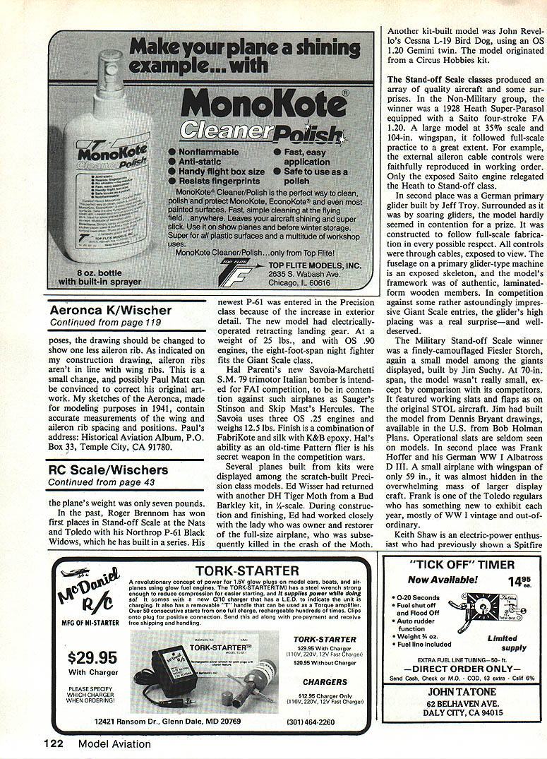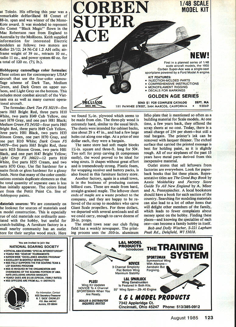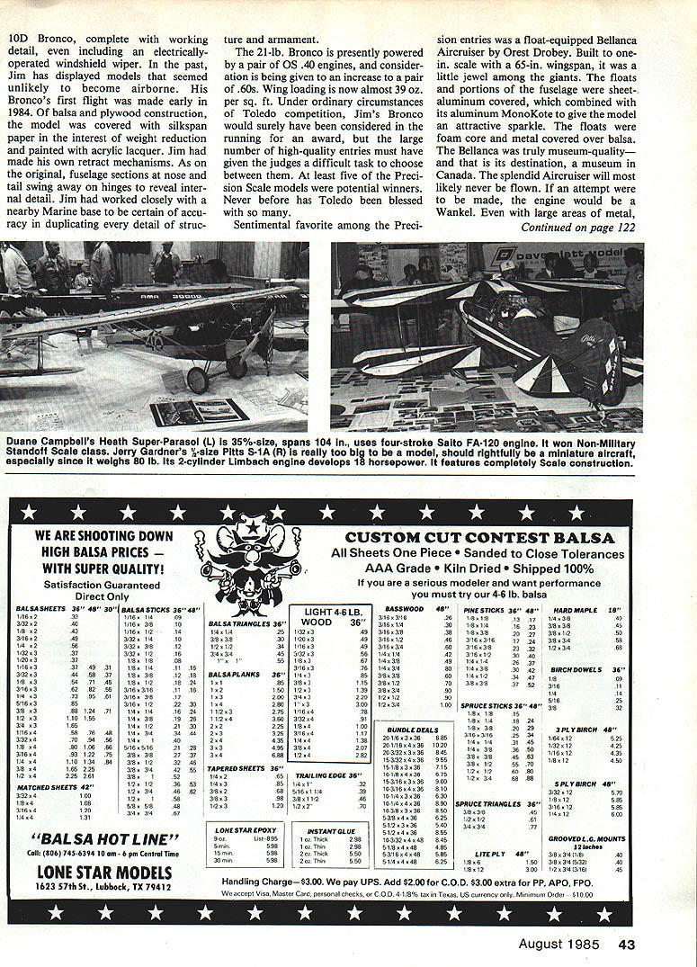 Radio Control Scale Bob & Dolly Wischer TOLEDO AIRPLANES bountiful year high-quality airplanes Toledo show Judges selections winners Scale classes would based upon concerted search minor imper fections slight variations quality between top airplanes fine examples Scale modeling its best Winner first place well Best-of-Show award Steve Saugers familiar Stinson Trimotor common ly-heard remark viewers around table Precision Scale models pretty never flown ex pressed opinion securely put rest Toledo Steves Stinson has flown has placed him FAI Scale team have watched Steve made landing two dead engines Only right outboard continued run no apparent loss stability prototype Steves Trimotor existing restoration has paid regular visits EAA convention Oshkosh Pennsylvania Central Airlines colors Fineness finish detailing trademarks Steves crafts manship addition usual rib stitching now commonly found accurate Scale models Steve also shown stitching fabric over fuselage stringersand documenta tion color photos prove correct Although scale 1-size model quite large 90-in span center engine 05 25 out boards HR 25s Small hatches almost invisible cowl tops raised access engines glow plugs model example current trend toward building FAI airplanes large possible keeping weight just below 132-lb top limit because large airplanes fly better its three engines retracting gear awarded 25% bonus added flight score FAI events hope see Stinson again Scale team trials August 23-25 conducted Tom Sawyer State Park near Louisville Kentucky Placing second Precision Scale class Toledo rules Mooney-Culver design 1937 Dart Paul Weigand -size Dart very large airplane 118-in wingspan 32 lbs Quadra 50 engine Paul used fac tory drawings design elaborate model its features outstanding quality Finish Randolph butyrate dope over Coverite high gloss achieved mixing clear dope final coat Unusual model its ball-bearing ailerons Sheet vinyl used give metal-like appearance wherever required fuselage panels windshield canopy frames interior trim simulate sheet aluminum expansive wing fillets Working oleos landing gear sliding canopy wiiidows added realism Dart hadnt flown Toledo time its low wing loading 32 oz per sq ft would indicate certainly flyable Jerry Gardners famous -size Pitts S-lA appeared Toledo second time awarded third place Preci sion class Two years ago seen skeleton showing its structure dupli cated full-size Pitts degree never before seen modeling detail model exactly duplicates materials structure prototype engine two-cylinder Limbach 18 horse power swinging 36-12 prop working mechanism structure adds up overwhelming 80 lbs airplane Thats considerably excess AMAs Safety Code upper limit 55 lb cov ering material prototype Ce conite final finish Ditzler paint After years absence Jim Funduk returned Toledo another hjs extraordinary Precision Scale models newest 80-in wingspan A-scale OV RC Scale Toledo Jim Funduk always brings spectacular models 1-118 newest North American OV1OD Bronco L 80-in span Operational features Include electrically-driven windshield wiper Jim Suchys Flesier Storch R won 1st Military Standoff Scale Craft derived Dennis Bryant plans spans 70 uses Saito 45 four-stroke engine Steve Saugers Stinson Trimotor L double-winner Best Show 1st place Precision Scaie Curtained windows uniformed pilots final touch has flown contests 1937 Culver Dart R built A-scale factory draw ings Paul Wiegand crafted beauty Its sparkling finish Randolph dope over Coverite Cushioned gear has carved balsa fairings 42 Model Aviation lOD Bronco complete working detail including electricallyoperated windshield wiper past Jim has displayed models seemed unlikely become airborne Broncos first flight made early 1984 balsa plywood construction model covered silkspan paper interest weight reduction painted acrylic lacquer Jim made own retract mechanisms As original fuselage sections nose tail swing away hinges reveal inter nal detail Jim worked closely nearby Marine base certain accu racy duplicating detail struc ture armament 21-lb Bronco presently powered pair OS 40 engines consider ation being given increase pair 60s Wing loading now almost 39 oz per sq ft Under ordinary circumstances Toledo competition Jims Bronco would surely have considered running award large number high-quality entries must have given judges difficult task choose between least five Preci sion Scale models potential winners Never before has Toledo blessed Sentimental favorite among Preci sion entries float-equipped Bellanca Aircruiser Orest Drobey Built onein scale 65-in wingspan little jewel among giants floats portions fuselage sheetaluminum covered combined its aluminum MonoKote give model attractive sparkle floats foam core metal covered over balsa Bellanca truly museum-quality its destination museum Canada splendid Aircruiser will likely never flown attempt made engine would Wankel large areas metal Continued page 122 Satisfaction Guaranteed Direct Only BALSA SHEETS 36 48 30 BALSA SliCKS 3648 11162331/16 1409 3/322401/16 3/610 1/8 2431/16 1/214 3/162493/32 1/410 1/4 2663/32 3/812 1323373/32 1/216 1203371/8 1/808 1/1633749311/8 1/41116 3/3234459371/8 3/81218 1/6 35471451/9 1/21624 3/16362625531163/161116 1/4 37395613/16 3/817 5/163853/16 1/22230 3/6 3881247114 1/41624 1/2 31101561/4 3/81926 34 31651/4 1/22130 1/1645876481/4 343444 33247084561/4 140 1/8 480106665/16 5/162128 3/16483122753/8 382737 1/4 4110134843/8 123246 3/8 2253/8 3/44255 1/2 42252613/8 152 MACHED SHEETS 421/2 1/23603 1/2 3/44662 3/3241001/2 159 1/841065/8 5/848 31641203/4 3/467 144131 BALSA HOT LINE Call 806 745 6394 10am -6pm Central lime LONE STAR MODELS 1623 57th St Lubbock TX 79412 BALSA TRIANGLES 36 1/41/425 3/83/830 1/21/234 3/43/445 1 155 BALSA PLANKS36 1185 12159 13200 14280 11/23275 11/24360 22225 23325 24435 33495 34688 TAPERED SHEETS 36 14265 1/4385 3/8268 3/8398 1/23120 LIGHT 4-6 LB WOOD36 1/32349 1/20349 1/16349 3/32359 1/8367 318376 14385 3/83115 123138 3/43220 13300 1/1647