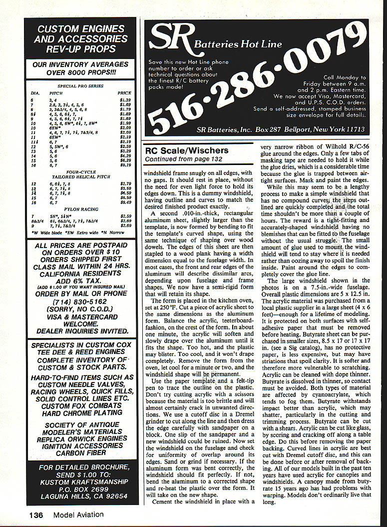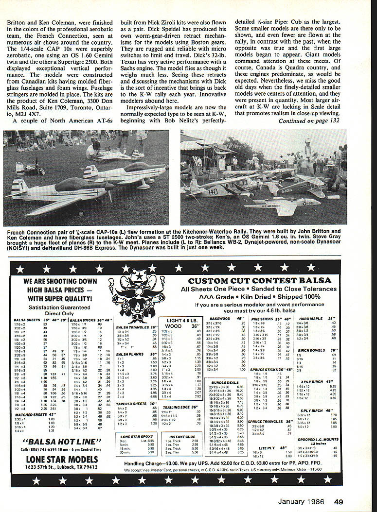 ~itii Scale Bob Dolly Wischer THE Kitchener-Waterloo Scale Rally weekend annual rally first after Labor Day blessed pleas ant temperature virtually no wind late Friday afternoon better parking spots large campground ad jacent Flying Dutchmens club field Kiwanis Park already occupied Everything about gathering pointed heavy schedule social activitj cen tered around showing large-screen video usual corn roast Satur day evening 154 airplanes regis tered down slightly expected 200 ared past meets Some models displayed flown excellent weather kept sky filled models Only exhaustion RC battery packs stopped some addi tional flights late Sunday afternoon beginning see pairs airplanes flown unison meet Two look-alike CAP-b models John Latest FAI Scale effort Jack Swift Fiat CR32 Chirri OS 12 Cu 4-stroker power Scale ratio 155 finish butyrate dope over Sig Koverall weight 105 lb Camouflage applied airbrush Note authentic scalloped trailing edges wings neatlyapplied cockpit edging Rivet detail does show up well photos panel lines 48 Model Aviation Bob shows us form sturdy plastic windshield Necessary Items include paper template above forms used make windshield Doilys oven used heat plastIc form aluminum tool below L Success below R Small scraps masking tape hold windshield place easy gluing RIC56 glue Britton Ken Coleman finished colors professional aerobatic team French Connection seen numerous air shows around country 1/4-scale CAP lOs superbly aerobatic using 05 160 Gemini twin other Supertigre 2500 Both displayed exceptional vertical perfor mance models constructed Canadian kits having molded fiber glass fuselages foam wings Fuselage stringers molded place kits product Ken Coleman 3300 Don Mills Road Suite 1709 Toronto Ontar io M2J 4X7 couple North American AT-6s built Nick Ziroli kits also flown pair Dick Speidel has produced own worm-gear-driven retract mechan isms models using Boston gears rugged reliable micro switches limit end travel Dicks 32-lb Texan has very active performance Sachs engine model flies though weighs much less Seeing retracts discussing mechanisms Dick sort incentive brings us back K-W rally year Innovative modelers abound Impressively-large models now normally expected type seen K-W beginning Bob Nelitzs perfectlydetailed A-size Piper Cub largest Some smaller models shown fewer flown rally contrast past opposite true first large models began appear Giant models command attention meets course Canada Quadra country engines predominate would expected Nevertheless miss good old days finely-detailed smaller models centers attention present quantity Most larger air craft K-W lacking Scale detail promotes realism close-up viewing Continued page 132 French Connection pair /4-scale CAP-lOs 1 flew formation Kitchener-Waterioo Raily built John Britton Ken Coleman have fiberglass fuselages Johns uses ST 2500 two-stroke Kens OS Gemini 16 Cu twin Steve Gray brought huge fleet planes R KW meet Planes include L R Bellanca WB-2 Dynajet-powered non-scale Dynasoar NOISY deHavilland DH-86B Express Dynasoar built just week WE ARE SHOOTING DOWN~- STOM CUT CONTEST BALSA HIGHBALSAPRICESAll Sheets Piece ed Close Tolerances WITH SUPER QUALITY A Grade Dried ped 100% Satisfaction Guaranteed rious modeler want performance Direct Only must try 4-6 lb balsa BALSA SHEETS 36 48 30 1/16233 3132 240 1/8 ,243 3/16249 1/4 ,256 1/32337 1/20337 1/163374931 3/32 3445837 1/8 3547145 3/18 3630355 1/4 3739561 5/18385 3/8 38812471 1/2 3114155 3/4 ,3195 1/164587648 3/32 4709456 1S 48414666 3/1649312275 /4 411413484 3/8 4165235 1/2 4225261 MATCHED SHEETS 42 3/324100 1/8 4108 3/164120 1/44131 BALSA SliCKS 3648 1/18 1/449 1/16 3/910 1/16 1/214 3/32 1/410 3/32 3/812 3/32 1/216 1/9 1/848 1/8 141116 1/8 381218 1/8 1/21424 3/163/161116 3/16 3/817 3/16 1/22235 1/4 1/41624 1/4 3/81926 1/4 1/22134 1/4 3/43444 1/4 140 5/165162128 3/8 3/82737 3/8 123246 3/8 344255 3/8 152 1/2 1/23653 1/2 3/44662 1/2 158 5/9 5/848 3/4 3467 LIGHT 4-6 LB WOOD36 1/32349 1/20349 1/16349 3/32356 1/8367 3/16376 1/4385 3/83115 1/23139 3/43220 13300 1/16478 332491 1/84140 3/164117 1/44138 3/84207 1/24282 BALSA ,dANGLES 36 1/41425 3/83/830 1/21/234 343/445 1155 BALSA PLANKS36 1185 12150 13250 14280 11/23275 11/24365 22225 23325 24435 33495 34688 TAPERED SHEETS 36 1/4265TRAILING EDGE36 1/43851/4132 3/62685161 1/438 3/83583/811246 1/231251/2279 LORESTAREPOXY 9,L,1 895 5,,598 15,,588 34 ,H598 INSTANT CLUE 1 , Thid296 1 z TS/288 2z TS/k550 2z Th/554 48 28 34 38 46 84 42 48 64 64 70 94 94 100 BUNDLE DEALS 241/6338685 20-1/164361020 243/32336844 15-3/32 436955 15-1/8336715 15-1/8436675 15316336900 10318436910 101/4336630 141/4436890 14-3/8 336450 5-3/8436625 5-1/2336544 5-1/2436855 103/32448845 51/8448485 5-3/16448585 5-1/4448625 PINE STICKS 36 48 HARD MAPLE 1/4 36 3/8 3/8 3/81/2 3/83/4 1/234 18 1/5 1 8 14 1/838 316 316 3/1838 3161/2 / 4 14 1438 14 1 2 38 SPRUCE STICKS 3648 1/8 1/815 18 1/41824 18 3/82428 3163/162534 14 143148 14 3/83650 3/8 3/84583 38 1/25570 12 1/26484 12 346888 SPRUCE TRIANGLES 36 38 3845 121/261 34 3/477 LITE PLY 48 1/86154 1/812300 18 40 45 54 58 68 36 09 11 14 25 32 3PLYBIRCH48 16412525 1/3212425 1/1612435 1/812450 SPLYBIRCH48 33212574 1812585 31512585 1412800 GROOVED LG MOUNTS 12 IncheS 3/83/4/16/40 3834/5/32/40 1234/3/16/45 Handling Charge$300 pay UPS Add $200 COD $300 extra PP APO FPO BIRCH DOWELS 1/8 316 1/4 5/16 3/8 January 1986 49 BASSWOOD 3/163161317 3161/41623 3/163/82027 3/141/21724 316 3/42332 141/43444 143/82637 14343042 38 3/83447 3/81/23752 3/8 3/4 1/212 1/234 BALSA HOT LINE Call 606 7456394 10 am- 6pm Central Time LONE STAR MODELS 1623 57th St Lubbock TX 79412 A4 TEL FOUR CYCLE ENGINE MOUNTS Cast oluminurrr alloy Ground 90 thrust tine Bsght polish finished Socket cop screws inCluded 600 BOO 1000 1000 1000 1000 1000 1000 1200 1100 1300 No JT-62OS MAX FS 60-75-901300 No JT-64ENVA 60-80-90-120 4C1300 No JI-65SAITO PA 651300 No JT-120 Uridrited 120 1600 No Jf-121 ENYA R 120 PC 1800 No JT-122 OS MAX PS 120 1800 No -123 SAITO P