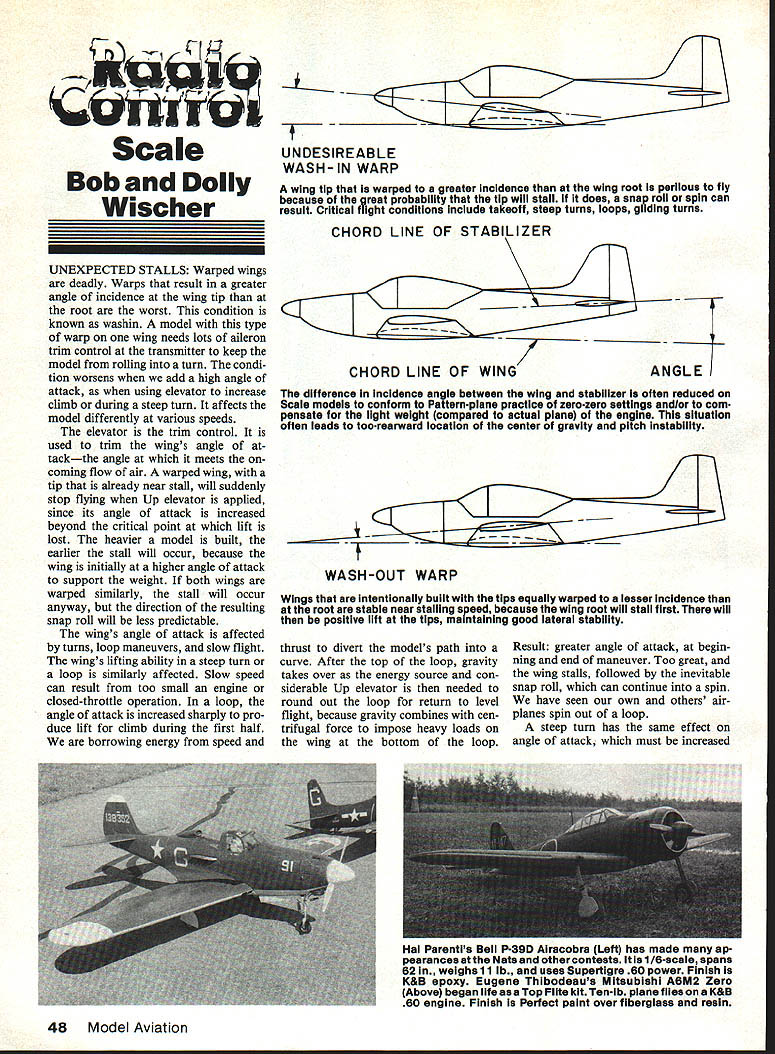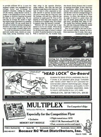 Scale Bob Dolly Wischer UNEXPECTED STALLS Warped wings deadly Warps result greater angle incidence wing tip root worst condition known washin model type warp wing needs lots aileron trim control transmitter keep model rolling turn condi tion worsens add high angle attack using elevator increase climb during steep turn affects model differently various speeds elevator trim control used trim wings angle tackthe angle meets coming flow air warped wing tip already near stall will suddenly stop flying Up elevator applied since its angle attack increased beyond critical point lift lost heavier model built earlier stall will occur because wing initially higher angle attack support weight both wings warped similarly stall will occur anyway direction resulting snap roll will less predictable wings angle attack affected turns loop maneuvers slow flight wings lifting ability steep turn loop similarly affected Slow speed can result too small engine closed-throttle operation loop angle attack increased sharply pro duce lift climb during first half borrowing energy speed UN DES IRE AB LE WASH-IN WARP wing tip warped greater incidence wing root perilous fly because great probability tip will stall does snap roll spin can result Critical flight conditions include takeoff steep turns loops gil ding turns CHORD LINE OF STABILIZER CHORD LINE OF WINGANGLE difference incidence angle between wing stabilizer often reduced Scale models conform Patternplane practice zero-zero settings andlor com pensate light weight compared actual plane engine situation often leads too-rearward location center gravity pitch instability WASH-OUT WARP Wings intentionally built tips equaily warped lesser incidence root stable near stalling speed because wing root will stall first will positive lift tips maintaining good lateral stability thrust divert models path curve After top loop gravity takes over energy source con siderable Up elevator needed round out loop return level flight because gravity combines cen trifugal force impose heavy loads wing bottom loop Result greater angle attack begin ning end maneuver Too great wing stalls followed inevitable snap roll can continue spin have seen own others air planes spin out loop steep turn has same effect angle attack must increased Hal Parentis Bell P-39D Airacobra Left has made ap pearances Nats other contests 1/6-scale spans 62 weighs 11 lb uses Supertigre 60 power Finish K&B epoxy Eugene Thibodeaus Mitsubishi A6M2 Zero Above began life Top Flits kit Ten-lb plane flies K&B 60 engine Finish Perfect paint over fIberglass resin 48 Model Aviation provide sufficient lift 1 carry airplanes weight now multiplied cen trifugal force 2 change airplanes direction Lifting airplane off runway using elevator control similar beginning loop change direction requiring increased lift can stall warped wing told average RC model flight has kinetic energy equivalent speeding 45 caliber bullet No would stand path bullet attempt changing its direction time Up ele vator used alter models flight path avoid attendant problems associ ated washin warp models some times built having intentional warp wings opposite direction called washout wing tips have less incidence angle wing root type warp often employed fullscale aircraft prevent tip-stall tenden cies assure wing root near fuselage will stall first tips continue supply good lift Four five degrees warp may seem excessive would straight wing sharp ly-tapered wing amount normal Washout isnt cure-all may appear models flying inverted becomes washin Its action all-important angle attack related center gravity location model rearward CG modeler finds drastic Down elevator trim needed maintain level flight fact may insufficient effect moving elevator trim control transmitter flier forced change linkage elevator servo obtain Down elevator effect reduces wing tip angle attack point tips merely going along ride arent providing share lift model becomes laterally unsta ble tips rising falling model difficult maintain level flight Now add weight nose pro vide increased stability because know experience works can Continued page 135 CopyrIght 1977 MPC rights reserved HEAD LOCK On-Board HEAD LOCKK~zNiera Re oteSwehA CannectatAi6y Extornal Start/Chargin~Nead Jack SwitchW/Pfuit ELIMINATE DEAD STICK LANDINGS Fits OS 4 stroke & standard glow plugs Complete HEAD LOCK Mark Ill GP connector external start external start/charge jack charger w/HEAD LOCK connector quality 12 AH Nicad w/mount Completely assembled ready mount nothing else buy US made SINGLE CYL $3795 TWO CYL $4495 MULTIPLEX 14 Function ROYAL mc Especially Competition Flyer Competitors Edge Exclusive MEMORY SOFT MODULE Flight tested since 1979 2001 FM Narrowband PCM Fast accurate service repair March 7725 E Redfield Rd e 105 tsdale Airpark tsdale Arizona 85260 602483-9577 Beemer RC West Distributors Inc 1986 49 Drawings Smithsonian Institution used George Roses scratch-built Spad Xiii 1 /5-scaic Left Mod el spans 63 weighs 111/2 ib An Enya Sofour-stroke powers Greg Wilsons scratch-built Bristol Mi-C Above 1/4-scale 8-ft span weighs 20 lb uses Kawasaki 35 Cu power immense spinner about eight inches diameter RC Soaring/Pruss Continued page 131 fin wire pivot-rod inserted result floppy stabilizer because usual loose tolerance tween wire tubing Some mod elers have come up remedies include larger bearing surfaces cant done some models especially smaller ones thin airfoil sections stab Greggs fix can considered almost universal Using 034-in circuit board material simply inlays two small squares left right skins vertical fin Using index drill precisely diameter pivot rod gives stab assembly thats rigid have try believe Fiberglass fuselages can use fix scabbing circuit board pieces side fin section finished models pieces could attached outside minor shimming being done root section stabilizer common wire diameters following should help 4-in music wire use No 52 index drill drilling circuit board /2-in music wire use No 42 d