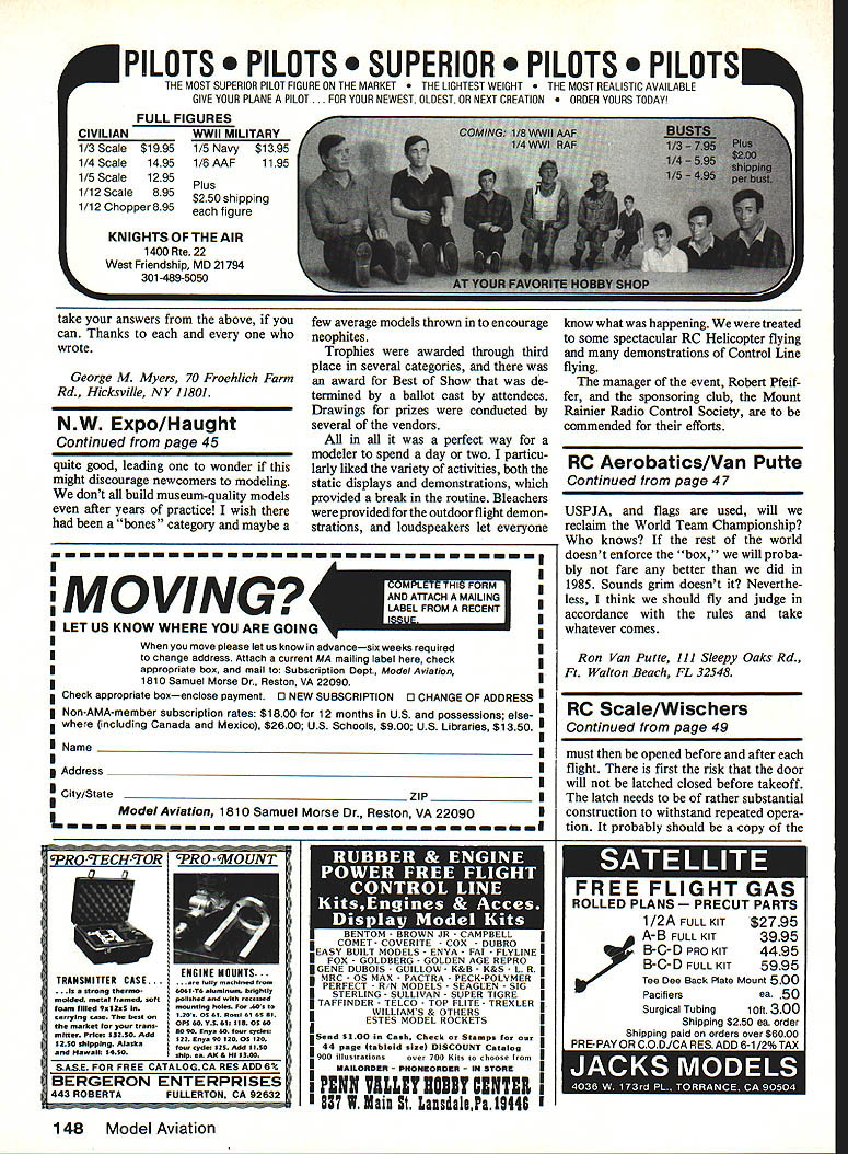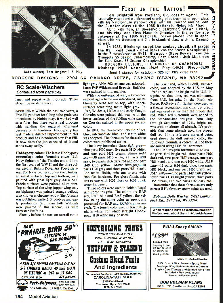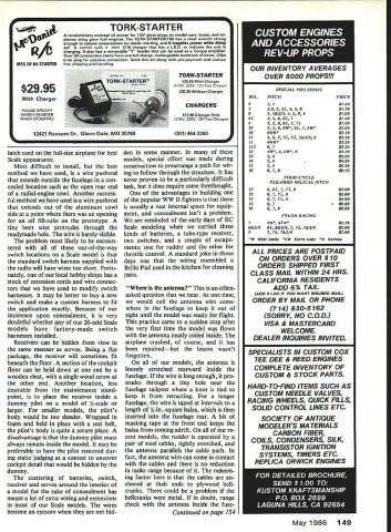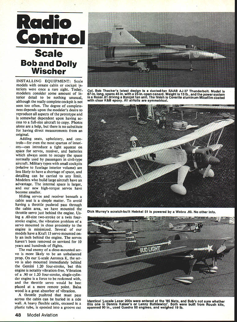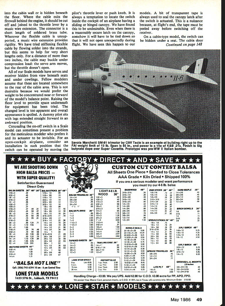Radio Control Scale Bob Dolly Wischer INSTALLING EQUIPMENT Scale models ornate cabin cockpit teriors once rare sight Today modelers consider some amount terior detail nothing unusual although really complete cockpit seen too often degree complete ness depends upon modelers desire reproduce aspects prototype somewhat dependent upon having ac cess full-size aircraft copy Photos alone help no substitute having direct measurements original Adding seats upholstery con trolsfor spartan interi orscan introduce tight squeeze space servos receiver batteries always seem occupy space normally used passengers civil-type aircraft Military types small cockpits relative fuselage interior volume less likely have shortage space detailing can carried limit Modelers build large aircraft have advantage internal space larger new high-torque servos have become smaller Hiding servos receiver beneath cabin seat simple matter avoid having throttle pushrod pass through cabin area have mounted throttle servo just behind engine Us ing 60-size two-stroke twin fourstroke engine vibration problem servo mounted close proximity engine minimized Several models have Kraft 15 servo mounted ly inch behind engine servos havent removed serviced 10 years hundreds flights real enemy close-mounted ser vo likely unbalanced prop A-scale Aeronca K ser vo also mounted immediately behind Gemini 120 four-stroke engine notably vibration-free Vibration 90 120 four-stroke single-cylin der engine force reckoned throttle servo would best placed remote point Balsa wood great absorber vibration throttle pushrod must pass across cabin can buried side wall heavy flexible cable encased plastic tube epoxied groove cut 48 Model Aviation Col Bob Thackers latest design ductedfan SAAB AJ37 Thunderbolt Model 67-In lone spans 45 23in-span canard Weight 13 lb power system Rossi 81 drIving Byrojet fan unit finish Coverite aluminum MicaflIm coated clear K&B epoxy airfoils symmetrical Dick Murrays scratch-built Heinkel 511s powered Webra 60 No other info Identical 11aScale Laser 200s entered 85 Nats Bobs sure whether Dennis Kaisers Lenny Butkiewicz Both built Roush kits spanned 90 used Quadra 50 engines weighed 19 lb cabin wall hidden beneath floor cable exits firewall behind engine should cut off joined throttle lever music wire extension connector short length soldered brass tube Wherever flexible cable unsup ported music wire extension provides rigidity have tried stiffening flexible cable flowing solder strands seems help very short lengths distance two inches cable may buckle under compression load servo arm moves throttle doesnt open Scale models have servos receiver hidden view beneath seats under cowlings Fellow modelers assume located somewhere rear cabin area desirable because would prefer weight concentrated near forward models balance point Ralsing floor level provide space underneath equipment has tried changed level too apparent overall appearance spoiled dummy pilot sits legs extended straight forward awkward position Concealing on-off switch Scale model can sometimes present problem meticulous modeler prefers its actuator invisible open-cockpit airplane consider installation such position switch can operated moving pilots throttle lever push knob always temptation locate switch inside cockpit airplane having sliding hinged canopy have found undesirable reasonably secure latch canopy somehow will have tied down will open unexpectedly during flight have seen happen models bit transparent tape always used seal canopy latch after switch actuated nuisance because flights end tape must peeled away before switching off receiver cabin-type model switch can hidden under seat cabin door Continued page 148 5AA3 WE ARE SHOOTING DOWN HIGH BALSA PRICES WITH SUPER QUALITTI Satisfaction Guaranteed Direct Only BALM SHUTS 36 48 30 BALSA STICKS 36 48 1/162331/161/409 3/322401/163/810 1/8 2431/161/214 3/162483/321/410 1/4 2063/323/612 1/323373/321/216 1/202371/81/806 1/1633749311/81/41116 3/323445837 1/83/81218 1/8 3547146 1/81/21824 3/1636292053/163/161116 1/4 37395613/163/617 5/163853/161/22230 3/6 388124711/41/41624 1/2 31101561/43/61926 3/4 3165 1/41/22130 1/164587648 1/43/43444 3/324709456 1/4140 1/6 480106660/165/162126 3/16483122753/63/82737 1/4 4110134643/81/23246 3/8 41652253/63/44255 1/2 4225261 3/8152 1/21/23053 MATCHEDSHUTS42 1/23/44662 3/324100 1/2156 1/64106 5/85/646 3/164120 3/43/467 1/44131 F BALSA TRIANGLES 36 4 425 383/630 2 235 3/4 3445 55 BALSA PLANKS 36 85 256 3206 4260 11/23275 11/24360 22225 23325 24435 33400 34660 TAPERED SHEETS 36 1/4265 1/4386 3/8288 3/6386 1/23120 LIGHT 4-6 LB WOOD36 1/32349 1/20340 1/16349 3/32356 1/8367 3/16378 1/4385 3/83110 1/23130 3/43220 1 3300 1/18478 3/32491 1/84106 3/164117 1/44138 3/64207 1/24282 TRAILING EDGE 36 1/4132 5/1611/430 3/811/246 1/2270 LONE STAR EPOXY7NTGLU71 BALSA HOT LINEsaLit.896IiOZ TOok298 Call 806745-639410.- 6pm Central timeII2o Thek560 2, [6500 LONE STAR MODELS 1623 57th St Lubbock TX 79412 SASS WOOD 3/163/16 3/161/4 3/163/6 3/16 1/2 3/163/4 1/41/4 1/43/8 1/43/4 3/63/6 3/81/2 3/83/4 1/2 1/2 1/23/4 48 26 30 30 46 60 42 49 60 60 70 80 60 100 BUNDLE DEALS 201/6330665 201/164361020 20-3/32330840 15-3/32 436955 15-1/6336715 101/6436675 15-3/16336960 103/16436810 101/430630 10-1/4430060 103/8330056 5-3/8436020 5-1/2330540 5-1/2430655 103/32446645 5-1/8446465 5-3/16448585 01/4446625 PINE STICKS 36 1/81/013 1181/416 1/83/820 3/143/1417 3163/823 3161230 1/41426 1/43030 1/41/234 3/83/037 48 HARD MAPLE 17 / 1/43/8 23 3/83/8 27 I 3/81/2 24 / 3/83/4 32 1/23/4 46 37 42 BIRCH DO WELS 47 1/6 52 3/16 1/4 5/16 SPRUCE STICKS 36 48 3/8 1/8 1/815 1/8 1/41824 1/8 3/82029 3/163/162534 1/4 1/43145 14 3/03680 3/8 3/84563 3/8 1/20570 1/2 1/26060 1/2 345688 SPRUCE TRIANGLES 3/83/8 1/2 1/2 3/43/4 36 45 61 77 IS 40 44 00 56 68 36 09 11 14 25 32 3PLYBIRCH48 1/6412525 1/3212420 1/1612435 1/812450 SPLYBIRCH48 3/3212570 1/812585 3/1612585 1/412600 GROOVED LG MOUNTS 12 Inches 3/83/4/1/8/46 3/83/4/5/32/46 1/23/4/3/1840 L