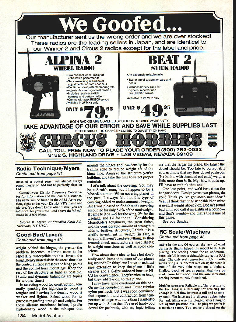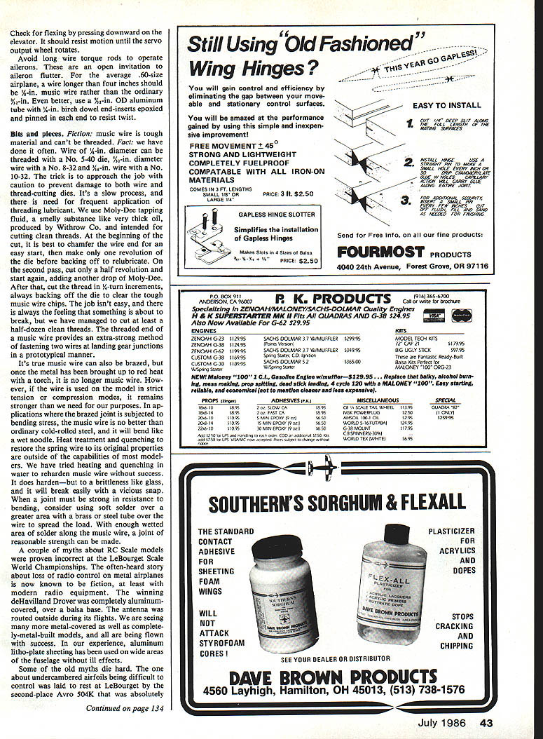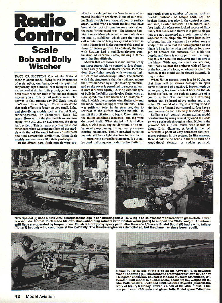 Radio Control Scale Bob Dolly Wischer FACT OR FICTION fictional theories about model flying importance scale effect bugaboo past supposedly kept model flying man ner somewhat similar its prototype have asked whether scale effect makes changes necessary airfoils tail surface areas answer present-day RC Scale models dont need changes no doubt scale effect factor very small light slow-flying models such Peanut Scale rubber-powered Schoolyard Scale RC types However size models now flying 40 60 120 engines effect isnt evident really accentuated experience compare flight mod els exact full-size counterparts find remarkable similarities Giant Scale models like prototypes distant past Scale models provided enlarged tail surfaces because ex pected instability problems None exist ing Scale models have non-scale control surface areas World War aircraft models may have root some horror stories about need increased area Morane-Saul nier Parasol Monoplane miniscule eleva tor no stabilizer gave type evil reputation being tricky sensitive flight Hazards flight probably equal enemy gunfire contrast Sopwith Strutter stabilizer/elevator com bination enormous area making threepoint landing difficult Models flown fast aerobatically susceptible control surface flutter rarely occurs slower speeds Pure fic tion Slow-flying models extremely light structure can also develop flutter problem light structures will endure stress imposed tight covering material cover permitted sag least isnt shrunken tightly wing type built-in flexibility can develop flutter slow speed have heard example complete wing flutteredand model wasnt equipped ailerons sufficient twist structure due softness surface covering material permit oscillations begin Once initiated flutter amplitude increased wing destroyed itself What started shallow dive wind gust engine vibration un balanced prop passing through rpm region causing resonance Tightly-stretched covering material stiffens light structure resist twist Returning earlier statement its usual ly speed brings destructive flutter can result number causes such flexible pushrods torque rods soft broken hinges free play control system soft flexible material control sur face itself An often-overlooked source flex ibility can lead flutter plastic hinges supported point immediately adjacent hinge pin have guilty promoting weakness cutting away wedge balsa barrel portion hinge inset wing aileron nogap fit between surfaces Cut bit too deeply no support near hinge pin can result transverse motion across hinge age condition worsens finally hear ominous whir flutter bottom loop whenever speed creases model can slowed instantly may survive flutter occurs 50-50 chance will serious damage open clevis end pushrod broken teeth servo gears fractured control horn af fected surface sudden departure control surface loud buzz fluttering surface can heard above engine prop noise sound flag strong wind similar flag control surface have common reason fluttering fast-flowing air Stiffen soft control system during model construction using several plywood fairleads wire pushrods through wing Holes plywood A-in music wire should about %2-in diameter bend rod represents point easy deflection pro motes softness system like manner should no bends wire ends wood-dowel elevator rudder pushrod Dick Speldel L used Nick ZIroil fiberglass fusciage constructing AT-S Wing baisa-over-foam covered giass cioth Power 4-cu-ln Hornet DIck made own shock-absorbing retracts Boston worm gears support 29-ib weight Aiuminum split fiaps operated torque tubes Finish Hobbypoxy epoxy paint Jim Messers 1/4-scale Bristol Scout R wing faiiure flutter gusty wind conditions K-W Raiiy Quadra engine demoiished piane has since rebuiit 42 Model Aviation Chuck Fuller swings prop Kawasaki 315-powered Waco Taperwing L aerobatic prototype flown Johnny Livingston now housed EAA museum Oshkosh WI Scratch-bulit modei quarter-scais spans 92 weighs 30 ib Mrs Fuiierassists Lockheed P-38L lafrom Royal Kit CR lathe work Maury Maroney Power pair 08 45g FinIsh im ron paint over K&B resin glass cloth Model spans 74inches Check flexing pressing downward elevator should resist motion until servo output wheel rotates Avoid long wire torque rods operate ailerons open invitation aileron flutter average 60-size airplane wire longer four inches should 1-in music wire rather ordinary /,-in better use 8A2-in OD aluminum tube A-in birch dowel end-inserts epoxied pinned end resist twist flits pieces Fiction music wire tough material cant threaded Fact have done often Wire 1-in diameter can threaded No 5-40 die %2-in diameter wire No 8-32 Y6-in wire No 10-32 trick approach job caution prevent damage both wire thread-cutting dies Its slow process need frequent application threading lubricant use Moly-Dee tapping fluid smelly substance like very thick oil produced Withrow Co intended cutting clean threads beginning cut best chamfer wire end easy start make revolution die before backing off relubricate second pass cut half revolution start again adding another drop Moly-Dee After cut thread A-turn increments always backing off die clear tough music wire chips job isnt easy always feeling something about break have managed cut least half-dozen clean threads threaded end music wire provides extra-strong method fastening two wires landing gear junctions prototypical manner Its true music wire can also brazed once metal has brought up red heat torch no longer music wire ever wire used model strict tension compression modes remains stronger need purposes ap plications brazed joint subjected bending stress music wire no better ordinary cold-rolled steel will bend like wet noodle Heat treatment quenching restore spring wire its original properties outside capabilities model ers have tried heating quenching water reharden music wire success does hardenbut brittleness like glass will break easily vicious snap joint must strong resistance bending consider using soft solder over greater area br