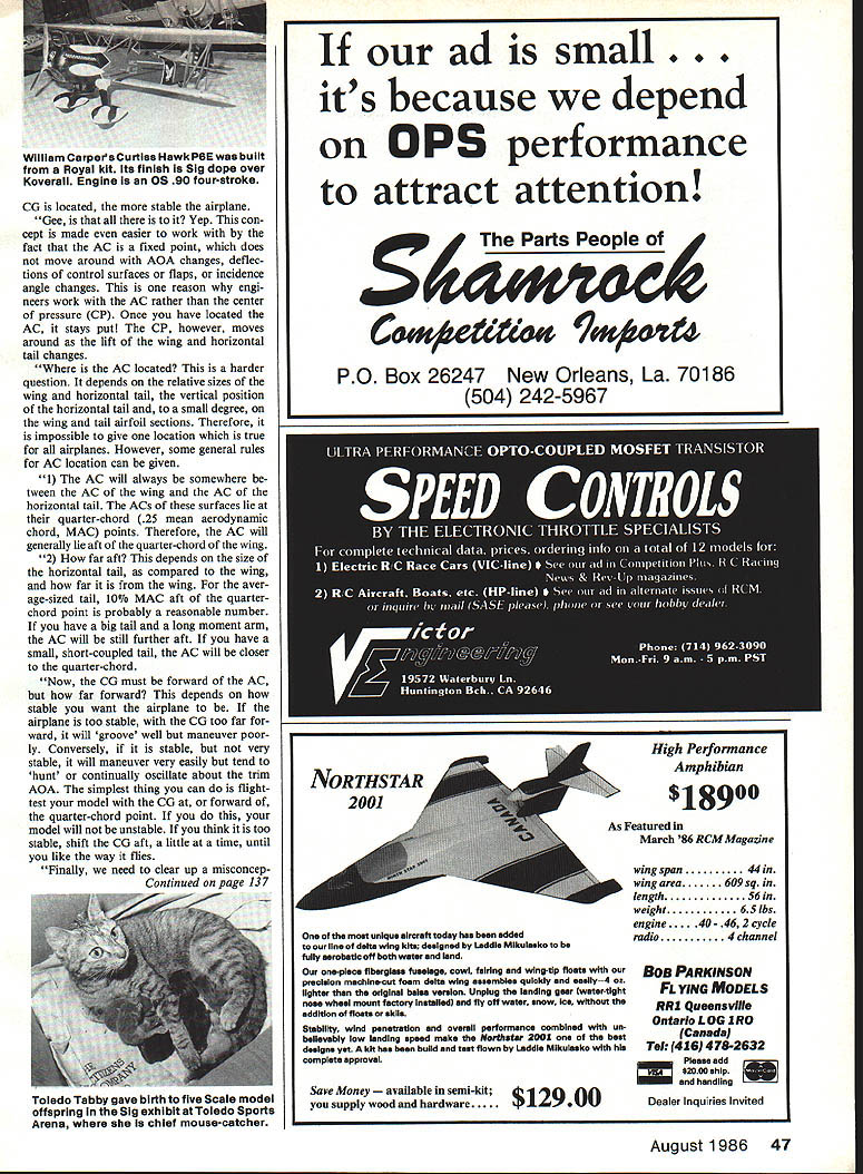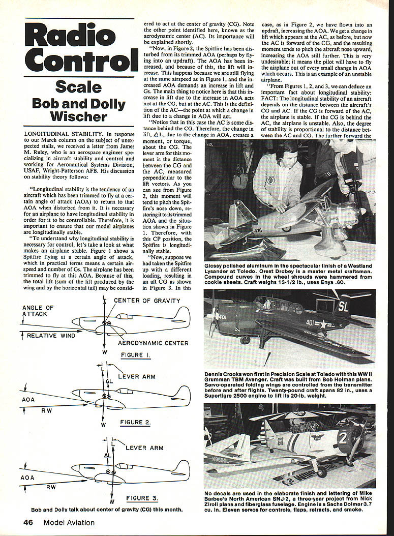 Radio Control Scale Bob Dolly Wischer LONGITUDINAL STABILITY response March column subject unex pected stalls received letter James M Ruley aerospace engineer spe cializing aircraft stability control working Aeronautical Systems Division USAF Wright-Patterson AFB discussion stability theory follows Longitudinal stability tendency aircraft has trimmed fly cer tain angle attack AQA return AOA disturbed necessary airplane have longitudinal stability order controllable Therefore important ensure model airplanes longitudinally stable understand longitudinal stability necessary control lets take look what makes airplane stable Figure 1 shows Spitfire flying certain angle attack practical terms means certain air speed number Gs airplane has trimmed fly AQA Because total lift sum lift produced wing horizontal tail may consid ANGLE OF ATTACK RELATIVE WIND ered act center gravity CO Note other point identified known aerodynamic center AC Its importance will explained shortly Now Figure 2 Spitfire has dis turbed its trimmed AOA perhaps fly ing updraft AQA has creased because lift will crease happens because still flying same airspeed Figure 1 creased AQA demands increase lift Gs main thing notice crease lift due increase AQA acts CG AC defini tion ACthe point change lift due change AQA will act Notice case AC some dis tance behind CO Therefore change lift AL due i AAA moment torque about CG lever arm mo ment distance between CG AC measured perpendicular lift vectors As can see Figure 2 moment will tend pitch Spit fires nose down re storing its trimmed AOA situa tion shown Figure 1 Therefore CP position Spitfire longitudi nally stable Now suppose taken Spitfire up different loading resulting aft CG shown Figure 3 CENTER OF GRAVITY p AERODYNAMIC CENTER W FIGURE LEVER ARM AL AO RW wFIGURE 2 1 LLEVER ARM AL AOA RW wFIGURE 3 Bob Doily talk about center gravity CG month case Figure 2 have flown updraft increasing AQA get change lift appears AC before now AC forward CG resulting moment tends pitch aircraft nose upward increasing AQA still further very undesirable means pilot will have fly airplane out small change AQA occurs example unstable airplane Figures 1 2 3 can deduce important fact about longitudinal stability FACT longitudinal stability aircraft depends distance between aircrafts CO AC CG forward AC airplane stable CO behind AC airplane unstable Also degree stability proportinnI distance bet 46 Model Aviation Glossy polished aluminum spectacular finish 0 Westiand Lysander Toledo Orest Drobey master metal craftsman Compound curves wheel shrouds hammered cookie sheets Craft weighs 13-1/2 lb uses Enys 60 / Dennis Crooks won first Precision Scale atToledo WW ii Grumman TBM Avenger Craft built Bob Hoiman plans Servo-operated folding wings controlled transmitter before after flights Twenty-pound craft spans 82 uses Supertigre 2500 engine lift its 20-lb weight No decais used elaborate finish lettering Mike Barbees North American SNJ-2 three-year project Nick ZIroil plans fiberglass fuselage Engine isa Sacha Doimar 37 cu Eleven servos controls flaps retracts smoke William CarpersCurtiss Hawk POE built Royal kit its finish Sig dope over Koverail Engine 05 90 four-stroke CG located stable airplane Gee Yep con cept made easier work fact AC fixed point does move around AQA changes deflec tions control surfaces flaps incidence angle changes reason engi neers work AC rather center pressure CP Once have located AC stays put CP however moves around lift wing horizontal tail changes AC located harder question depends relative sizes wing horizontal tail vertical position horizontal tail small degree wing tail airfoil sections Therefore impossible give location true airplanes However some general rules AC location can given 1 AC will always somewhere tween AC wing AC horizontal tail ACs surfaces lie quarter-chord 25 mean aerodynamic chord MAC points Therefore AC will generally lie aft quarter-chord wing 2 far aft depends size horizontal tail compared wing far wing aver age-sized tail lOo MAC aft quarterchord point probably reasonable number have big tail long moment arm AC will still further aft have small short-coupled tall AC will closer quarter-chord Now CG must forward AC far forward depends stable want airplane airplane too stable CG too far ward will groove well maneuver poor ly Conversely stable very stable will maneuver very easily tend hunt continually oscillate about trim AQA simplest thing can flighttest model CG forward quarter-chord point model will unstable think too stable shift CG aft little time until like way flies Finally need clear up misconcep Continued page 137 do Tabby gave birth five Scale model offspring Sig exhibit Toledo Sports Arena chief mouse-catcher Save Money lable semi-kit $129 ly wood hardwareFIJ $18900 As Featured March 86 RCM Magazine wing span44 wing area609 sq length56 weight65 lbs engine40- 46 2 cycle radio4 channel BoB PARKINSON FLWNG MODELS RRI Queensvllle Ontario LOG IRO Canada Tel 416 478-2632 Z Please add *2000 ship end handling Dealer Inquiries invited August1986 47 ad small. s because depend OPS performance attract attention g4jjsPeoPIeof Co#4etU1o 9*9044 PO Box 26247 New Orleans La 70186 504 242-5967 High Performance Amphibian moat unIque aIrcraft today has added line delta wing kits designed Laddie Mikulasko fully aerobetic off both water lend onepiecs fiberglass fuselage cowl feiring wing-tip floats precision machine-cut foam delta wing assembles quickly end easily4 oz lighter original hales version unplug landing gser water-tight nose wheel mount factory instailedi fly off water snow ice addition floats akils Stability wind penetration overall performanoa combined un believably low landing apsed make Nerthstaa 2001 beat designs yet kit has bsen build end teat flown Laddie Mikulasko complete approval S aV0 iOld Timer fOttS66Si5A3 CbauiW0From sparK 1etS poliltS Taflt5 tjtooe IgnitiOn Engine Parts Only Over 600 items Send $200 current catalog PhD am now planning propos