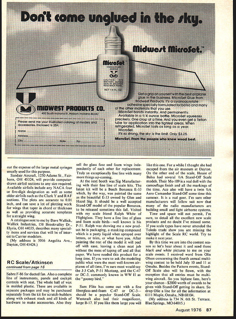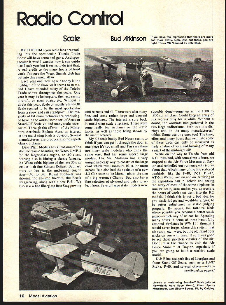 Radio Control Bud Atkinson have impression more exotic scale jobs out right VK Nieuport Bob Hess BY THE TIME scale fans read ing spectacular Toledo Trade Show will have come gone spec tacular wonder can outdo itself year seems just real credit hours hard work Im sure Weak Signals club has put annual affair year facet hobby highlight show seems have attended Toledo Trade shows throughout years year may helicopters next racing aircraft boats etc Without doubt year Scale mostly Stand-Off Scale seemed spectacular show sell standpoint ma jority kit manufacturers producing have works some sort Scale Stand-Off Scale kit scale acces sories Through efforts Minia ture Aerobatic Biplane Assn interest multi-wing birds obvious Several manufacturers producing some superb classic biplanes Dave Platt Models has kitted all-time classic beauties Waco UMF-3 larger-class engine 60 class Sterling also kitting classic favorite Waco cabin biplane late 30s well fine Stinson Reliant Both less mid-range engine sizes40 45 Royal Products showing all-time favorite Beech Staggerwing along new P-S 1 also saw fine fiberglass fuse Staggerwing retracts also fine some rather large unusual static biplanes interest sure back multi-wing scale airplanes some really big airplanes static tables well being shown manufacturers old scale buddy Bud Nosen seems think can get through door piece its too small Im sure scale modelers think same way Bud has some superb large models Mr Mulligan has very unique easy way construct large cowl must measure 10 across Bud also skeleton new J-3 Cub soon kittedabout size big Aeronca Champ Bud also has fine selection plywood balsa se lect Several large static models superbly donesome up 1500 1800 sq class Could keep army silk worms busy Without doubt warbirds gathered two large auditoriums both static dis plays manufacturers tables Some exciting ones too time effort hours went some birds can measured truly labor love burning night mid-night oil way Toledo old KC town some time burn stopped Air Force Museum Day ton rekindled romance sorry about Alice fine restored warbirds like P-40 P-51 PT-17 AT-6 FW-190 on Arriving exposition hall Toledo seeing array of same airplanes smaller scale sure makes appreciate hours work went RC models think bad idea static judges would-be judges better enlightened static judging properly seeing full-size birds possible become better static judgewhich us can Spending hours some beautifully restored airplanes WW II thought would never forget switch air scoop etc old mind does tricks time sure good see priceless classics air Dont miss chance visit Air Force Museum Dayton especially going build warbird scale model D & B has superb line fiberglass foam Stand-Off Scale such JU-87 Stuka P-40 several otherswith continued page 87 Lineup multiwing Standoff Scale jobs Hawkfield Acro Sport front Fleet Sperry Messenger two Liberty Sports Pic Quigley 16 Model Aviation Scale out expense large metal syringes usually used purpose Sandair Aircraft 1250 Adams St Fairborn OH 45324 will provide computerdrawn airfoil sections size required Available airfoils include NACA four five-digit designation well some older airfoils such Clark Y RAF sections plots accurate 001 inch can save lot plotting work wings taper chord thickness well providing accurate templates straight wing catalogue sent Dave Wallick Wallick Industries 158 Brookvalley Dr Elyria OH 44035 describes special ty items services will inter est Carrier modelers address 5016 Angelita Ave Dayton OH 45424 RC Scale/Atkinson continued page 16 Sabre F-86 ducted fan Also complete line instruments panels cockpit controls seat whole ball wax molded plastic available separate packages may purchased separately kit scratch-builders along exhaust stack kinds hardware make accessories Also sell glass fuse foam wings inde pendently other replacement Truly exceptionally fine line things up-coming next booth Sig Manufactur ing fine line scale kits latest kit will Beech Bonanza E-33 way painted same beautiful E-33 owned Glen Hazel Sig should well accepted Stand-Off model popular Bonanza released sometime fall Visited scale friend Ralph White Flightglass have fine line glass foam scale birdswell known P-s 1 Ralph showing new prod uct packaging masking compound pasty liquid sprayed over letters trim what have After painting rest model will peel off ease leaving clean neat job mess taping off paper have needed product long time ask modeling public what well-known air planes time Im sure would say J-3 Cub P-S 1 Mustang C-47 DC-3 commonly known WW II gooney bird Sure Flite has come out fine fiberglass-and-foam C-47 DC-3 should popular Stand-Off Scale Westcraft also magnificent large B-17 like large will like thought escaped air museum Dayton other end scale House Balsa several Y2A Stand-Off Scale models Me-109 real doll camouflage finish markings time Ace also will have twin Aero Comander Stand-Off some time summer real goer Im sure other manufacturers will follow suit now radio manufacturers building small light airborne systems Time space will permit Im sure detail excellent new scale products no doubt Ive missed some scale types have never attended Toledo trade show missing highlight Scale RC world Try make next year time contest sea son lets hear about send black white pictures scale events received word Olie Olson concerning fourth annual multiwing contest held July 10 II Omaha Besides Pattern events Stand Off Scale also will flown exception entries must multiwing aircraft So biplane fans heres chance$2000 worth awards given Stand-Off getting its share So drop Olie line information 6111 MapleOmahaNB68104 address 734 N 6th St Terrace Blue Springs MO 64015 August1976 87