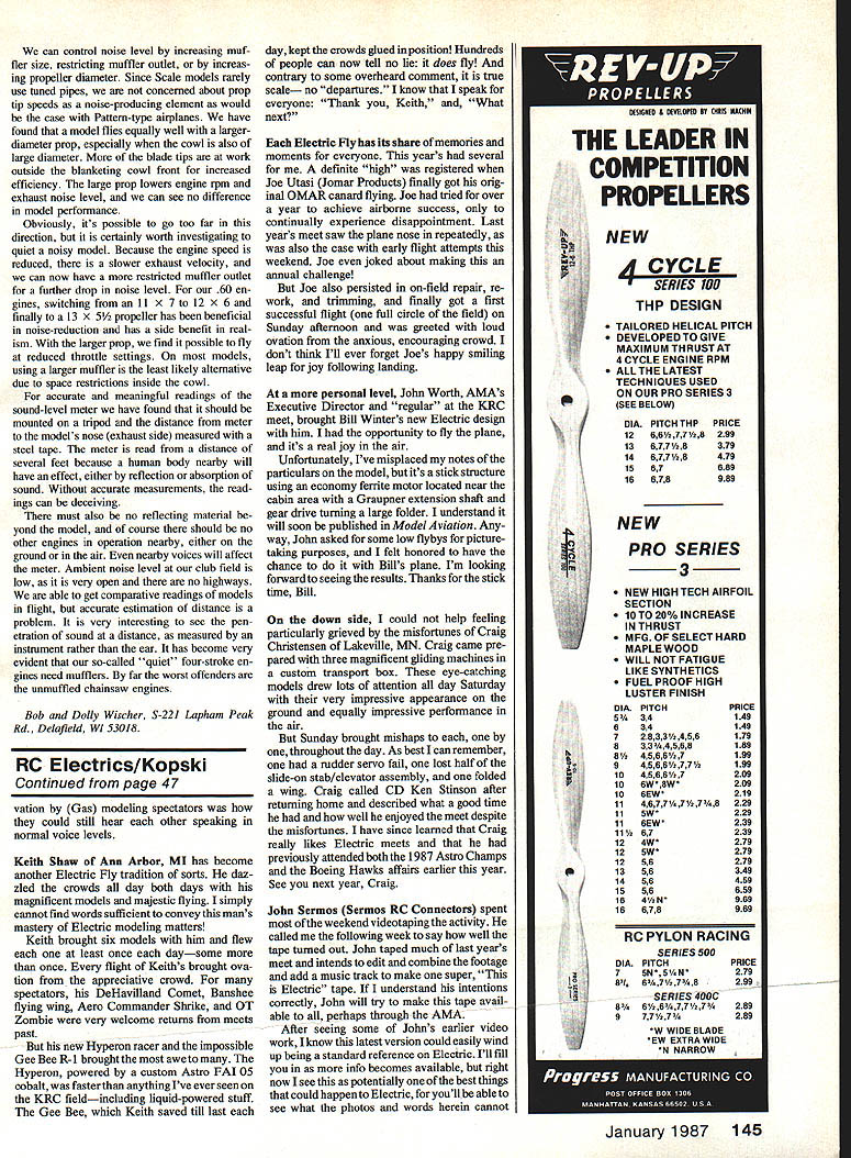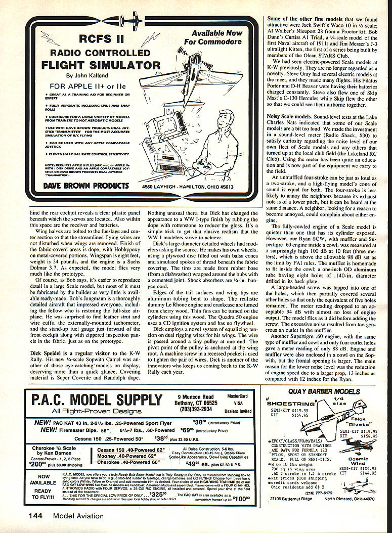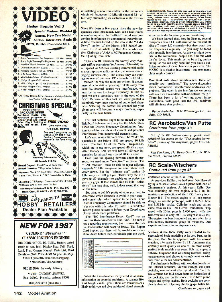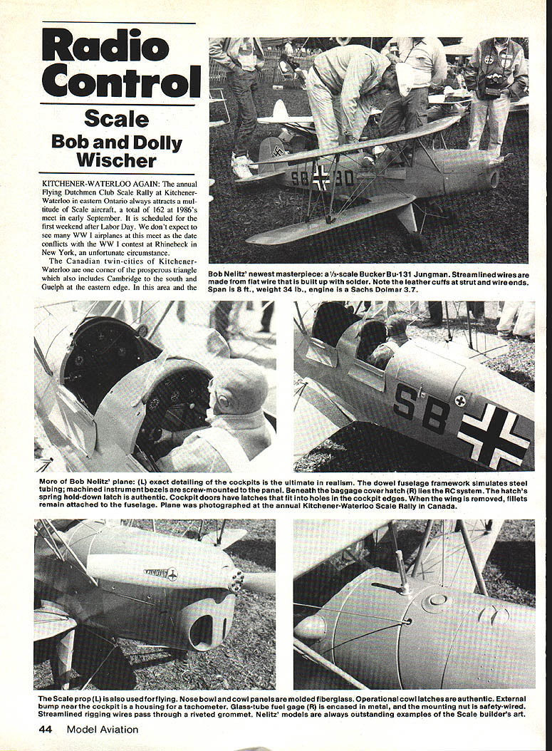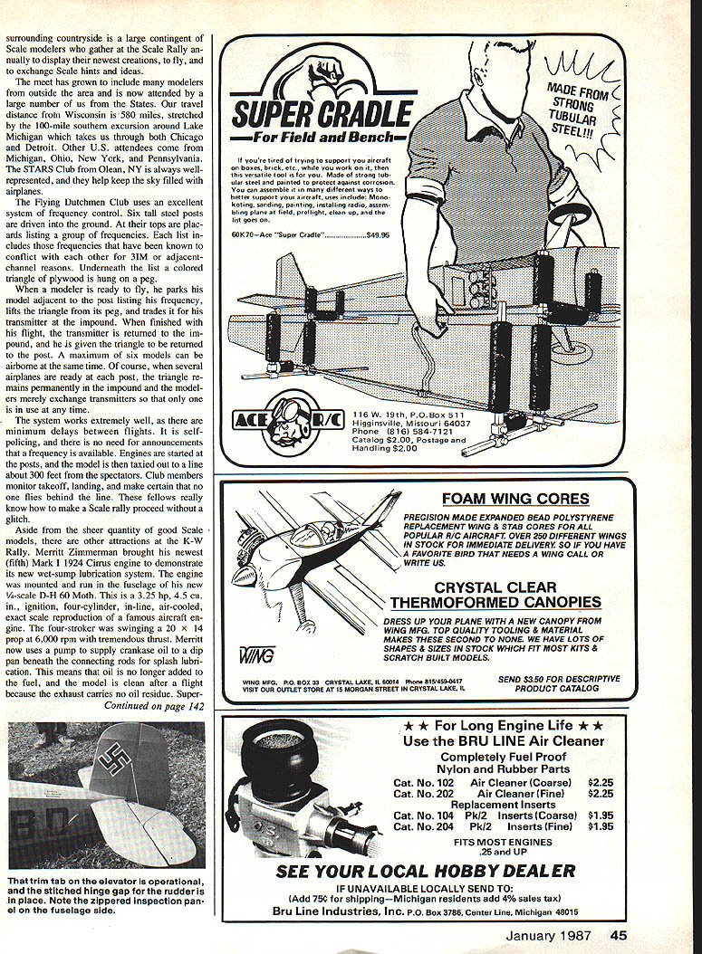 Radio Control Scale Bob Dolly Wischer KITCHENER-WATERLOO AGAIN annual Flying Dutchmen Club Scale Rally Kitchener Waterloo eastern Ontario always attracts mul titude Scale aircraft total 162 1986s meet early September scheduled first weekend after Labor Day dont expect see WW airplanes meet date conflicts WW contest Rhinebeck New York unfortunate circumstance Canadian twin-cities Kitchener Waterloo corner prosperous triangle also includes Cambridge south Guclph eastern edge area Bob Nelitz newest masterpiece a1/3-scale Bucker Bu-1 31 Jungman Streamlined wiresare made flat wire built up solder Note leather cuffs strut wire ends Span 8 ft weight 34 lb engine Sachs Dolmar 37 U Bob Nelitz plane 1 exact detailing cockpits ultimate realism dowel fuselage framework simulates steel tubing machined instrument bezels screw-mounted panel Beneath baggage cover hatch R liesthe RC system hatchs spring hold-down latch authentic Cockpit doors have latches fit holes cockpit edges wing removed fillets remain attached fuselage Plane photographed annual Kitchener-Waterloo Scale Rally Canada Scale prop 1 also used forf lying Nose bowl cowl panelsare molded fiberglass Operational cowl latches authentic External bump near cockpit housing tachometer Glass-tube fuel gage R encased metal mounting nut safety-wired Streamlined rigging wires pass through riveted grommet Nelitz models always outstanding examples Scale builders art 44 Model Aviation surrounding countryside large contingent Scale modelers gather Scale Rally nually display newest creations fly exchange Scale hints ideas meet has grown include modelers outside area now attended large number us States travel distance frotn Wisconsin 580 miles stretched 100-mile southern excursion around Lake Michigan takes us through both Chicago Detroit Other US attendees come Michigan Ohio New York Pennsylvania STARS Club Olean NY always wellrepresented help keep sky filled airplanes Flying Dutchmen Club uses excellent system frequency control Six tall steel posts driven ground tops plac ards listing group frequencies list cludes frequencies have known conflict other 31M adjacentchannel reasons Underneath list colored triangle plywood hung peg modeler ready fly parks model adjacent post listing frequency lifts triangle its peg trades transmitter impound finished flight transmitter returned im pound given triangle returned post maximum six models can airborne same time course several airplanes ready post triangle re mains permanently impound model ers merely exchange transmitters use time system works extremely well minimum delays between flights selfpolicing no need announcements frequency available Engines started posts model taxied out line about 300 feet spectators Club members monitor takeoff landing make certain no flies behind line fellows really know make Scale rally proceed glitch Aside sheer quantity good Scale models other attractions K-W Rally Merritt Zimmerman brought newest fifth Mark 11924 Cirrus engine demonstrate its new wet-sump lubrication system engine mounted run fuselage new -scale D-H 60 Moth 325 hp 45 cu ignition four-cylinder in-line air-cooled exact scale reproduction famous aircraft en gine four-stroker swinging 20 X 14 prop 6000 rpm tremendous thrust Merritt now uses pump supply crankase oil dip pan beneath connecting rods splash lubri cation means oil no longer added fuel model clean after flight because exhaust carries no oil residue SuperContinued page 142 trim tab elevator operational stitched hinge gap rudder place Note zippered inspection pan ci fuselage side L WING MFG PO BOX 33 CRYSTAL LAKE IL 60014 Phone 815/456-0417 VISIT OUR OUTLET STORE AT 16 MORGAN STREET IN CRYSTAL LAKE IL SEND $150 FOR DESCRIPTIVE PRODUCT CATALOG * * Long Engine Life * * Use BRU LINE Air Cleaner Completely Fuel Proof Nylon Rubber Parts Cat No 102 Air Cleaner Coarse $225 Cat No 202 Air Cleaner Fine $225 Replacement Inserts Cat No 104 Pk/2 Inserts Coarse $195 Cat No 204 PkI2 Inserts Fine $195 FITS MOST ENGINES 25 UP SEE YOUR LOCAL HOBBY DEALER IF UNAVAILABLE LOCALLY SEND TO Add 75 shippingMichigan residents add 4% sales tax Bru Line Industries Inc PO Box 3786 Center Line Michigan 48015 January 1987 45 t SUPER Field Benchm \14 &4DEFRO SflONG FOAM WING CORES PRECISION MADE EXPANDED BEAD POLYSTYRENE REPLACEMENT WING & STAB CORES FOR ALL POPULAR RIC AIRCRAF1 OVER 250 DIFFERENT WINGS /2 IN STOCK FOR IMMEDMTE DELI VER SO IF YOU HAVE FAVORITE BIRD THAT NEEDS WING CALL OR CRYSTAL CLEAR THERMOFORMED CANOPIES DRESS UP YOUR PLANE WITH NEW CANOPY FROM WING MFG TOP QUALITY TOOLING & MATERIAL MAKES THESE SECOND TO NONE WE HAVE LOTS OF SHAPES & SIZES IN STOCK WHICH FIT MOST KITS & SCRATCH BUILT MODELS C@O@O@O@O@O@OO VIDEO Hedge Hoppin Vol 3 Special Feature Warbird Action Tos Model Q Action interviews Scale 0 JETS British Concorde SST Retail ic Construction Beginner107 Mm49 95 Basic Flight Training Beginners65 Mm44 95 World Model Aviation 90 Mm 44 95 4Oshimosh Overuiemc 55Mm 39 95 Q rp ane Funnies 30 Mm Wild 39 95 3 ScaleMasters 60Mm4195 Warhirds Action 75MmFantastic4995 Hedge Hoppin Vol 45 Mm 41 95 9Which Way Up 70 MmAerohatim-sI47 95 Q lOHedge Hoppin Vol 2 40 Min41 953 dgeHoppinVul3 30Mm3495 Hedge Hoppin Series Feature Variety ol Avama lion Topics Fall Scale & Model CHRISTMAS SPECIAL BEGINNERS N. PACKAGE OFFER struction urchase Baalc Conprogram REEVIDEO Wreceiw 30% oft retail S13gs month onhd SPECIAL OFFER C Buy 3 programs ece ye 4th FREE Rent 3 programs aid C ece V5 4th FREE 0 Oudedag intorsnationO~ QAll Rentals $1495& U Rental DeposIt Retail Price Tape 0 Rental DuratIon 7 Days After Deli Payment Check 110 daysl MO. V M & Enp Date PhoneS CODs Ava ahe hy Phone C ShIpping 375 Foreign Canada Add 10% 0 rs 15% IL Res Add 7% Tax Academy AvIatIon R & D PO Box 277 3 Hazel Crest IL 60429 335 0776 4p$GE Z HOBBY RETAILER Dealer Plan Available installing new transmitter mountains INSTRUCTIONS Please flit card out comPletOty will broadcast 10 kHz off channel 52ef- PossIble should done soon 