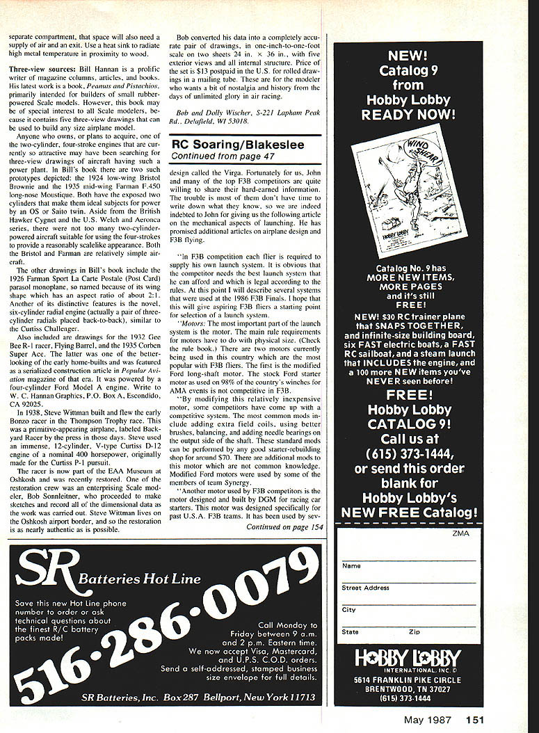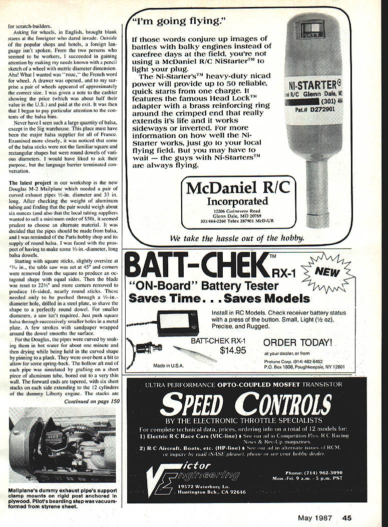 Radio Control Scale Bob Dolly Wischer BALSA DOWELS trips Paris FAI meetings have opportunities visit hobby shops very similar US Visits searched pair French-made inflatable air-wheels because reputation light ness weight less half equiv alents search eventually led obscure shop Rue Trousseau central Paris narrow street two blocks long lined ancient buildings school closely bor dered equally narrow sidewalks After walking full length street semi-darkness late afternoon no hobby shop could found Retracing steps opposite direction glimpsed model airplane hanging small unlighted window Entering through heavy iron door first room held few model kits hanging walls corner near door barred cage cashier inside Beyond second doorway lighted room signs human activity faintly detectable slightly sour odor balsa walls room completely covered bins containing meter lengths 39 bun dled balsaand very little else except some benches drawers customer carefully checking through some balsa strips ap peared about A2 /i6 guarding chosen strips make certain dam aged passersby Obviously Indoor modeler assumed favorite hobby shop Well-detaIled weathered F4U-1 D Corsair 1 /8scale L work Phillip Von Ville Built Brian Taylor plans spans 615 weighs 95 lb uses Enya 60 power Sonic System mechanics operate Robart 900 retracts Jim Messers 1 /3-scale J-3 Kitten R first series being built STARS club Olean NY Power isa Quadra 35 wingspan loft Finish Sig dope over Ceconite look Bobs new Douglas Maliplane Long 32-in dummy exhaust pipes curved balsa dowels L Bob shares secrets column plywood baffle Inserted overthe Enya 120 four-stroke engine R divert cooling air through engine fins Bent exhaust pipe made plumbing hardwarel additional surface area pipes convolutions helps dissipate exhaust heat 44 Model Aviation Ed Tennysons Starduster Too built Brisighella plans flown Bealton VA Scale contest Twenty-five-pound craft uses Tartan twin glow Ignition Scale landing gear has working bungee cords Rigging wires cut 1/32-in aluminum sheet scratch-builders Asking wheels English brought blank stares foreigner dared invade Outside popular shops hotels foreign lan guage isnt spoken two persons seemed workers succeeded gaining attention making needs known pencil sketch wheel metric diameter dimension Aha What wanted roue French word wheel drawer opened sur prise pair wheels appeared approximately correct size given note cashier showing price about half value US paid exit began pay particular attention con tents balsa bins Never have seen such large quantity balsa except Sig warehouse place must have major balsa supplier France Examined closely noticed some balsa sticks familiar square rectangular shapes round dowels vari ous diameters would have liked ask purpose language barrier terminated con versation Im going flying words conjure up images battles balky engines instead carefree days field youre using McDaniel R/C NiStarterTM light plug NiStartersTM heavy-duty nicad power will provide up 50 reliable quick starts charge features famous Head LockTM adapter brass reinforcing ring around crimped end really extends ifs life works sideways inverted information well NiStarter works just go local flying field may have wait Ni-StartersTM always flying latest project workshop new Douglas M-2 Mailplane needed pair curved exhaust pipes -in diameter 33 long After checking weight aluminum tubing finding pair would weigh about six ounces also local tubing suppliers wanted sell minimum order $50 seemed prudent choose alternate material decided pipes should made balsa reminded Paris hobby shop its supply round balsa faced pros ____________________________________________________________[v32][b20951511171800]] pect having make some -in-diameter long balsa dowels Starting square sticks slightly oversize A2 table saw set 450 corners ATT- CHEIC1 removed square produce oc tagonal shape equal sides blade reset 22o corners removed toONBoard~ Battery Tester produce 16-sided nearly round sticks needed pushed through /2 inSaves Time . s Models diameter hole drilled steel plate shave shape perfectly round dowel smallerInstall RC Models Check receiver battery status diameters saw isnt required Just push square balsathroughsuccessivelysmallerholesinametalwith press button Small Light 1/2 oz plate few strokes sandpaper wrappedPrecise Rugged around dowel smooths surface Douglas pipes curved soak- AlT-CHEK RX-1 ORDER TODAY ing hot water about minute drying being held curved shape $1495 dealer pinning plank over-bent bit allow some spring-back hollow aft end ofProtune Corp 914 462-6452 shortPO Box 1808 Poughkeepsie NY 12601 pipe simulated grafting piece aluminum tube bored out very thin wall forward ends tapered six short stacks side extending 12 cylinders dummy Liberty engine stacks May1987 45 L McDaniel RIC] Incorporated 12206 Guinevere Road Glenn Dale MD 20769 301/464-2260 Tetex 287901 McD-UR take hassle out hobby Made USA New Continued page 150 Mailpianes dummy exhaust pipes support clamp mounts rigid post anchored plywood Pilots boarding step vacuumformed styrene sheet Al Featuring fast service qualified eopIe latest equipment including SPECTRUM ANAL YZER AM FM SIGNAL GENERATOR Call Sam Leonard Tony Stiliman custom work competition needs stock complete hobby line specializing competition accessories discounted prices 904 478-6746 RADIO SOUTH~ AUTHORIZED SERVICE CENTER FOR Iruft Pro Line II Futile 43 West Nine Mile Rd Pensacola FL 32514 Krn * Sales Service er Inquiries Welcome * RC Scale/Wischers Continued page 45 5/s-in birch dowels fastened balsa pipe Slow-let forms fillet simulate welds prototype Because Liberty 450 V-type dowel ends beveled 220 sanding disc alignment Wood screws driven birch dowels hold pipe cowl sides Actual exhaust models Enya 1 20 led out cowl bottom muffler located beneath engine bearers External balsa details model subject damage unless surfaces hardened pipes given coat clear dope followed heavy coat Ditzler primer sanded smooth pipes pain