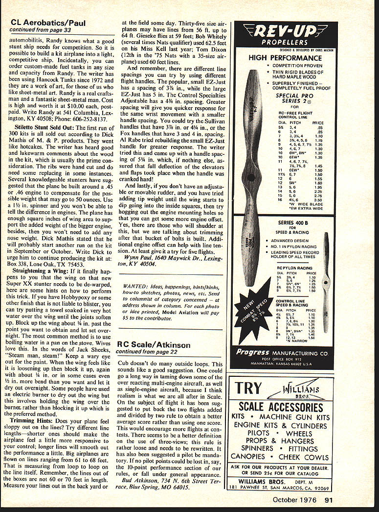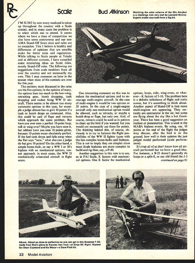 Bud 4lkinson Matching color scheme Zlin Akrobat challenge met very well Leonard McCoy Superb model built Sig kit IM SURE now weekend taken up throughout country Scale contest cases problem select attend seems have class competition also have some controversy new AMA Stand-Off Scale class rules no exception believe healthy differences opinions sensible make better rules regulations talking Scale people Toledo different contests have compiled some interesting ideas Scale rules mostly Stand-Off rules following suggestions scale modelers over country necessarily own may comment later season contests over year sections discussed rules five options opinion ofmany options lean too much low-wing retracting gear bomb dropping tank dropping rocket firing WW II air craft seems almost too automatic options type exam ple judge almost has give 10 points tank bomb drops command Also could said flaps retracts approach same problem have ever seen perfect 10-point loop roll wing-over Maybe have seen sddom have seen 10 points given because 10 points mean absolutely perfect fuel tank drops falls away flier says now what else can judge give 10 points other hand simple home-built say WW 30s biplane no mechanical options can approach cases WW II mechanically orientated aircraft flight score interesting comment reduce mechanical options en courage multi-engine aircraft case multi-engine would two options 20 points case single-engine aircraft mechanical option would allowed such retracts maybe bomb drop flaps course retracts could used pattern clean up bird wanted would necessarily use points thinking behind course ob viously try balance flight pos sibilities WV II fighter types less complex home-builts biplanes imply simpler since Scale biplanes complex build rig say P-40 Another suggestion vein use FAI Scale K factors mechani cal options K factor mechanical options loops rolls wing-overs what everK factors 5-10 problem definite imbalance flight static scores its something think about Another aspect Stand-Off multi-engines appearing cer tainly spectacular air some flying about sky like hot Good year has good suggestion realism presentation used MABA biplane events using say 10 points end flight judges may discuss after bird ground well opinion just judged model performed scale perform ance Its true us dont know air craft performed have good idea instance B-25 doesnt generally loops split-S old friend J-3 continued page 91 22 Model Aviation Scale Above About close perfection can get Bonanza F-33 made Buds plans Kenney Van Tuylan Enys 60 Right Biplane fan Dean Copeland end Wacoa Dave Platt kit CL Aerobatics/Paul continued page 33 automobilitis Randy knows what good stunt ship needs competition So possible build kit airplane light competitive ship Incidentally can order custom-made fuel tanks size capacity Randy writer has using Hancock Tanks since 1972 work art us like sheet-metal art Randy real crafts man fantastic sheet-metal man Cost high worth $1000 post paid Write Randy 541 Columbia Lex ington KY 40508 Phone 606-252-8137 Stiletto Stunt Sold Out first run 300 kits sold out according Dick Mathis M & P products went like hotcakes writer has heard good lukewarm comments about wood kit usually prime con sideration ribs hand cut need some replacing some instances Several knowledgeable stunters have sug gested plane built around 45 46 engine compensate pos sible weight may go 50 ounces Use 1 spinner wont able tell difference engines plane has enough square inches wing area sup port added weight bigger engine besides wont need add nose weight Dick Mathis stated will probably start another run kit September October Write Dick urge him continue producing kit Box 338 Lone Oak TX 75453 Straightening Wing finally hap pens wing new Super XX stunter needs de-warped some hints perform trick have Hobbypoxy some other finish liable blister can try putting towel soaked very hot water over wing until joints soften up Block up wing about point want obtain let set over night common method use boiling water pan stove Wives love words Jack Sheeks Steam man steam Keep wary eye out paint wing feels like loosening up block up again about cases bend want let dry out overnight Some people have used electric burner dry out wing involves holding wing over burneE rather blocking up preferred method Trimming Hints Does plane feel sloppy out lines Try different line lengthsshorter ones should make airplane feel little responsive control longer lines will smooth out performance little Big airplanes flown lines ranging 61 68 feet measuring loop loop line itself Remember lines out boxes 60 70 feet length Measure lines out back yard field some day Thirty-five size air planes may have lines 56 ft up 64 ft Gieseke flies 59 feet Bob Whitely several times Nats qualifier used 625 feet Miss Kell last year Tom Dixon 12th 75 Nats 35-size air plane used 60 feet lines remember different line spacings can try using different flight handles popular small EZ-Just has spacing 3/s large EZ-Just has 5 Control Specialties Adjustable has 4/s spacing Greater spacing will give quicker response same wrist movement smaller handle spacing could try Sullivan handles have V/s 4 Fox handles have 3 4 spacing Al Rabe tried rebuilding small EZ-Just handle greater response writer tried came up handle spac ing 5 nothing else sured full deflection elevators flaps took place handle cranked hard lastly dont have adjusta ble movable rudder have tried adding tip weight until wing starts dip going inside squares try hogging out engine mounting holes can get some engine offset Yes will shudder talking about trimming after bucket bolts built Addi tional engine offset can help line ten sion least give try five flights Wynn Paul 1640 Maywick Dr Lexing ton KY 40504 WANTED Ideas happenings hints/kinks how-to sketches photos news etc Send columnist category concerned ess shown column photo idea printed Model Aviation will pay $5 contributor RC Scale/Atkinson continued page 22 Cub doesnt o