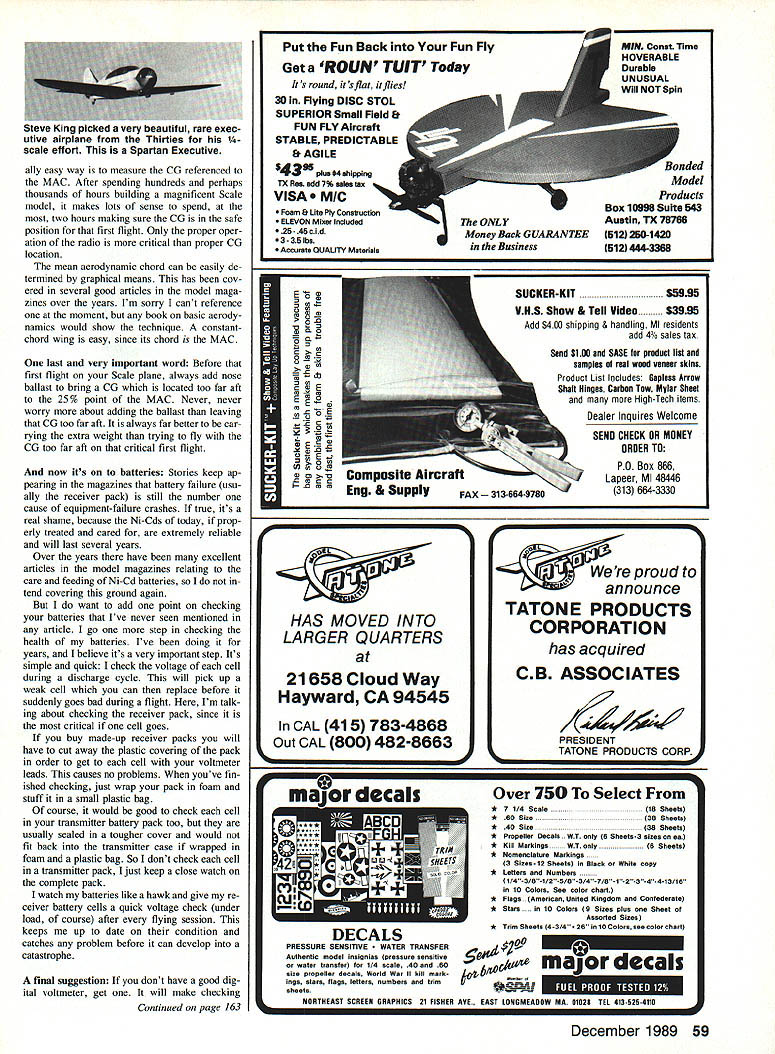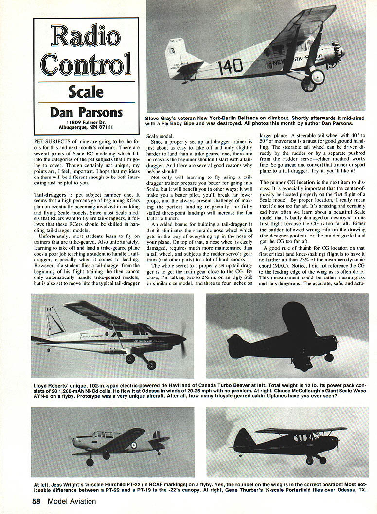 PET SUBJECTS going fo cus next months columns several points Scale RC modeling fall categories pet subjects Im go ing cover Though certainly unique points feel important hope ideas will different enough both inter esting helpful Tail-draggers pet subject number seems high percentage beginning RCers plan eventually becoming involved building flying Scale models Since Scale mod els RCers want fly tail-draggers fol lows RCers should skilled han dling tail-dragger models Unfortunately students learn fly trainers trike-geared Also unfortunately learning take off land trike-geared plane does poor job teaching student handle taildragger especially comes landing However student flies tail-dragger beginning flight training cannot automatically handle trike-geared models also set move typical tail-dragger Scale model Since properly set up tail-dragger trainer just about easy take off slightly harder land trike-geared no reasons beginner shouldnt start taildragger several good reasons he/she should will learning fly using taildragger trainer prepare better going Scale will benefit other ways will make better pilot youll break far fewer props always present challenge mak ing perfect landing especially fully stalled three-point landing will increase fun factor bunch An added bonus building tail-dragger eliminates steerable nose wheel gets way everything up nose plane top nose wheel easily damaged requires much maintenance tail wheel subjects rudder servos gear train other parts lot hard knocks whole secret properly set up tail drag ger get main gear close CG close Im talking two 2/2 Ugly Stik similar size model three four inches larger planes steerable tail wheel 400 500 movement must good ground hand ling steerable tail wheel can driven di rectly rudder separate pushrod rudder servoeither method works fine So go ahead convert trainer sport plane tail-dragger Try youll like proper CG location next item dis cuss especially important center-ofgravity located properly first flight Scale model proper location really mean its too far aft Its amazing certainly sad often learn about beautiful Scale model badly damaged destroyed its first flight because CU too far aft Either builder followed wrong info drawing designer goofed builder goofed got CU too far aft good rule thumb CU location first critical knee-shaking flight have no farther aft 25% mean aerodynamic chord MAC Notice did reference CU leading edge wing often done measurement could rather meaningless thus dangerous accurate safe actu 58 Model Aviation Radio Control Scale Dan Parsons 11809 Fulmer Dr Albuquerque NM 8711 Steve Grays veteran New York-Berlin Bellanca climbout Shortly afterwards mid-aired Fly Baby Bipe destroyed photos month author Dan Parsons Lloyd Roberts unique 102-in-span electric-powered de Havilland Canada Turbo Beaver left Total weight 12 lb Its power pack con sists 28 1 200-mAh Ni-Cd cells flew Odessa winds 20-25 mph no problem right Claude McCulloughs Giant Scale Waco AYN-8 flyby Prototype very unique aircraft After tricycle-geared cabin biplanes have ever seen left Jess Wrights -scale Fairchild PT-22 RCAF markings flyby Yes roundel wing correct position Most iceable difference between PT-22 PT-19 -22s canopy right Gene Thurbers 1/4-scale Porterfleld flies over Odessa TX Steve King picked very beautiful rare exec utive airplane Thirties scale effort Spartan Executive ally easy way measure CG referenced MAC After spending hundreds perhaps thousands hours building magnificent Scale model makes lots sense spend two hours making sure CO safe position first flight Only proper oper ation radio critical proper CO location mean aerodynamic chord can easily de termined graphical means has cov ered several good articles model maga zines over years Im sorry cant reference moment book basic aerody namics would show technique constantchord wing easy since its chord MAC last very important word Before first flight Scale plane always add nose ballast bring CO located too far aft 25% point MAC Never never worry about adding ballast leaving CO too far aft always far better car rying extra weight trying fly CG too far aft critical first flight now its batteries Stories keep ap pearing magazines battery failure usu ally receiver pack still number cause equipment-failure crashes true its real shame because Ni-Cds today prop erly treated cared extremely reliable will last several years Over years have excellent articles model magazines relating care feeding Ni-Cd batteries tend covering ground again t want add point checking batteries Ive never seen mentioned article go step checking health batteries Ive doing years believe its very important step tts simple quick check voltage cell during discharge cycle will pick up weak cell can replace before suddenly goes bad during flight Im talk ing about checking receiver pack since critical cell goes buy made-up receiver packs will have cut away plastic covering pack order get cell voltmeter leads causes no problems youve fin ished checking just wrap pack foam stuff small plastic bag course would good check cell transmitter battery pack too usually sealed tougher cover would fit back transmitter case wrapped foam plastic bag So dont check cell transmitter pack just keep close watch complete pack watch batteries like hawk give re ceiver battery cells quick voltage check under load course after flying session keeps up date condition catches problem before can develop catastrophe final suggestion dont have good dig ital voltmeter get will make checking Continued page 163 Put Fun Back Fun Fly Get ROUN TUIT Today Its round sflat flier 30 Flying DISC STOL SUPERIOR Small Field S FUN FLY Aircraft STABLE PREDICTABLE EtAGILE $43plus s ettipping TX Res add 7% sales tsx VISA Foam ft Lite Ply Construction ELEVON Mixer Included j 25 49 old 3-35 lbs Accurste QUALITY Materials HAS MOVED INTO LARGER QUARTERS 21658 Cloud Way Hayward CA 94545 CAL 415 783-4868 Out CAL 800 482-8663 4 U major decals 024000, announce TATONE PRODUC