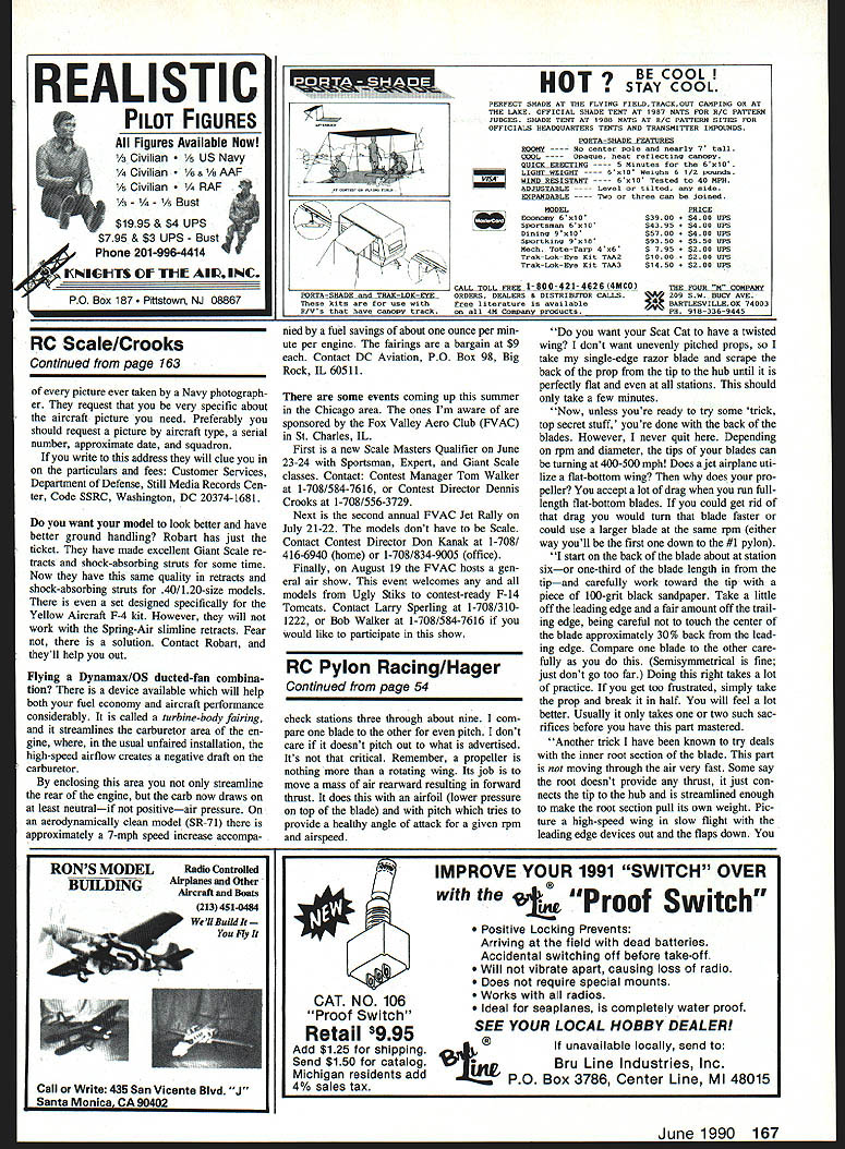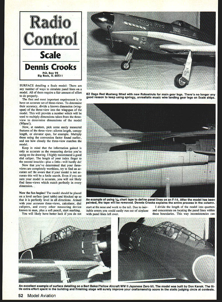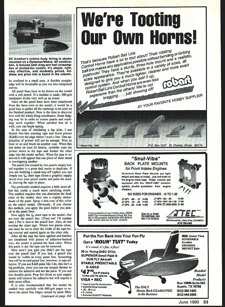 SURFACE detailing Scale model number ways simulate panel lines model require fair amount effort properly first important requirement have accurate set three-views determine accuracy divide known dimension wing span three-view wingspan model will provide number will used multiply dimensions taken three view determine dimensions model Whew Now random pick some easily measured features three-view aileron length canopy length elevator span example Multiply using conversion factor found earlier see closely three-view matches model Keep mind information galned accurate measuring device youre using drawing highly recommend good dial caliper length index finger second knuckleplus littlewill hardly Now youve determined threeviews completely worthless try find ac curate set aware model ac curate will futile search sure model accurate will likely find three-views match perfectly dimension Now fun begins model should placed level surface pool table blocked up perfectly level directions Armed An example OT using / cnarr tape aesine panci mines r- i inc IIIuucI accurate three-views calculator dial painted tape wiil removed DennisCrooks explains entire process coiumn calipers other measuring device start nose work tail Due inev- divide length model quarters known man plus soft pencil start marking itable errors could easily run out airplane concentrate locating panel lines within will likely have better luck panel lines left over boundaries way inconsistencies can 52 Model Aviation Radio Control Scale Dennis Crooks PO Box 98 Big Rock IL 6051 EZ Dago Red Mustang fitted new Robostruts main gear legs Theres no ionger good reason keep using springy unreaiistic music wire landing gear legs Scale ships An excellent example surface detaiilng Bert BakerlYeiiow Aircraft WW Ii Japanese Zero kit modei built Don Kanak ut tie extra effort spent buliding finishing stage wiil sureiy improve craftsmanship score static judging circie contests confined small area flexible straight edge will invaluab]e run compound curves panel lines have drawn model soft pencil mistake made 400-grit sandpaper works very well eraser Once panel lines have transferred three-view model would good idea gather markings used finished product Now time discover well whole thing coordinates Some fudg ing may order ensure panels mark ings work together satisfied well can begin taping case simulating lap joint use Scotch fine-line masking tape brush primer K&B over edge want line ap plication primer will enough Wait hour brush another coat has dried least 24 hours carefully sand primer down tape feather other edge model surface tape re moved will appear piece sheet metal overlapping another panel line created two panels simply ted together great deal easier duplicate building stand-way-off replica can simply use % chart tape graphics supply store over pencil marks paint mod el leaving tape place preferable methOd requires littLe ef fort yields much satisfying result method requires determine final color model mix slightly darker shade paint Spray thin coat color entire model Obviously choose method apply paint before pen cil panel lines Now apply l/ chart tape modelbut over pencil line Trust Ill explain later Put next pencil line Also overlap chart tape two pieces cross must cut clear width tape ing crossed started again other side After tape has applied hatches simulated pieces adhesivebacked trim model painted final color paint dry tape can removed Now arent glad didnt put tape over pencil line pencil line would visible panel line Something will panel line however tape ad hesive use K&B paint like isnt big problem since can use lacquer thinner remove adhesive palnt use less durable paint Prep Sol auto supply store will remove adhesive will require little effort also recommended model sanded very carefully 600-grit paper re move panel line ridges caused paint filletContinued page 163 Tooting Own Horns hart Ball Liflk bOUt rotat IflkIng Thats bbIeWthUt efl g istIc ause e lot t0Ot Control icaod three4 variety es ball linJ ave stUrlable scalee reexact pushrOappearanc yoUa m h tighter ~5igned av Afid rn Ies5 control systeIllj Contro yoU add UP art aII HOrsi Wete Robotrie showing 0ff eXPensiv~gging SIX SIZES FOR ENGINES 15 TO 182 JT-8111 09 15 1495 JT-BP2 19 25 1495 JT-BP3 29- 056 1495 II sot available hobby shop ORDtR DIRECTfr immsdiateoieotheck MO Visa ftC sr COD acceptbd Add $250 UPS $3Afor COD 6% sales tax Calif residuots JT-BP4 60-901495 JT-BP5 MAX 90108 1795 JT BPS ST 25003000 2195 Y77TEEI StillS 255 ar STAMP FOR AOOITIOIIAI iNFO— AND JTEC CATALOG 184 School St. Dety City CA 94014 14151756-3400 June 1990 53 DC Aviations turbine body falring shown mounted Dynamax/Webra 80 combina tion reduces both drag fuel consump tion ducted-fan models Its simple light very effective modestly priced Ad dress price info found column oBBN SW NO~ Snuf-Vibe BACK PLATE MOUNTS Front Intake Engines Aluminum Back Plate Mounts ilgttt *ight easy install Just bolt engIne crank case mounts equipped BNUF-ViBE isolation system double proteefion engine bretlon Put Fun Back Fun Fly Get ROUN TUfT Today Its round S flat ftflies 3b Flying DISC STOL SUPERIOR SmaN Field Ft FUN FLY Aircraft STABLE PREDICTABLE Ft AGILE $4 7ius u s*xrping TXReedd7%saiestax 6 Foam & USe Ply Construction ELEVON Mixer lncludd 25-45cld 3- 3 lbs Accurate QUALITY Materials 4 ONLY j Money Back GUARANTEE W Business Model Products Box 10906 Suite 543 Austin TX 78766 512 2501420 512 444-3368 summer 1940 Jim Walker introduced A-J Fireball U-Control world Countless thousands got first taste model aviation excitement building flying famous airplane 10 commemorate 50th Anniversary birth A-J Fireball proudly announce special limited-edition kit Jim Walkers 1940 original kit contains U fully carved Balsa fusealage Balsa wing tail parts cut shape U hardware hardwood motor mount U decals U complete instructions illustrations U brief history A-J Fireball Offered limited edition 50th Anniversary A-J Fireball numbered da