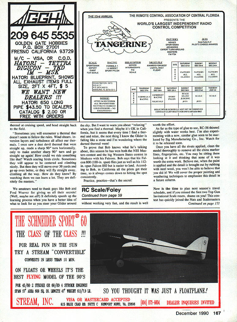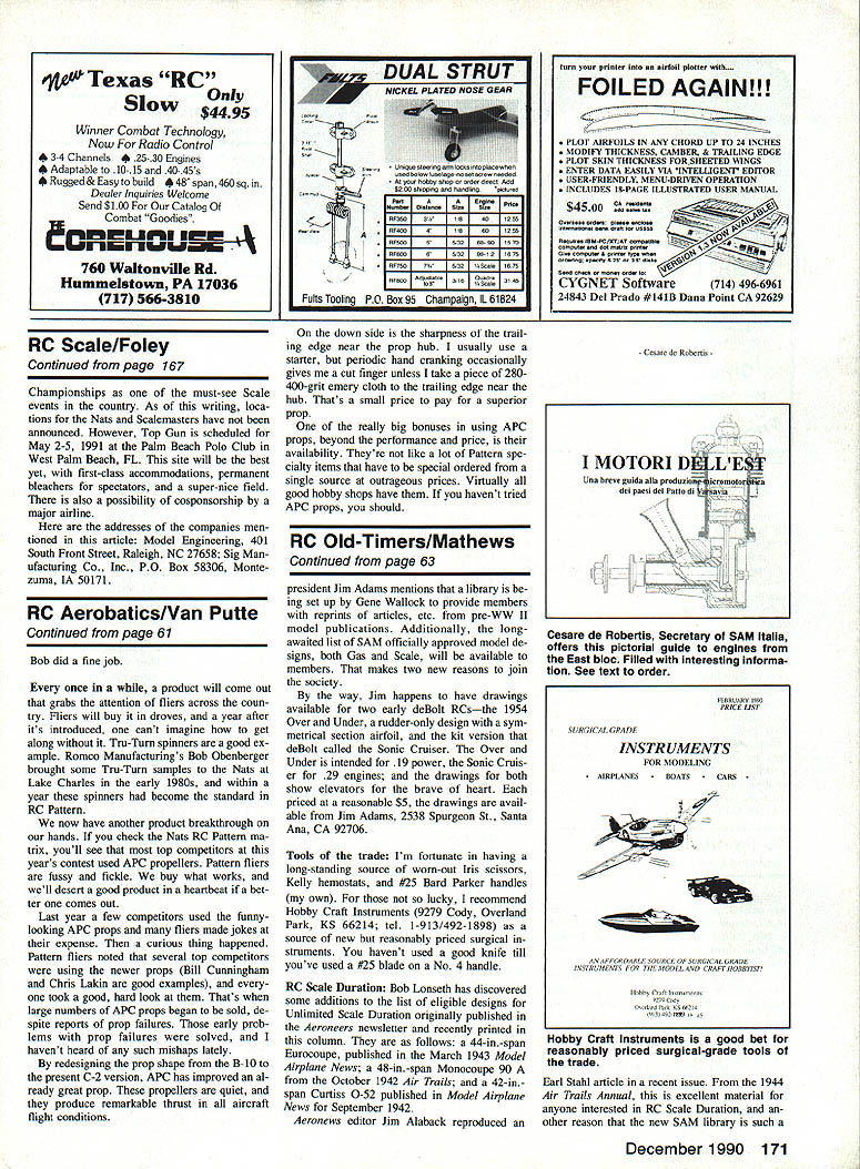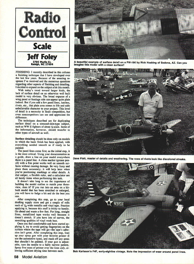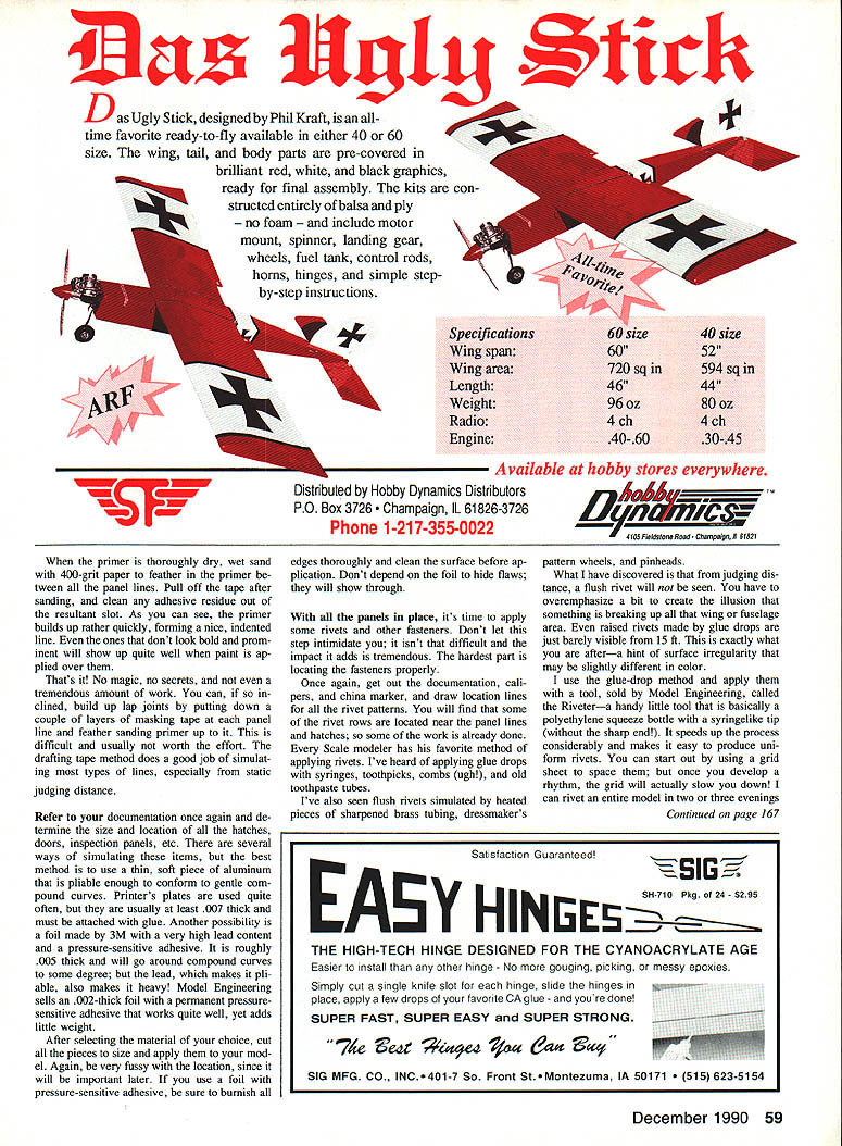FINISHING I recently described column finishing technique have developed over last few years Because amazing re sponse Ive received numerous questions regarding other aspects finishing detailing decided expand subject bit month todays trend toward larger birds lack surface detail otherwise well built model very obvious broad expanse wing panel fuselage side can appear quite plain indeed add few panel lines hatches rivets etc plain area comes life adds unbelievable character project level detail necessity Scale competition noncompetitors can see appreciate difference techniques described duplicating surface detail stressed-skin-type subject such WW II fighters about /5-scale Some information however should transfer other types aircraft well Surface detailing should done models basic finish has applied everything sanded smooth ready painted panel lines come first initial step critical Using documentation guide draw line model everywhere panel line china marker grease pen cil fine point works well smooth sur faces causing damage very fussy place accurately will help later youre positioning markings other details dial caliper flexible ruler calculator handy items performing task doesnt take long see importance building model outline match threeview does run area kitbuilt model has stretched enlarged will have fudge bit best can After completing step go local drafting supply store get couple rolls /-wide metallic vinyl tape Practice applying because stuff tricky handle Go ahead waste few feet long straight lines metallized tape works well because doesnt stretch have lots curves stretching qualities vinyl work best Once feel comfortable have started ap plying try avoid getting fingerprints surface tape will gothe tapes adhe sion isnt great After completing step load up spray gun favorite primer use automotive type mask off areas shouldnt painted gun adjust able turn needle fairly narrow pattern Spray five coats primer over lines al lowing sufficient drying time between 58 Model Aviation Radio Confrol Scale Jeff Foley 3705 Marlin Ct Raleigh NC 27604 beautiful example surface detail FW-190 Rick Hosking Sedans AZ Can imagine model clean surface Dave Piatt master details weathering rows rivets look like discolored streaks Bob Karissons F4F early-eighties vintage Note impression wear around panel lines 1tP3 3A3L3 2tU1 D Ugly Stick designed Phil Kraft alltime favorite ready-to-fly available either 40 60 size wing tail body parts pre-covered brilliant red white black graphics ready final assembly kits constructed entirely balsa ply no foam ude motor mount spinner landing gear wheels fuel tank control rods Specifications Wing span Wing area Length Weight Radio Engine Distributed Hobby Dynamics Distributors PO Box 3726 Champaign IL 61826-3726 Phone 1-217-355-0022 40 size 52 594 sq 44, 80 oz 4 ch 30-45 Available hobby stores everywhere IkILfft / 4105 Fieldsiono Road Champaign ii 01821 primer thoroughly dry wet sand 400-grit paper feather primer tween panel lines Pull off tape after sanding clean adhesive residue out resultant slot As can see primer builds up rather quickly forming nice indented line ones dont look bold prom inent will show up quite well paint ap plied over Thats No magic no secrets tremendous amount work can clined build up lap joints putting down couple layers masking tape panel line feather sanding primer up difficult usually worth effort drafting tape method does good job simulat ing types lines especially static judging distance Refer documentation once again de termine size location hatches doors inspection panels etc several ways simulating items best method use thin soft piece aluminum pliable enough conform gentle com pound curves Printers plates used quite often usually least 007 thick must attached glue Another possibility foil made 3M very high lead content pressure-sensitive adhesive roughly 005 thick will go around compound curves some degree lead makes pli able also makes heavy Model Engineering sells 002-thick foil permanent pressuresensitive adhesive works quite well yet adds little weight After selecting material choice cut pieces size apply mod el Again very fussy location since will important later use foil pressure-sensitive adhesive sure burnish edges thoroughly clean surface before ap plication Dont depend foil hide flaws will show through panels place its time apply some rivets other fasteners Dont let step intimidate isnt difficult impact adds tremendous hardest part locating fasteners properly Once again get out documentation cali pers china marker draw location lines rivet patterns will find some rivet rows located near panel lines hatches some work already done Scale modeler has favorite method applying rivets Ive heard applying glue drops syringes toothpicks combs ugh old toothpaste tubes Ive also seen flush rivets simulated heated pieces sharpened brass tubing dressmakers pattern wheels pinheads What have discovered judging dis tance flush rivet will nor seen have overemphasize bit create illusion something breaking up wing fuselage area raised rivets made glue drops just barely visible 15 ft exactly what aftera hint surface irregularity may slightly different color use glue-drop method apply tool sold Model Engineering called Rivetera handy little tool basically polyethylene squeeze bottle syringelike tip sharp end speeds up process considerably makes easy produce uni form rivets can start out using grid sheet space once develop rhythm grid will actually slow down can rivet entire model two three evenings Continued page 167 December 1990 59 horns hinges simple stepby-step instructions 4% 60 size 60 720 sq 46 96 oz 4 ch 40-60 urn U Tm Satisfaction Guaranteed SH71O Pkg of24 $295 THE HIGH-TECH HINGE DESIGNED FOR THE CYANOACRYLATE AGE Easier install other hinge No gouging picking messy epoxies Simply cut single knite slot br hinge slide hinges place apply few drops favorite CA glue youre done SUPER FAST SUPER EASY SUPER STRONG SIG MFG CO INC.401-7 So Front St.M