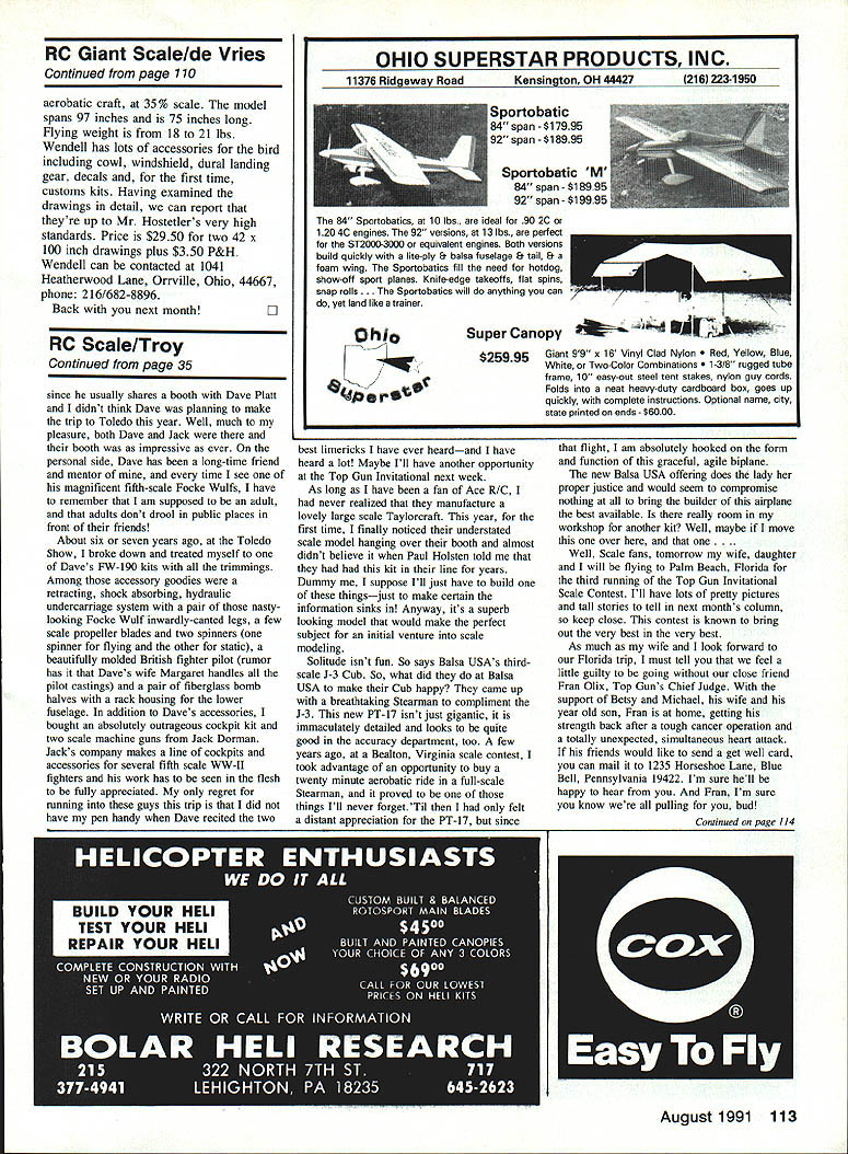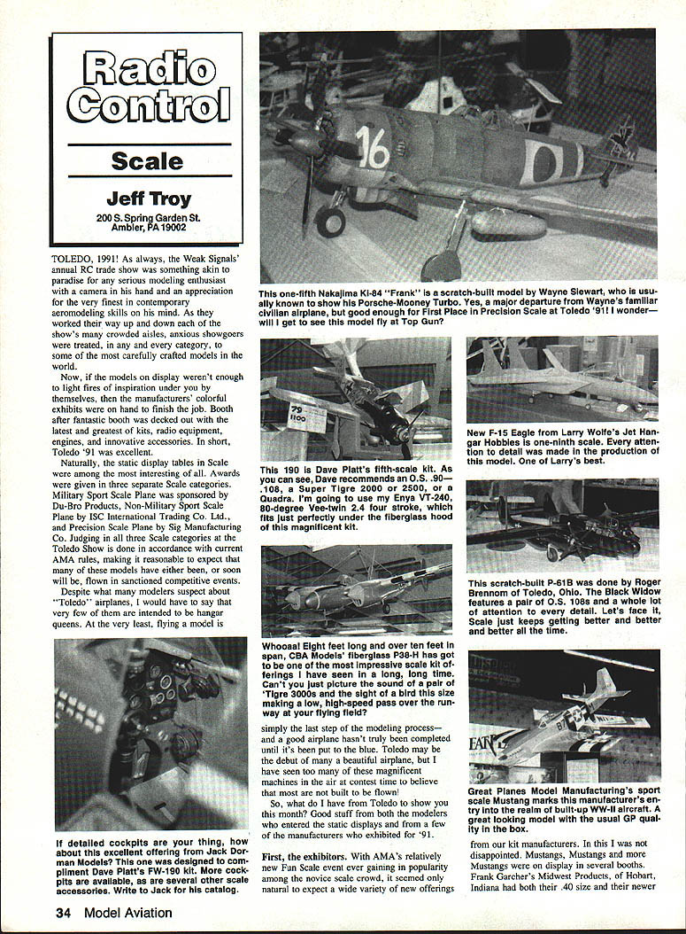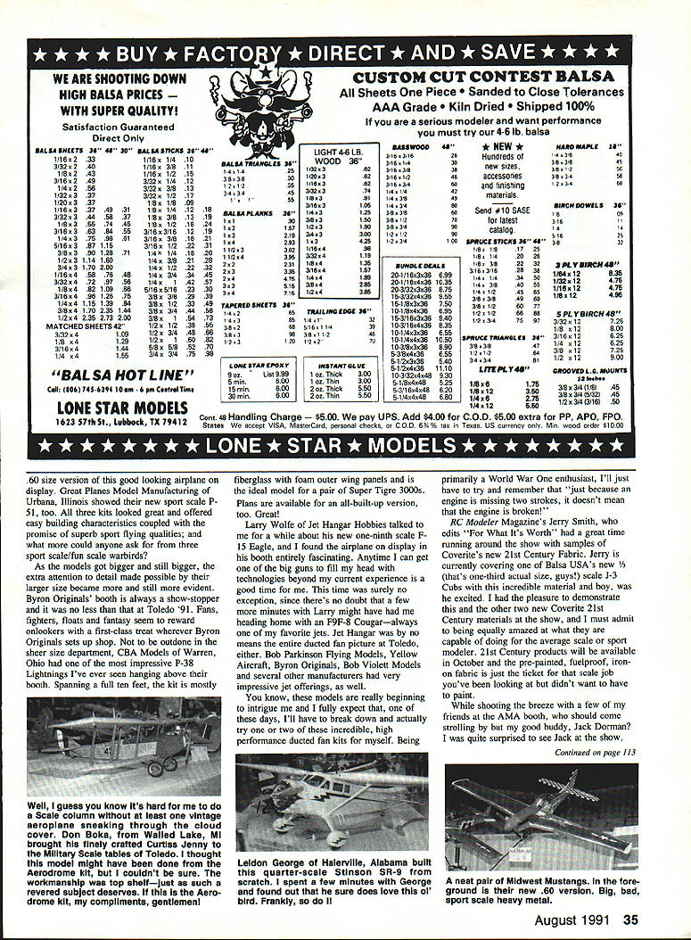TOLEDO 1991 As always Weak Signals annual RC trade show something akin paradise serious modeling enthusiast camera hand appreciation very finest contemporary aeromodeling skills mind As worked way up down shows crowded aisles anxious showgoers treated category some carefully crafted models world Now models display werent enough light fires inspiration under themselves manufacturers colorful exhibits hand finish job Booth after fantastic booth decked out latest greatest kits radio equipment engines innovative accessories short Toledo 91 excellent Naturally static display tables Scale among interesting Awards given three separate Scale categories Military Sport Scale Plane sponsored Du-Bro Products Non-Military Sport Scale Plane ISC International Trading Co Ltd Precision Scale Plane Sig Manufacturing Co Judging three Scale categories Toledo Show done accordance current AMA rules making reasonable expect models have either soon will flown sanctioned competitive events Despite what modelers suspect about Toledo airplanes would have say very few intended hangar queens very least flying model simply last step modeling process good airplane hasnt truly completed until its put blue Toledo may debut beautiful airplane have seen too magnificent machines air contest time believe built flown So what have Toledo show month Good stuff both modelers entered static displays few manufacturers exhibited 91 kit manufacturers First exhibitors AMAs relativelydisappointed Mustangs Mustangs new Fun Scale event ever gaining popularityMustangs display several booths among novice scale crowd seemed onlyFrank Garchers Midwest Products Hobart natural expect wide variety new offeringsIndiana both 40 size newer detailed cockpits thing about excellent offering Jack Dor man Models designed com pliment Dave Piatts FW-190 kit cock pits available several other scale accessories Write Jack catalog one-fifth Nakajima Ki-84 Frank scratch-built model Wayne Siewart usu ally known show Porsche-Mooney Turbo Yes major departure Waynes familiar civilian airplane good enough First Place Precision Scale Toledo 9111 wonder will get see model fly Top Gun 190 Dave Piafts fifth-scale kit As can see Dave recommends OS 90 108 Super Tigre 2000 2500 Quadra Im going use Enya VT-240 80-degree Vee-twln 24 four stroke fits just perfectly under fiberglass hood magnificent kit wnooasi igni feet long over ten feet span CBA Models fiberglass P38-H has got impressive scale kit ferings have seen long long time Cant just picture sound pair Tigre 3000s sight bird size making low high-speed pass over run way flying field New F-iS Eagle Larry Wolfes Jet Han gar Hobbies one-ninth scale atten tion detail made production model Larrys best scratch-built P-61 B done Roger Brennom Toledo Ohio Black Widow features pair OS 108s whole lot attention detail Lets face Scale just keeps getting better better better time 34 Model Aviation Scale Jeff Toy 200SSpring GardenSt Ambler PA 19002 ureas nan. manufacturings sport scale Mustang marks manufacturers en try realm built-up WW-il aircraft great looking model usual GP qual ity box 13 IVNU ARE SHOOTING DOWN HIGH BALSA PRICES WITH SUPER QUALITY Satisfaction Guaranteed Direct Only BALSA SHUTS 35 45 30 BALM STICKS 3545 1/16x1/410 1/lBs3/811 1/161/215 3/32x1/412 3/32s3/813 3/32s1/217 1/8x1/809 311/8s1/41218 371/Be3/81319 451/8e1/21824 553/16x3/161219 613/16x3/81821 3/16x1/22231 711/4k1/41826 1/4 x3/82128 1/4s1/22232 1/43/43445 1/4s14257 5/16 s5/182330 3/8 e3/82939 3/Be1/23349 3/8x3/44458 3/Be15473 1/2x1/23855 1/2 x3/44886 1/2s16082 5/8 s5/85270 3/4 x3/47598 1/165233 3/32x240 1/8x243 3/16x249 1/4x256 1/32s337 1/20x337 1/18x33749 3/32x34458 1/8x35574 3/16x38384 1/4s37598 5/16s387115 3/8s390128 1/2e3114160 3/4s3170200 1/16s4587649 3/32 x 4729756 1/8x48210966 3/16x49612675 1/4x411513984 3/8x4170235144 1/2x4235273200 MATCHED SHEETS 42 3/32s4109 1/8 s4129 3116s4144 1/4 x4155 BALSA HOT LINE Call 806 7456394 10. Centril r. w SAL BA TRIANGLES 36 a426 363630 2236 343445 55 BALM PLANKS35 5 90 s2 67 e32 9 4283 1103302 1104386 22231 23336 24475 33616 34716 TAPERED SHEETS36 1/42 65 14385 362 68 363 98 123125 LONE STAR EPOXY 9 ozList 9298 Sm/n800 15 rn/n600 30w/n600 •uamu iii [v32]Ui iEZW~I iz~vVJ LIGHT 4-6 LB WOOD36 1/22382 1/20362 1/18362 3/32374 1/6391 3/163106 1/43126 3/83160 103190 3/43300 13426 1/16498 3/324119 1/84136 3/164167 1/44188 3/64286 1/24386 TRAILING EDGE N 14132 5/161I/A39 3811246 1/2271/ INSTANT GLUE 1 oz Thick300 1 oz Thin300 2 oz Thick550 2 oz Th/n550 CUSTOM CUT CONTEST DALSA Sheets Piece ed Close Tolerances AAA Grade Dried e Shipped 100% serious modeler want performance must try 4-6 lb balsa * NEW * Hundreds new sizes accessories finishing materials Send #10 SASE latest catalog SPRUCE STICKS N 45 1/81/81726 161/42026 1/83/82232 3163162838 1/41/43450 1/4384055 1/4w1/24565 3/8N4969 3/81/26077 1/21/26688 1/2347597 SPRUCE TRIANGLES 35 3/83/847 1/21264 34 3/4 HARD AMPLE 1/43/8 3/83/6 3/8 12 3/8 34 1234 B 40 45 50 56 68 BIRCH DOWELSN 1809 31611 14/4 51625 3/632 IPLYARCM4 16412898 1132x12475 1116x12478 115x12495 5 PLYBIACH 48 3/32x12725 1/8x12800 3/16x12625 1/4e12625 3/8s12725 811/2x12900 LI7tPLY CR00 VEDLG MOUNTS 12 belies 118x61753/8x3/411/8/45 1/8123503/8s3/415/32/45 11462751/2s3/413/16150 1/4x12580 SASS WOOD45 3/163/1626 3/161/430 3/163/S38 3/161/246 3/163/460 1/41/442 1/43/848 1/43/480 3/93/860 3/81/270 3/83/490 121/290 123/4100 BUNDLE DEALS 20-1/16s3x36699 20-1/16x4x361035 20-3/32s3x36875 1 5-3/32x4x36955 151 /8s3s36750 10-1/8s4s36695 153/16s3x36940 103/1 6x4x36835 10-1/4s3x36655 101/44361050 1 0-3/8s3s36890 5-3/8x4s36655 51 /23936540 51/2e4s361110 1O-/32s4s48930 5-1/8s4s48525 53/16e4e48620 51 /4e4x48680 LONE STAR MODELS Cone 48 Handling Charge pay UPS Add $400 COD $500 extra PP APO FPO 1623St Lubbock TX 79412State accept VISA MasterCard personal checks COD 6 % tax /n Texas US currency on/y M/n wood order 51000 VOw 60 size version good looking airplane display Great Planes Model Manufacturing Urbana Illinois showed n