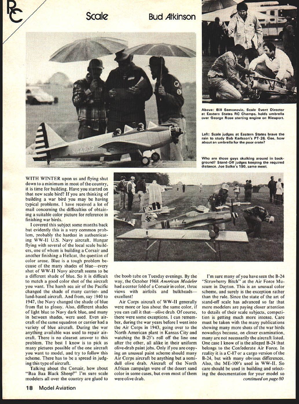 WITH WINTER upon us flying shut down minimum country time building Have started new scale bird thinking building war bird may having typical problems have received lot mail concerning difficulties obtain ing suitable color picture reference finishing war birds covered subject some months back hut evidently very common prob lem probably hardest authenticat ing WW-II US Navy aircraft Hangar flying several local scale build ers building Corsair another finishing Hellcat question color arose Blue tough problem cause shades blueevery shot WW-II Navy aircraft seems different shade blue So difficult match good color shot aircraft want harsh sea air Pacific changed shade carrier- land-based aircraft say 1940 1947 Navy changed shade blue flat glossy Also different shades light blue Navy dark blue between shades used air craft same squadron carrier variety blue aircraft During war anything available used repair air craft no clearset answer problem best know pick pictures possible aircraft want model try follow scheme has spread judg ing type aircraft Talking about Corsair about Baa Baa Black Sheep Im sure scale modelers over country glued boob tube Tuesday evenings way October 1968 American Modeler center fold Corsair color three views airfoils bulkheads excellent Air Corps aircraft WW-II generally less about same color can call thatolive drab course some exceptions can remem ber during war years before went Air Corps 1943 going over North American plant Kansas City watching B-25s roll off line after other alike uniform olive-drab paint jobs Only copy ing unusual paint scheme should Air Corps aircraft anything semidull olive drab Aircraft North African campaign desert sand color some cases olive drab Im sure have seen B-24 Strawberry Bitch Air Force Mu seum Dayton unusual color scheme surely exception rather rule Since state art stand-off scale has advanced far modelers paying closer attention details scale subjects competi tion getting much intense Care must taken publications showing shots war birds nowadays because closer examination necessarily aircraft listed case know alleged B-24 belongs Confederate Air Force reality C-87 cargo version B-24 obvious differences Also ME-109s used WW-II So care should used building select ing documentation model continued page 80 18 Model Aviation Above Bill Semonovic Scale Event Director Eastern States RC Champs holds umbrella over George Rose starting engine Nieuport Left Scale judges Eastern States brave rain study Bob Karlssons PT-26 Gee about umbrella poor crate guys skulking around back ground Stand-Off judges keeping required distance Joe Soikes 190 same meet dont represent thing show pictures another quality judging advancing along build ing flying scale stand-off scale should So time needs spent obtaining static material reported 33000 ME-109s constructed 1936 1945 hundreds modifications some very obvi ous such engine arma ment changes show up stand-off model So say again select 3-views pictures care contests attend static scores running very close fine stand-off models being turned out days would have liked static judge 70 stand-off scale models case 1976 Nats subject static fudging have requested modelers mention planning scale contest especially two-day scale contest contest planners should state scale flying will both days also static judging will take place Im sure much confu sion subject especially pattern also flown have experienced problem will scale judged Its especially hard have drive long distance big west-coast Western Front Mor gan Hill contest has come gone indications have seen heard something else being fifth year WW-l AMA Stand-Off Scale contest incorporated some interesting events such WW-l maneuvers WW-I combat Sounds like real fun scale contest need contests Youd better believe loria Poehmel took two weeks build Nosen Gere Sport shes modeler three months third ship Webra Speed 60 theme specialization WW-I WW-II scale stand-off becoming popular throughout country Bud Atkinson 734 North 6th Street Terrace Blue Springs MO 64015 Airborne Restarts/Watson continued page 39 valves controlled servo mounted radio compartment gb-plug battery also mounted switch mounted high side throttle servo control ignition power About two weeks work required build first prototype Saturday July 10 thought ready challenge air instead learned lesson After usual range checks engine tune-ups launched invention didnt waste time got plane right up about 400 feet gb-plug turned advancing throttle last two notches engine killed engaging both compression valves placed plane about 30-degree dive about 200 feet snapped release valves Nothing happened repeated procedure hastily down 100 feet Nothing again landed plane began heavy hearted discussion possible prob ems no real clues since engine silent throughout whole ordeal finally made assumption starting energy needed needed flywheel easy add ap peared could use little nose weight anyway week construction ground tests brought demonstrable progress could now kill engine short intervals ground restart energy flywheel needed good weather Sunday day Everything ready after few preliminaries Falcon took air time went 80 Model Aviation Kraftsmanship kit processed AAMCO GOLD BALSAThis Trainer will blow apart hits ground Price $3495 kit per dollar bar em alL RC Scale/Atkinson continued page 18 GREATEST R/C "BASIC TRAINER Design & Kit ALL TIME Ask over 25000 satisfied builders H-RAY dealers sold themSHALL WE SAY MORE Andrews Ajerraft Model Css lnr US Ete 1& North St Topstield Mass 0t983 887-8541