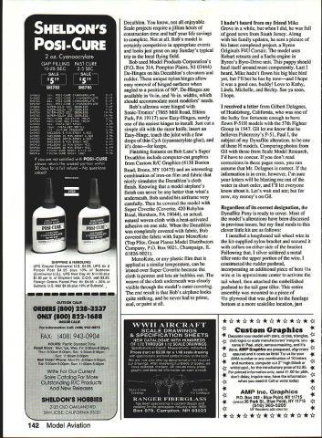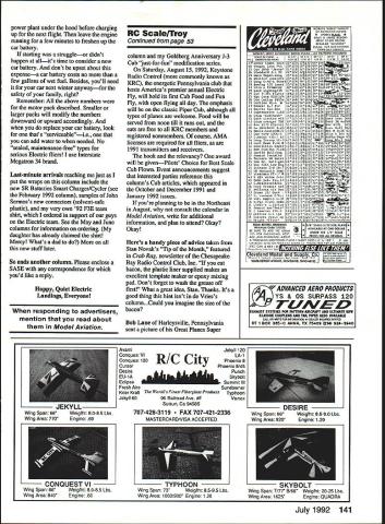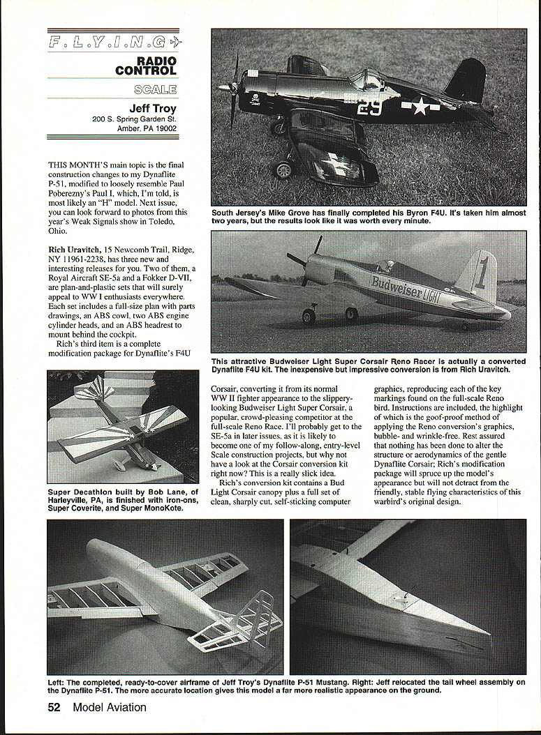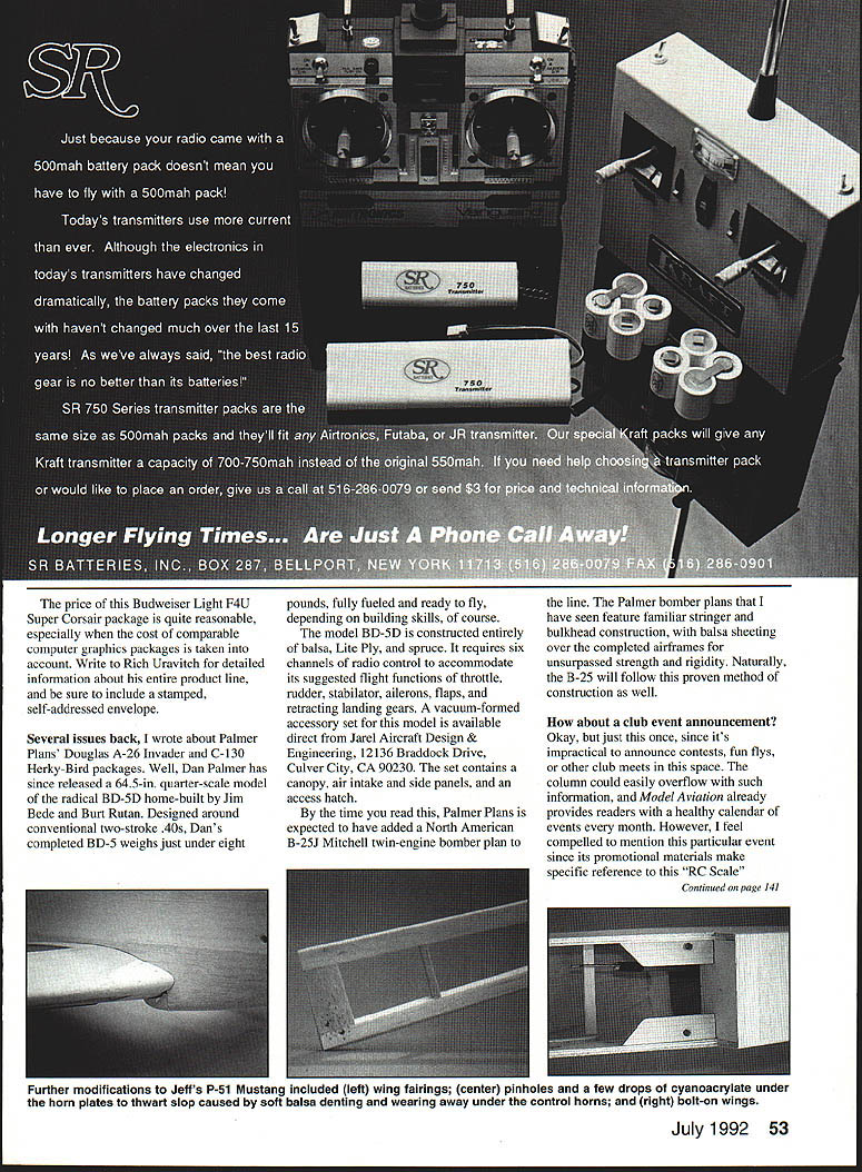 /zo O CONTROL Jeff Troy 200 S Spring Garden St Amber PA 19002 THIS MONTH S main topic final construction changes Dynaflite P-S 1 modified loosely resemble Paul Pobereznys Paul Im told likely H model Next issue can look forward photos years Weak Signals show Toledo Ohio Rich Uravitch 15 Newcomb Trail Ridge NY 11961-2238 has three new interesting releases Two Royal Aircraft SE-Sa Fokker D-VII plan-and-plastic sets will surely appeal WW enthusiasts everywhere set includes full-size plan parts drawings ABS cowl two ABS engine cylinder heads ABS headrest mount behind cockpit Richs third item complete modification package Dynaflite s F4U Corsair converting its normal WW II fighter appearance slipperylooking Budweiser Light Super Corsair popular crowd-pleasing competitor full-scale Reno Race Ill probably get SE-Sa later issues likely become follow-along entry-level Scale construction projects have look Corsair conversion kit right now really slick idea Richs conversion kit contains Bud Light Corsair canopy plus full set clean sharply cut self-sticking computer graphics reproducing key markings found full-scale Reno bird Instructions included highlight goof-proof method applying Reno conversions graphics bubble- wrinkle-free Rest assured nothing has done alter structure aerodynamics gentle Dynaflite Corsair Richs modification package will spruce up models appearance will detract friendly stable flying characteristics warbird s original design 52 Model Aviation South Jerseys MIKE urove nas TIfl8IIY compietea flis byron l4U ItS taken him almost two years results look like worth minute attractive Budweiser Light Super Corsair Reno Racer actually converted Dynaflite F4U kit inexpensive impressive conversion Rich Uravitch Super Decathlon built Bob Lane Harleyville PA finished iron-ons Super Coverite Super MonoKote Left completed ready-to-cover airtrame 0 Jeff Troys Dynatlite P-51 Mustang Right Jeff relocated tail wheel assembly Dynaflite P51 accurate location gives model far realistic appearance ground price Budweiser Light F4U Super Corsair package quite reasonable especially cost comparable computer graphics packages taken account Write Rich Uravitch detailed information about entire product line sure include stamped self-addressed envelope Several issues back wrote about Palmer Plans Douglas A-26 Invader C-130 Herky-Bird packages Well Dan Palmer has since released 645-in quarter-scale model radical BD-5D home-built Jim Bede Burt Rutan Designed around conventional two-stroke 40s Dans completed BD-5 weighs just under eight pounds fully fueled ready fly depending building skills course model BD-5D constructed entirely balsa Lite Ply spruce requires six channels radio control accommodate its suggested flight functions throttle rudder stabilator ailerons flaps retracting landing gears vacuum-formed accessory set model available direct Jarel Aircraft Design & Engineering 12136 Braddock Drive Culver City CA 90230 set contains canopy air intake side panels access hatch time read Palmer Plans expected have added North American B-25J Mitchell twin-engine bomber plan line Palmer bomber plans have seen feature familiar stringer bulkhead construction balsa sheeting over completed airframes unsurpassed strength rigidity Naturally B-25 will follow proven method construction well about club event announcement Okay just once since its impractical announce contests fun flys other club meets space column could easily overflow such information Model Aviation already provides readers healthy calendar events month However feel compelled mention particular event since its promotional materials make specific reference RC Scale Continued page 141 July1992 53 Further modifications Jeffs P-51 Mustang included left wing fairings center pinholes few drops cyanoacrylate under horn plates thwart slop caused soft balsa denting wearing away under control horns right bolt-on wings power plant under hood before charging up next flight leave engine running few minutes freshen up car battery starting struggleor didnt happen allits time consider new car battery dont upset about expensea car battery costs no few gallons wet fuel Besides youll need car next winter anywayfor safety family right Remember above numbers motor pack described Smaller larger packs will modify numbers downward upward accordingly replace car battery look thats serviceableie can add water needed No sealed maintenance-free types serious Electric fliers use Interstate Megatron 34 brand Last-minute arrivals reaching just put wraps column include new SR Batteries Smart Charger/Cycler see February 1992 column samples John Sermoss new connectors solvent-safe plastic very own 92 F3E team shirt ordered support guys Electric team See May June columns information ordering daughter has already claimed shirt Mercy Whats dad new stuff later So ends another column Please enclose SASE correspondence youd like reply Happy Quiet Electric Landings Everyone responding advertisers mention read about Model Aviation RC ScaIeIToy Continued page 53 column Goldberg Anniversary J-3 Cub just-for-fun modification series Saturday August 15 1992 Keystone Radio Control commonly known KRC energetic Pennsylvania club hosts Americas premier annual Electric Fly will hold its first Cub Food Fun Fly open flying day emphasis will classic Piper Cub although types planes welcome Food will served noon till runs out eats free KRC members registered nonmembers course AMA licenses required fliers 1991 transmitters receivers hook relevancy award will givenPilots Choice Best Scale Cub Flown Event announcements suggest interested parties reference columns Cub articles appeared October December 1991 January 1992 issues youre planning Northeast August consult calendar Model Aviation write additional information plan attend Okay Okay Heres handy piece advice taken Stan Novaks Tip Month featured Crab Rag newsletter Chesapeake Bay Radio Control Club Inc eat bacon plastic liner supplied makes excellent template mak