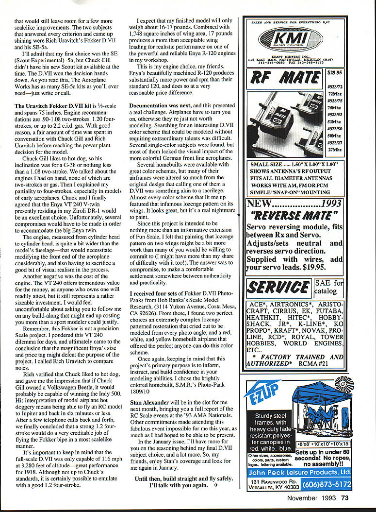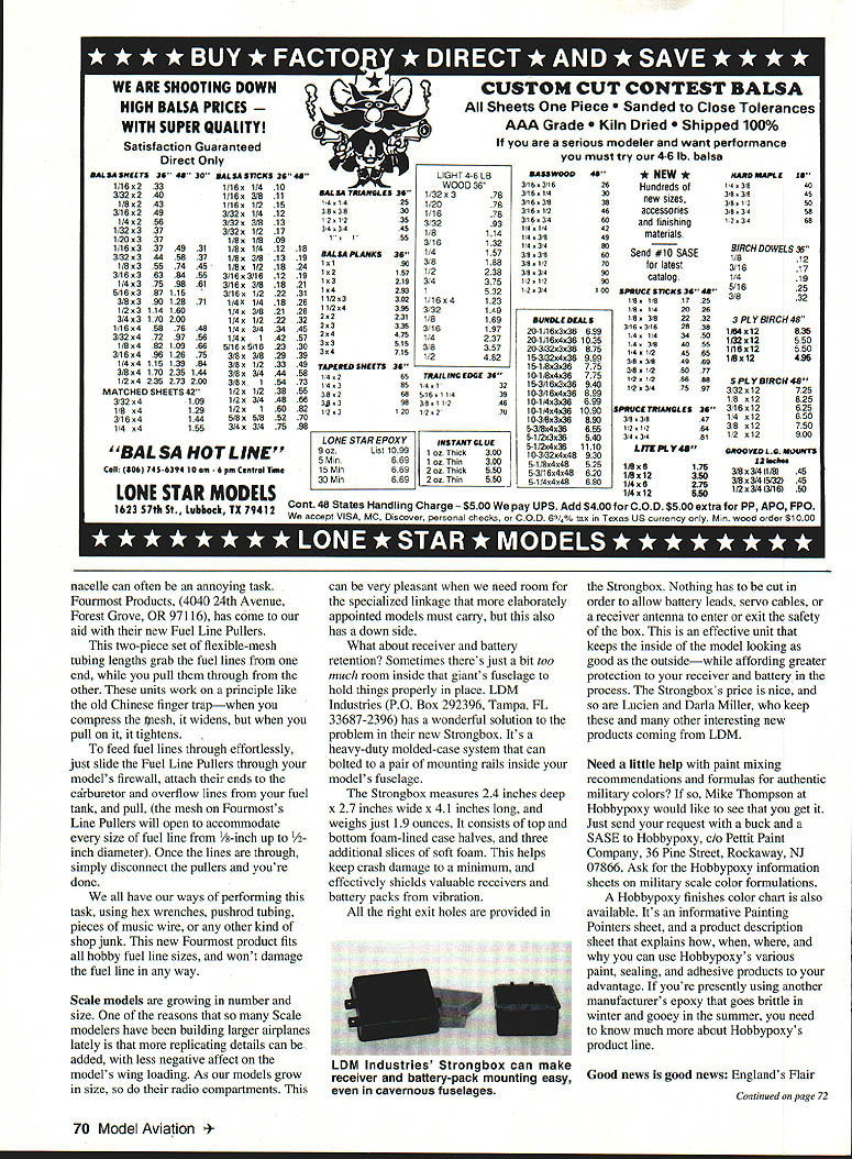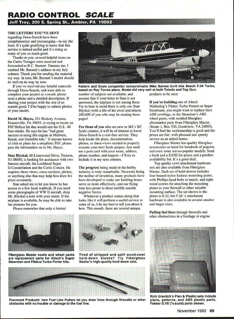 RADIO CONTROL SCALE r LETTERS YOUVE SENT regarding Docu-Search have complimentary encouragingto say least Its quite gratifying know service indeed useful its doing much good Thanks several helpful items Curtis Tanager received forwarded RC Burnett Dummy omitted Mr Burnetts address July column Thank sending material way turn Mr Burnetts model should well its way now youve received helpful materials through Docu-Search able complete project result please send photo detailed description sharing project rest us sounds good Id happy submit photos model David M Hayes 331 Hickory Avenue Feasterville PA 19053 trying locate F6F Hellcat kit would suit OS 48 four-stroke says has great success using engine Midwest Royal Dynaflite kits anyone knows kit plans simplistic F6F please pass information Mr Hayes Stan Blyskal 60 Limewood Drive Trenton NJ 08690 looking assistance two famous aircraft Lockheed Super G Constellation Curtis Condor requires three-views cross-sections photos anything else may help him draw plans accurately Stan asked let know has access few local warbirds need some photographs WW II aircraft drop Mr Blyskal note needs airplane available may able take pictures Please remember limited Pattern Scale competitor extraordinaire Mike Barbee built Beech T-34 Turbo based Ray Torres plans Model did very well both Toledo Top Gun number subjects available assume letter Stan answered airplane among Try bear mind Stan Blyskal life own almost 200000 may reading pages new MAs RC Scale column will interest know Docu-Search cost-free service help locate plans documentation photos three-views needed properly execute next Scale project Just send post card name address phone number requestIll try include next column progress being made hobby industry truly remarkable Necessity being mother invention products have developed make building hours serve us effectively flying time less prone terrible outside negative forces Whenever product comes along looks like will perform useful service some us best tell about month several unique youre building Altech Marketings Pilatus Turbo Porters Super Stearmans might want replace ABS cowlings Stearmans ABS wheel pants molded fiberglass aftermarket parts Fiberglass Master Route 1 Box 530 Goodview VA 24095 Youll find workmanship good prices fair pleasant speedy service added bonus Fiberglass Master has quality fiberglass accessories hand hundreds popular some not-so-popular models Send buck SASE prices product availability list Its good deal Top quality cowl attachment hardware sets also available Fiberglass Master set hold-downs includes four brazed-nylon locknut mounting plates Phillips-head bolts match eight wood screws attaching mounting plates firewall other suitable mounting surface set shown photo 8-3 2 FMs attachment hardware also available several smaller larger sizes Pulling fuel lines through firewalls other obstructions fuselage engine November1993 69 products seen Fiberglass Master cowls wheel pants Tired stripped split wood-cowl replacement parts Altechs Super hold-down blocks Try Fiberglass Stearman Pilatus Turbo Porter kits Masters high-quality hold-down sets Rich Uravitchs Plan & Plastic sets include Fourmost Products new Fuel Line Pullers let draw lines through firewalls otherplans patterns ABS plastic parts obstacles no trouble damage fuel lineFokker DVII 1Ascale parts shown A WE ARE SHOOTING DOWN HIGH BALSA PRICES WITH SUPER QUALITY Satisfaction Guaranteed Direct Only iALSA STICKS 34 48 1/161/410 1/16x3/811 1/161/215 3/32x1/412 3/32x3/813 3/321/217 1/81/809 311/81/412 37 1/83/813 451/8x1/218 553/18x3/1612 613/163/818 3/16x1/222 711/41/418 1/43/821 1/4x1/222 1/4x3/434 1/4142 5/16x5/1623 3/8x3/829 3/81/233 3/8x3/444 3/8x154 1/2x1/238 1/2x3/448 1/2x160 5/8x5/852 3/43/475 SALSA SHEETS 34 48 30 1/16x233 3/32240 1/8243 3/16248 1/4256 1/32337 1/20337 1/1633749 3/32x34458 1/835574 3/1636384 1/437598 5/16387115 3/8x390128 1/23114160 3/43170200 1/16x4587648 3/324729756 1/848210966 3/1649612675 1/4411513984 3/84170235144 1/24235273200 MATCHED SHEETS 42 3/32x4109 1/8 x4129 3/164144 1/4 4155 BALSA HOT LINE Cell 1806 745 6394 10 sue 6pm Central Time w SALSA TRIANGLES 34 41425 38w 3630 121235 34 3445 I~55 BaLSA PLANKS34 1190 12157 13219 14283 11/23302 11/24386 22231 23335 24475 33515 34715 TAPE NED SHEETS34 14265 14365 38268 318388 123120 LIGHT 4-0 LB WOOD 36 132378 112078 1/1679 3/3293 1/8114 316132 1/4157 318188 12238 314375 1532 118123 3132149 1/8189 3/18197 1/4237 38357 12482 18 19 24 19 21 31 2604 28 32 45 57 30 39 49 58 73 55 66 82 70 88 LONESTAR EPOXY INSTANTGLUE 9 OZLISt 10991 oz Thick300 5 Mm6691 oz Thin300 15 Mm6692oz Thick550 30 Mm6692oz Thin550 TRAILING EDGE 34 4132 0116111439 3811246 12270 SASS WOOD 3116 3116 311614 3116 318 3116 12 311634 14 14 1438 14314 36316 318 112 318 34 2 12 12 34 must try 4-6 lb balsa 48 26 30 38 46 60 42 48 80 60 70 80 90 100 BUNDLE DEALS 20-1/16336699 20-1/164361035 20-3/32336875 1 5-3/32x436999 15-1 /8x336775 10-1/8436775 15-3/16336940 10-3/16436899 10-1/4336899 10-1/44361090 10-3/8336890 5-3/8x436655 5-1/2336540 5-1/24361110 10-3/32446930 5-1 /8x448525 5-3/1 6448620 5-1/4448680 * NEW * Hundreds new sizes accessories felishing materials Send #10 SASE latest catalog SPRUCE SliCKS 3448 18 1181725 118 147026 118 SIR2232 31163162838 14 1143450 14 3184055 114 1124565 3183184889 3181126077 112 1126686 1/23147587 SPRUCE TRIANGLES 318318 1212 34 34 LnKpLr4a 1/8x8175 1/812380 114x8275 1/4x12580 HARD MAPLE 14318 316 318 318 12 318 34 1234 IS 40 45 50 08 68 BIRCH DOWELS 36 1/812 3/1817 1/419 5/1625 3/832 3 PLY BIRCH 48 1/84x12835 1/3212550 1/18x12550 1/8x12485 5 PLYBIRCH48 3/32x 12725 1/8 o12825 34 3/1612625 1/4 0 e3/8 12750 811/2 12900 GROOVED LG M8UNTS 13 IndIes 3/8x3/411/81 AS 3/8x3/415/3245 1/23/413/16160 LONE STAR MODELS Cont 48 States Handlung Charge pay UPS Add $400 C0D $500 extra PP APO FPO 1623 57th St Lubbock TX 7412 Weaccep/VISA MC Discover personal checks orCOD 6,% lax Texas US currency Mm wood order $1000 A T3 nacelle c