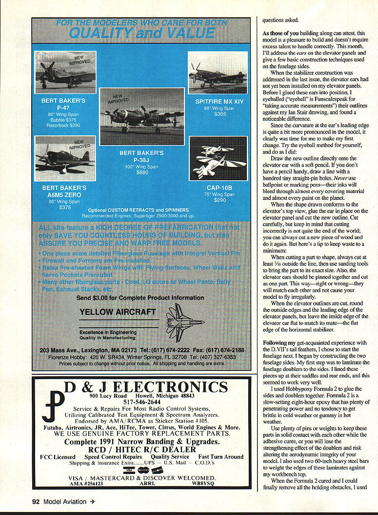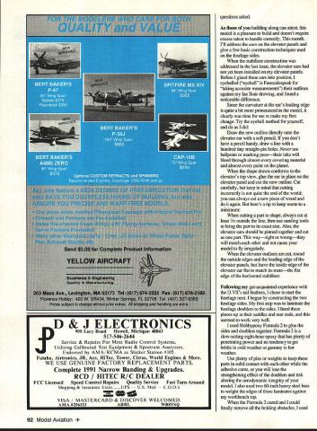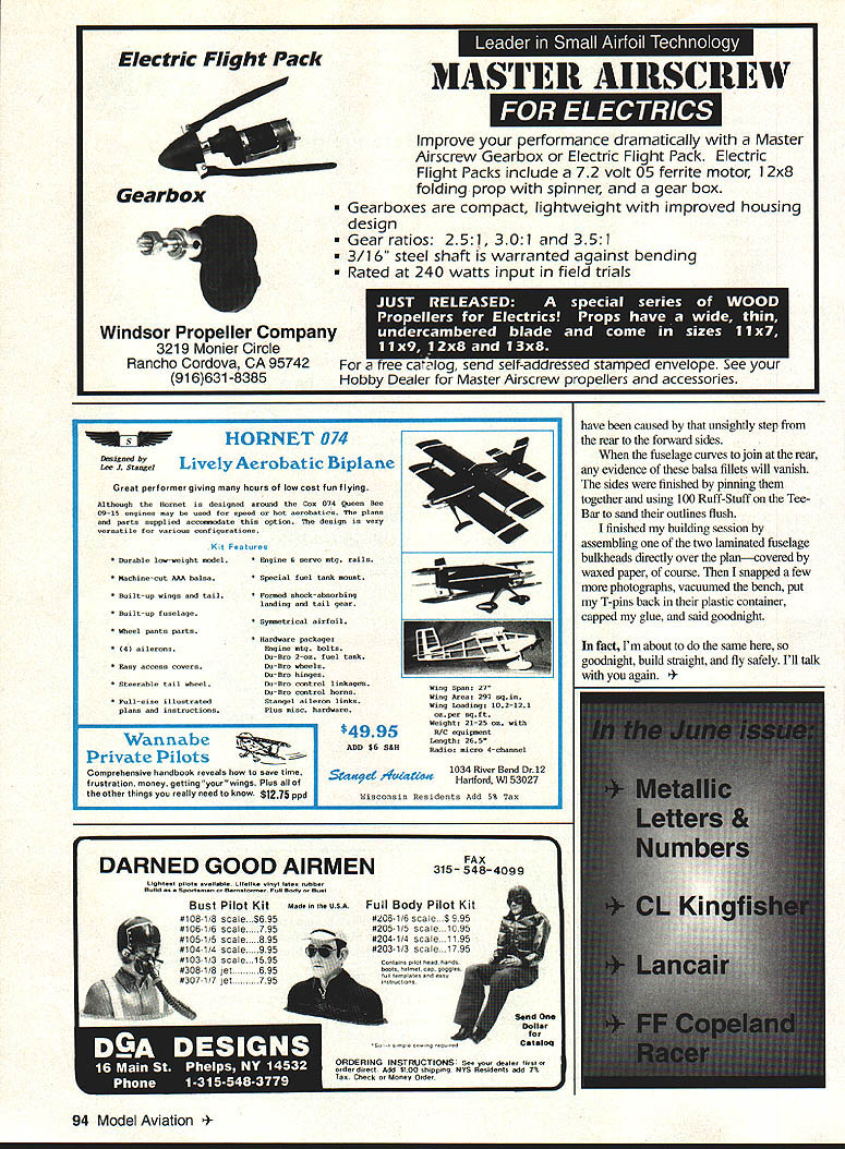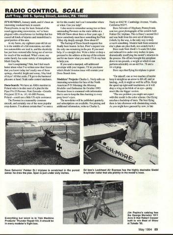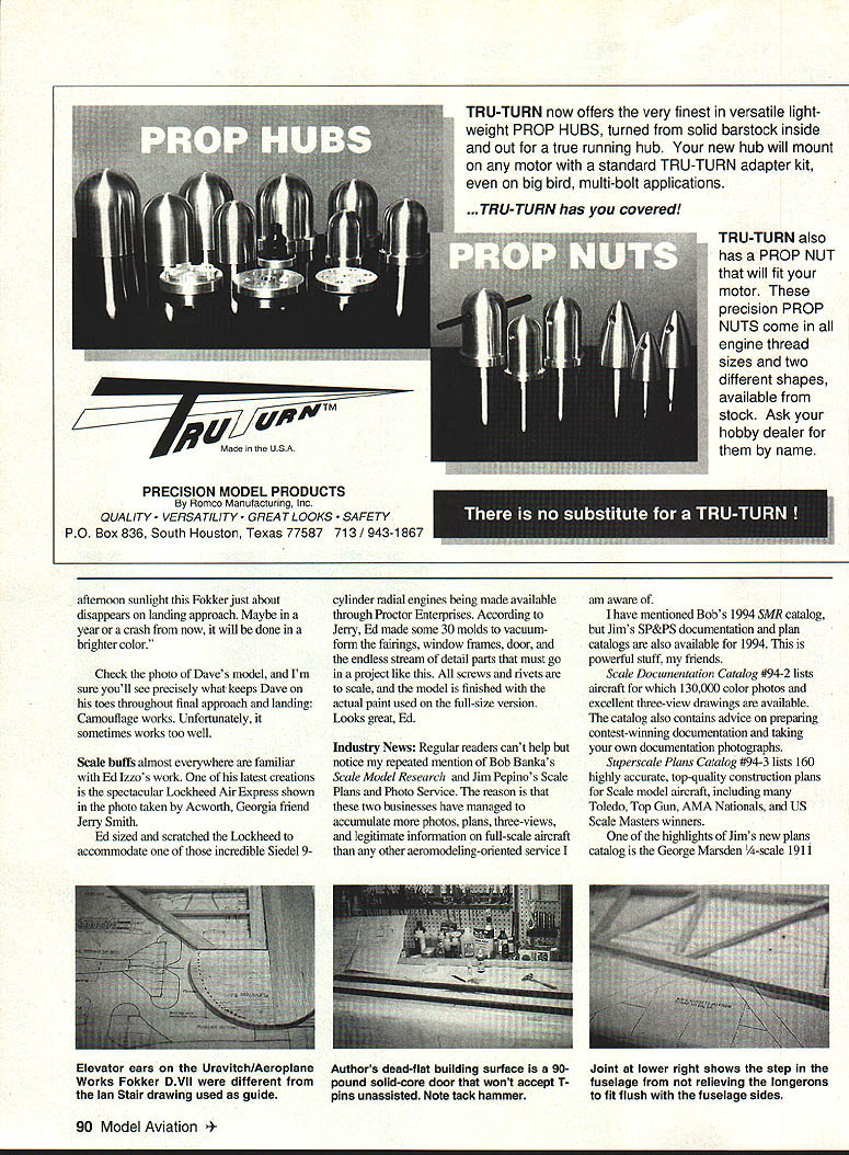 RADIO CONTROL SCALE ITS SUNDAY January ninth its interesting weekend eastern Pennsylvania say least Instead usual aggravating snowstorms weve plagued treacherous ice buildup has caused kinds injuries immobilized good portion area home eighteen-year-old kit car middle full restoration other two automobiles iced electricity has just restored after being out service much weekend Whats entire family has some variety intergalactic Meeb Zorp flu Am complaining Nah feel much better about what Ive written now know know today isnt really springy cheerful bright sunny May kind days aside Ill get business pleasure hand Scale radio control airplanes Docu-Search have AMA member Poland dire need plan Piper PA-25 Pawnee Piotr ZawadaOsiedle Przyjazni 22 Nm 14161-680 Poznan Polandcould use little US-style assistance Pawnee reasonably common aircraft certainly popular crop dusters Im almost certain Ive seen kit model cant remember Can help also seem remember seeing two three outstanding Pawnees static tables WRAIVI Show about three four years ago know somebody must have something Piotr dig deeply enough about backnp Docu-Search requests has finally beaten fact Piotrs request remaining pot need help its straight shot Write letter drop postcard address top column let know what need Ill best help you send stamped self-addressed envelope request Ill let know ModelAviation issue will contain Docu-Search item Modelers Projects Charles L Neely edits interesting newsletter fans North American P-5 1 Mustang Mustang Modeller Enthusiast Its October 1993 Premiere Issue crammed information sure keep fires burning pony lovers eyes newsletter will published quarterly subscriptions available pricing additional information write Charles L Neely 4142W Cambridge Avenue Visalia California 93277 Dave Selvenis Olyphant Pennsylvania sent two great photographs scratch-built Fokker DrI triplane Daves second DrI built own set drawings way way truly scratch something Models built someone elses plans plan-built scrateh-built Dave took Nick Zirolis -scale DrI plan reduced under sixty inches span dramatically modifying models structure process efforts brought aeroplane down ten pounds weight can perform admirably old Fox 78 l4x6prop Dave says flying triplane great takeoff two touches rudder keep straight arrow lift off landing.well might well Pitts Keep speed up right until touchdown will drop wing blink eyepretty much like bigger version problem might expect model color scheme flying area has backdrop trees best flying late afternoon diminishing winds As might have guessed now late Jim Pepinos catalog has George Marsden 1911 Avro D Robert Cooper built win Best Show Toledo 93 May1994 89 Dave Selvenis Fokker Drl triplane scratched purest Ed Izzos Lockheed Air Express has highly desirable Siedel sense drew plan Span just under sixty inches 9-cylinder radial sits prettily models nose Everything talent T&A Machine Products Thunder Repair Kit should modelers flight box TRU-TURN now offers very finest versatile light weight PROP HUBS turned solid barstock inside out true running hub new hub will mount motor standard TRU-TURN adapter kit big bird multi-bolt applications TRU-TURN has covered TRU-TURN also has PROP NUT will fit motor precision PROP NUTS come engine thread sizes two different shapes available stock Ask hobby dealer name afternoon sunlight Fokker just about disappears landing approach Maybe year crash now will done brighter color Check photo Daves model Im sure youll see precisely what keeps Dave toes throughout final approach landing Camouflage works Unfortunately sometimes works too well Scale buffs almost everywhere familiar Ed Izzos work latest creations spectacular Lockheed Air Express shown photo taken Acworth Georgia friend Jerry Smith Ed sized scratched Lockheed accommodate incredible Siedel 9cylinder radial engines being made available through Proctor Enterprises According Jeny Ed made some 30 molds vacuumform fairings window frames door endless stream detail parts must go project like screws rivets scale model finished actual paint used full-size version Looks great Ed Industry News Regular readers cant help notice repeated mention Bob Bankas Scale Model Research Jim Pepinos Scale Plans Photo Service reason two businesses have managed accumulate photos plans three-views legitimate information full-scale aircraft other aeromodeling-oriented service am aware have mentioned Bobs 1994 SMR catalog Jims SP&PS documentation plan catalogs also available 1994 powerful stuff friends Scale Documentation Catalog #94-2 lists aircrafi 130000 color photos excellent three-view drawings available catalog also contains adviee preparing contest-winning documentation taking own documentation photographs Superscale Plans Catalog #94-3 lists 160 highly accurate top-quality construction plans Scale model aircraft including Toledo Top Gun AMA Nationals US Scale Masters winners highlights Jims new plans catalog George Marsden -scale 1911 90 Model Aviation n U S PRECISION MODEL PRODUCTS Romco Manufacturing Inc QUALITY VERSA TILITY GREAT LOOKS TY PO Box 836 South Houston Texas 77587 713 943-1867 Elevator ears UravitchlAeroplane Works Fokker DVII different Ian Stair drawing used guide Authors dead-flat building surface 90- Joint lower right shows step pound solid-core door wont accept T- fuselage relieving longerons pins unassisted Note tack hammer fit flush fuselage sides Avro D won coveted Best Show distinction Weak Signals 1993 Toledo Show plan model spectacular covers aspect construction Trust model vintage aerobuffs delight youre suckerfor artsy fragile wooden landing gear draggy flying wires functional rigging wires hand-polished brass hardware wood stain buiftone fabric youve just got have additional information catalog prices contact Scale Plans Photo Services 3209 Madison Avenue Greensboro NC 27403 Talk among knowledgeable Scale aeromodelers Doss Steed has finest plan pattern sets available modelers wishing tackle -scale P-5 1 documents 