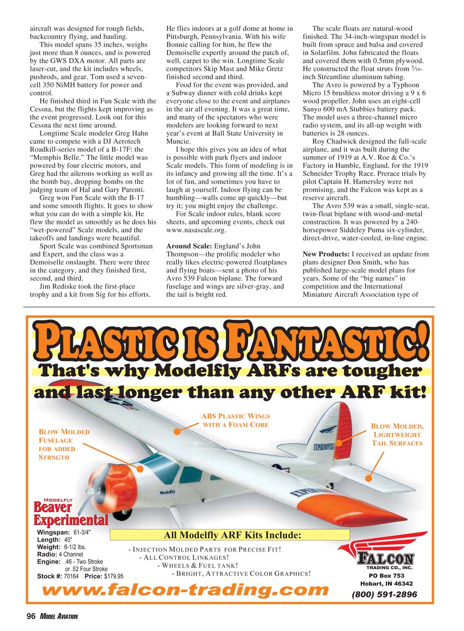 has a beautiful finish and weighs only 8.5 ounces. John Thompson scratch-built his 1919 Avro 539 Falcon