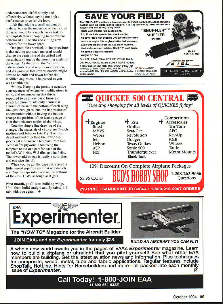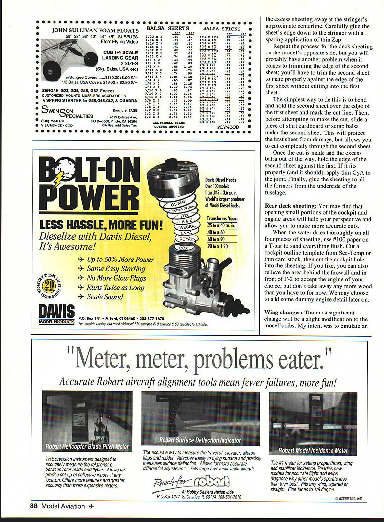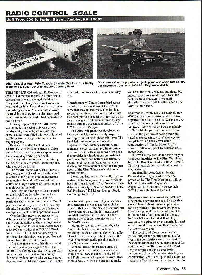 RADIO CONTROL SCALE r r i m THIS YEARS Mid-Atlantic Radio Control MARC show affairs tenth annual celebration once again held Maryland State Fairgrounds Timonium Maryland June 5-6 always smashing success schedule allowed visit show first time what saw made wish able see sooner Industry support MARC show evident Instead two nearby cottage industry exhibitors shows aisles filled level exhibitor cottage entrepreneurs major players friendly AMA attended District IV Vice President Howard Crispin few dedicated assistants spent weekend spreading good will distributing information entertaining AMAs members including stopped chat MARC show selling show plenty cash abundance action booths numerous swap tables Several well-stocked hobby outlets large displays items sale booths well no shortage Scale models MARC static tables luck would have found myself particular show camera Youll just have take word friends models largely first-rate examples Scale its uppermost levels familiar trade show necessity definitely came play MARCs show ability draw huge crowd never expected see monster attendance RC show other WRAM Weak Signals RCHTA considering its physical size show proportionately packed time opened youre easterner show should become part agenda has youre located elsewhere plan eastern part country during early June try take extra travel day visit MARC show will make nice addition business holiday trip Manufacturers News stumbled across two countless items MARC show may interest first second-generation update product Ive playing around year designed manufactured friends Tim Megan Richardson Ultra R/C Products Georgia Ultra Wingman developed help quickly accurately inspect wide spectrum preflight check items hand-held microcomputer provides diagnostics reads battery condition remembers personal preflight routine unit works onboard flight pack provides data rpm exhaust gas temperature battery condition sound-level meter ambient temperature display various timer functions just few Ultra Wingmans additional useful features wont go too much detail since updated Ultra Wingman II now available youll just love youre techno data-crunching type Send SASE Ultra RJC Products 5455 Linger Longer Road Cumming GA 30130 try make aware plan services documentation services other similar services benefit Scale discipline never realized hadnt mentioned Wendell Hostetlers Plans until almost tripped over Wendells exhibitor booth MARC show Normally such oversight might forgivable outfit has providing Scale community quality plans way too long left out cold should really put outfit Scale source checklist Wendell has impressive array interesting civilian subjects couple military classics like PT-19 P6E thrown good measure about 30% J-3 big enough make hock family wheels plenty big enough set model apart pack Send SASE Wendell Hostetlers Plans 1041 Heatherwood Lane Orrville OH 44667 Last month wrote about relatively new WW aircraft preservation recreation organization called First Warplanes As promised contacted group additional information absolutely thrilled package received Ive also pleasure seeing first newsletter/magazine Aerodrome Update complete back-cover color reproduction Yanks Mount Up newer 1990 WW print aviation artist James Dietz WW aeroplanes trick send inquiries First Warplanes Inc PO Box 366 Guntersville AL 35976 association should consider very seriously Incidentally Aerodrome 94 Biennial WW fly-in convention promoted First Warplanes will held Guntersville Airport August 20-21 Wait until see WW Flying Replica Museum Since casual mention L-19 Bird Dog photo few months ago Ive received several letters about pleasantlooking military light observation plane Heres big break want build Roy Vaillancourt has greatlooking 108-inch L-19-O1 Bird Dog available plan set partial kit either should make excellent project fans airplane L-19 Bird Dog seems like perfect subject getting someones feet wet competitive arena Its hard beat unarmed high-wing cabin model stability handling ease Bird Dog simple enough Scale newcomers shouldnt intimidated its construction yet its complicated enough make effective entry Static portion October 1994 85 After almost year Pete Fuscos 1A-scale Gee Bee Z finally ready go Super Coverite 21st Century Paint Good news about popular subject plans short kits Roy Vaillaricourts Cessna L-19-O1 Bird Dog available Full-size pattern pseudo-undercamber lower ribs Uravitch Fokker DVII event well flightline information send SASE Vailly Aviation 18 Oakdale Avenue Farmingdale NY 11738-2828 Docu-Search Bill Bradley needs information Blohm Voss Bv138 Flying Boat Hes collecting manner data plane ages still has questions does air go after passes radiators no louvers holes slots shown photos. have information interesting aircraft send Bill Bradleys Art Frame 1306 Blalock Westview Houston TX 77055 Joe Weizer 1621 Surrey Lane Havertown PA 19083 would like informationthree-views plans photos etcconceming Curtiss C-46 Commando Joe first-class builder flier club instructor longtime friend Can help him Jim Brophy 479 Laurel St Paul MN 55102 also looking flying boat information would like Lohner Type L WW aircraft Austrian forces hes unable find information needs begin project can share plans photos history other valuable information please Jim could use help must National Flying Boat Month John D Lee PO Box 90871 White Mountain Lake AZ 85912-0871 would like create second improved model Dornier 24 Flying Boat first scaled up Italieri plastic kit hes convinced could plane accurately accurate information disposal about Have photos three-views John also looking information Billy Mitchells DH-4B unusual Docu-Search request Kevin K Howell interesting building Gee-Bee R- Z has neither time nor equipment cut parts templates might provided plan know available kits either planes size would suit 12 four-stroke 60-90 two-stroke anyone has such kit plan recommendation quality kit cutter please write Kevin 3801 Lone Tree Way Antioch C