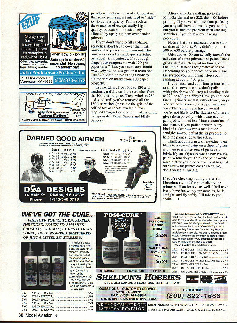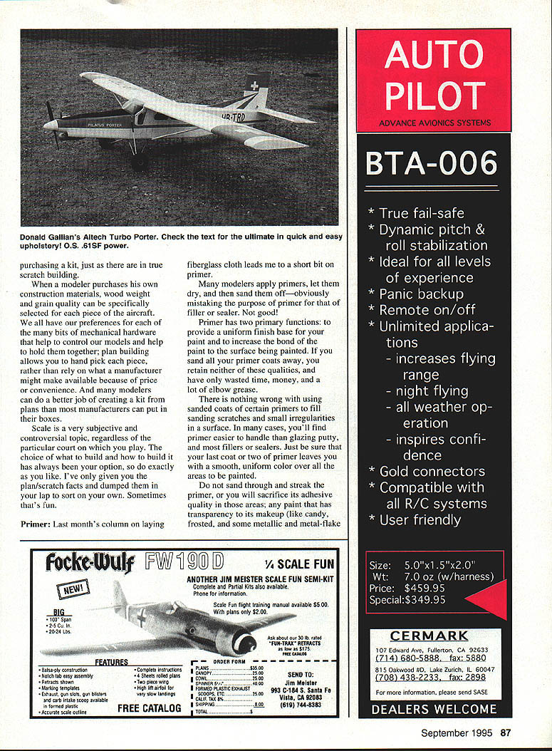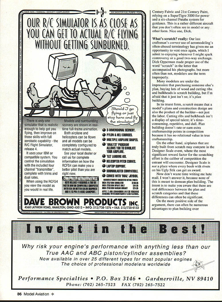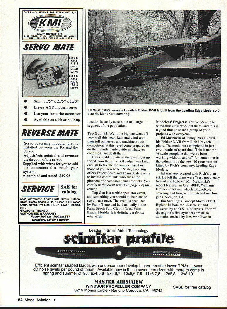 RADIO CONTROL SCALE ri k'-4i--1 1 THIS YEARS WEAK SIGNALS Expo Toledo Ohio very powerful show static models Scale otherwise magnificently crafted last down side cant seem find Toledo film anywhere Im unable share experience plenty see manufacturers exhibits well static tables two models stood out crowd Terry Nitsch s F-86 metal finish believed Dennis Crooks impressive Lear 35 finally received First Place recognition its always deserved Im partial antique aeroplanes always try maintain objectivity two jets top-shelf material Next month Ill have scale activity news new East Coast Hobby Show took place May 19-21 Fort Washington PA first-year show has already received major industry attention 190 exhibitors scheduled attend suburban Philadelphia September 1995 83 Concept Fleet has popular quarter-scale years Jim Snellings smaller version Beautiful trailing edge sweep Dick Johnstons Curtis XP-24 guaranteed get attention Enya 90 four-stroke 11-pounds SERVO M*TE 4odel KMI 921 assem bled $2495 4odel KMI 921K kit $1995 Size. 175 x 275 x 130 Drives ANY modem servo Use favourite connector Available kit built-up REVERSE M*TE Servo reversing module installed between Rx Servo Adjusts/sets netutral reverses dirction servo Supplied wires add connectors match system Assembled tested $1995 SERVICE SAE catalog Ace Alrtronlcs Aristo-Craft Cirrus Futaba Hftec Hobby Shack J R K-Line K 0 Propo Kraft Novak Pro-Une RCD Tower Hobbles etc. FACTORY TRAINED AUTHORIZED WARRANTY 800am 500pm EST weekdays call tor Saturday location easily accessible large segment population Top Gun 95 Well big went off very well year Rain wind took toll nerves machinery competitors level come prepared gentlemanly battle whatever conditions dealt unable attend event friend Tom Kozel TGI Judge kind enough fax winners list new RC Scale Top Gun offers Expert Scale Team Scale events invited contestants pinnacle Scale talent notoriety See results event report page 7 issue Top Gun terrific spectator event something should make plans see least once event produced Frank Tiano held annually Palm Beach Polo Club West Palm Beach Florida definitely miss affair Modelers Projects Youve up some first-class work out good time share group projects everyone Ed Muszinski Tinley Park IL built Fokker DVII Rich Uravitch plans model completed just two months spare time 1A-scale aeroplane weve working off some time column its new 40 sport version kitted Richs company Leading Edge Models Ed very pleased Richs plan set felt plans very good easy read follow Mr Muszinskis model features OS 4OFP Williams Brothers pilot wheels MonoKote covering trim scratched machine guns Nice job Ed Jim Snellings Concept Models Fleet Biplane 1/6-scale kit powered OS 40 Surpass Four engines five cylinders balsa dummies crafted Jim lives Efficient scimitar shaped blades undercamber develop higher thrust lower RPMs Lower dB noise levels per pound thrust Available now seventeen sizes come spring summer 95 8x456 9x567 10x5678 11x678 12x68 13x81O MASTER AIRSC1IEW WINDSOR PROPELLER COMPANY 3219 Monier Circle ho Cordova CA 95742 SASE free catalog 84 Model Aviation * SALES AND SERVICE FOR EVERYTHING H/C KRAFr MIDWESr INC 7420 SEVEN MILE NORTHVILLE MI 45187 5104584800 FAX 8104B51803 0 0 0 Ed Muszinskis A-scale Uravitch Fokker D-ViI built Leading Edge Models 40size kit MonoKate covering Leader Small Airfoil Technology Magalia CA Jim quite impressedfrom clear MonoKote ironed Concepts kit stating designeris excellent method handling Romey Bukolt mechanical engineertask film-covered models Aero FX created no unnecessary partsprovided models markings Sounds good installed interior details Dick Johnston Jamestown NY isPorter including sheet Styrene plastic enthralled biplanes built thisfloor seat brackets instrument beautiful Curtis XP-24 span 67panel Instruments JTec inches model powered Enya rior item Id never seen before 90 four-stroke weighs just 11 poundsthat really caught attention Dons three ounces seven-channel Airtronicshandling Porters seats carved system guides big blue whitethem balsa covered Curtiss Great stuff Dicknylon stocking before painting Guys very interesting Altech Pilatus Turbois always simplest things leave Porter PC-6 built Donald Gallian ofyou scratching head woulda Chicago IL Don fascinated thethought . Thanks tip friend Porters unique appearance feels thatIm sure cant wait try aircrafts long pointed nose andfor ourselves squared-off wings tail surfaces appear Opperman Oakland Park FL have designed committeededicated Scale builder crafted fine Mr Gallians white MonoKoted PorterBellanca Airbus scratch Information follows side-mounted OS 61SF enginewas obtained Canadian Historical Its trimmed red UltraCote panelAircraft Society finished product lines Sharpie felt-tip pen under aended up just 17 pounds clear overcoat Side windows cut s Bellanca finished 21st NEED SCALE DOCUMENTATION Antiques Military Civilian Helicopters Sailpianes have worlds largest aircraft documentation collection 5500 different full color photo studies 1905-1995 30000 3-view line drawings New 1995 Catalog/Guide 168 pages Only $800 Canada $900 Overseas $1400 Bob Bankas Scale Model Research 3114 Yukon Avenue a Mesa CA 92626 979-8058 NEED RIC ACCESSORIES FLY TO HITEC RCD FOR ALL YOUR ACCESSORY NEEDS 6 Y harness 7351# 6 Buffered Y harness 7354# LiZ1 12 Aileron Extension 7345# 24 Aileron Extension 7346# 6 Buffered Servo Conn 7356# ZIEi 9 Male Servo Conn 7342# 9 Female shown 7343# Switch Harness w/Battery & Clip 72 15# Please specify connector type orderi ng Part #followed Airt J Fut S Hitec/RCD & JR ALSO AVAILABLE 50 ft Bulk Servo Wire 3001 Rubber Ducky Antenna 1125 Flight Preserver wNelcro 8480 hitoc RCD 10729 Wheatlands Ave #C Santee CA 92071-2883 619 258-4940 September 1995 85 Dick Oppermans scratch-built Bellanca Airbus Canadian Historical Aircraft Society plans ST 3000 Futaba radio 2-EEIUPL UUUIY rum Hal COURSES MIIIlPIE DJHPIINE SHAPES ANALYZE PROWN ALLOWS YE TO SIMIUlI Tm AiWLANE ILl IRUIHI RID IEiCiP