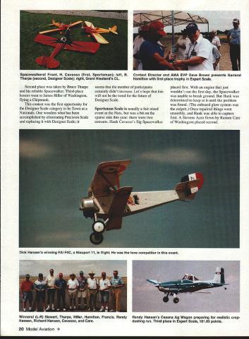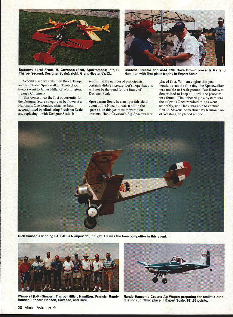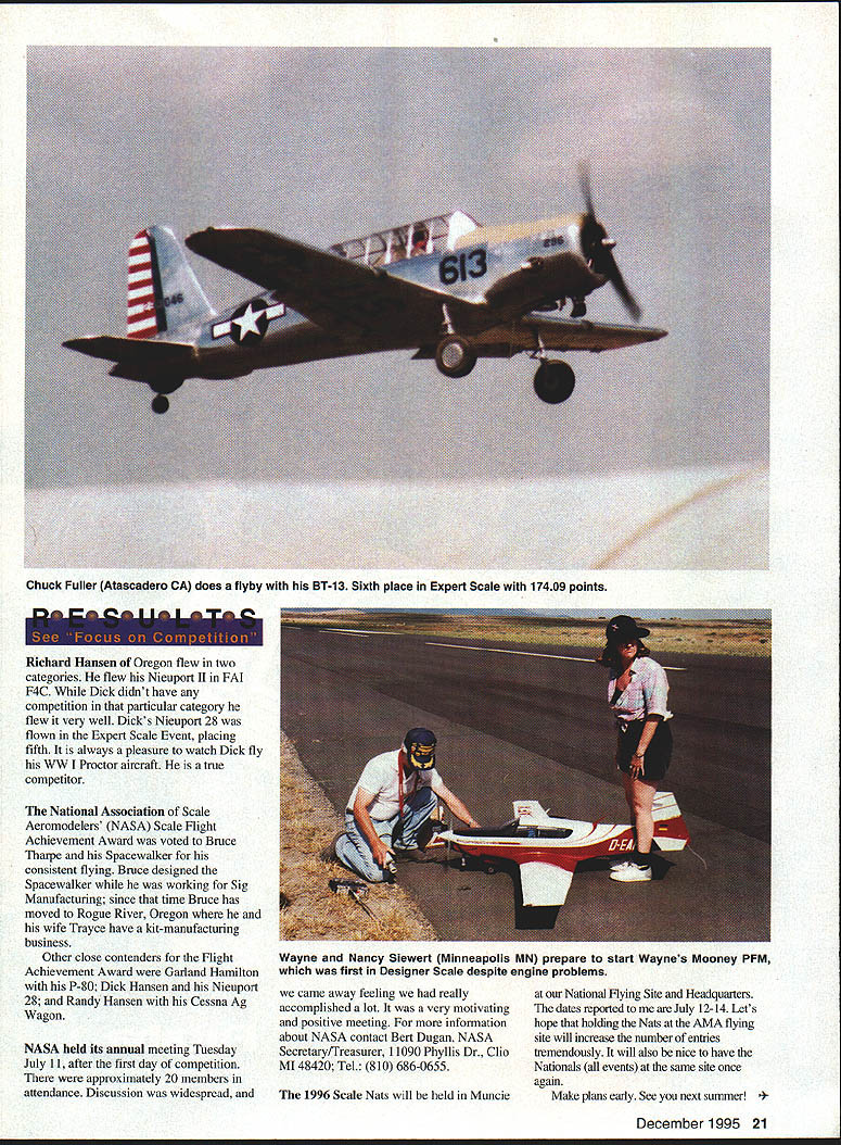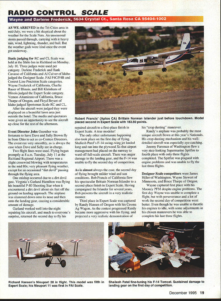 RADIO CONTROL SCALE AS WE ARRIVED Tn-Cities area mid-July bit skeptical about weather Scale Nats An unseasonal storm passed through carrying heavy rain wind lightning thunder hail weather gods kind once event got underway Static judging RC CL Scale held Shilo Inn Richland Monday July 10 Three judges used per category Darlene Frederick Hank Cavasso California Al Culver Idaho judged Designei Scale FAI F4C/F4B Control Line Precision Scale categories Wayne Frederick California Charlie Bauer Illinois Bill Kleinhans Illinois judged Expert Scale category Vernon Altamirano California Bruce Tharpe Oregon Floyd Bryant Idaho judged Sportsman Scale RC CL After aircraft judged displayed beautiful lawn area just outside hotel media spectators given opportunity see aircraft up close rest afternoon Event Director John Guenther fortunate have Dave Sally Brown fly Ohio act co-Contest Directors event ran very smoothly always case Dave Sally charge Two flight lines used Flying began promptly 8 am Tuesday July II Riebland Regional Airport slight crosswind blowing temperatures mid 80s very pleasant flying weather except occasional dirt devil passing through flying area mishap occurred due dirt devil gust Virginias Garland Hamilton flying beautiful P-80 Shooting Star encountered dirt devil about six feet off ground landing approach airplane slammed down onto its nose onto landing gear causing considerabte amount damage Garland worked well night repairing aircraft much everyones surprise returned second day fly repaired aircraft first-place finish Expert Scale true modeler other unfortunate happening also took place first day flying Shaliesh Patels F-14 swing-wing jet landed long ran plywood Xs airport management placed runway ward off full-scale aircraft major damage landing gear F- 14 unable fly second day competition As almost always case second day flying brought milder wind sun conditions Bob Francis California flew spectacular Brittain Norman Islander second-place finish Expert Scale Having campaigned Islander several years Bob presents aircraft very realistic manner Third place Expert Scale captured Randy Hansen Oregon Cessna Ag Wagon As contest progressed Randy became aggressive flying projected very realistic demonstration his crop dusting maneuver Randys airplane probably unique aircraft flown years Nationals crop-dusting mechanism welldetailed aircraft especially eye-catching Jeremy Fursman Washington flew very nice-looking Supermarine Spitfire fourth place three flights completed Spitfire plagued engine problems unable fly last three flights Designer Scale competitors James Hiller Washington Wayne Siewert Minnesota Bruce Tharpe Oregon Wayne captured first place Mooney PFM despite engine problems first day Wayne unable complete flight perseverance lot work second day competition went better though unable throttle engines idle some adjustments chosen maneuvers able complete last three flights December 1995 19 Robert Francis Aptos CA Brittain Norman Islander just before touchdown Model placed second Expert Scale 18350 points Richard Hansens Nieuport 28 flight model fifth Expert Scale Nieuport 11 first FAI Scale Shailesh Patel fine-tuning F-14 Tomcat Sustained damage landing gear first day competition Second place taken Bruce Tharpe reliable Spacewalker Third-place honors went James Hiller Washington flying Chipmunk contest first opportunity Designer Scale category flown Nationals wonders what has accomplished eliminating Precision Scale replacing Designer Scale seems number participants certainly didnt increase Lets hope will trend future Designer Scale Sportsman Scale usually fair-sized event Nats bit sparse side year two entrants Hank Cavassos Sig Spacewalker placed first engine just wouldnt run first day Spacewalker unable break ground Hank determined keep until problem found onboard glow system culprit Once repaired things went smoothly Hank able capture first Stevens Acro flown Ramon Care Washington placed second 20 Model Aviation ewalkers Front H Cavasso first Sportsman left B Contest Director AMA EVP Dave Brown presents Garland Tharpe second Designer Scale right Grant Hiestands CL Hamilton first-place trophy Expert Scale Dick Hansens winning FAI F4C Nieuport 11 flight lone competitor event Winners L-R Siewert Tharpe Hiller Hamilton Francis Randy Randy Hansens Cessna Ag Wagon preparing realistic crop Hansen Richard Hansen Cavasso Care dusting run Third place Expert Scale 18183 points EIinI T Richard Hansen Oregon flew two categories flew Nieuport II FAt F4C Dick didnt have competition particular category flew very well Dicks Nieuport 28 flown Expert Scale Event placing fifth always pleasure watch Dick fly WW Proctor aircraft true competitor National Association Scale Aeromodelers NASA Scale flight Achievement Award voted Bruce Tharpe Spacewalker consistent flying Bruce designed Spacewalker working Sig Manufacturing since time Bruce has moved Rogue River Oregon wife Trayce have kit-manufacturing business Other close contenders Flight Achievement Award Garland Hamilton P-80 Dick Hansen Nieuport 28 Randy Hansen Cessna Ag Wagon NASA held its annual meeting Tuesday July 11 after first day competition approximately 20 members attendance Discussion widespread came away feeling really accomplished lot very motivating positive meeting information about NASA contact Bert Dugan NASA Secretary/Treasurer 11090 Phyllis Dr Clio MI 48420 Tel 810 686-0655 1996 Scale Nats will held Muncie National flying Site Headquarters dates reported July 12-14 Lets hope holding Nats AMA flying site will increase number entoes tremendously will also nice have Nationals events same site once again Make plans early See next summer mber 1995 21 Chuck Fuller Atascadero CA does flyby BT-13 Sixth place Expert Scale 17409 points Wayne Nancy Siewert Minneapolis MN prepare start Waynes Mooney PFM first Designer Scale despite engine problems