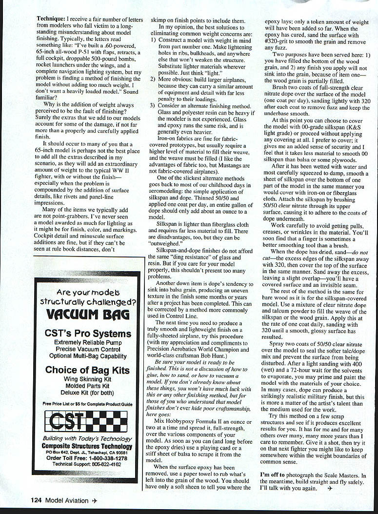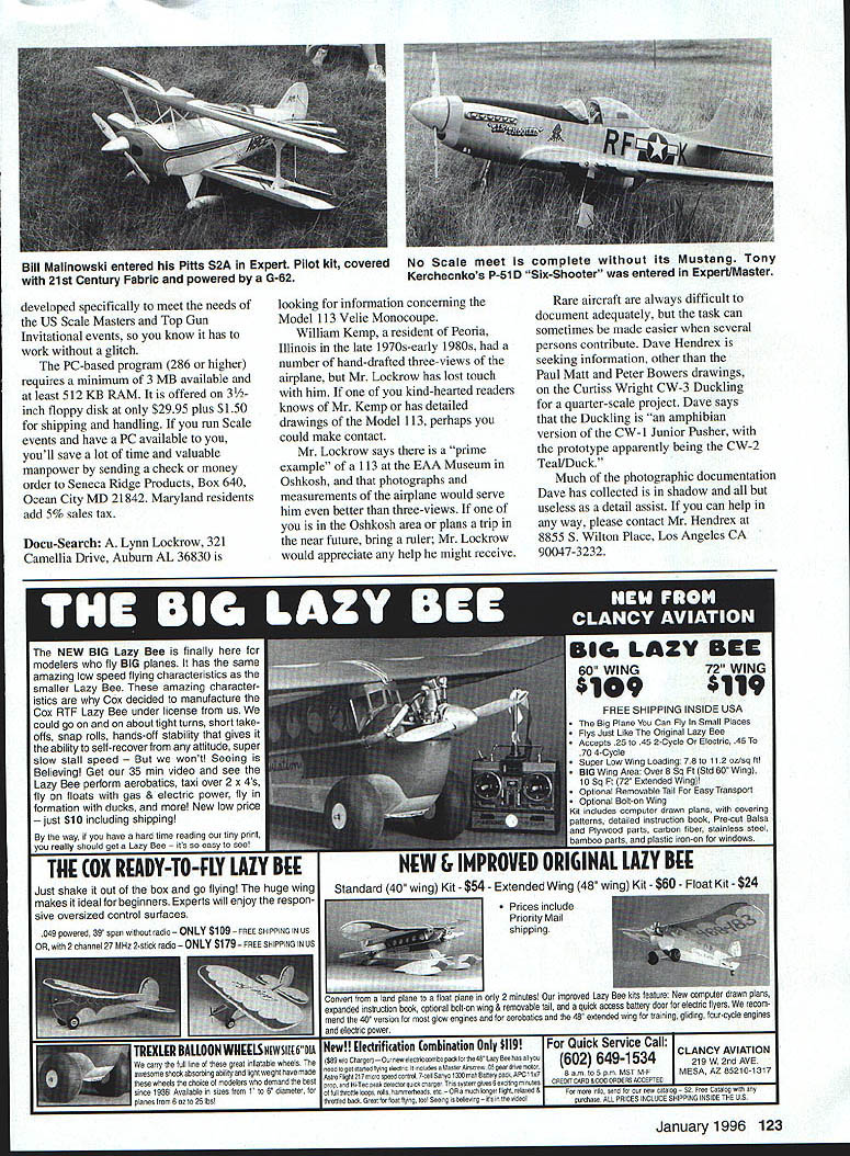 RADIO CONTROL SCALE ON JULY 16 enjoyed very pleasant Sunday afternoon Contest Directors Mel Katz Mike Dalton club Southeastern Pennsylvania Aeromodelers Radio Control Society occasion SPARCS 20th Annual Sport Scale Meet US Scale Masters Regional Qualifier Warminster PA Naval Air Station large paved runways provided perfect atmosphere operating conditions meet Fourteen fliers brought first-class models top-level flight skills Warminster Aircraft ranged Norm Malinowskis SE-S Bill Setzler s Fokker Eindecker Dave Malchiones more-contemporary Lockheed T-33 arrived after static judging taken place did check board find impressive Setzler Eindecker taken top static honors 935 As might expect event bearing stature Scale Masters Qualifier several outstanding models Roy Vaillancourt brought Stinson L-5 model original design now available Roy kit form Power Q-42 Futaba 7-UAF provides guidance Benjamin Moore Latex paint used over Super Coverite attain excellent olive drab upper pale underside L-5 quarter-scale model 102-inch span Dave Maichione has lighting up contest trail Northeast convincing reasons performance Lockheed T-33 built Bob Violett kit already know keeping neon paints alive sun no simple task Daves method seems have done trick day-gb red vintage Lockheed shot common Testors plastic modeling paint spray can clear-coated Ditzler two-part polyurethane available auto paint shops handling PPG products Cliff Tacie has competent team member first-class competitor longer can remember likes Cliff have qualify slots Scale Masters Cliff brought Fly Baby scratch-built 84 inches OS 91 Surpass four-stroke up front 14-pound Fly Baby covered Super Coverite painted Randolph dope Cliff has produced excellent Scale computer scoring system called Simply Scale ScoreMaster system 122 Model Aviation Vaillancourts Stinson L-5 SPARCS Scale Contest andCloseup Dave Maichiones T-33 cockpit forward radio US Scale Masters Qualifier Now kitcompartment layout neon paint doesnt fade / Tom Polapinks Pfalz crammed outstanding surface details Check out engines rocker arms stained grain cabane struts Cliff Tacies familiar Fly Baby weighs 14 pounds has 84-inch New Jerseys Norm Malinowski shown SE 5 wingspan has 05 91 Surpass up front entered Expert Sport Scale SPAFICS contest developed specifically meet needs US Scale Masters Top Gun Invitational events know has work glitch PC-based program 286 higher requires minimum 3 MB available least 512 KB RAIVI offered 3inch floppy disk $2995 plus $150 shipping handling run Scale events have PC available youll save lot time valuable manpower sending check money order Seneca Ridge Products Box 640 Ocean City MD 21842 Maryland residents add 5% sales tax Docu-Search A Lynn Lockrow 321 Camellia Drive Auburn AL 36830 looking information concerning Model 113 Velie Monocoupe William Kemp resident Peoria Illinois late 1970s-early 1980s number hand-drafted three-views airplane Mr Lockrow has lost touch him kind-hearted readers knows Mr Kemp has detailed drawings Model 113 perhaps could make contact Mr Lockrow says prime example 113 EAA Museum Oshkosh photographs measurements airplane would serve him better three-views Oshkosh area plans trip near future bring ruler Mr Lockrow would appreciate help might receive Rare aircraft always difficult document adequately task can sometimes made easier several persons contribute Dave Hendrex seeking information other Paul Matt Peter Bowers drawings Curtiss Wright CW-3 Ducking quarter-scale project Dave says Duckling amphibian version CW- 1 Junior Pusher prototype apparently being CW-2 Teal/Duck Much photographic documentation Dave has collected shadow useless detail assist can help way please contact Mr Hendrex 8855 5 Wilton Place Los Angeles CA 90047-3232 TIlE OX READY-TO-FLY LA Just shake out box go flying huge wing Standard 40 wino Kit S54 Extended Wing 48 makes ideal beginners Experts will enjoy respon sive oversized control surfaces ces include Priority Mail 049 powered 39 open radio $109 FREE 5hIIFPi5G IN 15 pping OR 2 channel 27 MHz 2-stick redio $179 FREE OHIPPINO IN U5 Osovert ., . float plane 2 minuteul Oar improved Lazy Bee kits teature New computer drawn piano enpanded inotraction book optional bolt-on wing & removable tail quick acceno basery door electric tlyero recom mend 40 version moot glow engines tor aerobatics 48 eotended wing training gliding four-cycle engines electric power w! Iectrification Combination Only $119 Quick Service Call CLANCY AVIATION see carry Inn lair lion Oi oresn gruer ,iiuiuoe woes ,l$a9wIochursnnlounmeeiechiccom5opackfonlhe45LuZfoeenOSuilhoUt6O2 6491534219W 2nd AVE awesome shock absorsing ability lightweight hove wade nenufogef sfaneu flying ereofro Inoclcoesa Caster urecree 05 gear Sr ue mofon wheels choiceof modelers demand best usrroFlighrornmicrospeedcontnoi7-cel ounyof3ovmahauneravackIrPcrls7 5am oh pm M5T M-F MESA AZ 85210-1317 Available V otor propenOniiTecpeakdetecronquiokohantennhiaOySteingiueSteOc[v32][b1499304682325920]]cnooincvnoncoootoneoaccnFnnc since t508lsizesof foil ihonie loops rolls hemmerheans arc uch longer light relaced aFor morn info send nec catalog ree catalog nanesirom 6ozto25lbolvrnonieo saokOreatforfioufflyingtoo Oeeingishelrecng rrnfneui5eolpurchase hLL PRICES laCLuoEaHiPRlas INsloeTen va Bill Malinowski entered PiUs S2A Expert Pilot kit covered No Scale meet complete its Mustang Tony 21st Century Fabric powered G-62 Kerchecnkos P-51 D Six-Shooter entered Expert/Master NEW BIG Lazy Bee finally modelers fly BIG planes has same amazing low speed flying characteristics smaller Lazy Bee amazing character istics Cox decided manufacture Cox RTF Lazy Bee under license us could go on about tight turns short take offs snap rolls hands-off stability gives ability self-recover attitude super slow stall speed Seeing Believing Get 35 mm video see Lazy Bee perform aerobatics taxi over 2 x 4s fly floats gas & electric power fly formation ducks New low price just $10 including shipping way have hard