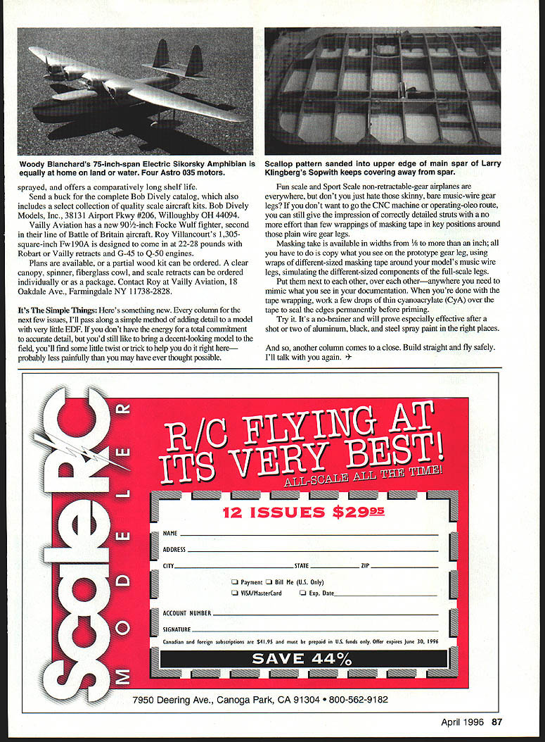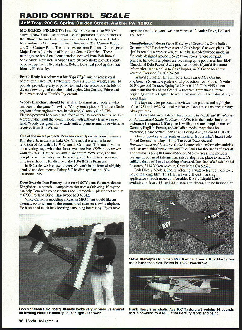 RADIO CONTROL SCALE MODELERS PROJECTS met Bob McKenna WRAM show New York year two ago promised send photo Ultimate building pictures finally arrived Bobs blue-and-white Goldberg airplane finished 21st Century Fabric 21st Century Paint markings Paul Dan Major Major Decals division Northeast Screen Graphics markings based documentation received Bob Bankas Scale Model Research Super Tigre 90 two-stroke provides plenty power up front Nice airplane Bob looks real good against friendly Florida sky Frank Healy columnist High Flight sent several photos Ace R/C Taylorcraft Power Q-35 just 14 pounds provides plenty power handle aerobatic schedule air show original model copies 21st Century Fabric Paint used Franks Taylorcraft Woody Blanchard should familiar almost modeler has game awhile Woody sent photo latest Scale project four-engine motor case Sikorsky S-42 Electric-powered behemoth uses four Astro 035 motors turn six 12 x 4 props pull 75-inch model authority water land Woody designed scratch-built airplane around three-views received Bill Warner nicest projects Ive seen recently comes Lawrence Klingberg Jr Canyon Lake CA model rather large rendition Sopwiths 1919 Schneider Cup racer model covering stage photos received Editors note see John deVries Giants column March 1996 issue aeroplane will probably have completed time read Hes shooting display 1996 IMS Pasadena RC scale last saw Lawrences work form highly detailed documented Falrey 3-C displayed 1994 California IMS Docu-Search Tom Ramsey has set RCM plans Anderson Kingfishera homebuilt amphibian uses Cub wing anyone can help Tom color schemes three-view please contact him 6708 Freeland Drive Hazelwood MO 63042 Vince Carroll modeling Russian MiG 3 would like alternate color scheme common red-stars-on-a-white-airplane hasnt much luck locating something interesting have anything looks good write Vince 12 Antler Drive Holland PA 18966 Manufacturers News Steve Blakeley Greenville Ohio built Grumman F9F Panther set Gus Morphis newest plans Jet actually prop -driven built-up balsa-and-plywood model /12 scale designed around 15-25 two-strokes compact gearless hand-toss airplanes becoming quite popular low-EDF Emotional Debt Factor Scale practice models youd like information send dollar Gus Morphis 4709 Green Meadows Avenue Torrance CA 90505-5507 Granville Brothers fans will love Incredible Gee Bee Airplanes 57-minute professional production Studio 16 Video 26 Ridgewood Terrace Springfield MA 01105 VHS videotape documents rise Granville Brothers humble beginnings New England world prominence realm highspeed flight tape includes personal interviews rare photos highlights 1931 1932 National Air Races Dont miss really takes back latest edition John C Fredriksens Flying Model Warplanes An International Guide Plans Kits works assistance requested anyone willing share complete runs German English French and/or Italian model magazines reference please contact John 461 Loring Ave Salem MA 01970 Always good news Scale enthusiasts Bob Bankas latest Scale Model Research catalog 1996 Scale Aircraft Documentation Resource Guide features eight informative articles lists available three-views Foto-Paaks thousands aircraft catalog $8 $10 Canada/Ivlexico $15 overseas includes postage need information catalog place start Its unlikely youll need anything afterward Bob Bankas Scale Model Research 3114 Yukon Avenue Costa Mesa CA 92626 Bob Dively Models Inc offering water-cleanup non-toxic liquid masking film film makes difficult masking applications much comfortable Dively Liquid Mask available four- 16- 32-ounce containers can brushed Bob McKennas Goldberg Ultimate looks very impressive against Frank Healys aerobatic Ace RIO Taylorcraft weighs 14 pounds inviting Florida backdrop SuperTigre 90 power powered Q-35 21st Century fabric paint 86 Model Aviation e Blakelys Grumman F9F Panther Gus Morfis 1112 scale hand-toss plan Power 15-25 two-stroke sprayed offers comparatively long shelf life Send buck complete Bob Dively catalog also includes select collection quality scale aircraft kits Bob Dively Models Inc 38131 Airport Pkwy #206 Willoughby OH 44094 Vailly Aviation has new 901/2-inch Focke Wulf fighter second line Battle Britain air craft Roy Villancourts 1305square-inch Fwl9OA designed come 22-28 pounds Robart Vailly retracts G-45 Q-50 engines Plans available partial wood kit can ordered clear canopy spinner fiberglass cowl scale retracts can ordered individually package Contact Roy Vailly Aviation 18 Oakdale Ave Farmingdale NY 11738-2828 Its Simple Things Heres something new column next few issues ill pass along simple method adding detail model very little EDF dont have energy total commitment accurate detail youd still like bring decent-looking model field youll find some little twist trick help right probably less painfully may have ever thought possible Fun scale Sport Scale non-retractable-gear airplanes everywhere dont just hate skiuny bare music-wire gear legs dont want go CNC machine operating-oleo route can still give impression correctly detailed struts no effort few wrappings masking tape key positions around plain wire gear legs Masking take available widths 1A inch have copy what see prototype gear leg using wraps different-sized masking tape around models music wire legs simulating different-sized components full-scale legs Put next other over otheranywhere need mimic what see documentation youre done tape wrapping work few drops thin cyanoacrylate CyA over tape seal edges permanently before priming Try Its no-brainer will prove especially effective after shot two aluminum black steel spray paint right places another column comes close Build straight fly safely Ill talk again l 1996 87 Woody Blanchards 75-inch-span Electric Sikorsky Amphibian equally home land water Four Astro 035 motors Scallop pattern sanded upper edge main spar Larry Klingbergs Sopwith keeps covering away spar 7950 Deering Ave Canoga Park CA 91304 562-9182