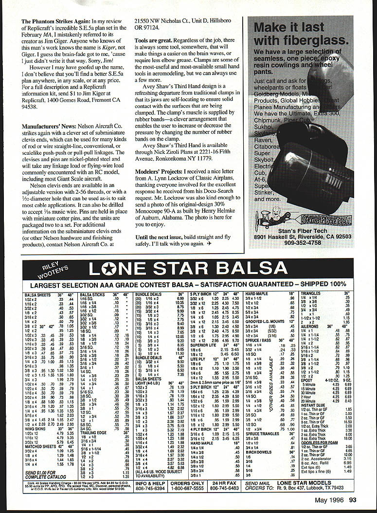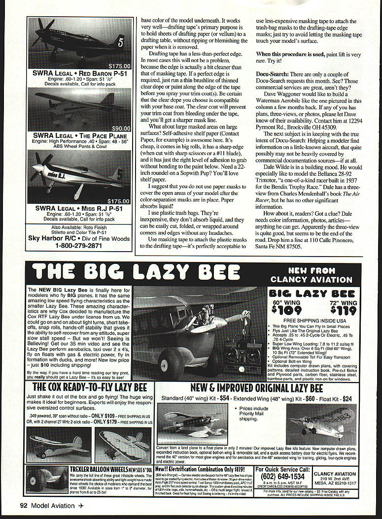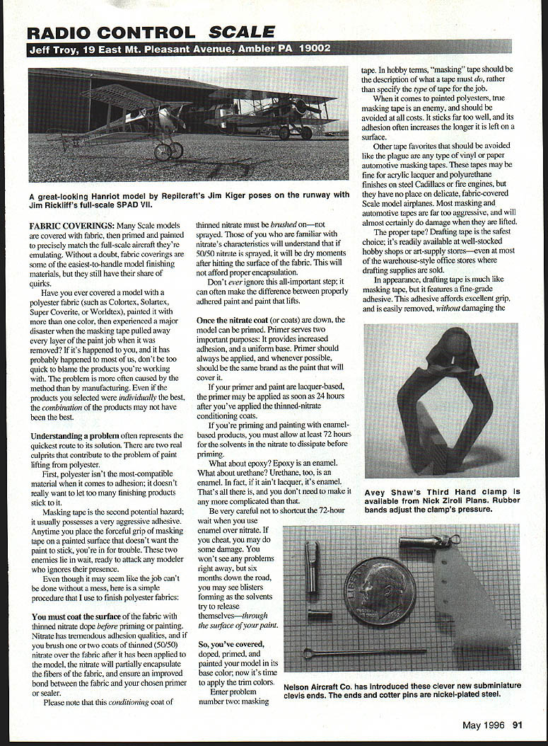RADIO CONTROL SCALE FABRIC COVERINGS Scale models covered fabric primed painted precisely match full-scale aircraft theyre emulating Without doubt fabric coverings some easiest-to-handle model finishing materials still have share quirks Have ever covered model polyester fabric such Colortex Solartex Super Coverite Worldtex painted color experienced major disaster masking tape pulled away layer paint job removed its happened has probably happened us dont too quick blame products youre working problem often caused method manufacturing products selected individually best combination products may have best Understanding problem often represents quickest route its solution two real culprits contribute problem paint lifting polyester First polyester isnt most-compatible material comes adhesion doesnt really want let too finishing products stick Masking tape second potential hazard usually possesses very aggressive adhesive Anytime place forceful grip masking tape painted surface doesnt want paint stick youre trouble two enemies lie wait ready attack modeler ignores presence though may seem like job cant done mess simple procedure use finish polyester fabrics must coat surface fabric thinned nitrate dope before priming painting Nitrate has tremendous adhesion qualities brush two coats thinned 50/50 nitrate over fabric after has applied model nitrate will partially encapsulate fibers fabric ensure improved bond between fabric chosen primer sealer Please note conditioning coat thinned nitrate must brushed onnot sprayed familiar nitrates characteristics will understand 50/50 nitrate sprayed will dry moments after hitting surface fabric will afford proper encapsulation Dont ever ignore all-important step can often make difference between properiy adhered paint paint lifts Once nitrate coat coats down model can primed Primer serves two important purposes provides increased adhesion unifomi base Primer should always applied whenever possible should same brand paint will cover primer paint lacquer-based primer may applied soon 24 hours after youve applied thinned-nitrate conditioning coats youre priming painting enamelbased products must allow least 72 hours solvents nitrate dissipate before priming What about epoxy Epoxy enamel What about urethane Urethane too enamel fact aint lacquer its enamel Thats dont need make complicated very careful shortcut 72-hour wait use enamel over nitrate cheat may some damage wont see problems right away six months down road may see blisters forming solvents try release themselvesthrough surface paint So youve covered doped primed painted model its base color now its time apply trim colors Enter problem number two masking tape hobby terms masking tape should description what tape must rather specify type tape job comes painted polyesters true masking tape enemy should avoided costs sticks far too well its adhesion often increases longer left surface Other tape favorites should avoided like plague type vinyl paper automotive masking tapes tapes may fine acrylic lacquer polyurethane finishes steel Cadillacs fire engines have no place delicate fabric-covered Scale model airplanes Most masking automotive tapes far too aggressive will almost certainly damage lifted proper tape Drafting tape safest choice its readily available well-stocked hobby shops art-supply storeseven warehouse-style office stores drafting supplies sold appearance drafting tape much like masking tape features fine-grade adhesive adhesive affords excellent grip easily removed damaging May1996 91 great-looking Hanriot model Repllcrafts Jim Kiger poses runway Jim Ricklifts full-scale SPAD VII Avey Shaws Third Hand clamp available Nick Ziroli Plans Rubber bands adjust clamps pressure Nelson Aircraft Co has introduced clever new subminiature clevis ends ends cotter pins nickel-plated steel Also Available Roto Finish Stiletto Color Tile P-Si Sky Harbor R/C Fine Woods 1-800-279-2871 fle NEW BIG Lazy Bee finally modelers fly BIG planes has same amazing low speed flying characteristics smaller Lazy Bee amazing character istics Cox decided manufacture Cox RTF Lazy Bee under license us could go on about tight turns short take offs snap rolls hands-off stability gives ability self-recover attitude super slow stall speed Seeing Believing Get 35 mm video see Lazy Bee perform aerobatics taxi over 2 x 4s fly floats gas & electric power fly formation ducks New low price just $10 including shippingl base color model underneath works very welldrafting tapes primary purpose hold sheets drafting paper vellum drafting table ripping blemishing paper removed Drafting tape has less-than-perfect edge cases will problem because edge actually bit cleaner masking tape perfect edge required just run thin bnsshuine thinned clear dope paint along edge tape before spray trim coats certain clear dope choose compatible base coat clear coat will prevent trim coat bleeding under tape youll get sharper mask line What about large masked areas large surfaces Self-adhesive shelf paper Contact Paper example awesome Its cheap comes big rolls has sharp edge cut sharp scissors #11 blade has just right level adhesion grab bonding paint below Need 22inch roundel Sopwith Pup Youll love shelf paper suggest use paper masks cover open areas model after color-separation masks place Paper absorbs liquid use plastic trash bags Theyre inexpensive dont absorb liquid can easily cut folded wrapped around corners edges headaches Use masking tape attach plastic masks drafting tapeits perfectly acceptable use less-expensive masking tape attach trash-bag masks drafting-tape edge masks just try avoid letting masking tape touch models surface procedure used paint lift very rare Try Docu-Search couple Docu-Search requests month See commercial services great arent Dave Waggoner would like build Waterman Aerobile like pictured column few months back has plans three-views photos please let Dave know availability Contact him 12294 Pyrmont Rd Brookville OH 45309 next subj