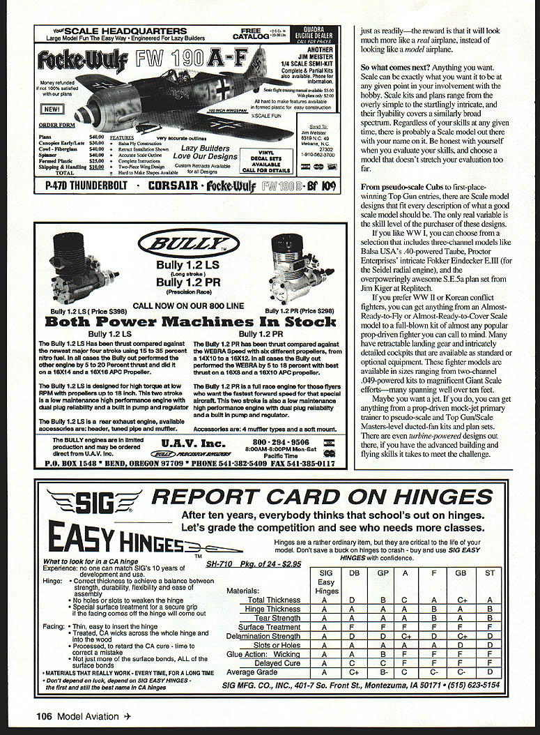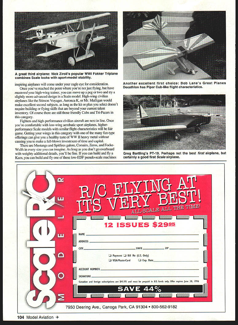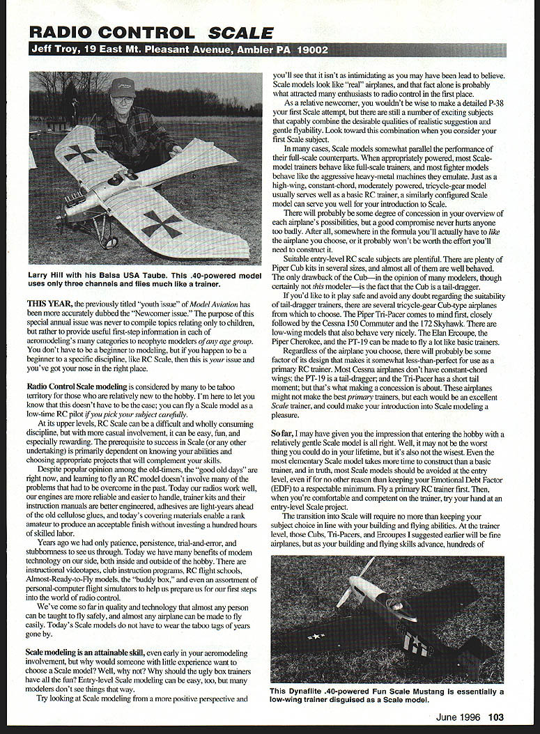 RADIO CONTROL SCALE THIS YEAR previously titled youth issue Model Aviation has accurately dubbed Newcomer issue purpose special annual issue never compile topics relating children rather provide useful first-step information aeromodelings categories neophyte modelers age group dont have beginner modeling happen beginner specific discipline like RC Scale issue youve got nose right place Radio Control Scale modeling considered tnboo territory relatively new hobby Im let know doesnt have case can fly Scale model low-time RC pilot f pick subject carefully its upper levels RC Scale can difficult wholly consuming discipline casual involvement can easy fun especially rewarding prerequisite success Scale other undertaking primarily dependent knowing abilities choosing appropriate projects will complement skills Despite popular opinion among old-timers good old days right now learning fly RC model doesnt involve problems overcome past Today radios work well engines reliable easier handle trainer kits instruction manuals better engineered adhesives light-years ahead old cellulose glues todays covering materials enable rank amateur produce acceptable finish investing hundred hours skilled labor Years ago patience persistence trial-and-error stubbornness see us through Today have benefits modem technology side both inside outside hobby instroctional videotapes club instruction programs RC flight schools Almost-Ready-to-Fly models buddy box assortment personal-computer flight simulators help us prepare us first steps world radio control Weve come far quality technology almost person can taught fly safely almost airplane can made fly easily Todays Scale models have wear taboo tags years gone Scale modeling attainable skill early aeromodeling involvement would someone little experience want choose Scale model Well should ugly box trainers have fun Entry-level Scale modeling can easy too modelers dont see things way Try looking Scale modeling positive perspective youll see isnt intimidating may have lead believe Scale models look like real airplanes fact alone probably what attracted enthusiasts radio control first place As relative newcomer wouldnt wise make detailed P-38 first Scale attempt still number exciting subjects capably combine desirable qualities realistic suggestion gentle flyability Look toward combination consider first Scale subject cases Scale models somewhat parallel performance full-scale counterparts appropriately powered Scalemodel trainers behave like full-scale trainers fighter models behave like aggressive heavy-metal machines emulate Just high-wing constant-chord moderately powered tricycle-gear model usually serves well basic RC trainer similarly configured Scale model can serve well introduction Scale will probably some degree concession overview airplanes possibilities good compromise never hurts anyone too badly After somewhere formula youll actually have like airplane choose probably wont worth effort youll need construct Suitable entry-level RC scale subjects plentiful plenty Piper Cub kits several sizes almost well behaved drawback Cubin opinion modelers though certainly modeleris fact Cub tail-dragger youd like play safe avoid doubt regarding suitability tail-dragger trainers several tricycle-gear Cub-type airplanes choose Piper Tn-Pacer comes mind first closely followed Cessna 150 Commuter 172 Skyhawk low-wing models also behave very nicely Elan Ercoupe Piper Cherokee PT-19 can made fly lot like basic trainers Reganlless airplane choose will probably some factor its design makes somewhat less-than-perfect use primary RC trainer Most Cessna airplanes dont have constant-chord wings PT-19 tail-dragger Tri-Pacer has short tail moment thats what making concession about airplanes might make best primary trainers would excellent Scale trainer could make introduction Scale modeling pleasure So far may have given impression entering hobby relatively gentle Scale model right Well may worst thing could lifetime its also wisest elementary Scale model takes time construct basic trainer truth Scale models should avoided entry level no other reason keeping Emotional Debt Factor EDF respectable minimum Fly primary RC trainer first youre comfortable competent trainer try hand entry-level Scale project transition Scale will require no keeping subject choice line building flying abilities trainer level Cubs Tn-Pacers Ercoupes suggested earlier will fine airplanes hut building flying skills advance hundreds June 1996 103 Larry Hill Balsa USA Taube 40-powered model uses three channels flies much like trainer Dynatlite 40-powered Fun Scale Mustang essentially low-wing trainer disguised Scale model inspiring airplanes will come under eagle eye consideration Once youve reached point youre just flying have mastered high-wing trainer can move up peg two try slightly more-advanced design Scale model High-wing civilian airplanes like Stinson Voyager Aeronca K Mr Mulligan would make excellent second subjects long kit pian select doesnt require building flying skills beyond current talent inventory course still friendly Cubs Tn-Pacers category Fighters high-performance civilian aircraft next line Once youre comfortable low-wing aerobatic sport airplanes higherperformance Scale models similar flight characteristics will fair game Getting wings category fun-type offerings can give healthy taste WW II heavy metal causing make full-blown investment time capital Mustangs Spiffires galore Corsairs Zeros Focke Wulfs size can imagine As long dont go overboard weighty additional details youll fine can build fly Kaos can build fly low-EDF pseudo-scale machines 104 Model Aviation t third airplane Nick Zirolis popular WWI Fokker Triplane combines Scale looks sport-model stability Another excellent first choice Bob Lanes Great Planes Decathlon has Piper Cub-like flight characteristics Greg Bartlings PT-19 Perhaps best first airplane certainly good first Scale airplane 7950 Deering Ave Canoga Park CA 91304 562-91
