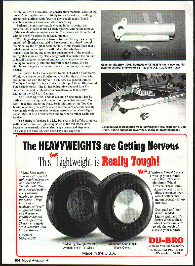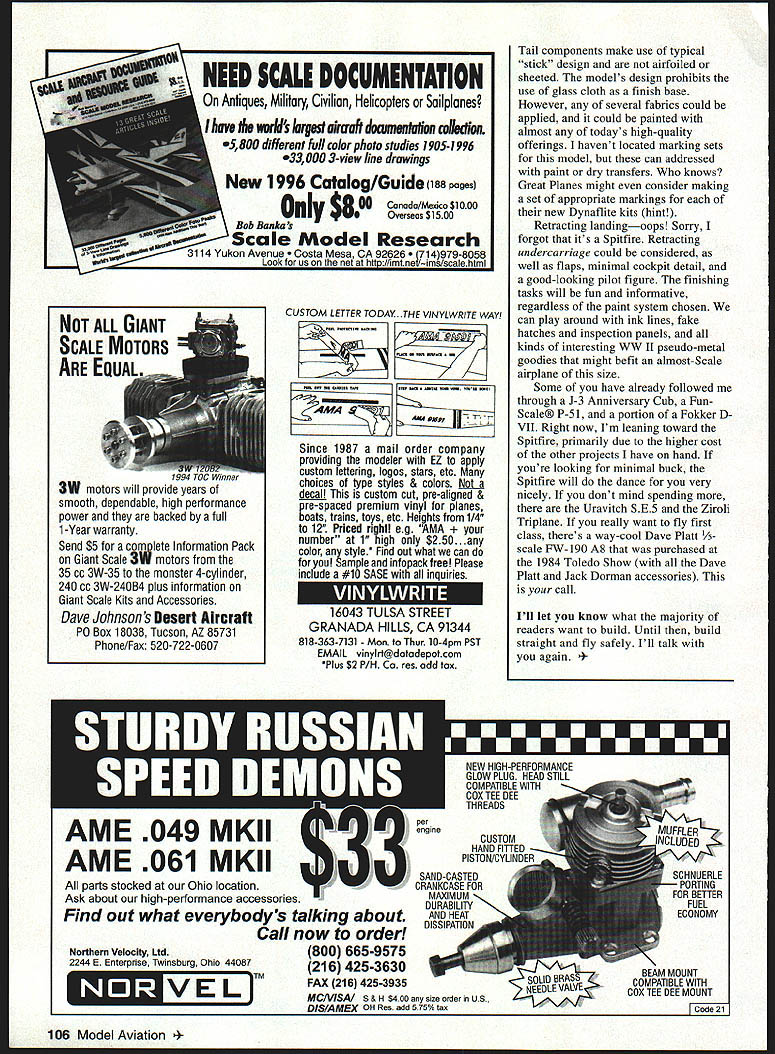 RADIO CONTROL SCALE TOLEDO Toledo incredibly good time always Weak Signals hosted first-class show drew hundreds industry exhibitors hundreds worlds finest models thousands upon thousands dedicated aircraft modelers Weak Signals Toledo show often referred Modelers Mecca simply because thats what Sunday created opportunity leave exhibition booth photograph Scale-related items thought d enjoy seeing exceptionally large number exciting products Photo captions enough tease-factor whet appetites youll find addresses various manufacturers using Advertisers Index near back magazine Enjoy show Docu-Search Second-guessing modelers aviation buffs never good idea Just think someones aircraft description put-on turns out real thing Likewise some can describe fictitious aircraft such eloquence most-knowledgeable aviation historians would know theres bit too much gas bag Being neither full-scale aviation professional nor aviation historian Im content let determine validity request own its real please help gentleman isnt perhaps youll get chuckle out someone having Either way Phillip Epstein claims need set plans Vultee-Stinson LlA high-wing war plane specific scale power range know aircraft please contact Phillip 101 Wetherburn Lane Williamsburg VA 23188 Im guessing ones probably real Charles L Holderried fascinated Polish PZL 104 Wilga would like construct A-scale model airplane Charles writes have seen pictures different magazines several models Wilga have built information builders available Also believe couple kits fiberglass fuselages around EuropeIm balsa-and-plywood man What think Could Wilga builders lend Charles hand great-looking airplane pleasant diversion usual high-wing cabin-type model have anything contribute contact Mr Holderried 1801 Brookwood Drive Bensalem PA 19020 Build-Along That lovely 81-inch Dynaflite Spitfire kit received Mark Smith has sitting kit pile over year calls constantly might timely model deal since Dynaflite Models news right now has recently subject modelers conversations Dynaflite purchased Great Planes few months ago have questions about whether models would changed Rest easy friends Great Planes will make few improvements superb kits will go pricey Basically will retain practical original designs little variance So whats store Dynaflite line Great Planes has always strong construction-manual department planning improve original Dynaflite September1996 103 Henry Haffkes Gee Bees available Spirit Yesteryear Model Aircraft Co40 Holgate St Barrie Ontario L4N 217 Canada Dave Plafts 1A-scale Fairey Gannet 81-inch 18-pound model powered 0S 108 guided Ace MicroPro 8 Great Planes modified Texan Hollywood Zero Disguised full-scale Texans stand Zeros WW II movies Vailly Aviation 18 Oakdale Ave Farmingville NY 11738 has plans L-1910-1 Bird Dog A- /4-scale versions instructions detailed construction manuals Most models cutting dies also likely cleaned up resulting crisper part outlines fewer rough edges Wood selection likely improve necessary Perhaps noticeable change basic design construction least 81-inch Spitfire will removal wooden-beam engine mounts beams will replaced GPs glass-filled radial mounts large-displacement two- four-stroke engines large amount vibration said have transmitted through model original beam mounts Great Planes feels radial mount Spitfire will reduce vibrationtransmission factor allow business end model go together easily change will also enable builder install greater variety engines airplane having drastically alter firewall beams Its far simpler change radial mounts modify maple beams Spitfire looks like winner what think Would like Spitfire together unfamiliar Dynaflite kit heres general outline Dynaflite Spitfire 81-inch scale-up 40-powered Fun Scale model kit has balsa plywood Lite Ply construction intended two-stroke four-stroke engines 108 16 range 81-inch Spitfire accurate Scale model its outline convincing wont take years construct wont take Nats Scale Masters Top Gun Invitational will have excellent airplane will fly very gently better-than-average aerobatic slow-flight capabilities also breaks down transports rather easily its size Spitfires fuselage Lite Ply slab-sided affair complete now-familiar lightening holes tail have become earmark similarly constructed airplanes wings built-up open bays capstrips HEAVYWEIGHTS Getting Nervous Lightweight Realig Tough Aluminum Wheel Covers Dress up aircraft DU-BROs new aluminum Wheel Covers semidomed wheel covers allow clearance over wheel collars mount securely just nunutes have testing new 6 treaded lightweight wheels new 45# P47 Thunderbolt have reacted well landing helping absorb stress has no tendency peel ground loops have greatly enhanced retract operation new wheels Godsend have Winner DBernier Mebane NC 104 Model Aviation gned fit 4-6 Treaded Lightweight TV Series Wheels wheel covers sure add touch class aircraft BRO Name Can Count 480 Bonner Rd P0 Box 815 Wauconda IL 60084 Slimline MfgBox 3295 Scottsdale AZ 85257 has new muffler smoke VS 120 OS 120 four-strokes Bellanca Super Decathlon Farmington Hills Michigans Don Brann Fabric paint cover Quadra 35-powered model Available 4 6 Sizes Made USA NEED SCALE DOCUMENTATION Antiques Militar Civilian Helicopters Sailplanes ihe wL1 Aujest *aft ihcumentoiion celledion 5800 different full color photo studies 1905-1996 33000 3-view line drawings New 1996 Catalog/Guide 188 pages Canada/Mexico $1000 Bob Only $8 Overseas $1500 \ Bunkos ~ScaIe Model Research 31 14 Yukon Avenue a Mesa CA 92626 79-8O58 Look o htfr o ooJnIo koI SW motors will provio years smooth dependable high performance power backed full 1-Year warranty Send $5 corjip lete Information Pack Giant Scale 3Wmotorsfrom 35 cc 3W-35 monster 4-cylinder 240 cc 3W-240B4 plus information Giant Scale Kits Accessories Dave JohnsoWs Bsssrt Aircraft P0 Box 18038 Tucson AZ 85731 Phone/Fax 520-722-0607 CUSTOM LETTER TODAY THE VINYLWRITE WAY Since 1987 mail order company providing modeler EZ p ply cust