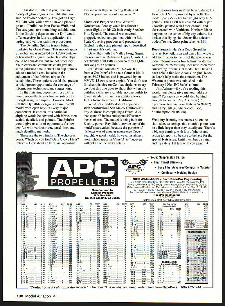 RADIO CONTROL SCALE TOMORROW MORNING Ill packing Indianapolis Indiana visit good people ISC International ISC International familiar name us primarily North American distributor Zenoah Engines GMS Gemtec Machinery Systems Model Engines China great ISC ARC/ARF scale J-3 Cub Following day ISC Ill drive Muncie RC Scale portion National Aeromodeling Championships first look AMAs new Indiana home Everything grapevine says new location marked improvement over Reston Virginia facility honestly cant wait see Im taking along lot film can share experience AMA Nats always good time first experience National Championships RC Soaring contestant Chicopee Massachusetts 1983 Later attended 1985 event Chicopee 1986 Lake Charles Louisiana event Nats Soaring events director also got see few years Nats operation 1987 through 1989 employed AMAs Public Relations department Geoff Styles Judy DiLoretta Careful planning lots sweat goes putting National Aeromodeling Championships together year contest always worth price ticket some Nats contest tough contest its also great annual celebration aeromodeling sport banquets meetings practice sessions awards ceremonies tall stories short stories exchanges character sportsmanship facet model aviation Year after year AMA National Aeromodeling Championships continues exciting stimulating enjoyable modeling event world Model Aviations December issue will feature Nats coverage event Ill bring RC Scale report action Muncie Build-Along Project months column being written early July question airplane select next build-along project posed July issue choices next project /s-scale Dave Platt Focke-Wulf 190 A-8 serious stufD 33% Bleriot XI-2 serious very limited interest Nick Ziroli Fokker DrI Triplane Dynaflite /5-scale Fun Scale Spitfire letters have just started arrive its real pleasure read responses model-selection dilemma Unfortunately no clear-cut leader yet well have wait letters decide matter Blenot Focke-Wuif bit behind DrI Spitfire expected competition-level projects bit intense rather costly side something casual informal build-along exercises Apparently its going race between Spitfire Fokker write try limit comments two aircraft Some wrote suggest alternative aircraft very much appreciated believe However lets Spitfires Triplanes see way coin falls Either model would offer lot opportunities us exchange scale-modeling suggestions techniques pursuit basic documentation through various stages construction covering finishing process finally first flight really should considered last piece model build-alongs would fun informative Zirolis Triplane /4-scale model its excessively large model spans approximately 63 inches could easily powered something 20- 25-cid range dont have much experience gasoline engines Ive got old Kioritz 24 shelf Maybe would fun use gas go through gasoline learning curve together Doing would certainly make interesting exchanges suggestions techniques November1996 99 Dave Wests Pills Special product good building skills meticulous finishing techniques Scale Stits Covering Gus Morfis Macchi M202 Sacramento Californias Jeff Weiss two-stroke MVVS 15-powered model spans 3475 inches Ray Atkinsons stick tissue Fairchild 24 being constructed Electric power model spans 56 inches Hows paint scheme Bill Power has having great time 75-inch-span Uravitch Fokker DVII gas doesnt interest plenty glow engines available would suit Fokker perfectly Ive got Enya VT-240 twin wont have place go until build Platt Focke-Wulf Im sure have something suitable too finishing department DrI would offer exercises fabric application rib taping various painting procedures Dynaflite Spiffire now being marketed Great Planes models spans 81 inches intended 120 two-stroke four-stroke engines Retracts and/or flaps could considered necessary letters comments could give some guidance Retract flap options add models cost also enjoyment finished airplanes capabilities options would also present us greater opportunity exchange information techniques suggestions finishing department Spitfire would normally definitive subject fiberglassing techniques However Mark Smiths Dynaflite design Fun Scale model open bays major component chosen particular airplane would covered fabric sealed detailed painted Spitfire would give us lot opportunity lowkey fun various rivet panel-line hatch detailing methods two finalists choice yours Which like Gas Glow Flaps Retracts about fiberglass open-bay triplane flaps retracting floats Electric powervia sailplane winch Modelers Projects Dave West Norristown Pennsylvania has almost dozen flights 80-inch Andy Sheeber Pitts Special model covered prepped sealed painted Stits Scale Covering products procedures including scale pinked tape described last months column Dave flies Valley Forge Signal Seekers Delaware Gypsy Giants beautifully built Pitts powered Q-82 weighs 32 pounds Jeff Weiss Macchi M202 built Gus Morfis 2-scale Combat kit spans 3475 inches powered MVVS 15 two-stroke engine dont see finishes nice Combat airplanes day goes show building skills available no builds lower standards ability allows Jeff Sacramento California What Scale builder doesnt appreciate stick construction San Mateo Californias Ray Atkinson completing Fairchild 24 spans 56 inches sports 450 square inches area model being built Electric power Ray didnt provide models particulars because purpose letter another nature see Docu Search good model however always worth photo space Model Aviation gritty details Bill Power lives Priest River Idaho Uravitch DVII powered G-38 model spans 75 inches weighs 165 pounds DVII covered Super Coverite painted Latex enamel clear-coated Varithane Northern Idaho may center big-city culture look flying site Seems like decent tradeoff Great paint scheme Bill Docu-Search Heres Docu-Search reverse Ray Atkinson Larry Hill wrote add names list want information Jim Adams Waterman Aerobile Numerous inquiries have made concerning unusual model havent able find Mr Adams o