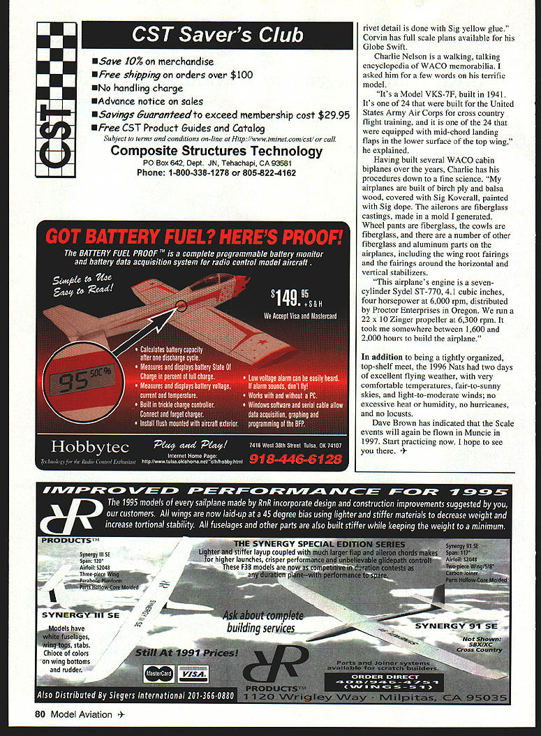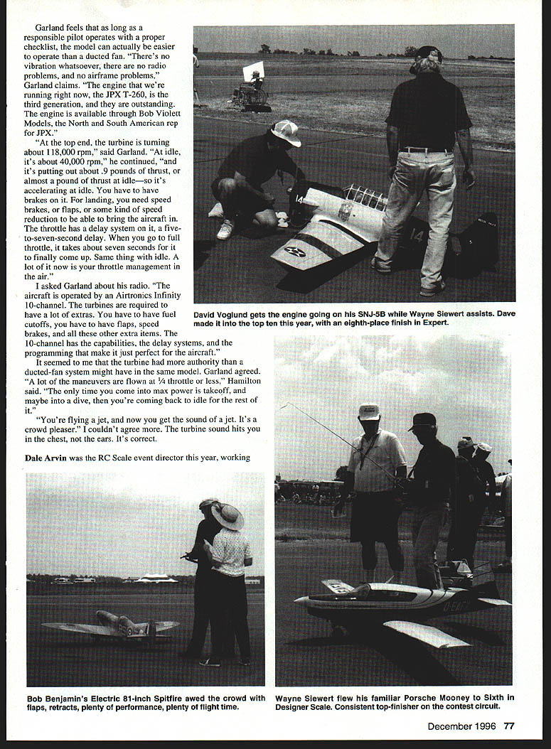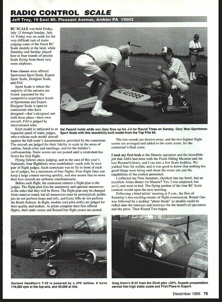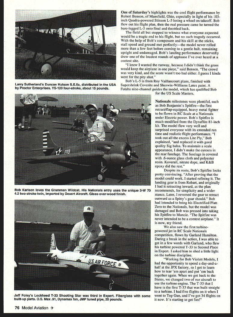 RADIO CONTROL SCALE El r mu Jvin L U I-i U C SCALE held Friday July 12 through Sunday July 14 Friday set aside very difficult task staticjudging some finest RC Scale models land Saturday Sunday played host four rounds precise Scale flying very same airplanes Four classes offered Sportsman Sport Scale Expert Sport Scale Designer Scale FAI Sport Scale majority entrants found separated competitive experience levels Sportsman Expert Designer Scale open contestants have designedthats designed built planstheir own aircraft FAI judged international rules model subjected impartial panel static judges evaluate model aircraft against full-scales documentation provided contestant aircraft judged fidelity scale areas outline finish color markings builders craftsmanship Static scores posted until contestant has flown first flight Flying follows static judging case years Nationals four flightlines establishedeach its own pair flight judges contestant fly front set judges maximum four flights Four flight lines can keep large contest moving quickly also assure no four aircraft airborne simultaneously Before flight contestant submits flight plan judges flight plan lists mandatory optional maneuvers order will flown flight plan may changed round round maneuvers must prototypical jumbo jets perform loops rolls Extra 300s perform Bomb Release flight models pilot skills judged quality realism As pilots complete first official flights static scores Round flight scores posted low rounds thrown away two highest flight scores averaged added static score contestants final score took first look Muncie operation incredible job AMA done Frank Ehling Museum Lee Renaud Library ran few Scale buddies yakked Nats awhile good know nothing good things being said about event site capabilities contest personnel collected Nats literature checked hotel excellent Asian dinner Muncie Yes surprised yes went bed flying portion four RC Scale contests would open next morning Following brief pilots meeting 9 am first Saturdays two exciting rounds flight commenced Round followed midday photo break models could rolled onto runways taxiways benefit spectators press Round Two began December 1996 75 Hal Parenti holds son Gary fires up J-3 Round Three Sunday Gary Won Sportsman Sport Scale beautifully built model Top Flite kit Garland Hamiltons T-33 powered JPX turbine turns 118000 rpm top end 40000 idle Greg Hahns 5-25 Ziroli plan 20% Superb presentation earned him high static score First Place Expert Saturdays highlights cool flight performance Robert Benson Mansfield Ohio especially light 103inch Quadra-powered Stinson L-5 losing wheel takeoff Bob flew out flight plan real pressure came turned bare-legged L-5 onto final throttled back field stopped witness what everyone expected would tragic end flight no such tragedy occurred help Bobs composure skill sticks stall speed ground met perfectlythe model never rolled few feet before coming gentle halt remaining upright undamaged Bobs landing performance deservedly drew loudest rounds applause Ive ever heard contest site knew wanted runway because didnt think grass would keep airplane piece said Benson crowd very kind score wasnt too bad either guess kinda went pity shot Bobs L-5 Roy Vaillancourt plans finished Supershrink Coverite Sherwin-Williams Latex paint Futaba nine-channel guides model has qualified Bob US Scale Masters Nationals milestones plentiful such Bob Benjamins Spitfirethe first retract/flap-equipped heavy metal fighter flown RC Scale Nationals under Electric power Bobs Spitfire much-modified Dynaflite 81-inch kit model flew very well surprised everyone its extended run time realistic flight performance took out excess Lite Ply Bob explained replaced good quality Sig balsa maintain scale appearance didnt make cutouts rear fuselage fuselage covered 6-ounce glass cloth polyester resin Koverall nitrate dope K&B epoxy did rest Despite its roots Bobs Spitfire looks pretty convincing After proving model could work started refining landing gear Robart originally retracting inward plan recommends simplicity wider stance Later reversed gear retract outward Spittys gear should Bob intended bring Electrified Platt Zero Nationals model damaged Bob pressed taking Spitfire Muncie Spitfire never intended contest airplane now friend also saw first turbinepowered jet RC Scale Nationals competition flown Garland Hamilton During break action able get few words Garland flew turbine powered T-33 Second Place Expert asked him shed little light turbine discipline Working Bob Violett Models opportunity spend day-and-ahalf JPX factory got learn tear em apart put em back together again got back States changed two aircraft use turbine engine T-33 have first T-33 built straight turbine five flights went Top Gun Ive got 34 flights now Its starting get fun 76 Model Aviation y Sutherlands Duncan Hutson SE5a distributed USA Proctor Enterprises VS-i 20 four-stroke about 15 pounds Bob Karison loves Grumman Wildcat Nationals entry uses unique 3-W 70 42 two-stroke twin imported Desert Aircraft Glass-over-wood finish Jeff Foleys Lockheed T-33 Shooting Star third Expert Fiberglass some built-up parts 08 Max 91 Dynamax fan JMP tuned pipe 20 pounds Garland feels long responsible pilot operates proper checklist model can actually easier operate ducted fan Theres no vibration whatsoever no radio problems no airframe problems Garland claims engine running right now JPX T-260 third generation outstanding engine available through Bob Violett Models North South American rep JPX top end turbine turning about 118000 rpm said Garland idle its about 40000 rpm continued its putting out about 9 pounds thrust almost pound thrust idleso its accelerating idle have have brakes landing need speed brakes flaps some kind speed reduction able bring aircraft throttle has delay system fiveto-seven-second delay go full throttle takes about seven seconds finally come up Same thing idle lot now throttle management air asked Garland about rad