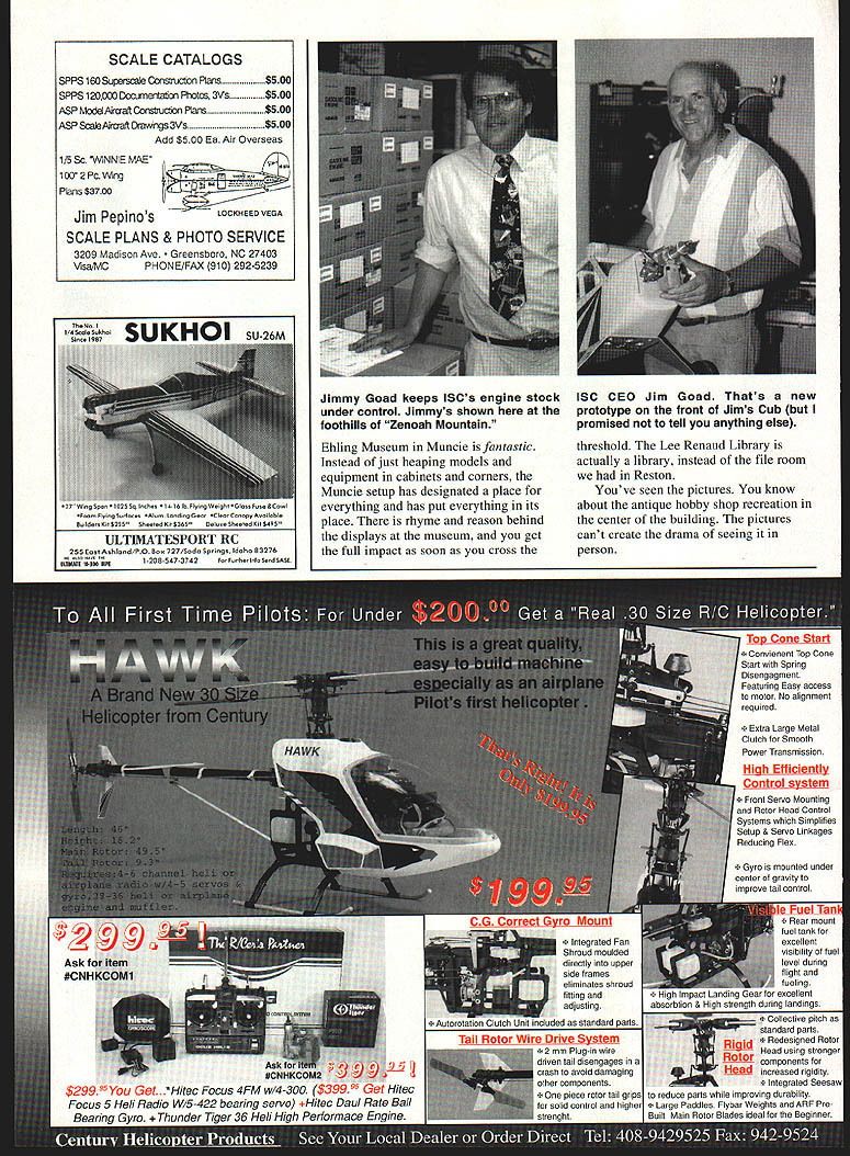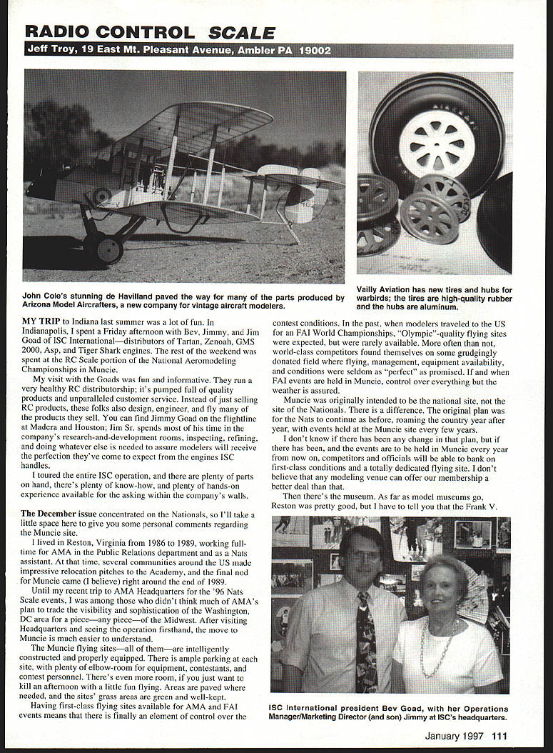 RADIO CONTROL SCALE MY TRIP Indiana last summer lot fun Indianapolis spent Friday afternoon Bev Jimmy Jim Goad ISC Internationaldistributors Tartan Zenoah GMS 2000 Asp Tiger Shark engines rest weekend spent RC Scale portion National Aeromodeling Championships Muncie visit Goads fun informative run very healthy RC distributorship its pumped full quality products unparalleled customer service Instead ofjust selling RC products folks also design engineer fly products sell can find Jimmy Goad flightline Madera Houston Jim Sr spends time companys research-and-development rooms inspecting refining doing whatever else needed assure modelers will receive perfection theyve come expect engines ISC handles toured entire ISC operation plenty parts hand theres plenty know-how plenty hands-on experience available asking within companys walls December issue concentrated Nationals Ill take little space give some personal comments regarding Muncie site lived Reston Virginia 1986 1989 working fulltime AMA Public Relations department Nats assistant time several communities around US made impressive relocation pitches Academy final nod Muncie came believe right around end 1989 Until recent trip AMA Headquarters 96 Nats Scale events among didnt think much AMAs plan trade visibility sophistication Washington DC area pieceany pieceof Midwest After visiting Headquarters seeing operation firsthand move Muncie much easier understand Muncie flying sitesall themare intelligently constructed properly equipped ample parking site plenty elbow-room equipment contestants contest personnel Theres room just want kill afternoon little fun flying Areas paved needed sites grass areas green well-kept Having first-class flying sites available AMA FAI events means finally element control over contest conditions past modelers traveled US FAI World Championships Olympic-quality flying sites expected rarely available often world-class competitors found themselves some grudgingly donated field flying management equipment availability conditions seldom perfect promised FAI events held Muncie control over everything weather assured Muncie originally intended national site site Nationals difference original plan Nats continue before roaming country year after year events held Muncie site few years dont know has change plan has events held Muncie year now competitors officials will able bank first-class conditions totally dedicated flying site dont believe modeling venue can otter membership better deal theres museum As far model museums go Reston pretty good have tell Frank V January1997 111 Vailly Aviation has new tires hubs John Coles stunning de Havilland paved way parts produced bywarbirds tires high-quality rubber Arizona Model Aircrafters new company vintage aircraft modelersand hubs aluminum SC International president Bev Goad Operations Manager/Marketing Director son Jimmy ISCs headquarters Ehling Museum Muncie fantastic Instead just heaping models equipment cabinets corners Muncie setup has designated place everything has put everything its place rhyme reason behind displays museum get full impact soon cross threshold Lee Renaud Library actually library instead file room Reston Youve seen pictures know about antique hobby shop recreation center building pictures cant create drama seeing person U uonvlenanT lop uone Start Spring Disengagment Featuring Easy access motor No alignment required Extra Large Metal Clutch tor Smooth Power Transmission High Efficiently Control system Front Servo Mounting nd Rotor Head Control Systems Simplifies Setup & Servo Linkages Reducing Flay Get. *Hitec FOCUS 4FM w/4Rdinbearing servo} t-nrec Daul f-fate Ddf i Ui-h Prfnrmrar gnfln MounT C Integrated Fan Shroud moulded directly upper side frames eliminates shroud titting adjusting UIvm LdiI ulvollydyas crash avoid damaging other components piece rotor tail gript solid control highe Gyro mounted under center gravity improve tail control Fuel Tan Rear mount teal tank escellent visibility tuel level during flight tueling -tign Impact L55OI9 uear oor excellent absorbtion & High strength during landings arts C Collective pitch standard parts Redesigned Rotor 7id Rotor Head using stronger ______ components Head increased rigidity Integrated Seesaw reduce parts improving durability Large Paddles Flybar Weights ARP Pre P ut kAoin P,t, PIoloo idoI An tho Pvninnu SCALE CATALOGS SPPS 160 Supetmle Casbjdn Plans$500 SPPS 120000 Doajmenta Pftm 3Vs$500 ASP ModaLJrat Comfrum Plans$500 ASP SeAkaat Drawings 3Vs$500 Add $500 Ea Air Overseas 1/5 Sc WINNIE MAE 100 2 Pc Wing Plans $3700 LOCKHEED VEGA Jim Pepinos SCALE PLANS & PHOTO SERVICE 3209 Madison Ave Greensboro NC 27403 VisalMCPHONE/FAX 910 2925239 Jimmy Goad keeps ISCs engine stock SC CEO Jim Goad Thats new under control Jimmys shown prototype front Jims Cub foothills Zenoah Mountain promised tell anything else Foon FIyingSodoce AIooLondingOeo cIeoconopvAoiIobIe BjIdo K S255 Sheeted Ki S36SSaloec Suected $095 ULTIMATESPORT RC 255 Eact AelsIend/PO Boo 727/Soda SprinTs Idaho 83276 l-2e85473742FoF,UheI,ISe,dSASE ULTIMATE 10300 SItE Ask #CNI