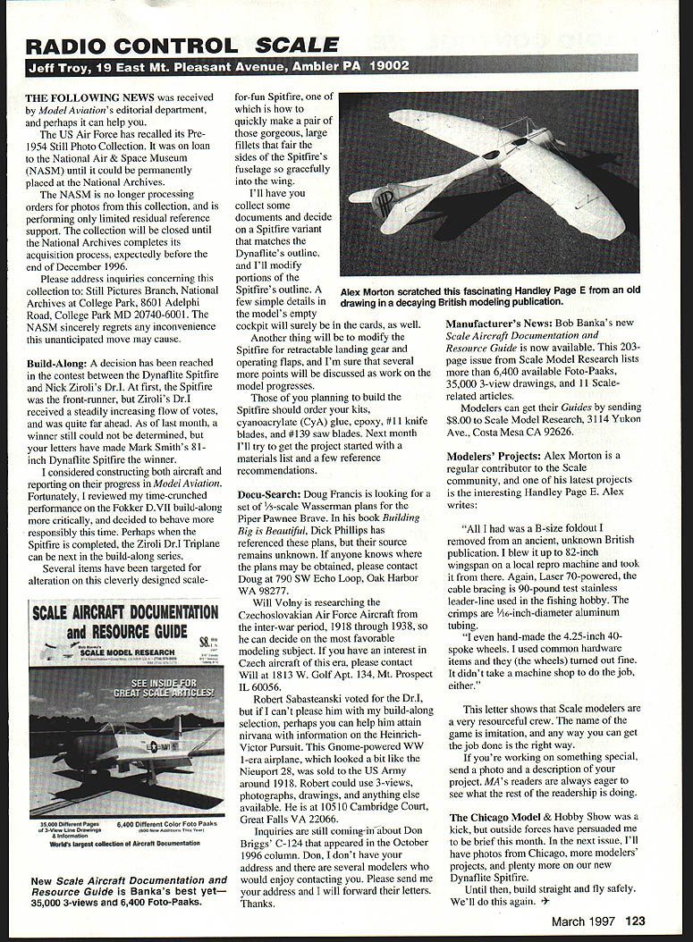 RADIO CONTROL SCALE THE FOLLOWING NEWS received Model Aviations editorial department perhaps can help US Air Force has recalled its Pre 1954 Still Photo Collection loan National Air & Space Museum NASM until could permanently placed National Archives NASM no longer processing orders photos collection performing limited residual reference support collection will closed until National Archives completes its acquisition process expectedly before end December 1996 Please address inquiries concerning collection Still Pictures Branch National Archives College Park 8601 Adelphi Road College Park MD 20740-6001 NASM sincerely regrets inconvenience unanticipated move may cause Build-Along decision has reached contest between Dynaflite Spitfire Nick Zirolis DrI first Spitfire front-runner Zirolis DrI received steadily increasing flow votes quite far ahead As last month winner still could determined letters have made Mark Smiths 81inch Dynaflite Spitfire winner considered constructing both aircraft reporting progress Model Aviation Fortunately reviewed time-crunched performance Fokker DVII build-along critically decided behave responsibly time Perhaps Spitfire completed Ziroli DrI Triplane can next build-along series Several items have targeted alteration cleverly designed scaleNew Scale Aircraft Documentation Resource Guide Bankas best yet 35000 3-views 6400 Foto-Paaks for-fun Spitfire quickly make pair gorgeous large fillets fair sides Spitfires fuselage gracefully wing Ill have collect some documents decide Spitfire variant matches Dynaflite s outline Ill modify portions Spitfires outline few simple details models empty cockpit will surely cards well Another thing will modify Spitfire retractable landing gear operating flaps Im sure several points will discussed work model progresses planning build Spitfire should order kits cyanoacrylate CyA glue epoxy #11 knife blades #139 saw blades Next month Ill try get project started materials list few reference recommendations Docu-Search Doug Francis looking set /5-scale Wasserman plans Piper Pawnee Brave book Building Big Beautiful Dick Phillips has referenced plans source remains unknown anyone knows plans may obtained please contact Doug 790 SW Echo Loop Oak Harbor WA 98277 Will Volny researching Czechoslovakian Air Force Aircraft inter-war period 1918 through 1938 50 can decide favorable modeling subject have interest Czech aircraft era please contact Will 1813 W Golf Apt 134 Mt Prospect IL 60056 Robert Sabasteanski voted DrI hut cant please him build-along selection perhaps can help him attain nirvana information Heinrich Victor Pursuit Gnome-powered WW 1-era airplane looked bit like Nieuport 28 sold US Army around 1918 Robert could use 3-views photographs drawings anything else available 10510 Cambridge Court Great Falls VA 22066 Inquiries still coming4nibout Don Briggs C-124 appeared October 1996 column Don dont have address several modelers would enjoy contacting Please send address will forward letters Thanks Manufacturers News Bob Banka s new Scale Aircraft Documentation Resource Guide now available 203page issue Scale Model Research lists 6400 available Foto-Paaks 35000 3-view drawings 11 Scalerelated articles Modelers can get Guides sending $800 Scale Model Research 3114 Yukon Ave Costa Mesa CA 92626 Modelers Projects Alex Morton regular contributor Scale community latest projects interesting Handley Page E Alex writes B-size foldout removed ancient unknown British publication blew up 82-inch wingspan local repro machine took Again Laser 70-powered cable bracing 90-pound test stainless leader-line used fishing hobby crimps /16-inch-diameter aluminum tubing hand-made 425-inch 40spoke wheels used common hardware items wheels turned out fine didnt take machine shop job either letter shows Scale modelers very resourceful crew name game imitation way can get job done right way youre working something special send photo description project MAs readers always eager see what rest readership doing Chicago Model & Hobby Show kick outside forces have persuaded brief month next issue Ill have photos Chicago modelers projects plenty new Dynaflite Spitfire Until build straight fly safely Well again h 1997 123 Alex Morton scratched fascinating Handley Page E old drawing decaying British modeling publication ScALEDOCUMENTATION 400 Olfferni Ceio iotO ts gui colsctioi f Aiwiali DsammW