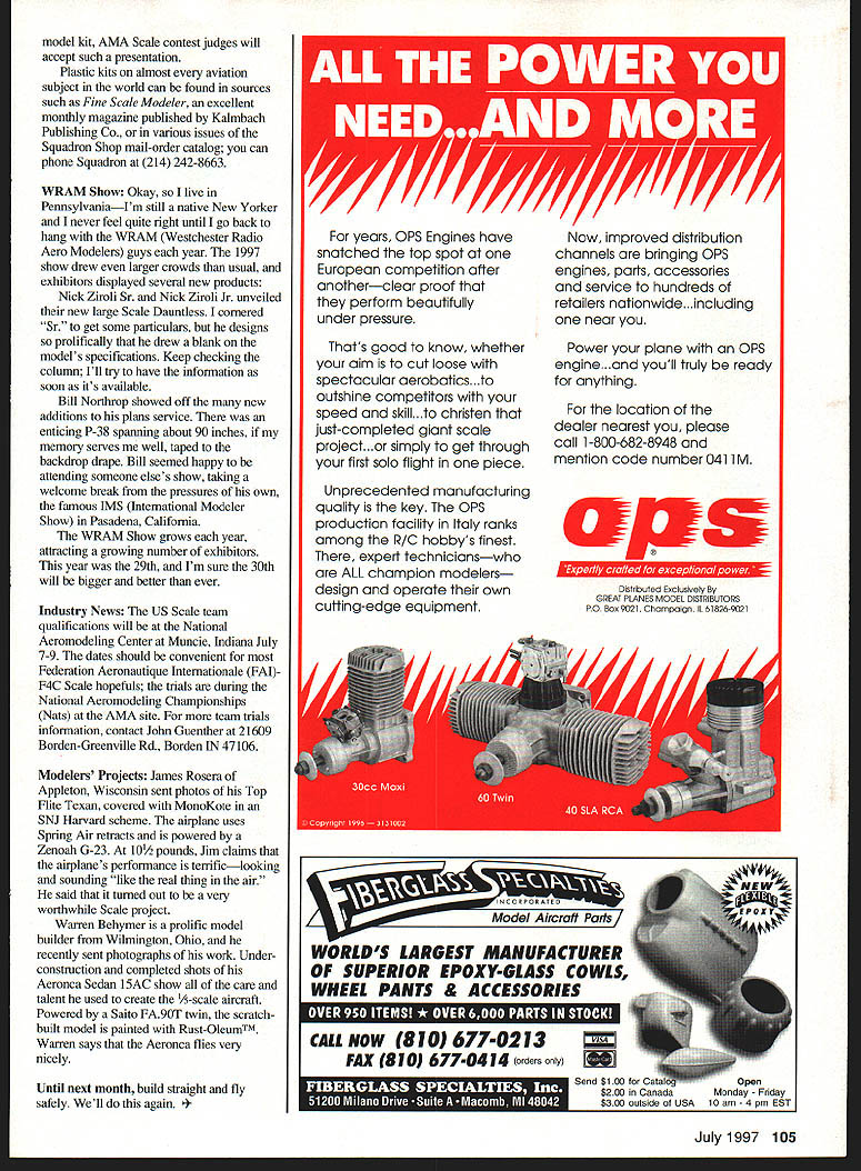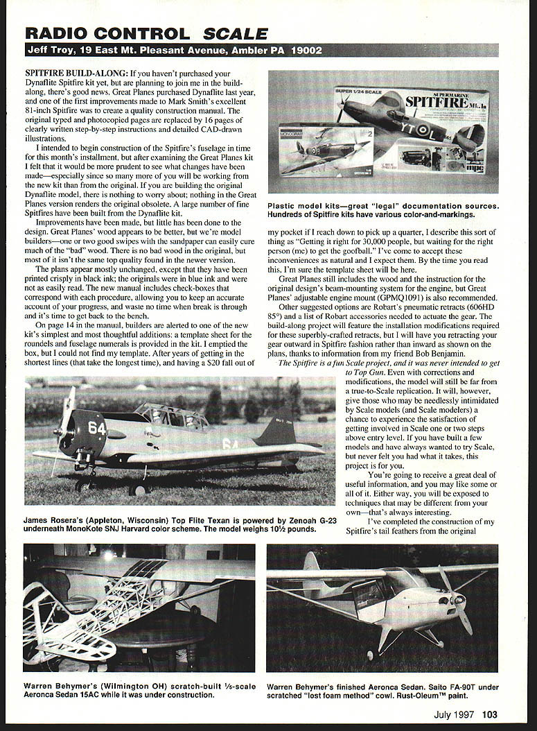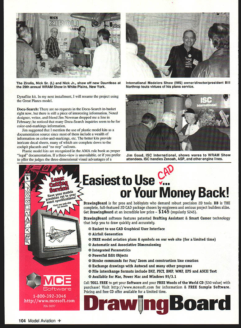RADIO CONTROL SCALE SPITFIRE BUILD-ALONG havent purchased Dynaflite Spitfire kit yet planning join buildalong theres good news Great Planes purchased Dynaflite last year first improvements made Mark Smiths excellent 81-inch Spitfire create quality construction manual original typed photocopied pages replaced 16 pages clearly written step-by-step instructions detailed CAD-drawn illustrations intended begin construction Spitfires fuselage time months installment after examining Great Planes kit felt would prudent see what changes have madeespecially since will working new kit original building original Dynaflite model nothing worry about nothing Great Planes version renders original obsolete large number fine Spitfires have built Dynaflite kit Improvements have made little has done design Great Planes wood appears better model buildersone two good swipes sandpaper can easily cure much bad wood no bad wood original isnt same top quality found newer version plans appear mostly unchanged except have printed crisply black ink originals blue ink easily read new manual includes check-boxes correspond procedure allowing keep accurate account progress waste no time break through its time get back bench page 14 manual builders alerted new kits simplest thoughtful additions template sheet roundels fuselage numerals provided kit emptied box could find template After years getting shortest lines take longest time having $20 fall out pocket reach down pick up quarter describe sort thing Getting right 30000 people waiting right person get goofball Ive come accept inconveniences natural expect time read Im sure template sheet will Great Planes still includes wood instruction original designs beam-mounting system engine Great Planes adjustable engine mount GPMQl09l also recommended Other suggested options Robarts pneumatic retracts 606HD 850 list Robart accessories needed actuate gear build-along project will feature installation modifications required superbly-crafted retracts will have retracting gear outward Spitfire fashion rather inward shown plans thanks information friend Bob Benjamin Spiifire afun Scale project never intended get Top Gun corrections modifications model will still far true-to-Scale replication will however give may needlessly intimidated Scale models Scale modelers chance experience satisfaction getting involved Scale two steps above entry level have built few models have always wanted try Scale never felt what takes project Youre going receive great deal useful information may like some Either way will exposed techniques may different ownthats always interesting Ive completed construction Spitfires tail feathers original July1997 103 Plastic model kitsgreat legal documentation sources Hundreds Spitfire kits have various color-and-markings James Roseras Appleton Wisconsin Top Flite Texan powered Zenoah G-23 underneath MonoKote SNJ Harvard color scheme model weighs 10 pounds Warren Behymers Wilmington OH scratch-built /5-scale Warren Behymers finished Aeronca Sedan Saito FA-gOT under Aeronca Sedan 15AC under construction scratched lost foam method cowl RustOleumTM paint Dynaflite kit next installment will resume project using Great Planes model Docu-Search no requests Docu-Search in-basket right now still piece interesting information Noted designer writer friend Jim Newman dropped line February noticed Docu-Search inquiries seem color-and-markings information Jim suggested mention use plastic model kits documentation source since include wealth information color-and-markings etc better kits provide intricate decal sheets complete down cockpit placards no step callouts Plastic model kits recognized AMA rule book proper legal documentation three-view unavailable prefer offer judges three-dimensional visual advantages C9 Easiest Use Money Back predsiociilcatio1l viJ~ DrawingBoard pros hobbyists demand robust precision 2D tools DB THE complete full-featured 2D CAD package chosen engineers serious project builders alike Get DrawingBoard incredible low price regularly $245 DrawingBoard software features patented Drafting Assistant & Smart Cursor technology help draw quickly accurately Easiest use CAD Graphical User Interface Airfoil Generation FREE model aviation plans & symbols web site limited time Automatic Associative Dimensioning Integrated Parametrics Powerful Edit Objects Stroke commands Pan Zoom construction Une creation Exchange drawings Autocad other programs File interchange formats include DXF PICT BMP WMF EPS ASCII Text Available Mac Power Mac Windows 95/31 Call TOLL FREE get Software FREE Woods World CD $30 value purchase Visit http//wwwmcesoftcom information & FREE Sample Software Pricing free CD offer available limited time Draw ng Board 104 Model Aviation 4The Zirolis Nick Sr 1 Nick Jr show off new Dauntless 29th annual WRAM Show White Plains New York International Modelers Show IMS owner/director/president Bill Northrop touts virtues plans service Jim Goad ISO International shows wares WRAM Show attendees ISC handles Zenoah ASP other engine lines model kit AMA Scale contest judges will accept such presentation Plastic kits almost aviation subject world can found sources such Fine Scale Modeler excellent monthly magazine published Kalmbach Publishing Co various issues Squadron Shop mail-order catalog can phone Squadron 214 242-8663 WRAM Show Okay live PennsylvaniaIm still native New Yorker never feel quite right until go back hang WRAM Westchester Radio Aero Modelers guys year 1997 show drew larger crowds usual exhibitors displayed several new products Nick Ziroli Sr Nick Ziroli Jr unveiled new large Scale Dauntless cornered Sr get some particulars designs prolifically drew blank models specifications Keep checking column Ill try have information soon its available Bill Northrop showed off new additions plans service enticing P-38 spanning about 90 inches memory serves well taped backdrop drape Bill seemed happy attending someone elses show taking welcome break pressures