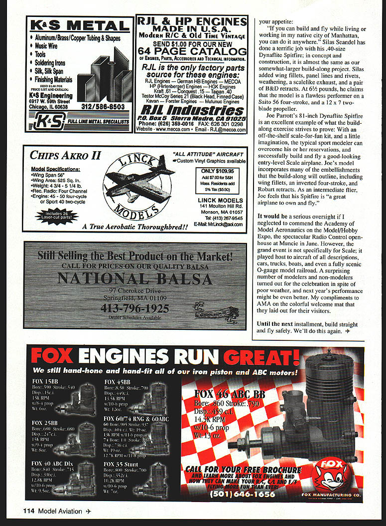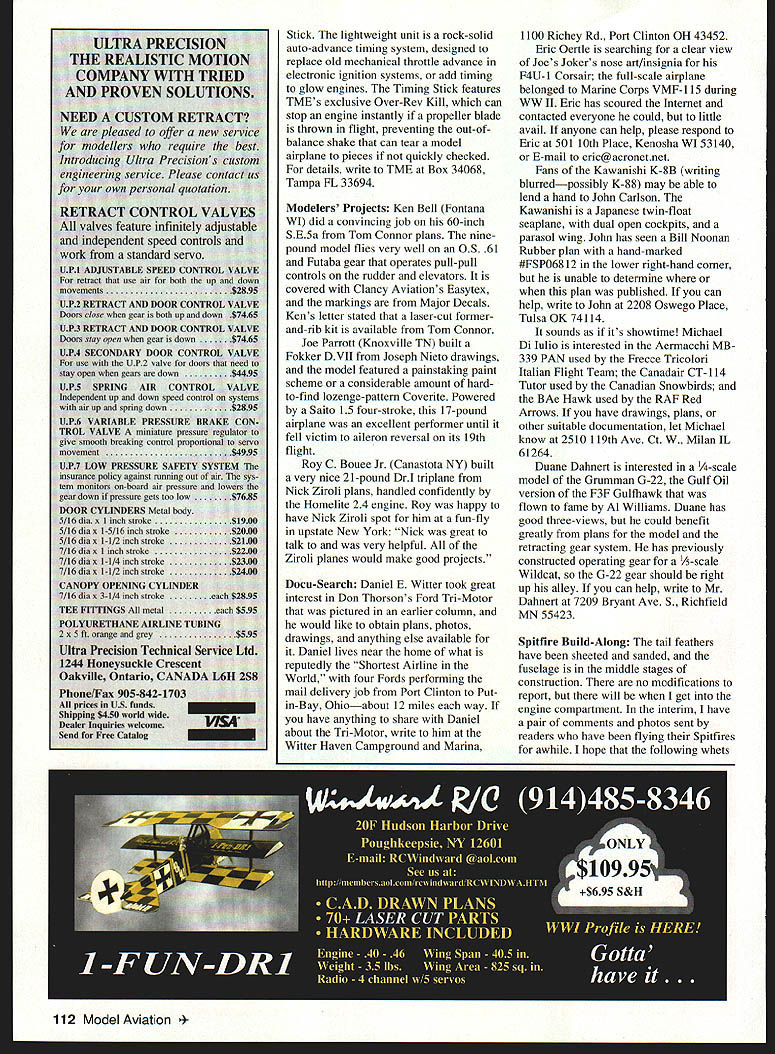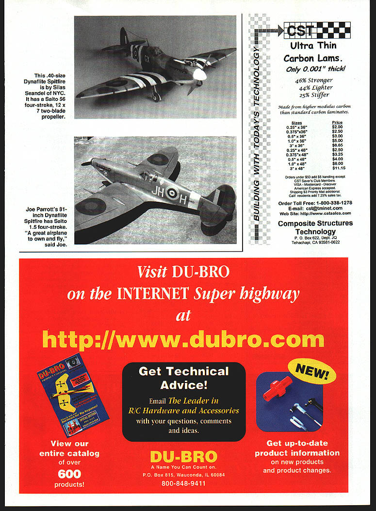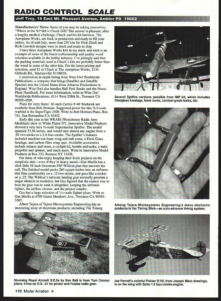 RADIO CONTROL SCALE rrim Manufacturers News Some may asking yourselves %*&# Chuck Gill answer pleasant after lengthy medical challenge Chuck kit business Aeroplane Works back production ready fill orders As mid-July 250 kits Nick Ziroli Rich Uravitch designs stock ready ship have three Aeroplane Works kits stash example some finest craftsmanship quality wood selection available hobby industry Ive jokingly said packing materials used Chucks kits probably better wood some other kits latest pricing selection send $1 Chuck Aeroplane Works 2134 Gilbride Rd Martinsville NJ 08836 received in-depth listing Wise Owl Worldwide Publications company brings Datafiles Datafile Specials United States Albatros Productions England Wise Owl also handles Hall Park Books Nexus Plans Handbook information write Wise Owl Worldwide Publications 4314 West 238th St Torrance CA 90505-4509 Plans Jerry Bates 82-inch Curtiss P-40 Warhawk available Bob Holman Suggested power A5-scale warbird SuperTigre 2500 Write Bob Holman Plans Box 741 San Bernardino CA 92402 Early year WRAM Westchester Radio Aero Modelers show White Plains NY Innovative Model Products showed very nice /6-scale Supermarine Spitfire model spanned 7356 inches would take almost engine 90 two-stroke 24 four-stroke Spitfires features included machine-cut foam wing stab cores Flexi-Glass fuselage carbon-fiber wing spar Available accessories include retracts struts cockpit kit bombs tanks static propeller spinner much Write Innovative Model Products Box 333 Remsen NY 13438 enjoy keeping Scale projects simplistic sideeven theyre heavy metalGus Morfis has slick little 38-inch Grumman F4F Wildcat plan answers call finished model packs 260 square inches airframe flies comfortably 15 two-stroke goes like rocket 25 Wildcats intricate landing gear normally presents major obstacle modelers Gus figured easiest way beat gear omit altogether keeping airframe lighter airflow cleaner project simpler Gus has large selection /12-scale fighter plans Write Gus Morfis 4709 Green Meadows Ave Torrance CA 905055507 Albert Tejera Tejera Microsystems Engineering has an Among Tejera Microsystems Engineerings electronic interesting array electronic products including Timingproducts Timing Stickan auto-advance timing system 110 Model Aviation ral Spitfire versions possible IMP kit includes fiberglass fuselage foam cores contest-grade balsa etc Stunning Royal Aircraft SE5a Ken Bell Tom Connor Joe Parrotts colorful Fokker DVII Joseph Nieto drawings plans has OS 61 power Futaba radio gear wing Saito 15 four-stroke engine 40-size Dynaflite Spitfire Silas Seandel NYC has Saito 56 four-stroke 12 x 7 two-blade propeller Joe Parrotts 81inch Dynaflite Spitfire has Saito 15 four-stroke great airplane own fly said Joe I ii m m m Ultra Thin Carbon Lams 0 0 46% Stronger 44% Lig liter 0 25% Stiffer k SizesPrice 025x36$200 0 375x36$250 05x36$300 010 x 36$500 3x 38$865 0 25 x48$250 0375x 48$325 05 x 48$400 10x 48$600 3x48$1115 5 -I U Only 0001 thickl Jul aufe huflier nwtutus carson tliucn staxxdarcar6um faminates Orders under $50 add $5 handling except CST Saxers Club Members VISA Mastercard Discuver Arsedcan Express accepted Shipping $3 Prixitty Mail additional Calif residents add 725% sides tax Order Toll Free 1-800-338-1278 E-mail cst@tminetcom Web Site httpllwwwCstsSICSCOm Composite Structures Technology P 0 Box 622 Dept JO Tehachapi CA 93581-0622 Stick lightweight unit rock-solid auto-advance timing system designed replace old mechanical throttle advance electronic ignition systems add timing glow engines Timing Stick features TMEs exclusive Over-Rev Kill can stop engine instantly propeller blade thrown flight preventing out-ofbalance shake can tear model airplane pieces quickly checked details write TME Box 34068 Tampa FL 33694 Modelers Projects Ken Bell Fontana WI did convincing job 60-inch SE5a Tom Connor plans ninepound model flies very well 05 61 Futaba gear operates pull-pull controls rudder elevators covered Clancy Aviations Easytex markings Major Decals Kens letter stated laser-cut formerand-rib kit available Tom Connor Joe Parrott Knoxville TN built Fokker DVII Joseph Nieto drawings model featured painstaking paint scheme considerable amount hardto-find lozenge-pattern Coverite Powered Saito 15 four-stroke 17-pound airplane excellent performer until fell victim aileron reversal its 19th flight Roy C Bouce Jr Canastota NY built very nice 21-pound DrI triplane Nick Ziroli plans handled confidently Homelite 24 engine Roy happy have Nick Ziroli spot him fun-fly upstate New York ~Nick great talk very helpful Ziroli planes would make good projects Docu-Search Daniel E Witter took great interest Don Thorsons Ford Tn-Motor pictured earlier column would like obtain plans photos drawings anything else available Daniel lives near home what reputedly Shortest Airline World four Fords performing mail delivery job Port Clinton Putin-Bay Ohioabout 12 miles way have anything share Daniel about Tn-Motor write him Witter Haven Campground Marina 1100 Richey Rd Port Clinton OH 43452 Eric Oertle searching clear view Joes Jokers nose art/insignia F4U- 1 Corsair full-scale airplane belonged Marine Corps VMF- 115 during WW II Eric has scoured Internet contacted everyone could little avail anyone can help please respond Eric 501 10th Place Kenosha WI 53140 E-mail eric@acronetnet Fans Kawanishi K-SB writing blurredpossibly K-88 may able lend hand John Carlson Kawanishi Japanese twin-float seaplane dual open cockpits parasol wing John has seen Bill Noonan Rubber plan hand-marked #FSP06812 lower right-hand corner unable determine plan published can help write John 2208 Oswego Place Tulsa OK 74114 sounds its showtime Michael Di Iulio interested Aermacchi MB339 PAN used Frecce Tricoloni Italian Flight Team Canadair CT-l 14 Tutor used Canadian Snowbirds BAe Hawk used RAF Red Arrows have drawings plans other suitable documentation let Michael know 2510 119th Ave Ct W Milan IL 61264 Duane Dahnert interested -scale m