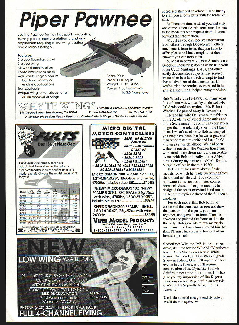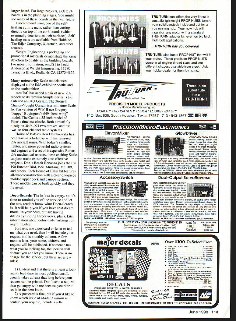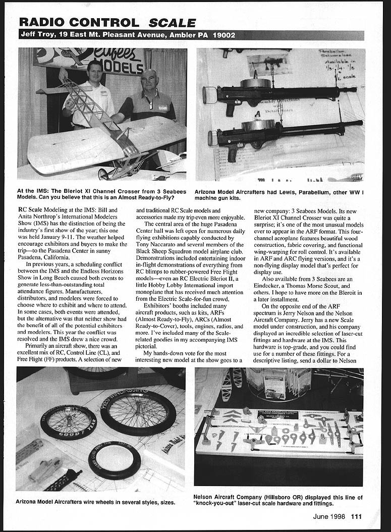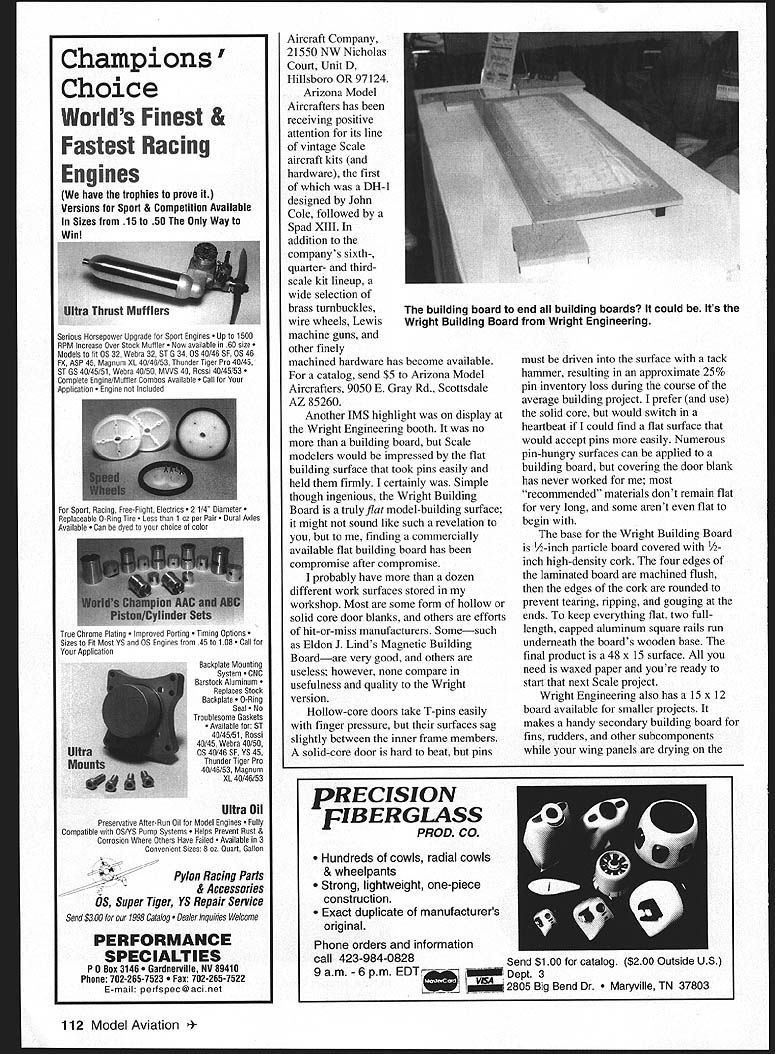 RADIO CONTROL SCALE RC Scale Modeling IMS Bill Anita Northrops International Modelers Show IMS has distinction being industrys first show year held January 9-11 weather helped encourage exhibitors buyers make trip-to Pasadena Center sunny Pasadena California previous years scheduling conflict between IMS Endless Horizons Show Long Beach caused both events generate less-than-outstanding total attendance figures Manufacturers distributors modelers forced choose exhibit attend some cases both events attended alternative neither show benefit of potential exhibitors modelers year conflict resolved IMS drew nice crowd Primarily aircraft show excellent mix RC Control Line CL Free Right FF products selection new traditional RC Scale models accessories made trip enjoyable central area huge Pasadena Center hail left open numerous daily flying exhibitions capably conducted Tony Naccarato several members Black Sheep Squadron model airplane club Demonstrations included entertaining indoor in-flight demonstrations everything RC blimps rubber-powered Free Flight modelseven RC Electric Bleriot II little Hobby Lobby International import monoplane has received much attention Electric Scale-for-fun crowd Exhibitors booths included aircraft products such kits ARFs Almost Ready-to-Fly ARCs Almost Ready-to-Cover tools engines radios Ive included Scalerelated goodies accompanying IMS pictorial hands-down vote interesting new model show goes new company 3 Seabees Models Its new Bleriot XI Channel Crosser quite surprise its unusual models ever appear ARF format fourchannel aeroplane features beautiful wood construction fabric covering functional wing-warping roll control Its available ARF ARC flying versions its non-flying display model thats perfect display use Also available 3 Seabees Eindecker Thomas Morse Scout others hope have Bleroit later installment opposite end ARF spectrum Jerry Nelson Nelson Aircraft Company Jerry has new Scale model under construction company displayed incredible selection laser-cut fittings hardware IMS hardware top-grade could find use number fittings descriptive listing send dollar Nelson June1998 111 IMS Bleriot Xl Channel Crosser 3 Seabees Arizona Model Aircrafters Lewis Parabellum other WW Models Can believe Almost Ready-to-Fly machine gun kits Nelson Aircraft Company Hilisboro OR displayed line Arizona Model Aircrafters wire wheels several styles sizesknock-you-out laser-cut scale hardware fittings Champions Choice Worlds Finest & Fastest Racing Engines have trophies prove Versions Sport & Competition Available Sizes 1510 50 Only Way Serious Horsepower Upgrade ter Spurt tngines Up 1500 RPM Increase Over Stuck Mottler available 00 size Models fit 0S32 Webra 32 ST G 34 OS 40/46 SF 0S46 FX ASP 45 Magnum XL 40/46/53 Thunder Tiger Pro 40/45 ST 05 40/45/51 Webra 40/50 MVVS 40 Rassi 40/45/53 Complete togine/Muttler Combos Available tar Application Engine Included Backplate Mounting System CNC Barstock Aluminum Replaces Stock Backplute 0-Ring Seal roublesome Gaskets Available fur ST 40/45/Si Rossi 40/45 Webra 40/50 05 40/46 SF VS 45 Thunder Tiger Pro 40/46/53 Mageum XL 40/46/53 Ultra Oil Preservative After-Rue Oil Mudel Engines Fully Compatible OSNS Pump Systems s Prevent Rust & Cerrosien Others Hone Foiled lable 3 Convenient Sizes 8 oz Quart Gallon -Pylon Racing Parts & Accessories OS Super Tiger YS Repair Service Send $300 oar 1998 Catalog er Inquiries Welcome PERFORMANCE SPECIALTI ES P 0 Box 3146 nerville NV 89410 Phone 702-265-7523 702-265-7522 E-mail perfopeC@acinet Aircraft Company 21550 NW Nicholas Court Unit D Hilisboro OR 97124 Arizona Model Aircrafters has receiving positive attention its line vintage Scale aircraft kits hardware first DH- 1 designed John Cole followed Spad XIII addition companys sixth- quarter- thirdscale kit lineup wide selection brass turnbuckles wire wheels Lewis machine guns other finely machined hardware has become available catalog send $5 Arizona Model Aircrafters 9050 E Gray Rd Scottsdale AZ 85260 Another IMS highlight display Wright Engineering booth no building board Scale modelers would impressed flat building surface took pins easily held firmly certainly Simple though ingenious Wright Building Board trulyflat model-building surface might sound like such revelation finding commercially available flat building board has compromise after compromise probably have dozen different work surfaces stored workshop Most some form hollow solid core door blanks others efforts hit-or-miss manufacturers Somesuch Eldon J Linds Magnetic Building Boardare very good others useless however compare usefulness quality Wright version Hollow-core doors take T-pins easily finger pressure surfaces sag slightly between inner frame members solid-core door hard beat pins building board end building boards could Its Wright Building Board Wright Engineering must driven surface tack hammer resulting approximate 25% pin inventory loss during course average building project prefer use solid core would switch heartbeat could find flat surface would accept pins easily Numerous pin-hungry surfaces can applied building board covering door blank has never worked recommended materials dont remain flat very long some arent flat begin base Wright Building Board t/2-inch particle board covered l/2 inch high-density cork four edges laminated board machined flush edges cork rounded prevent tearing ripping gouging ends keep everything flat two fulllength capped aluminum square rails run underneath boards wooden base final product 48 x 15 surface need waxed paper youre ready start next Scale project Wright Engineering also has 15 x 12 board available smaller projects makes handy secondary building board fins rudders other subcomponents wing panels drying 112 Model Aviation t Racing Free-Flight Electrics 4 Diameter Replaceable 0-Ring Tire 1 per Pair l Axles Availuhle dyed choice celor True Chrome Plating Improved Porting ng Options Sizes Fit Most VS OS togives 45 108 tar Application PRECISIO