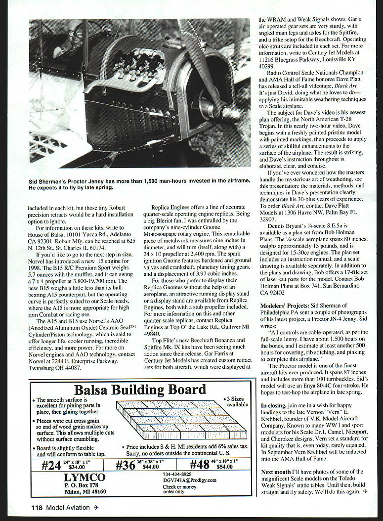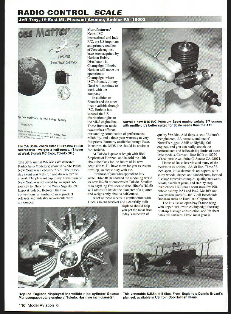 RADIO CONTROL SCALE ng new addit10 Hitec fay S Scale check Hitec RCDs new HS-50 microservoweighs half-ounce Shown Weak Signals RC Expo Toledo OH 30th annual WRAM Westchester Radio Aero Modelers show White Plains New York February 27-29 threeday event well-run drew terrific crowd pleasant trip hometown New York followed April 3-5 journey Ohio Weak Signals RIC Expo Toledo Between two conventions number new product releases industry movements announced Manufacturers News ISC International Indy RIC US importers primary retailers Zenoah engines have acquired Horizon Hobby Distributors Champaign Illinois Horizon will move operation Champaign ISCs friendly Jimmy Goad will continue work company addition Zenoah other lines available through ISC Horizon has secured US distribution rights MDS engine line Russian-made two-strokes offer outstanding combination performance reliability three-year warranty very fair prices Formerly available through Estes Industries MDS line should winner Horizon Toledo spoke length Rick Stephens Horizon told bit about plans future its new acquisitions Ill have events develop please stay appreciate 1/2A scale Hitec RCD showed modeling world its new HS-50 microservo Toledo Smaller anything lxe seen date Hitecs HS-50 will almost fit inside diameter quarter weighs about half-ounce set servos combination Hitecs micro receiver carefully built airplane should help get todays selection quality /2A kits Add flaps set Robarts reengineered /2A retracts Norvels rugged AME BigMig 061 engines can really stretch performance believability limits little models Contact Hitec RCD 10729 Wheatlands Ave Suite C Santee CA 92071 House Balsa has reissued models its orioinal VA kit line 36inch-span 2-scale models superb select woods shaped sanded pans formed fuselage tops canopies quality hardware decals excellent plans step-by-step Instructions HOB has short-nose Fw 190 bubble canopy P-5 1 P-47 109 two civilian aircraftthe V-tail Beechcraft Bonanza de Havilland Chipmunk kits use open-bay D-tube wing upper lower leading edge sheeting built-up fuselage construction /32 sheet balsa tail surfaces Fixed main gear Replica Engines displayed incredible nine-cylinder Gnome venerable SE5a still flies Englands Dennis Bryants Monosoupape rotary engine Toledo Has nine inch diameter plan set available US Bob Holman Plans 116 Model Aviation 4Norvels new BiS RIC Premium Sport engine weighs 57 ounces muffler Its better suited Scale needs A15 included kit tiny Robart precision retracts would hard installation option ignore information kits write House Balsa 10101 Yucca Rd Adelanto CA 92301 Robart Mfg can reached 625 N 12th St St Charles IL 60174 youd like go next step size Norvel has introduced new 15 engine 1998 BIS RIC Premium Sport weighs 57 ounces muffler can swing 7 x 4 propeller 3800-19700 rpm new BiS weighs little less its ballbearing AlS counterpart operating curve perfectly suited Scale needs 15 appropriate high rpm Combat racing use AIS BIS use Norvels AAO Anodized Aluminum Oxide Ceramic SealTM Cylinder/Piston technology said offer longer life cooler running incredible efficiency power Norvel engines AAO technology contact Norvel 2244 E Enterprise Parkway Twinsburg OH 44087 Replica Engines offers line accurate quarter-scale operating engine replicas Being big Bleriot fan enthralled companys nine-cylinder Gnome Monosoupape rotary engine remarkable piece metalwork measures nine inches diameter will turn itself along 24 x 10 propeller 2400 rpm spark ignition Gnome features hardened ground valves crankshaft planetary timing gears displacement 397 cubic inches prefer display Replica Gnomes help aeroplane attractive running display stand display stand available Replica Engines both stub propeller included information other quarter-scale replicas contact Replica Engines lop 0 Lake Rd Gulliver MI 49840 lop Flites new Beechraft Bonanza Spitfire Mk IX kits have seeing much action since release Gar Farris Century Jet Models has created custom retract sets both aircraft displayed WRAM Weak Signals shows Gar s air-operated gear sets very sturdy angled main legs axles Spitfire trike setup Beechcraft Operating oleo struts included set information write Century Jet Models 11216 Bluegrass Parkway Louisville KY 40299 Radio Control Scale Nationals Champion AMA Hall Fame honoree Dave Platt has released tell-all videotape Black Art Its just David doing what loves applying inimitable weathering techniques Scale airplane subject Daves video newest plan offering North American 1-28 Trojan nearly two-hour video Dave begins freshly painted pristine model painted markings proceeds apply series skillful enhancements surface airplane result striking Daves instruction throughout elaborate clear concise youve ever wondered masters handle mysterious art weathering see presentation materials methods techniques Daves presentation clearly demonstrate 30-plus years experience order Black Art contact Dave Platt Models 1306 Havre NW Palm Bay FL 32907 Dennis Bryants -scale SE5a available plan set Bob Holman Plans -scale aeroplane spans 80 inches weighs approximately 15 pounds designed 15-30cc engines plan set includes instruction manual scale drawing available separately addition plans drawing Bob offers 17-file set laser-cut parts model Contact Bob Holman Plans Box 741 San Bernardino CA 92402 Modelers Projects Sid Sherman Philadelphia PA sent couple photographs latest project Proctor JN-4 Jenny Sid writes controls cable-operated per full-scale Jenny have about 1500 hours bones estimate least another 500 hours covering rib stitching pinking complete airplane Proctor model finest aircraft kits ever produced spans 87 inches includes 100 tumbuckles Sids model will use Enya 80-4C four-stroke hopes test-hop airplane late spring closing join wish happy landings late Vernon Vein B Krehbiel founder VK Model Aircraft Company Known WV sport modelers Scale Dr 1 Camel Nieuport Cherokee designs Vern set standard kit quality today rarely equaled Septemb