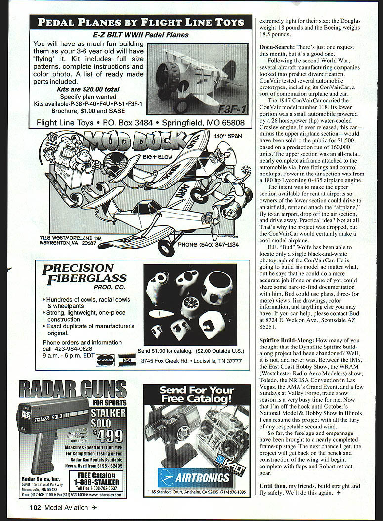 RADIO CONTROL SCALE w r vin . U U Izs- 1W VI 4 1 Congratulations Academy Model Aeronautics its purchase IMS International Modelers Show Pasadena California IMS has solid event 20 years Im certain purchase will help somewhat ease massive burden AMAs ongoing educational flying site efforts Congratulations also AMAs Grand Event took place June 12-14 Its good see Academy open its arms car boat railroad modelers sharing pleasures allowing share Camaraderie like can never hurt can improve relations between modelers varied hobby interests second Grand Event smashing good timeno pun intended made Thanks go AMA Programs Director Jay Mealy treated large number EAA Experimental Aircraft Association Young Eaglesand least overweight balding modeling eagle scenic ride either two full-scale aircraft based nearby airfield Jay has done remarkable job helping bring modeling attention general populace Rarely ever does trade show run presence spreading word making positive impression behalf model aviation Academy Modelers Projects pleasures column getting close look terrific Scale models have built Left own devices wouldnt have nearly much exposure models wing warp flying wire Thanks however get see models regardless type inspiration better quality see makes want build something new improve own work Ive seen enough know day am actually going build Platt Fw 190 kit bought Toledo 10 years ago its just hard say thats going So much own musings Heres what Ive received recently Don Myers scratch-built Morane Saulnier Parasol flies two channels Mills 75 diesel engine /2A model covered English antique Litespan carries French roundels wing British roundels fuselage indicated Windsock Publication #3253 Dons models vertical stabilizer all-moving increased slightly area horizontal flying tail Both surfaces cable-operated using braided Control Line wire Two model reports came Ben Abrams Kentucky Ben multiple engines evidenced Boeing C-97 Douglas C-133B Both airplanes have 90-inch wings powered four OS 25 engines Ben strong believer simplicity except multi feature Neither model equipped flaps retracts Bens models all-balsa-and-plywood construction covered Super Coverite painted combination Cheveron Perfect Paint Hobbypoxy color Both aircraft 100 Model Aviation ific New Jersey modeler Jeff Davis builds year Top Flite P-40 has flaps retracts bomb release ASP 91 engine Don Myers scratch-built 1/2A Morane Saulnier Parasol flies two channels powered Mills 75 diesel engine Benjamin S Abrams Rumsey KY 181/2-pound Boeing C-97 has Abrams Douglas C-i 33B also spans 90 inches Neither 05a 90-inch span powered four 0S 25 engines powered behemoth nor C-97 has flaps retracts E-Z BILT WWII Pedal Planes will have much fun building 3-6 year old will have flying Kit includes full size patterns complete instructions color photo list ready made parts included Kits $2000 total Specify plan wanted Kits available-P-38 P-40 P-51 1 Brochure $100 SASE Flight Line Toys P0 Box 3484 ngfield MO 65808 10 SP8N extremely light size Douglas weighs 18 pounds Boeing weighs 185 pounds Docu-Search Theres just request month its good Following second World War several aircraft manufacturing companies looked product diversification ConVair tested several automobile prototypes including its ConairCar sort combination airplane car 1947 ConVairCar carried Con Vair model number 118 Its lower portion small automobile powered 26 horsepower hp water-cooled Crosley engine ever released car minus upper airplane sectionwould have sold public $1500 based production run 160000 units upper section all-metal nearly complete airframe attached automobile via three fittings control hookups Power air section 180 hp Lycoming 0-435 airplane engine intent make upper section available rent airports owners lower section could drive airfield rent attach airplane fly airport drop off air section drive away Practical idea Thats project dropped ConVairCar would certainly make cool model airplane EE Bud Wolfe has able locate single black-and-white photograph ConVairCar going build model no matter what says could accurate job could share some hard-to-find documentation him Bud could use plans three- views line drawings color information anything else may have can help please contact Bud 8724 B Weldon Ave Scottsdale AZ 85251 Spitfire Build-Along thought Dynaflite Spitfire buildalong project abandoned Well never Between IMS East Coast Hobby Show WRAM Westchester Radio Aero Modelers show Toledo NRHSA Convention Las Vegas AMAs Grand Event few Sundays Valley Forge trade show season very busy time Now Im off hook until Octobers National Model & Hobby Show Illinois can resume project fury respectable second wind So far fuselage empennage have brought nearly completed frame-up stage next chance get project will get back bench construction wing will begin complete flaps Robart retract gear Until friends build straight fly safely Well again Model Aviation CISION FIB ERGS Hundreds cowls radial cowls & wheelpants Strong lightweight one-piece construction Exact duplicate manufacturers original Phone orders information call 423-984-0828 Send $100 catalog $200 Outside US 9am-6pmEDTffi 1fA3745 Fox Creek Rd sville TN 37777