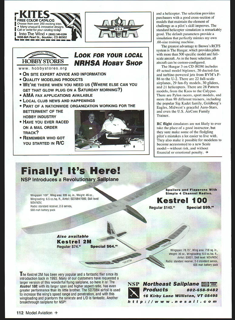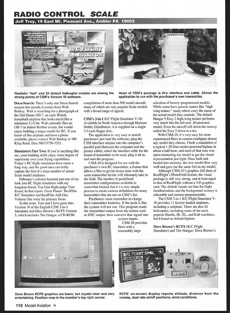 RADIO CONTROL SCALE Docu-Searcb Ther&s Docu-Search request month comes Walt Buskey Walt searching photograph Ord-Hume OH-7 early British homebuilt airplane looks much like miniature J-3 Cub Walt currently flies OH-7 Indoor Rubber events would enjoy building larger model RC know airplane have photo available please contact Walt Buskey 100 King Road Etna NH 03750-3521 Simulators Part Two youre anything like building skills enjoy some degree superiority over flying capabilities Todays RC flight simulators have come long way good ones can really capture feel large number actual Scale model airplanes Februarys column featured part look RC flight simulators longtime friend lop Gun flight judge Tom Kozel report Great Planes RealFlite R/C Simulator RealFlite Add-Ons Volume primary focus issue Tom have gone Version 10 English CSM 3-in-i Simulator Dave Browns RCFS Version 5 includes Hangar CD-ROM compilation 500 model aircraft very popular Scale models broad range appeal CSMs 3-in-i RIC Flight Simulator V-10 Avallable North America through Horizon Hobby Distributors supplied single 35-inch floppy disk application very easy install purchasers just load software plug CSM interface adapter computers parallel port between computer printer cable select interface cable brand transmitter used plug start program CSM-I0 designed use purchasers own RC transmitter feature allows flier get home-time same transmitter he/she will ultimately take field number predefined transmitter configurations avallable somewhat limited its very simple process create custom definitions transmitters CSMs list Purchasers must remember charge transmitter batteries pack flat system will run program reads transmitter output trainer cord DSC output converts signal system inputs CSM-l0 provides fliers reasonably large selection factory-programmed models some have generic names like high wing trainer others carry name actual model emulate default Hangar 9 Easy 2 high-wing trainer performs very much like full-size 40-powered model takeoff roll down runway nailed Easy 2 down tee CSM-l0 its very easy experienced fliers custom-configure almost model choose built simulation typical 120-four-stroke-powered biplane about half-hour time spent measuring model get visual representation just tight Once built loaded memory new model flew very well gave same feel model Although CSM-l0s graphics fall short RealFlights PhotoField feature visual package still very strong least equal RealFlight 3-D graphics card default visuals fine flight familiarization background scenery selectable custom-programmable CSM 3-in-i R/C Flight Simulator V 10 provides 11 factory-loaded nirplanes including sailplane also 24 helicopters including some popular Shuttle JR XL Kalt machines found no default biplane Dave Browns RCFS R/C Flight Simulator Hangar Dave Browns 110 Model Aviation istic feel 24 default helicopter models among Heart CSMs package interface cable Allows strong points CSMs Version 10 software application run purchasers own transmitter Dave Brown RCFS graphics basic crystal clear very entertaining Position map monitors top right corner RCFS on-screen display reports altitude distance runway dual rate on/off positions wind conditions RCFS easiest three systems install Purchasers just load software plug transmitter cable game port start flying provided Simstar controller configured through system setup does have entered systems Game Controller directory Seven configured aircraft ranging motor glider typical high-wing trainer delta-wing ducted-fan jet come basic package may altered suit specific performance parameters required pilot RCFS selectable scenery includes limbo pole racing pylons background scenery sufficient maintain orientation flying field long pilot doesnt fly too high although program does provide live map upper-right corner screen lending very helpful overview whole site relative position model pylons limbo pole present experienced fliers several fun-fly opportunities beginners can removed simplify landing risk Since main east-west runway smack-dab middle pylon racing circuit pylons able provide fun-seeking reckless pilots countless midair opportunities trainer very easy fly Its high-wing red-and-white machine flies slowly enough give rank beginner somewhat-rusty veteran chance prevail Some other available aircraft include intermediate trainer advanced trainer Spitfire biplane Electric glider Flight Simulator Feature Chart RCFS 5 CSM 3-in-i V10 Minimum Requirements IBM compatible 286 better EGA graphics tBM game port Mouse 100% Soundblastercompatible sound card 35-inch floppy disk drive IBM compatible Pentium 75 better SVGA graphics card RC Transmitter w/ Buddy Box DSC DOS IV better Windows 95/98 Parallel port 35-inch floppy disk drive IBM compatible 486/66 better Super VGA monitor 2X CD-ROM drive 30 MB hard drive space Windows 95/98 Microsoft DirectX compatible graphics sound card 12 MB RAM IBM compatible 486 better 256 color VGA graphics 4X CD-ROM IBM compatible Pentium 90 better 16MB RAM Microsoft Direct 3Dcompatible graphics accelerated video card Software Format RCFS 35-inch disk Hangar 2 35 disk Hangar 3 CD-ROM System Includes Aircraft Types Supported Number Aircraft Types Unique Features RCFS software Hangar software SimStar transmitter Fixed-wing power Sailplanes Helicopters 400 actual model airplanes 21 model helicopters 22 full-scale aircraft Transmitter has retract switch dual rate elevator ailerons Overwhetming number popular models Entertaining description accident damage estimate given crash CSM-10 software TX cable & interface Fixed-wing power Sailplane Helicopters 11 model airplanes 24 model helicopters Works Users own Tx interfaces parallel port Joystick port needed Convenient feature laptops joystick port Interface cables JR Futaba Airtronics RealFlight software Futaba transmitter Add-ons optional Fixed-wing power Nine model airplanes 1 3 optional Add-ons upgrade Choice 5 flying fields 7 Add-ons Outstanding graphics 3D acce