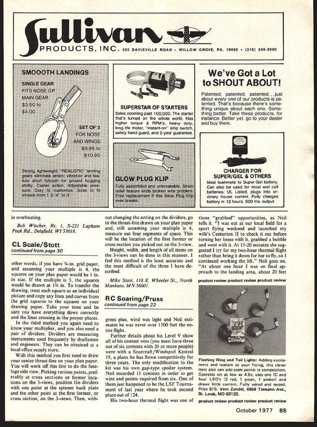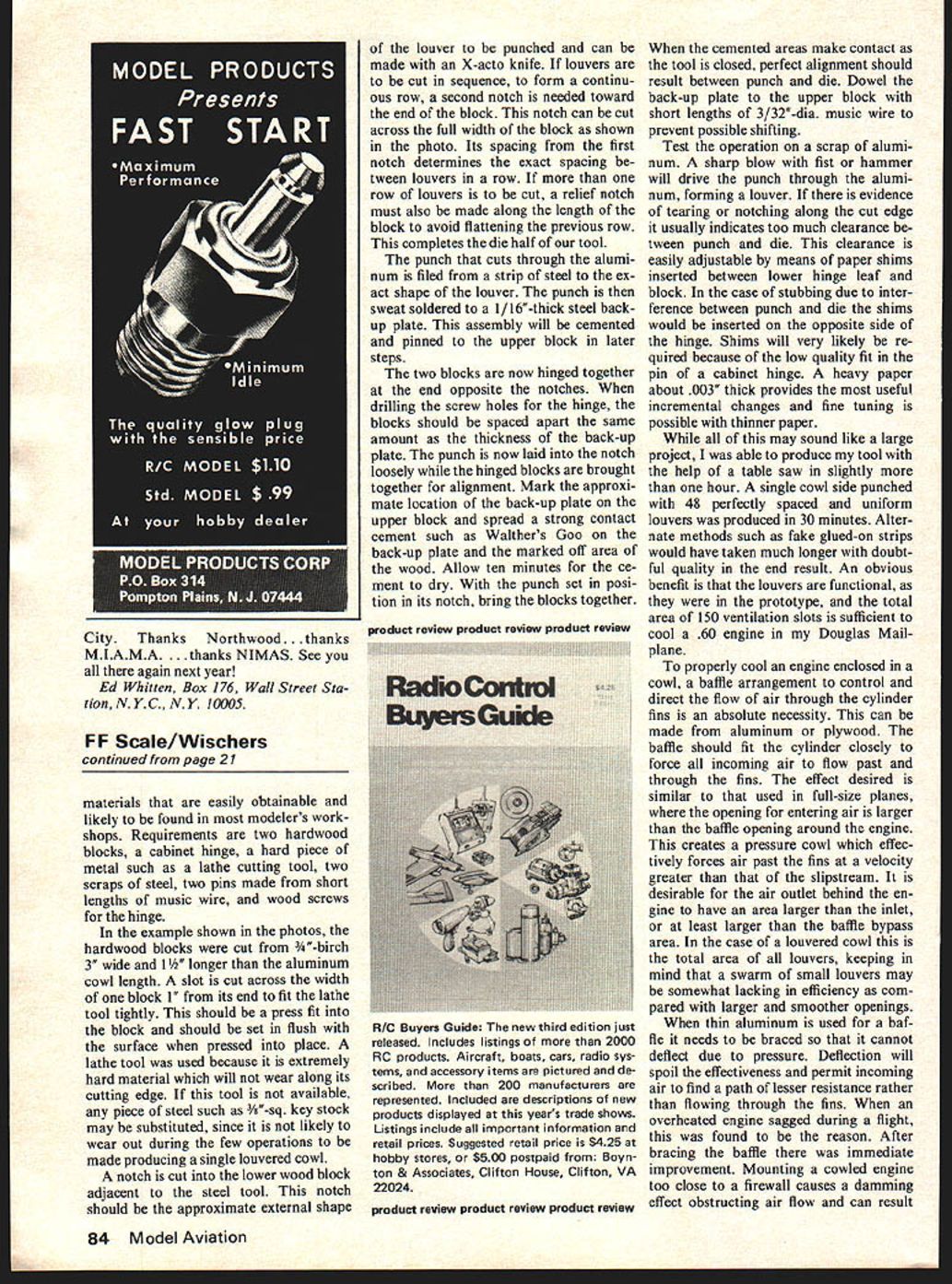 shelved because problem emerged dur ing planning stage Numerous early planes some later types en gine cowls covered ventilation louvers numbering hundreds Without conspicuous details plane loses char acter sport-scale model Louvers can easily puched hard Scale0 10 thick aluminum preferred ma terial printers offset aluminum sheets used local small newspapers sheet usually size opened news paper After using sheets print edition discarded scrap vir tual bonanza minimum cost material usually 25 50 cents per sheet resi due printers ink can easily removed modelers universal solvent dope thinner etched surface contin ues show traces latest news can inside cowl leaving outer surface polished unmarked Whole airplanes have successfully covered material can also oc casionally found 005 thickness tin shear will cut material easily leaves somewhat ragged edge sta tioners paper cutter produces de sirable cut edge finely finished ap pearance takes enamel very well greatest permanence fuel resist ance should baked method explored uses Cnntinupd arp-edged lathe tool used cutting edge piercing louver Just right tool carved notch shaped form louver 3 The hinged blocks swung apart hinge die right end punch left photos Bob Wischer 4 Hardwood blocks position brought together forming louver Punched alumi num sheet pulled forward expose die area 5 Finished cowl side authors Douglas Mailplane Rivet detail shown embossed aluminum pin driven weight uni form impressions Note cowl fasteners PUNCHING LOUVERS sheet metal louvered engine cowl first glance may seem impossible task reproduce miniature scale projects have postponed permanently October1977 21 U O Bob Dolly Wischer 1 Louvers too difficult imitate First punch see text complete details sol dered steel back-up plate Assembly con tact cemented pinned block City Thanks Northwood ks MIAMA anks NIMAS See again next year Ed Whitten Box 176 Wall Street Sta tionNYC NY JOOOS FF Scale/Wischers continued page 21 materials easily obtainable likely found modelers work shops Requirements two hardwood blocks cabinet hinge hard piece metal such lathe cutting tool two scraps steel two pins made short lengths music wire wood screws hinge example shown photos hardwood blocks cut -birch 3 wide 1 longer aluminum cowl length slot cut across width block 1 its end fit lathe tool tightly should press fit block should set flush surface pressed place lathe tool used because extremely hard material will wear along its cutting edge tool available piece steel such 3/8-sq key stock may substituted since likely wear out during few operations made producing single louvered cowl notch cut lower wood block adjacent steel tool notch should approximate external shape louver punched can made X-acto knife louvers cut sequence form continu ous row second notch needed toward end block notch can cut across full width block shown photo Its spacing first notch determines exact spacing tween louvers row row louvers cut relief notch must also made along length block avoid flattening previous row completes die half tool punch cuts through alumi num filed strip steel ex act shape louver punch sweat soldered l/16-thick steel back up plate assembly will cemented pinned upper block later steps two blocks now hinged together end opposite notches drilling screw holes hinge blocks should spaced apart same amount thickness back-up plate punch now laid notch loosely hinged blocks brought together alignment Mark approxi mate location back-up plate upper block spread strong contact cement such Walthers Goo back-up plate marked off area wood Allow ten minutes ce ment dry punch set posi tion its notch bring blocks together R/C Buyers Guide new third edition just released Includes listings 2000 RC products Aircraft boats cars radio sys tems accessory items pictured de scribed 200 manufacturers represented Included descriptions new products displayed years trade shows Listings include important information retail prices Suggested retail price $425 hobby stores $500 postpaid Boyn ton & Associates Clifton House Clifton VA 22024 product review product review product review cemented areas make contact tool closed perfect alignment should result between punch die Dowel back-up plate upper block short lengths 3/32-dia music wire prevent possible shifting Test operation scrap alumi num sharp blow fist hammer will drive punch through alumi num forming louver evidence tearing notching along cut edge usually indicates too much clearance tween punch die clearance easily adjustable means paper shims inserted between lower hinge leaf block case stubbing due inter ference between punch die shims would inserted opposite side hinge Shims will very likely re quired because low quality fit pin cabinet hinge heavy paper about 003 thick provides useful incremental changes fine tuning possible thinner paper may sound like large project able produce tool help table saw slightly hour single cowl side punched 48 perfectly spaced uniform louvers produced 30 minutes Alter nate methods such fake glued-on strips would have taken much longer doubt ful quality end result An obvious benefit louvers functional prototype total area 150 ventilation slots sufficient cool 60 engine Douglas Mailplane properly cool engine enclosed cowl baffle arrangement control direct flow air through cylinder fins absolute necessity can made aluminum plywood baffle should fit cylinder closely force incoming air flow past through fins effect desired similar used full-size planes opening entering air larger baffle opening around engine creates pressure cowl effec tively forces air past fins velocity greater slipstream desirable air outlet behind en gine have area larger inlet least larger baffle bypass area case louvered cowl total area louvers keeping mind swarm small louvers may somewhat lacking efficiency com pared larger smoother openings thin aluminum used baf fle needs braced cannot deflect due pressure Deflection will spoil effectiveness permit incoming air find path