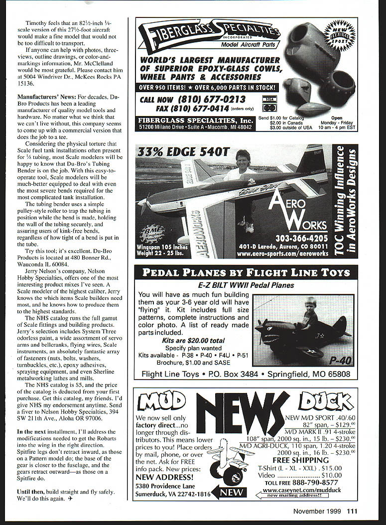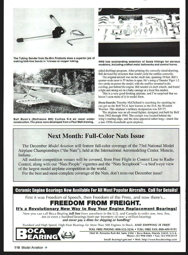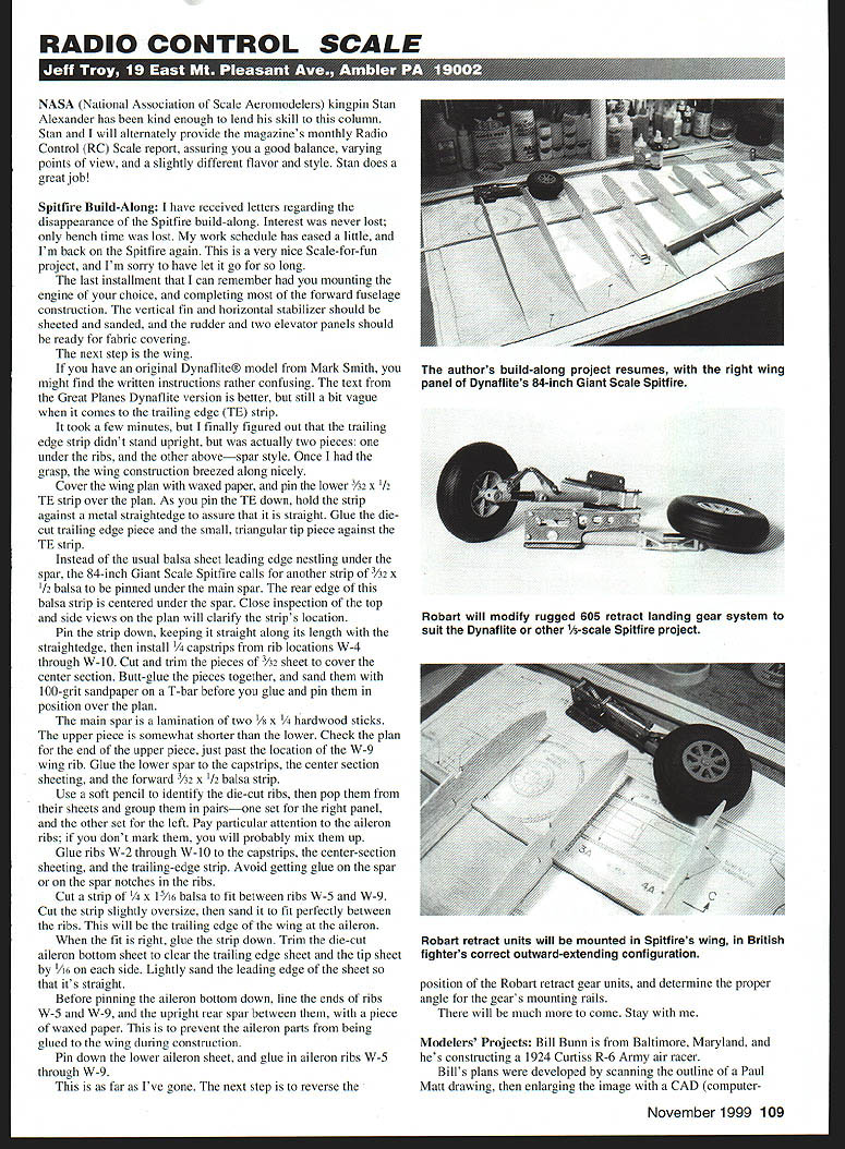 RADIO CONTROL SCALE NASA National Association Scale Aeromodelers kingpin Stan Alexander has kind enough lend skill column Stan will alternately provide magazines monthly Radio Control RC Scale report assuring good balance varying points view slightly different flavor style Stan does great job Spitfire Build-Along have received letters regarding disappearance Spitfire build-along Interest never lost bench time lost work schedule has eased little Im back Spitfire again very nice Scale-for-fun project Im sorry have let go long last installment can remember mounting engine choice completing forward fuselage construction vertical fin horizontal stabilizer should sheeted sanded rudder two elevator panels should ready fabric covering next step wing have original Dynaflite model Mark Smith might find written instructions rather confusing text Great Planes Dynaflite version better still bit vague comes trailing edge TB strip took few minutes finally figured out trailing edge strip didnt stand upright actually two pieces under ribs other abovespar style Once grasp wing construction breezed along nicely Cover wing plan waxed paper pin lower /32 x 1/2 TB strip over plan As pin TB down hold strip against metal straightedge assure straight Glue diecut trailing edge piece small triangular tip piece against TB strip Instead usual balsa sheet leading edge nestling under spar 84-inch Giant Scale Spitfire calls another strip /32 x /2 balsa pinned under main spar rear edge balsa strip centered under spar Close inspection top side views plan will clarify strips location Pin strip down keeping straight along its length straightedge install trips rib locations W-4 throogh W-10 Cut trim pieces 3A2 sheet cover center section Butt-glue pieces together sand 100-grit sandpaper T-bar before glue pin position over plan main spar lamination two x wood sticks upper piece somewhat shorter lower Check plan end upper piece just past location W-9 wing rib Glue lower spar capstrips center section sheeting forward /32 x /2 balsa strip Use soft pencil identify die-cut ribs pop sheets group pairsone set right panel other set left Pay particular attention aileron ribs dont mark will probably mix up Glue ribs W-2 through W-l0 capstrips center-section sheeting trailing-edge strip Avoid getting glue spar spar notches ribs Cut strip /4 x l/l6 balsa fit between ribs W-5 W-9 Cut strip slightly oversize sand fit perfectly between ribs will trailing edge wing aileron fit right glue strip down Trim die-cut aileron bottom sheet clear trailing edge sheet tip sheet A6 side Lightly sand leading edge sheet its straight Before pinning aileron bottom down line ends ribs W-5 W-9 upright rear spar between piece waxed paper prevent aileron parts being glued wing during construction Pin down lower aileron sheet glue aileron ribs W-5 through W-9 far Vve gone next step reverse position Robart retract gear units determine proper angle gears mounting rails will much come Stay Modelers Projects Bill Bunn Baltimore Maryland hes constructing 1924 Curtiss R-6 Army air racer Bills plans developed scanning outline Paul Matt drawing enlarging image CAD computer November1999 109 authors build-along project resumes right wing panel Dynaflites 84-inch Giant Scale Spitfire Robart will modify rugged 605 retract landing gear system suit Dynaflite other 1A-scale Spitfire project Robart retract units will mounted Spitfires wing British fighters correct outward-extending configuration Tubing Bender Du-Bro Products does superior job making kink-free bends /8 brass copper tubing December Airplane Champion Indiana outdoor con Control along vv largest m best aided drafting program After printing correctly-sized drawing Bill devised structure would yield outline correctly original aircraft small side spanning 19 feet Bills quarter-scale racer 57 inches span Hes using Thunder Tiger 12 two-stroke power model muffler mounted cowling just behind engine Bill needed six-inch wheels found light strong set baby carriage local flea market very good-looking airplane Im surprised havent seen model form Docu-Search Timothy McClelland searching anything can get Bell Tri-4 later known D-6 Wooden Warrior airplanes military designation XP-77 airplane all-wood fighter designed built Bell 1942 through 1944 cockpit located behind wings trailing edge nose appeared rather longmuch like late-1930s homebuilt sport airplane 3rd National Model ng Center Muncie iontrol Line Radio birds-eye view ecember issue EiI i iii [I u j{~ Iii [1 [IVTEIITFfl i ii [I 1TI1 II i iii aiI 111 * Ii ut II i1I f Hi Fl-U First Freedom Speech Freedom Press now theres. FREEDOM FROM FREIGHT Its Revolutionary New Way Buy Engine ReDlacement Bearings Now can call Boca Bearing toll free anywhere U S Canada order two live ten hundred bearings inventory over million bearings never pay dime shipping handling Standard High Speed High Heat Bearings 500 Engines Stock AND SHIPPING IS FREE TOLL FREE PHONE 800-332-3256 FREE FAX 800-409-9191 110 Model Aviation W Palmetto Park Rd Suite 2304 Raton Florida 33433 USA Phone 561-998-0004 561-998-0119 Email bearingagatenet http//wwwbocabearingscom NHS has outstanding selection Scale fittings serious modelers including crafted metal belicranks control horns Bull Bunns Baltimore MD Curtiss R-6 air racer under construction plans developed Paul Matt drawing Timothy feels 82/2-inch l/4 scale version 27/2-foot aircraft would make fine model would too difficult transport anyone can help photos threeviews outline drawings color-andmarkings information Mr MeClelland would grateful Please contact him 5004 Windriver Dr McKees Rocks PA 15136 Manufacturers News decades Du Bro Products has leading manufacturer quality model tools hardware No matter what think cant live company seems come up commercial version does job tee Considering physical torture Scale fuel tank installations often present /s tubing Scale modelers will happy know Du-Bros Tubing Bender job easy-to operate tool Scale modelers will much-b