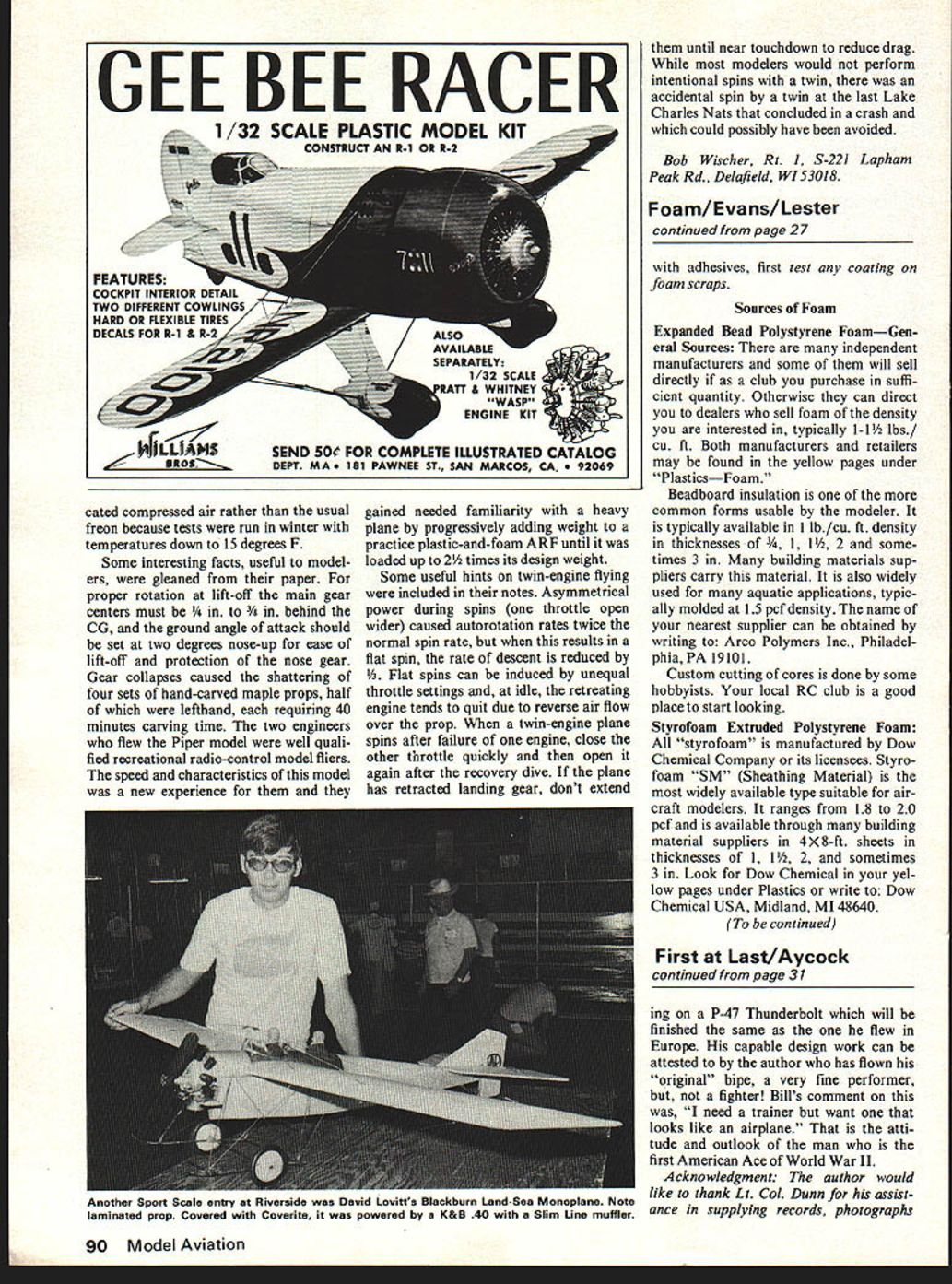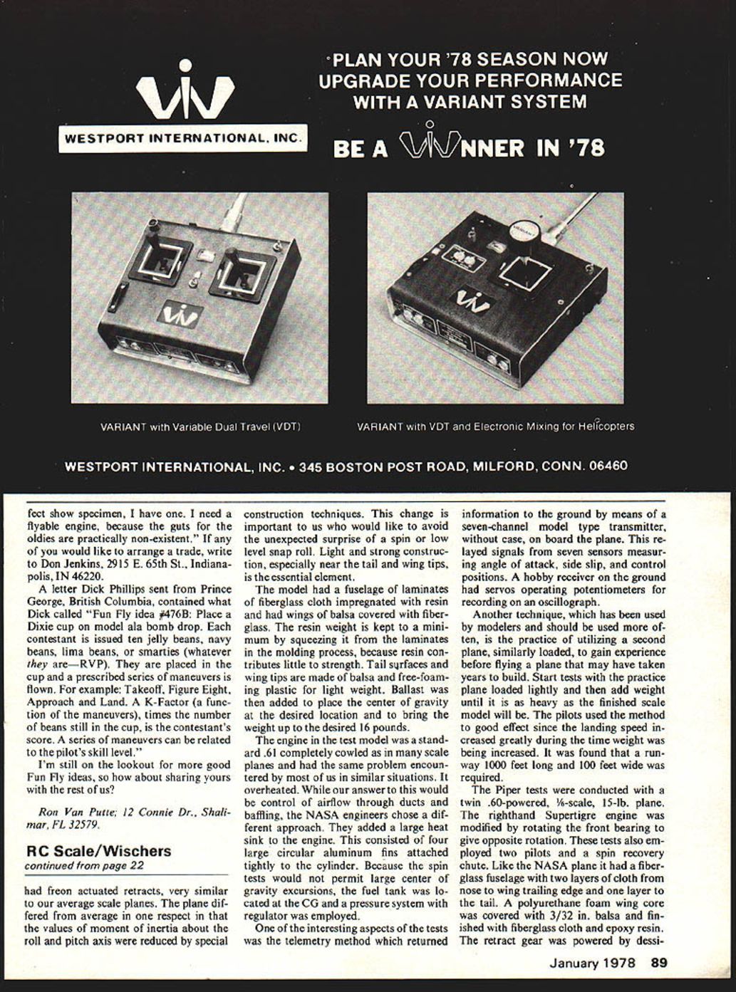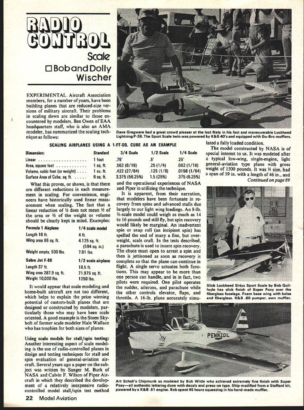 I Scale 0 Bob Dolly Wischer EXPERIMENTAL Aircraft Association members number years have building planes reduced-size ver sions military aircraft problems scaling down similar en countered modelers Ben Owen EAA headquarters staff also AMA modeler has summarized scaling tech-Dave Gregware great crowd pleaser last Nets tast maneuverable Lockheed nique followsLightning P-38 Sport Scale twin powered K&B 40s equipped Du-Bro mufflers lated fully loaded condition model constructed NASA Standard3/4 Scale1/2 Scale1/4 Scalespecial interest us modeled after typical low-wing single-engine light general-aviation type plane gross weight 1500 pounds size span 59 length 46 Continued page 89 SCALING AIRPLANES USING 1-FT-SO CUBE AS EXAMPLE Uimensimn Linear Area square foot Volume cubic foot weight ace Area Cube sq ft What proves shows different reductions measure ment scaling convenience engi neers have historically used linear meas urement scaling fact linear reduction mean ht volume should clearly kept mind Examples Fermula 1 Airplane Length 16 ft Wing area 66 sq ft Weight empty 500 lbs Sabre Jet F-SI Length 31 ft Wing area 2879 sq ft Weight 10000 lbs 1/4 scale model 4 ft 4125 sq ft 594 sq 781 lbs 1/2 scale airplane 185 ft 71975 sq ft 1250 lbs would appear scale modeling home-built aircraft too different helps explain prize winning potential custom-built planes designed constructed modelers par ticularly may have scale oriented good example Steen Skybolt former scale modeler Hale Wallace has trophies both sizes planes Using scale models stall/spin testing Another interesting aspect scale model ing use radio-controlled planes design testing techniques stall spin evaluation general-aviation air craft Several years ago paper sub ject written Sanger M Burk NASA Calvin F Wilson Piper Air craft described develop ment relatively inexpensive radiocontrolled model stall/spin test method 75525 562 9/16251/4062 1/16 42221/641251/801561/64 3315 5625%15 25%315 625% operational experiences NASA Piper utilizing technique apparent narration modelers have fortunate re covery spins advanced stalls due largely light wing loadings An 8-lb 1A-scale model could weigh much 14 16 pounds still fly spin recovery would likely marginal An inadvertent spin snap roll incipient spin has spelled end fine over weight scale craft tests described parachute used insure spin recovery chute must open arrest spin jettisoned soon recovery complete plane can continue flight single servo actuates both func tions may appear person can handle in fact two pilots required pilot operates rudder ailerons parachute other controls elevator flaps throttle 16-lb plane accurately simu 22 Model Aviation 1 foot 1 sq ft 1 Cu ft 6 sq ft Slick Lockheed Sirius Sport Scale Sob Gumi foyle has slick finish Super Poxy over fiberglass fuselage Foam base wing balsa fiberglass K&B 60 pumper own muffler Art Scholls Chipmunk modeled Bob Wilde achieved extremely fine finish Super Poxyall authentic lettering done decals press-on type Ship modified Stafford kit powered K&B 61 engine Bob spent 45 hours squeezing hand-made muffler feet show specimen have need flyable engine because guts oldies practically non-existent would like arrange trade write Don Jenkins 2915 E 65th St Indiana polis IN 46220 letter Dick Phillips sent Prince George British Columbia contained what Dick called Fun Fly idea #476B Place Dixie cup model ala bomb drop contestant issued ten jelly beans navy beans lima beans smarties whatever areRVP placed cup prescribed series maneuvers flown example Takeoff Figure Eight Approach Land K-Factor func tion maneuvers times number beans still cup contestants score series maneuvers can related pilots skill level Im still lookout good Fun Fly ideas about sharing yours rest us Ron Van Pune 12 Connie Dr Shah mar FL 32S79 RC Scale/Wischers continued page 22 freon actuated retracts very similar average scale planes plane dif fered average respect values moment inertia about roll pitch axis reduced special construction techniques change important us would like avoid unexpected surprise spin low level snap roll Light strong construc tion especially near tail wing tips essential element model fuselage laminates fiberglass cloth impregnated resin wings balsa covered fiber glass resin weight kept mini mum squeezing laminates molding process because resin con tributes little strength Tail s4rfaces wing tips made balsa free-foam ing plastic light weight Ballast added place center gravity desired location bring weight up desired 16 pounds engine test model stand ard 61 completely cowled scale planes same problem encoun tered us similar situations overheated answer would control airflow through ducts baffling NASA engineers chose dif ferent approach added large heat sink engine consisted four large circular aluminum fins attached tightly cylinder Because spin tests would permit large center gravity excursions fuel tank lo cated CG pressure system regulator employed interesting aspects tests telemetry method returned information ground means seven-channel model type transmitter case board plane re layed signals seven sensors measur ing angle attack side slip control positions hobby receiver ground servos operating potentiometers recording oscillograph Another technique has used modelers should used ten practice utilizing second plane similarly loaded gain experience before flying plane may have taken years build Start tests practice plane loaded lightly add weight until heavy finished scale model will pilots used method good effect since landing speed creased greatly during time weight being increased found run way 1000 feet long 100 feet wide required Piper tests conducted twin 60-powered /6-scale 15-lb plane righthand Supertigre engine modified rotating front bearing give opposite rotation tests also em ployed two pilots spin recovery chute Like NASA plane fiber glass fuselage two layers cloth nose wing trailing edge layer tail polyurethane foam wing core covered 3/32 balsa fin i