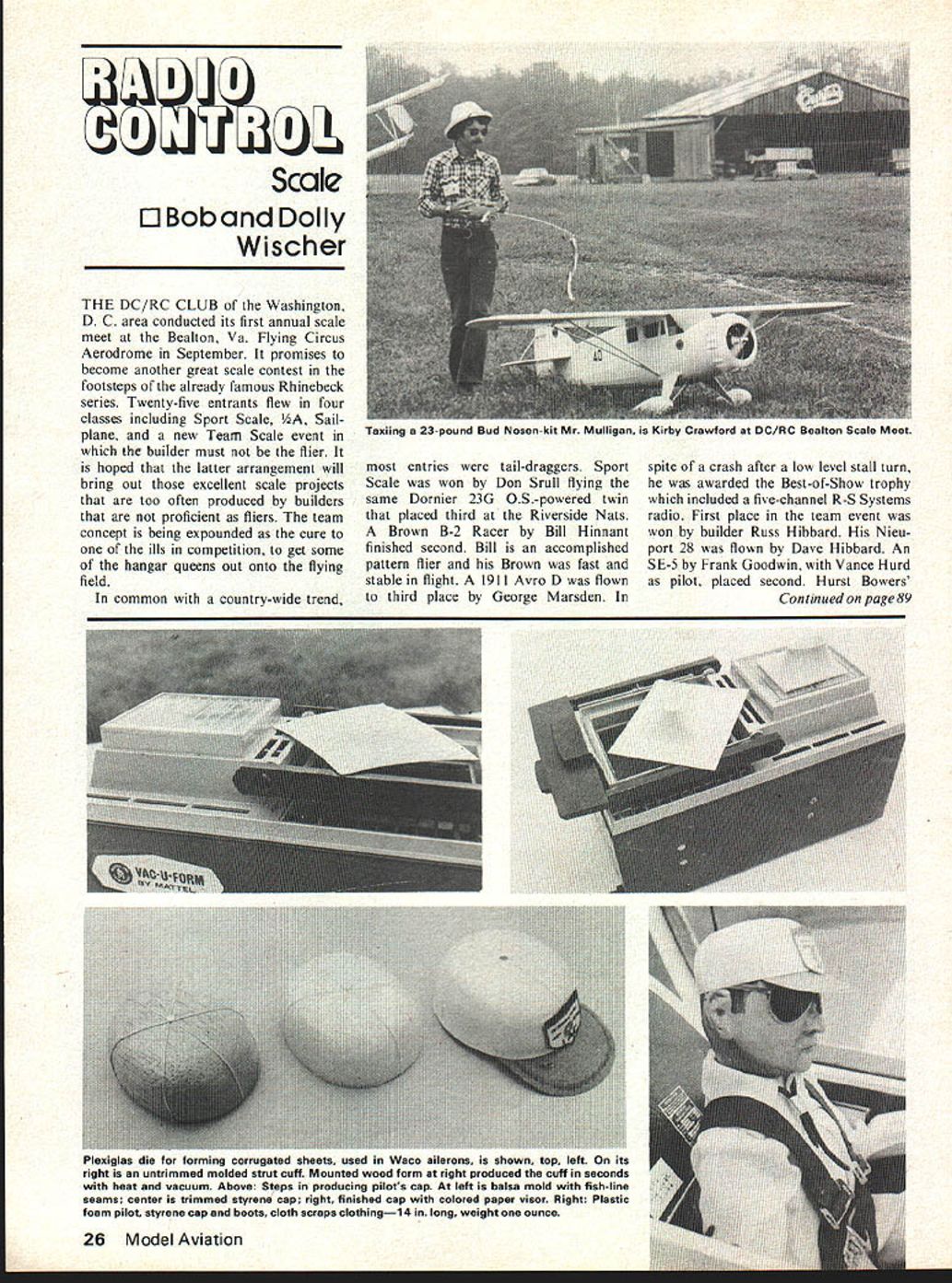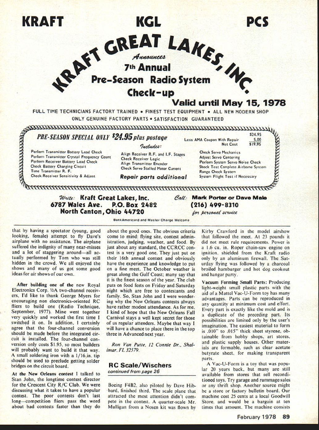 U k Scale 0 Bob Dolly Wischer THE DC/RC CLUB Washington D C area conducted its first annual scale meet Bealton Va Flying Circus Aerodrome September promises become another great scale contest footsteps already famous Rhinebeck series Twenty-five entrants flew four classes including Sport Scale Y2A Sail plane new Team Scale event builder must flier hoped latter arrangement will bring out excellent scale projects too often produced builders proficient fliers team concept being expounded cure ills competition get some hangar queens out onto flying field common country-wide trend entries tail-draggers Sport Scale won Don Srull flying same Dornier 23G 0S-powered twin placed third Riverside Nats Brown B-2 Racer Bill Hinnant finished second Bill accomplished pattern flier Brown fast stable flight 1911 Avro D flown third place George Marsden spite crash after low level stall turn awarded Best-of-Show trophy included five-channel R-S Systems radio First place team event won builder Russ Hibbard Nieu port 28 flown Dave Hibbard An SE-5 Frank Goodwin Vance Hurd pilot placed second Hurst Bowers Continued page 89 Plexiglas die forming corrugated sheets used Waco ailerons shown top left its right untrimmed molded strut cuff Mounted wood form right produced cuff seconds heat vacuum Above Steps producing pilots cap left balsa mold fish-line seams center trimmed styrene cap right finished cap colored paper visor Right Plastic foam pilot styrene cap boots cloth scraps clothing14 long weight ounce Taxiing Z-pound Mud flJosen-kit Mr Mulligan idrby Lrawtord DC/RC Bealton caie Meet KGL IAT LA /4#u0ace4 7th Annual Pre-Season Radio System Check-up Pcs Valid until May 15 1978 FULL TIME TECHNICIANS FACTORY TRAINED ST TEST EQUIPMENT NEW MODERN SHOP ONLY GENUINE FACTORY PARTS SFACTION GUARANTEED r PRE-SEASOV SPECIAL ONLY $2495 plus postaqe Less AMA Coupon Repair Net Cost Perform Transmitter Battery Load Check Perform Transmitter Crystal Frequency Count Perform Receiver Battery Load Check Check Battery Charging Circuit Tune Transmitter R F Check Receiver Sensitivity & Adjust Align Receiver RF IF Stages Check Receiver Logic Align Transmitter Encoder Check Servo Stalled Motor Current Repair parts additional Check Servo Mechanics Adjust Servo Centering Perform System Servo Noise Check Shock Test Complete Airborne System Range Check System System Flight Test Necessary Kraft Great Lakes Inc 6787 Wales Ave PO Box 2482 North CantonOhio 44720 BankAmericard Master Charge Welcome gj Mark Porter Dave Male 216 499-8310 Aez404e41 CWCe having spectator young good looking female attempt fly Daves airplane no assistance airplane suffered indignity near-misses lot staggering aroundall ac tually performed Tom still hidden crowd enjoyed shows us got some good ideas air shows own After building new Royal Electronics Corp two-channel receiv ers Id like thank George Myers encouraging non electronics-oriented RC fliers build Radio Technique September 1977 Mine went together very quickly worked first time switched addition certainly agree four-channel conversion should made before integrated cir cuit installed four-channel con version costs $195 builders will probably want build way small soldering iron l/16in tip should used preclude getting solder bridges circuit board New Orleans contest talked Stan John longtime contest director Crescent City R/C Club discussing what takes have popular contest poor contests dont last long competition fliers pass word about bad contests faster about good ones obvious criteria come mind flying site contest admin istration judging weather food just about standard CCRCC con test very good just put 16th annual contest obviously have experience knowledge put fine meet October weather great along Gulf Coast say finest season year club puts food fests Friday Saturday night free contestants family So Stan John wonder ing New Orleans contests always have rather modest attendance As kind hope New Orleans Fall Carnival stays well kept secret us regular attenders Maybe way will have chance place top three Advanced next year Ron Van Puue 12 Connie Dr Shal imar FL 32579 RC Scale/Wischers continued page 26 Boeing F4B2 also piloted Dave Hib bard finished third scale plane attracted attention didnt com pete contest quarter-scale Mr Mulligan Nosen kit flown Kirby Crawford model airshow followed meet 23 pounds did meet rule requirements Power 16 cu Roper chain-saw engine ignition shielded Kraft radio aluminum firewall Sat urday flying followed charcoal broiled hamburger hot dog cookout hangar party Vacuum Forming Small Parts Producing light-weight small plastic parts aid Mattel Vac-U-Form toy has advantages Parts can reproduced quantity minimum cost effort part exactly like mold duplicate preceding part Its possibilities limited users imagination easiest material form 010 0 15 thick sheet styrene ob tainable hobby shops art stores plastic supply houses Other mater ials formable such clear acetate butyrate sheet making transparent parts Vac-U-Form toy popu lar 20 years back still available stores sell recondi tioned toys Try garage rummage sales thrift shop Another source might store factory bulletin board machine cost 25 cents local Goodwill Store would bargain ten times amount machine consists February 1978 89 KRAFT $2495 500 $1995 frame holding 3 X 3 sheet plastic over heating element mount form single-stroke vacuum pump mounted box support buying used check oper ation element pump pump pulls heated plastic over form instantly produce part form must have slightly tapered sides known draft angle order extract molded part first uses made tool production two dozen sheets corrugated shape ailerons Waco Cabin YKS-6 3 length lim itation meant three pieces re quired surface joints invisible made along corrugation material used form 1/4 Plexiglas acrylic sheet chosen because gives very sharp corners impression produces its smoothness leaves no blemishes finished part dense hardwood such birch would likely have done well Grooves 