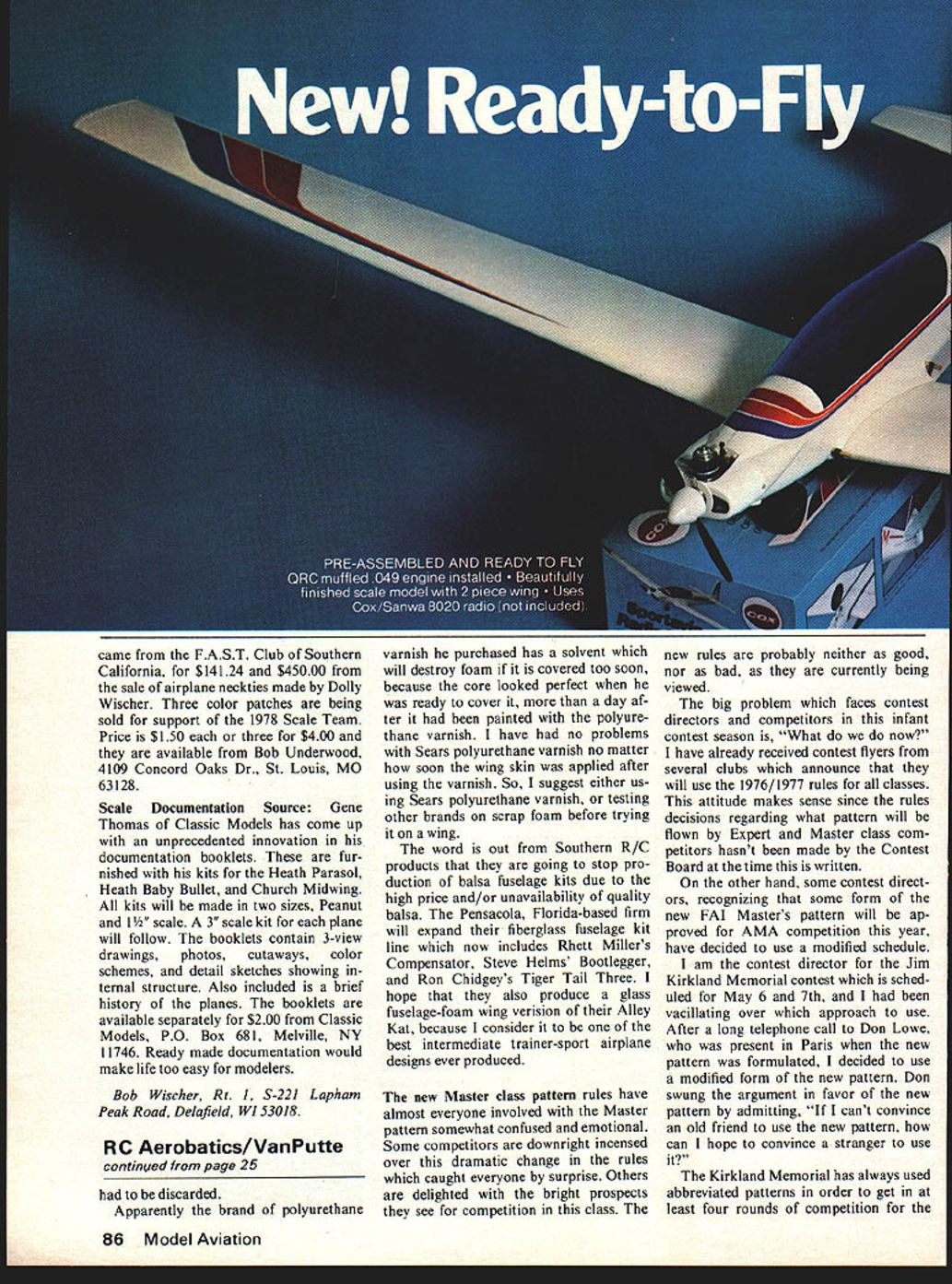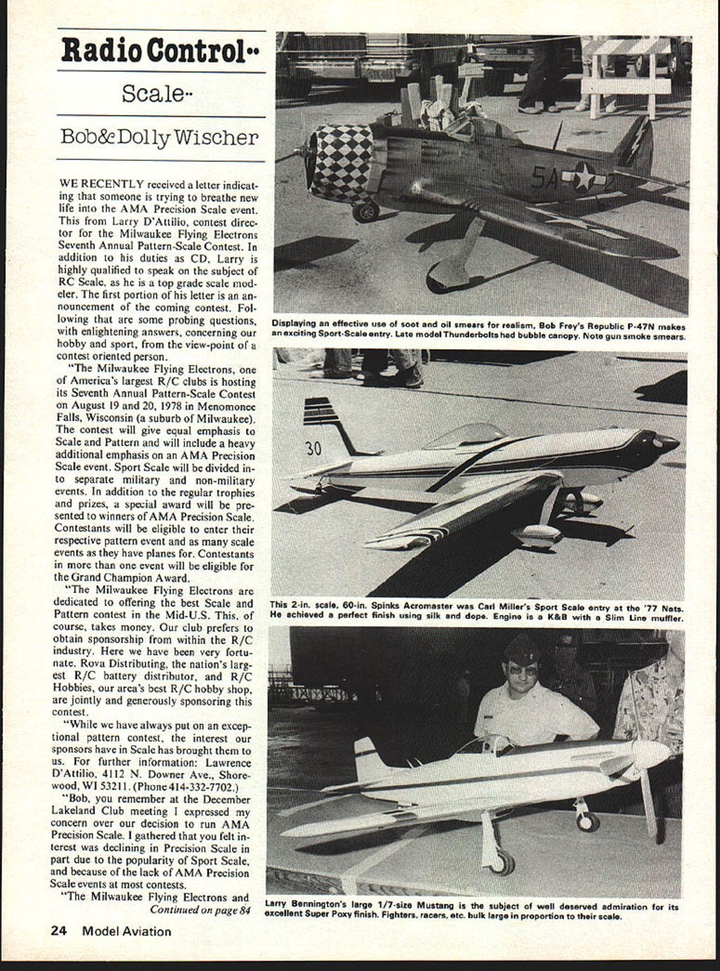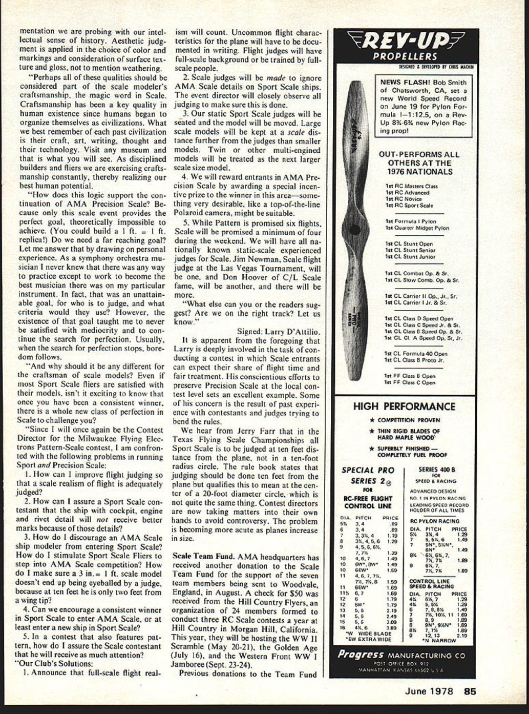 Radio Control Scale Bob8eDollyWiseher WE RECENTLY received letter indicat ing someone trying breathe new life AMA Precision Scale event Larry DAttilio contest direc tor Milwaukee Flying Electrons Seventh Annual Pattern-Scale Contest addition duties CD Larry highly qualified speak subject RC Scale top grade scale mod eler first portion letter an nouncement coming contest Fol lowing some probing questions enlightening answers concerning hobby sport view-point contest oriented person Milwaukee Flying Electrons Americas largest R/C clubs hosting its Seventh Annual Pattern-Scale Contest 1n August 19 20 1978 Menomonee Falls Wisconsin suburb Milwaukee contest will give equal emphasis Scale Pattern will include heavy additional emphasis AMA Precision Scale event Sport Scale will divided separate military non-military events addition regular trophies prizes special award will pre sented winners AMA Precision Scale Contestants will eligible enter respective pattern event scale events have planes Contestants event will eligible Grand Champion Award Milwaukee Flying Electrons dedicated offering best Scale Pattern contest Mid-US course takes money club prefers obtain sponsorship within R/C industry have very fortu nate Rova Distributing nations larg est R/C battery distributor R/C Hobbies areas best R/C hobby shop jointly generously sponsoring contest have always put excep tional pattern contest interest sponsors have Scale has brought us further information Lawrence DAttilio 4112 N Downer Ave Shorewood WI 53211 Phone 414-332-7702 Bob remember December Lakeland Club meeting expressed concern over decision run AMA Precision Scale gathered felt terest declining Precision Scale part due popularity Sport Scale because lack AMA Precision Scale events contests Milwaukee Flying Electrons Continued page 84 24 Model Aviation Displaying effective usa soot oil smears realism Bob Freys Republic P-47N makes exciting Sport-Scale entry Late model Thunderbolts bubble canopy Note gun smoke smears mis z-an scale 80-in Spinks Acromaster Carl Millers Sport Scale entry ii nets achieved perfect finish using silk dope Engine K&B Slim Line muffler Larry Benningtons large 1/7-size Mustang subject ot well deserved admiration its excellent Super Poxy finish Fighters racers etc bulk large proportion scale Letters Editor continued page 58 EYE HOOKS 436T050 N 1 1 14 fr\~1f4 X 9 MUSIC WIRE NOTCH CLEAR WOOD IX3 36TO 50 LONG plauded three articles Foam Techniques Despite architectural background found difficult follow explanation foam cutter Could Bill Max draw finished foam cutter 1/4 j NOTCH SIDE VIEW CAL BOTH ENDS us Model viation readers Thanks David Strickland Oil City PA ing gear remove canopy streamline cockpit area reduce size left cheek cowl minimum air intake remove completely possible Id reduce flying sur face area including tail limits controlability would use light weight radio battery pack remove en gine control servo anything else non essential reduce weight 5 lb minimum weight would apply Id set up engine run 70% nitro methane use relatively large high pitched propeller doing wouldnt add 25 mph 18755 mph Id hold wing rubber bands George maybe Ill think get time Someday Gene W Sidwell Hollywood CA DeBolt did write about high-speed flight RC models assume Gene thinking account Houston Speed Trails Maynard Hill re ported April 77 MA DeBolt did write Form props May issue year know what timing set up during flights Gene describes Timing world record speed attempts highly complex matter witness Dick Webers account Austrian glider 2742 mph speed record flight page 73 December 1977 Hubert Bitner Jrs Setting RC Helicopter Speed Rec ord February 1978 MA errors can accumulate stop watch timing both ends traps can tens miles per hour split second inac curacyhence FAIs tough requirements order record accp ted evident Sidwell knows make Form 1 go really fast straight line Perhaps can enthuse fellow Californians setting up Houston-type Speed Trials No Sooner Said Done RC Technique/Myers continued page 15 Off stage down aisle Vince Hurd RS systems Ive heard rumors RS dropping out consumer market Vince true No way George Weve worked too hard get give up now advertising budget shifted other magazines order get some mil itary contracts target drones see factory keeps turning out systems before Vince showed two super-transmitters marked RS-XRS has controls optimized pattern flying other opti mized pylon racing primary dif ference pylon racing model has product review product review product review Tutor Patterred after original Nobler famout stuit model ever flown Top Flites 45-in 35-powered Control line aero batic trainer has wing area 410 sq flying weight 2 2/2 lbs Special construction feature assures easily built light-weight accurate warp-free wing 0-tube leading edgesaid 20 25% stronger conventional designs Structure balsa maple motor mounts preshaped flaps elevator One-piece plywood re-en forced fuselage precision machined ac curate cut-outs wing motor mounts stabilizer Die-cut parts have printed numbers identification Kit includes nylon elevator flap horns nylon motor mount spacers formed landing tail gear tank mountings nylon belicrank adjustable lead-out guide full-size plans Top Flite Models Inc 1901 N Narragansett Ave Chicago 1160639 Bill Evans Max Lester must ap- product review product review product review dual-rate switch changes both eleva tor aileron race pilot can have additional control takeoff landing plane going slow controls less effective aero-dynam ically pattern transmitter has dualrate aileron sports roll ton RS servos now enjoy motors tested before installation servo factory-aging process assembled servo Pro-Line super transmitter de scribed April issue Pro-Line also showing no frills Cadet series de signed compete bottom price range buddy-box systems turn off based fact can used two sets same manu facturer sometimes same series World Engines showed way Expert Mark II makes sense case students transmitter sends 