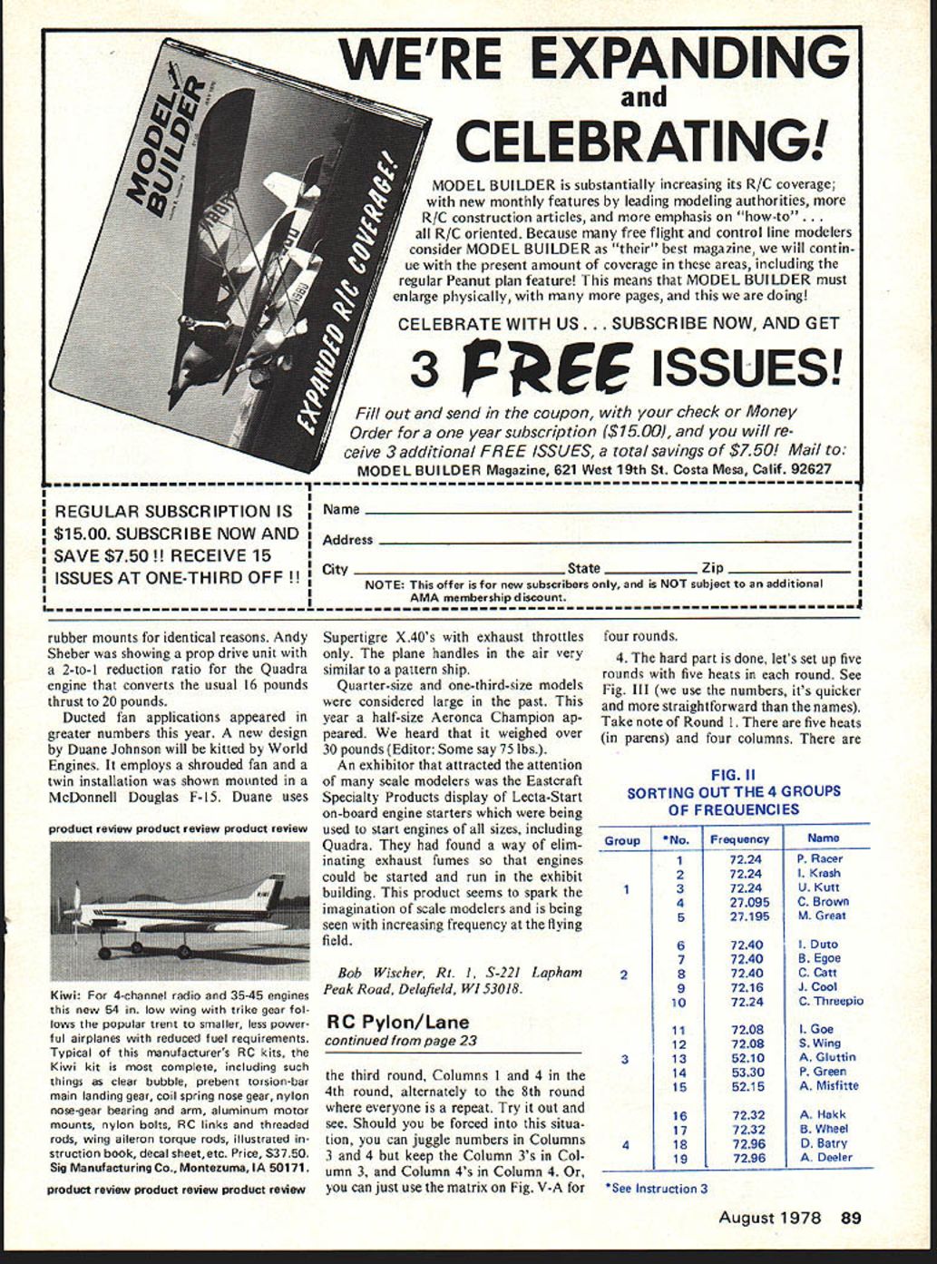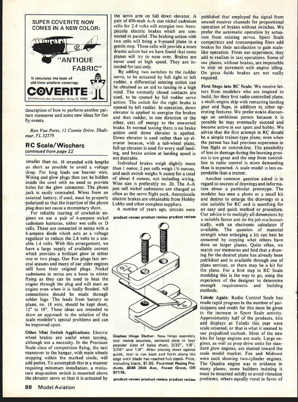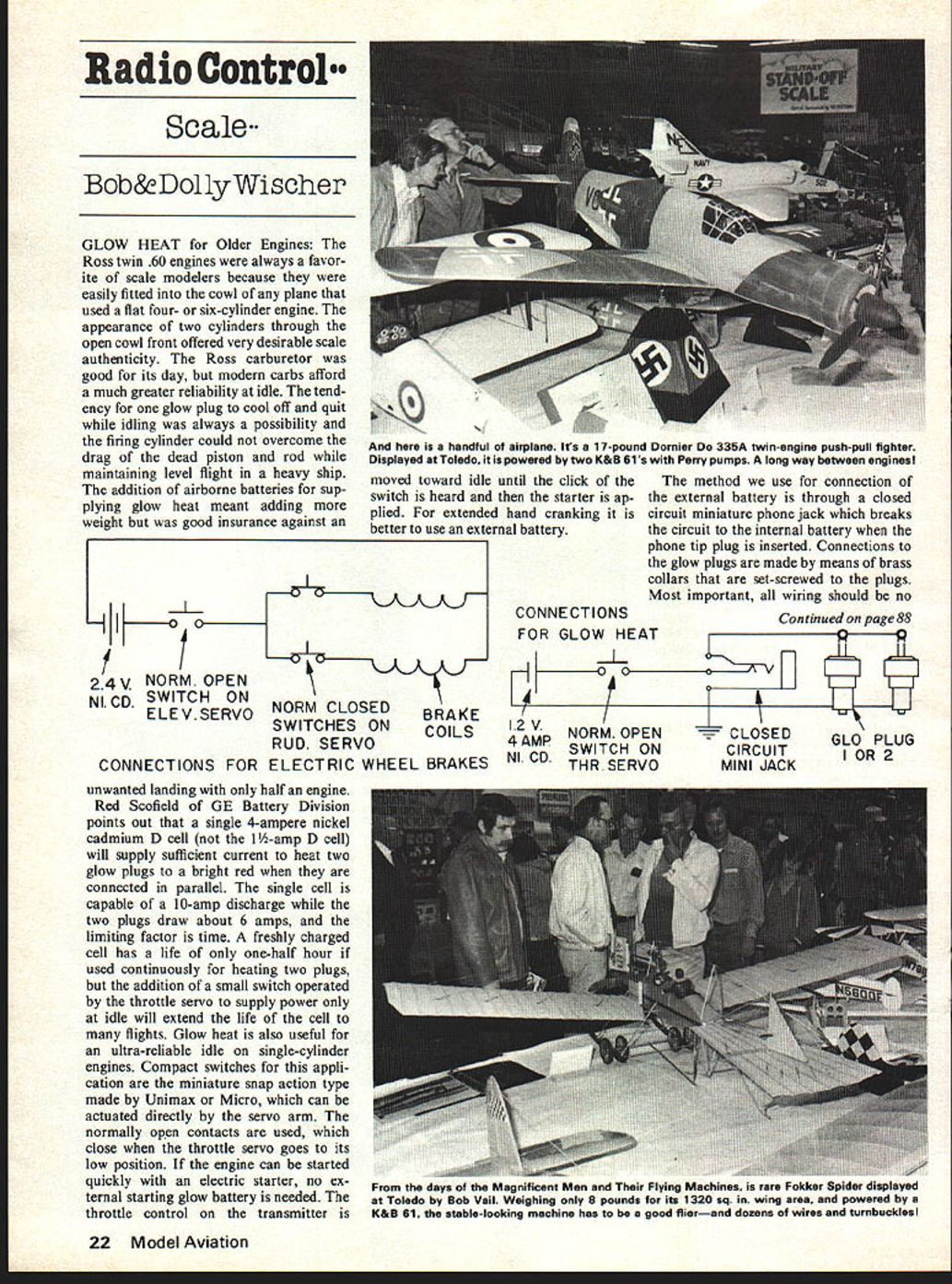 Radio Control Scale Bob8eDollyWischer GLOW HEAT Older Engines Ross twin 60 engines always favor ite scale modelers because easily fitted cowl plane used flat four- six-cylinder engine appearance two cylinders through open cowl front offered very desirable scale authenticity Ross carburetor good its day modern carbs afford much greater reliability idle tend ency glow plug cool off quit idling always possibility firing cylinder could overcome drag dead piston rod maintaining level flight heavy ship addition airborne batteries sup plying glow heat meant adding weight good insurance against moved toward idle until click switch heard starter ap plied extended hand cranking better use external battery CONNECTIONS FOR GLOW HEAT method use connection external battery through closed circuit miniature phone jack breaks circuit internal battery phone tip plug inserted Connections glow plugs made means brass collars set-screwed plugs Most important wiring should no Continued page 88 SWrrCZN~ 9 4 24V NORM OPE NI CD ELEVSERVOBRAKE COILS CONNECTIONS FOR NORM CLOSED SWITCHES ON RUD SERVO ELECTRIC WHEEL BRAKES / 12 V 4 AMP NI CD NORM OPEN SWITCH ON THR SERVO CLOSED CIRCUIT MINI JACK unwanted landing half engine Red Scofield GE Battery Division points out single 4-ampere nickel cadmium D cell 1-amp D cell will supply sufficient current heat two glow plugs bright red connected parallel single cell capable 10-amp discharge two plugs draw about 6 amps limiting factor time freshly charged cell has life one-half hour used continuously heating two plugs addition small switch operated throttle servo supply power idle will extend life cell flights Glow heat also useful ultra-reliable idle single-cylinder engines Compact switches appli cation miniature snap action type made Unimax Micro can actuated directly servo arm normally open contacts used close throttle servo goes its low position engine can started quickly electric starter no ex ternal starting glow battery needed throttle control transmitter 22 Model Aviation handful airplane lts 17-pound Dornier 335A twin-engine push-pull fighter Displayed Toledo powered two K&B 61s Perry pumps long way between enginesi GLO PLUG OR 2 asys rn Magnificent Men Flying Machines rare Fokker Spider displayed Toledo Bob Vail Weighing 8 pounds its 1320 sq wing area powered K&B 61 stable-looking machine has good flierand dozens wires turnbuckles description perform another pat tern maneuver some new ideas fun fly events Ron Van Putte 12 Connie Drive Shah mar FL 32579 RC Scale Wischers continued page 22 smaller no 18 stranded lengths short possible avoid age drop long leads use heavier wire Wiring glow plugs can hidden inside cowl no need provide holes glow connector phone jack easily concealed Wires external battery used must properly -polarized insertion phone plug does cause momentary short reliable starting cowled-in en gines use pair 4-ampere nickel cadmium batteries either wet cells D cells connected series 6-ampere diode acts voltage regulator reduce 24 volts useable 14 volts arrangement have large supply available current provides brilliant glow either two plugs Fox plugs last sev eral seasons older engines still have original plugs Nickel cadmiums series boon winter flying can used heat engine through plug will start engine badly flooded connections should made through solder lugs leads battery plane no 18 wire should kept short 12 18 ideas intended show approach solution scale modelers special problems can improved upon Other Mini Switch Applications Electric wheel brakes useful taxiing although necessity Precision Scale class competition flying taxi maneuver hangar main wheels stopping within marked circle will add points accomplish manner requiring minimum installation minia ture snap-action switch mounted above elevator servo actuated servo arm full down elevator pair 450-mah A-A size nickel cadmium cells 24 volts will energize two Aero piccola electric brakes con nected parallel braking action two cells will bring 9-pound plane gentle stop Three cells will provide drastic action have found some planes will try nose over Brakes never used high speed tended taxi adding two switches rudder servo actuated full right left rudder differential steering action can obtained aid taxiing high wind normally closed contacts used opened full rudder servo action switch right brake opened left rudder operation down elevator applied energize brakes rudder direction other cuts off energy unwanted brake normal taxiing no brake action until down elevator applied Down elevator used rather up el evator because tail-wheel plane full up elevator used stall land ing brake action landing speed desirable Individual brakes weigh slightly 1 ounce 2 pen cells weigh 1 ounces switch weighs e total about 4 ounces including wiring Wire size preferably no 20 A-A pen cell nickel cadmiums charged often servo flight pack Aeropiccola electric brakes obtainable Hobby Lobby other complete suppliers number years ago circuits product review product review product review Gapless Hinge Slotter New hinge assembly tool makes accurate centered slots four popular sizes balsa sheet 3/32 1/8 3/16 1/4 After placing sheet against guide tool run back forth along edge until blade has reached full depth Price including blade $195 Fourmost Racing Pro ducts 4040 24th Ave Forest Grove OR 97116 product review product review product review published employed signal unused receiver channels proportional operation brakes switches prefer automatic operation actua tion existing servos Sport Scale competitors noncompeting fliers add brakes satisfaction gain scalelike operation experience add realism taxi operations Some planes brakes impossible stop pavement engine idling grass fields brakes really required First Steps RC Scale receive let ters modelers inspired build first radio controlled plane multi-engine ship retracting landing gear flaps addition other op erating features prefer nobto discour age ambitious person because possi