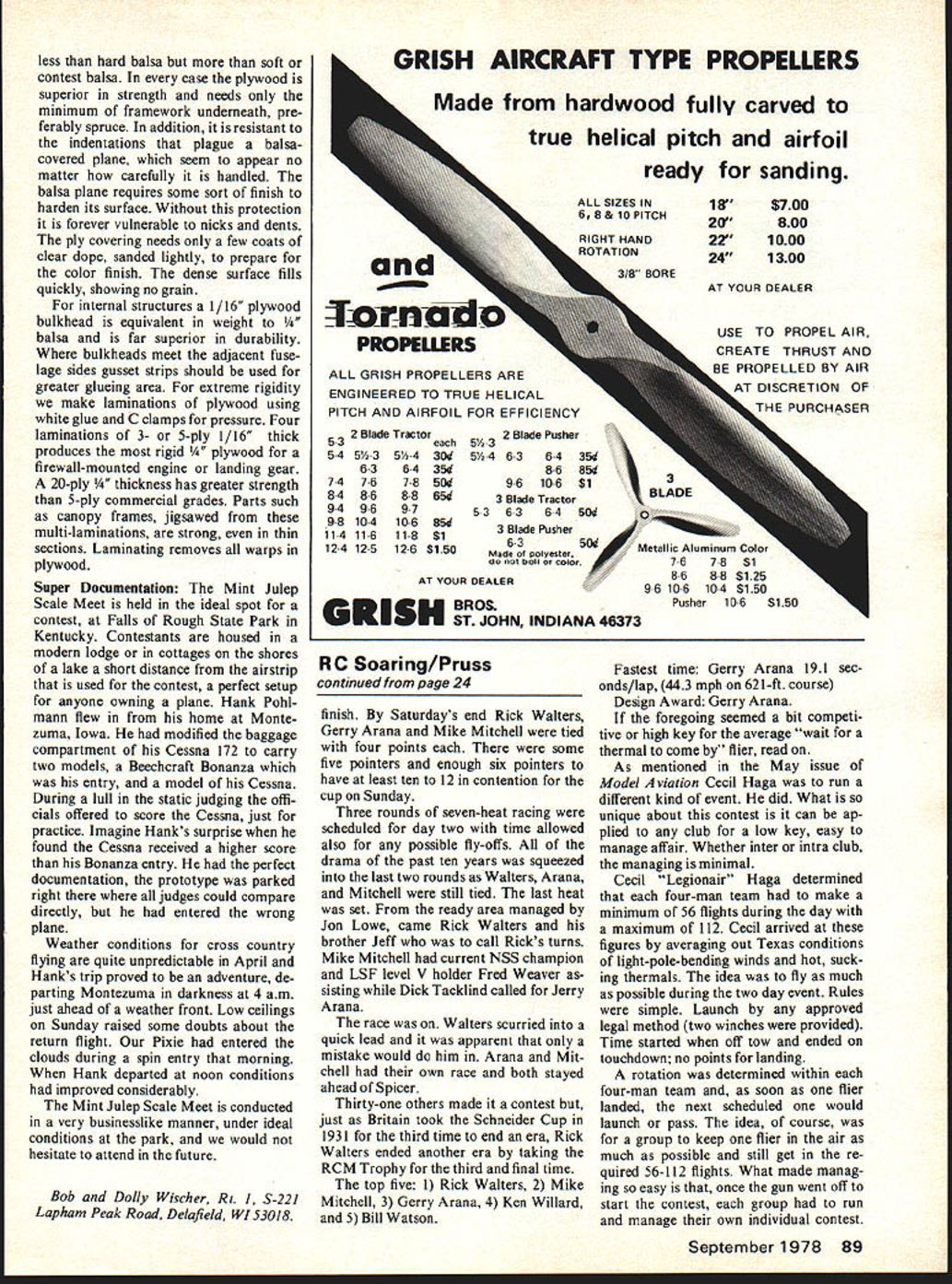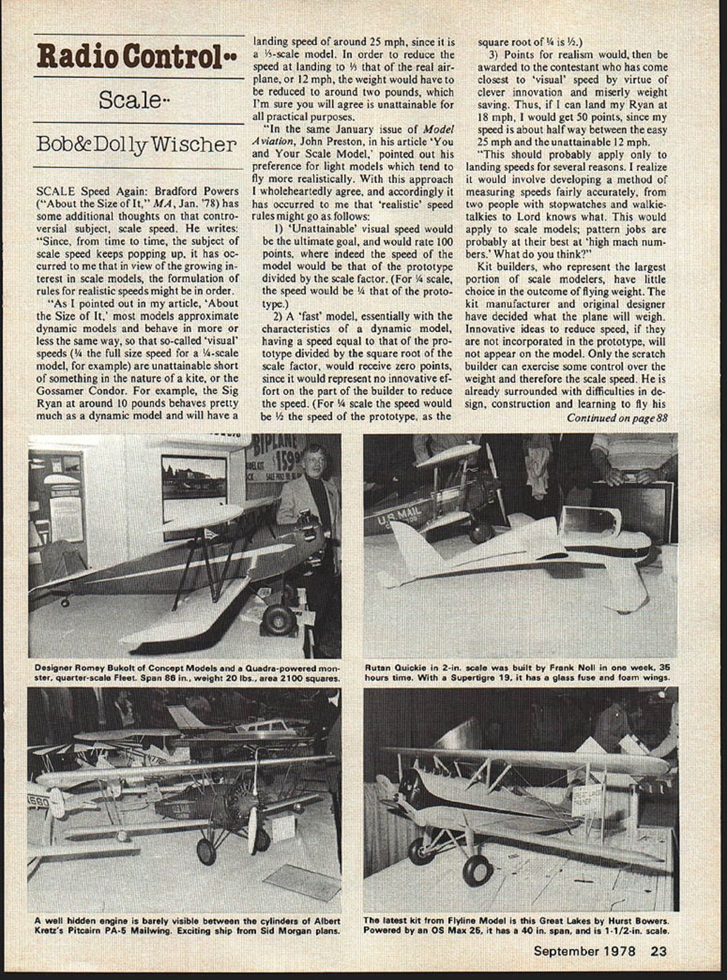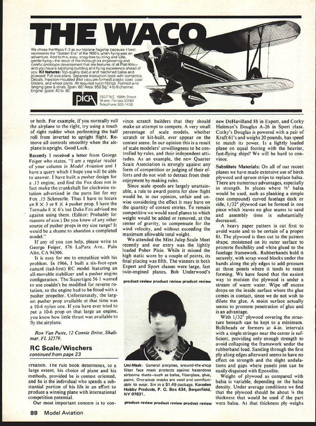 jWi Bradfnr MA s 1 tW cc U issue n ai wnhI nd acco reaIisti4 visual 5~4 woul sp th nyu tli c mc prot us 0 way betwe Lttainable THE chose Waco F-3 biplane flagship because represents Golden Era 1930s flying adventure Add easy snag-free building safe gentle flyingthe result thorough kit engineering careful prototype development features Plaft Kits have satisfying building flying experience ahead Kit features Top-quality diecut machined balsa plywood Full size plans Separate instruction book isometrics Decals Injection-moulded vacuum-formed plastic cowl cowl blisters wheel pants required nylon fittings Formed wire langing gear & struts Span 60 Area 950 3q74 6 channel Engine good 40 60 2657 NE 188th Sireet M am Florida 33180 Te ephone 935-1436 both example normally roll airplane right try using touch right rudder performing half roll inverted upright flight Re move controls smoothly air plane upright Good Luck Recently received letter George Feiger states am regular reader column Model Aviation have query hope will able answer have built pusher design 15 engine find Fox does fact make crankshaft clockwise ro tation advertised parts list Fox 15 Schneurle Thus have locate 8 X 3 8 X 4 pusher prop have Tornado 8 X 6s Duke Fox advised against using Editor Probably reasons size know other source pusher props size range would shame abandon completed model can help please write George Feiger 876 LaPara Ave Palo Alto CA 94306 easy empathize problem 1966 1 built six-foot-span canard tail-first RC model featuring all-movable stabilizer pusher engine configuration Supertigre 56 wanted use couldnt modified reverse ro tation engine fitted pusher propeller Unfortunately larg est pusher prop available time 10-6 nylon have ever tried put 10-6 prop large engine know little thrust available fly airplane Ron Van Putte 12 Connie Drive Shahmar FL 32579 RC Scale Wischers continued page 23 creatton rule book determines large extent choice plane methods provided contest oriented individual spends sub stantial portion life effort produce winning plane international competition potential important concern convince scratch builders should make attempt compete very small percentage scale models whether scratch kit-built ever appear contest scene opinion result scale modelers unwillingness con trolled rules independent atti tudes As example new Quarter Scale Association strongly against form competition judging ef forts wish detract enjoyment making rules Since scale speeds largely unattain able rule award points slow flight would opinion unfair un wise considering effect may have quantity contest entries remain competitive would need planes weight would added removed center gravity compensate wind velocity exceeding maximum allowable total weight attended Mint Julep Scale Meet recently entry lightly loaded Pober Pixie missed high static score couple points its final placing fifth winners both Expert Sport classes large fast twin-engined planes Bob Underwoods product review product review product review new DeHavilland 88 Expert Corky Heitmans Douglas A-26 Sport class Corkys Douglas powered pair Kraft 61s weighs 20 pounds has speed match its power lightly loaded plane equal footing heavier fast-flying ships will hard con vtnce Substitute Materials recent planes have made extensive use birch plywood spruce strips replace balsa numerous advantages especially strength places /8 balsa would used such planking simple compound curved fuselage deck side 1/32 plywood can formed piece leaves no glue seams sand assembly time substantially decreased heavy paper pattern cut first avoid waste certain proper fit plywood cut pattern shape moistened its outer surface promote flexibility white glued fuselage framework Rubberbands hold securely scrap wood blocks under bands along ply edges add pressure points tends resist forming have found easiest way moisten plywood under stream warm water Wipe off excess drops inside surface glue comes contact since wish dilute glue moist surface actually seems promote penetration glue advantage 1/32 plywood covering struc ture beneath can kept minimum Bulkheads formers 4-in intervals single stringer near center suf ficient providing enough strength avoid collapsing framework under rubberband load Sanding through first ply along edges afterward seems have no effect strength slight undula tions gaps panels join can easily disguised Epoxolite Weight plywood compared balsa variable depending balsa density Under average conditions find plywood should about kness would used part balsa thickness ply weighs 88 Model Aviation product review product review product review Uni-Mask General purpose around-the-shop filter face mask protects against hazardous airborne dustssuch balsa fiberglass glue paint One-piece masks cool comfort able wear Six $1 49 package Karoden Hobby Products P 0 Box 434 Bergenfield NY 07621 less hard balsa soft contest balsa case plywood superior strength needs minimum framework underneath pre ferably spruce addition resistant indentations plague balsacovered plane seem appear no matter carefully handled balsa plane requires some sort finish harden its surface Without protection forever vulnerable nicks dents ply covering needs few coats clear dope sanded lightly prepare color finish dense surface fills quickly showing no grain internal structures 1/16 plywood bulkhead equivalent weight a far superior durability bulkheads meet adjacent fuse lage sides gusset strips should used greater glueing area extreme rigidity make laminations plywood using white glue C clamps pressure Four laminations 3- 5-ply 1/16 thick produces rigid ood firewall-mounted engine landing gear 20-ply kness has greater strength 5-ply commercial grades Parts such canopy frames jigsawed multi-laminations strong thin sections Laminating removes warps plywood Super Documentation Mint Julep Scale Meet held ideal spot contest Falls Rough State Park Kentucky Contestants housed modern lodge cottages shores lake short distance ai