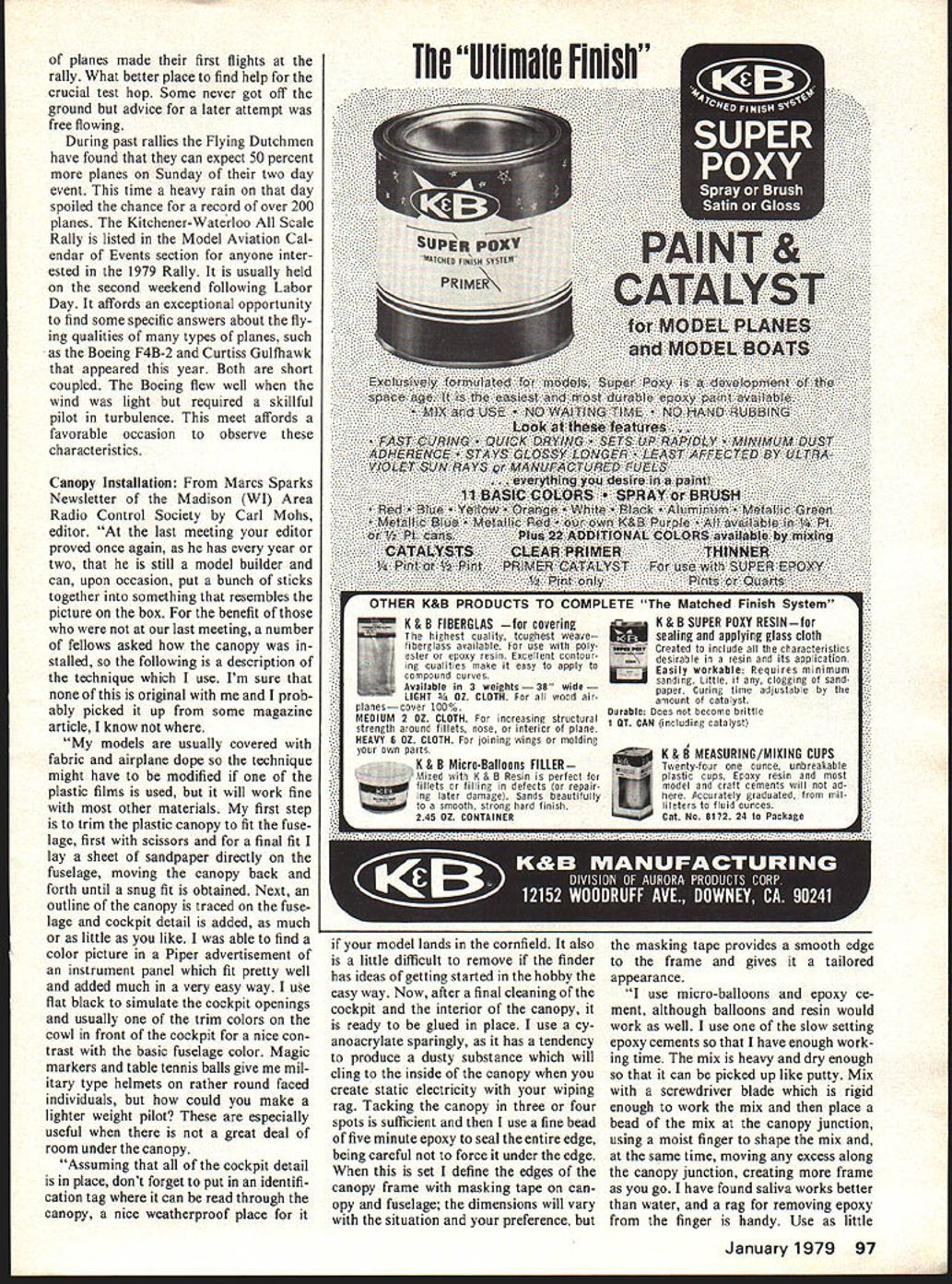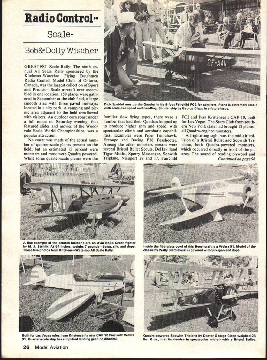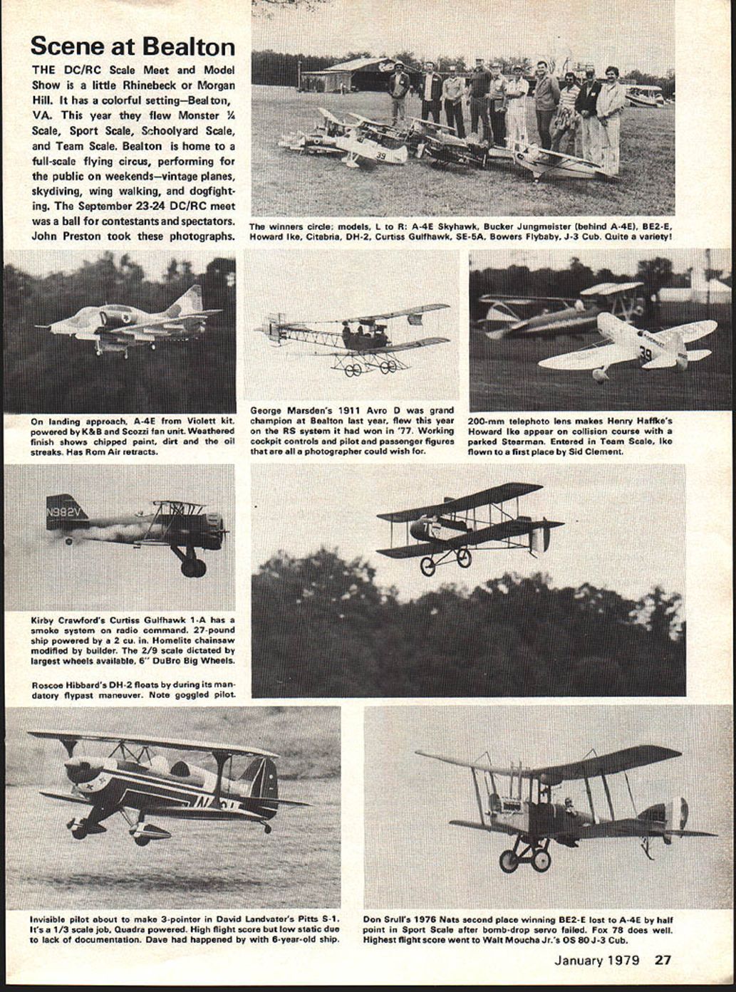 Radio Control Scale Bob8eDollyWischer GREATEST Scale Rally ninth nual Scale Rally sponsored Kitchener-Waterloo Flying Dutchmen Radio Control Model Club Ontario Canada largest collection Sport Precision Scale aircraft ever assem bled location 158 planes gath ered September club field large smooth area three paved runways located city park camping pic nic area adjacent field overflowed visitors An outdoor corn roast under full moon Saturday evening featured slides movies Woodvale Scale World Championships popular attraction No count made actual num ber quarter-scale planes present field estimated 15 percent monsters Quadra powered some quarter-scale planes familiar slow flying types number Quadras hopped up produce higher rpm speed spectacular climb aerobatic capabil ities Examples Piper Tomahawk Ercoupe Boeing P26 Peashooter Among other monsters present several Bristol Bullet Scouts DeHavilland Tiger Moths Sperry Messenger Sopwith Triplane Nieuport 28 17 Fairchild FC2 Ivan Kristensens CAP 10 built Las Vegas Stars Club south ern New York state brought 12 planes Quadra-engined monsters frightening sight mid-air col lision Bristol Bullet Sopwith Tri plane both Quadra-powered monsters occurred directly front pit area sound rending plywood Continued page 96 26 Model Aviation Dick Speidel runs up Quadra 9-toot Fairchild FC2 admirers Plane extremely stable scale-like speed handling Similar ship George Clapp future issue fine example scratch- s art Avis 8534 Czech fighter M J Stehlik 54 inches wolgne 7 poundsbalsa silk dope five photos Kitchener-Waterloo Scale Rally Inside fiberglass cowl Beechcraft Webra 91 Model classic Wally Sierolawaki covered Silkspan dope Built Las Vegas rules Ivan Kristensens new CAP 10 flies Webra 91 Quarter-scale ship has simplified landing gear no dihedral Quadra-powered Sopwith Triplane Doctor George Clapp weighed 23 lbs 6 os. met its demise spectacular mid-air Bristol Bullet Scene Bealton THE DC/RC Scale Meet Model Show little Rhinebeck Morgan Hill has colorful settingBealton VA year flew Monster 1/4 Scale Sport Scale SChoolyard Scale Team Scale Bealton home full-scale flying circus performing public weekendsvintage planes skydiving wing walking dogfight ing September 23-24 DCIRC meet ball contestants spectators John Preston took photographs Kirby Crawfords Curtiss Gulfhawk 1-A has smoke system radio command 27-pound ship powered 2 cu Homelite chainsaw modified builder 2/9 scale dictated largest wheels available 6 OuBro Beg Wheels Roscoe Hibbards DH-2 floats during its man datory flypast maneuver Note goggled pilot George Marsdens 1911 Avro 0 grand champion Bealton last year flew year RS system won 77 working cockpit controls pilot passenger figures photographer could wish Invisible pilot about make 3-pointer David Landvaters PiUs S-i Its 1/3 scale job Quadra powered High flight score low static due lack documentation Dave happened 6-year-old ship Don Srulls 1976 Nats second place winning BE2-E lost A-4E half point Sport Scale after bomb-drop servo failed Fox 78 does well Highest flight score went Walt Moucha Jrs 05 80 J-3 Cub January 1979 27 winners circle models L R A-4E Skyhawk Bucker Jungmeister behind A-4E B22-E Howard Ike Citabria DH-2 Curtiss Gulfhawk SE-BA Bowers Flybaby J-3 Cub Quite variety landing approach A- olett kit powered K&B Scozzi fan unit Weathered finish shows chipped paint dirt oil streaks Has Rom Air retracts 200-mm telephoto lens makes Henry Haffkes Howard Ike appear collision course parked Stearman Entered Team Scale Ike flown first place Sid Clement [&u 118 1 BOX 511E HIGGINSVILLE MISSOURI 64037 other activities rarely call attention enduring community However let winds shift blowing face sometimes stage set adopt new personality. somewhat like Dr Jeckle Mr Hyde sinister partnership could hardly contrived design other wise two acting collusion pose real threat unwary As Great White Amity set Jaws comes disguised under cover green gather prologue am latest member Plane Lodged Tree Club score yourself observation move head class Its nice know however 96 Model Aviation am such distinguished company Dis cussing lamentable situation club veterans seems problem have experienced pursuit unpredictable hobby very least challenge imagination seems provoke outpouring interesting solutions wit consider gems fered various members Call Val ley Forge Fire Companyfor $5000 donation will come retrieve stranded bird 2 Get bow arrow shoot line bring down way 3 Rent some climbing equipment climb tree yourself 100 plus mind Having witnessed fire company retrieve Aeromaster ladders poles hooks decided against method bow arrow school sounds like Rube Goldberg best what left plane would display scars fall 100 plus tugging lines etc assuming could make contact first place Finally rental approach merely implies little nothing don climbing equipment pop up 100 tree safely bring self plane down piece out incident Forget brother may have dumb enough have put plane tree begin Im going compound felony getting myself up show world what com plete ass am lost plane radio engine would make dent eventual cost doctor hospital bills could anticipated trying get down doing myself course add fact now 9 pm Friday evening July 4th holiday weekend just round out picture got home started calling tree surgeons discovered lot phantoms disconnected phone lines prerecorded messages imply no longer business What few could make contact con sidering hour able round up men until four five days later Try telling bored female voice answering service emergency question tree located property woods somewhere Valley Forge National Park stony silence re sults can almost meas ured over phone cable gave up Friday evening II pm heard accu weather state weekend going wet stormy beginning Sunday continuing means get down Saturday write off goner Faced necessity having act next morning got up early started calling names out Yellow Pages As luck would have struck pay dirt first call story has happy ending th